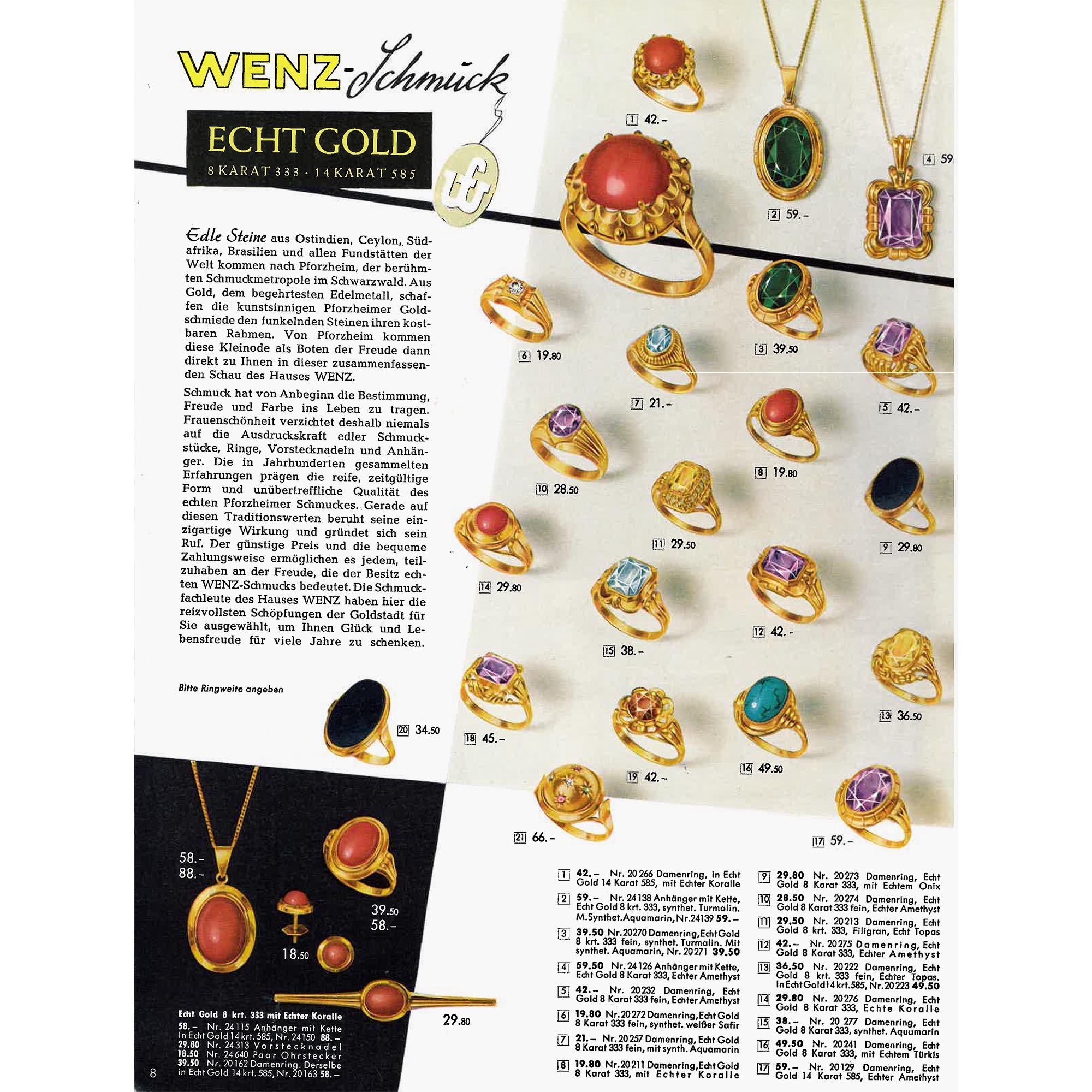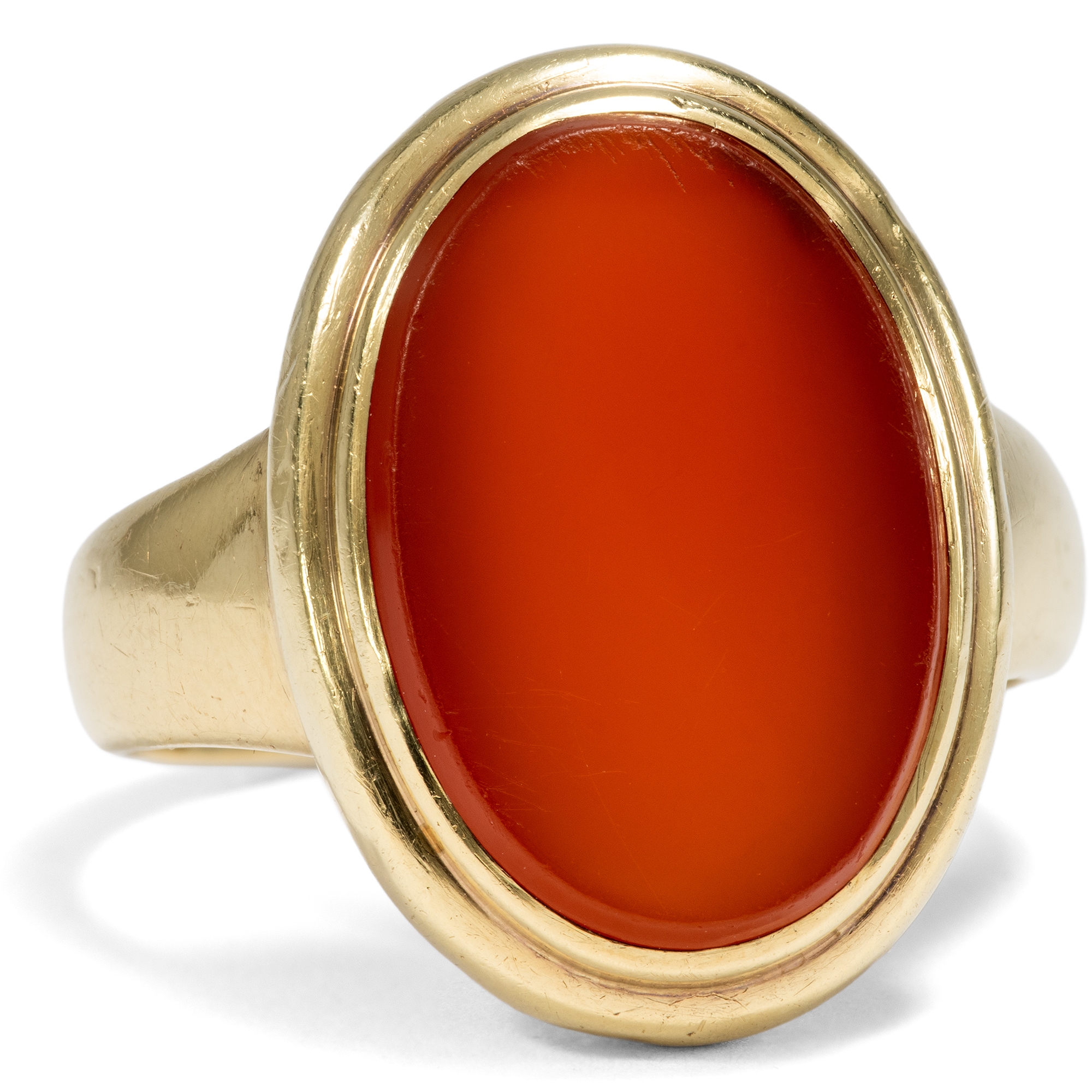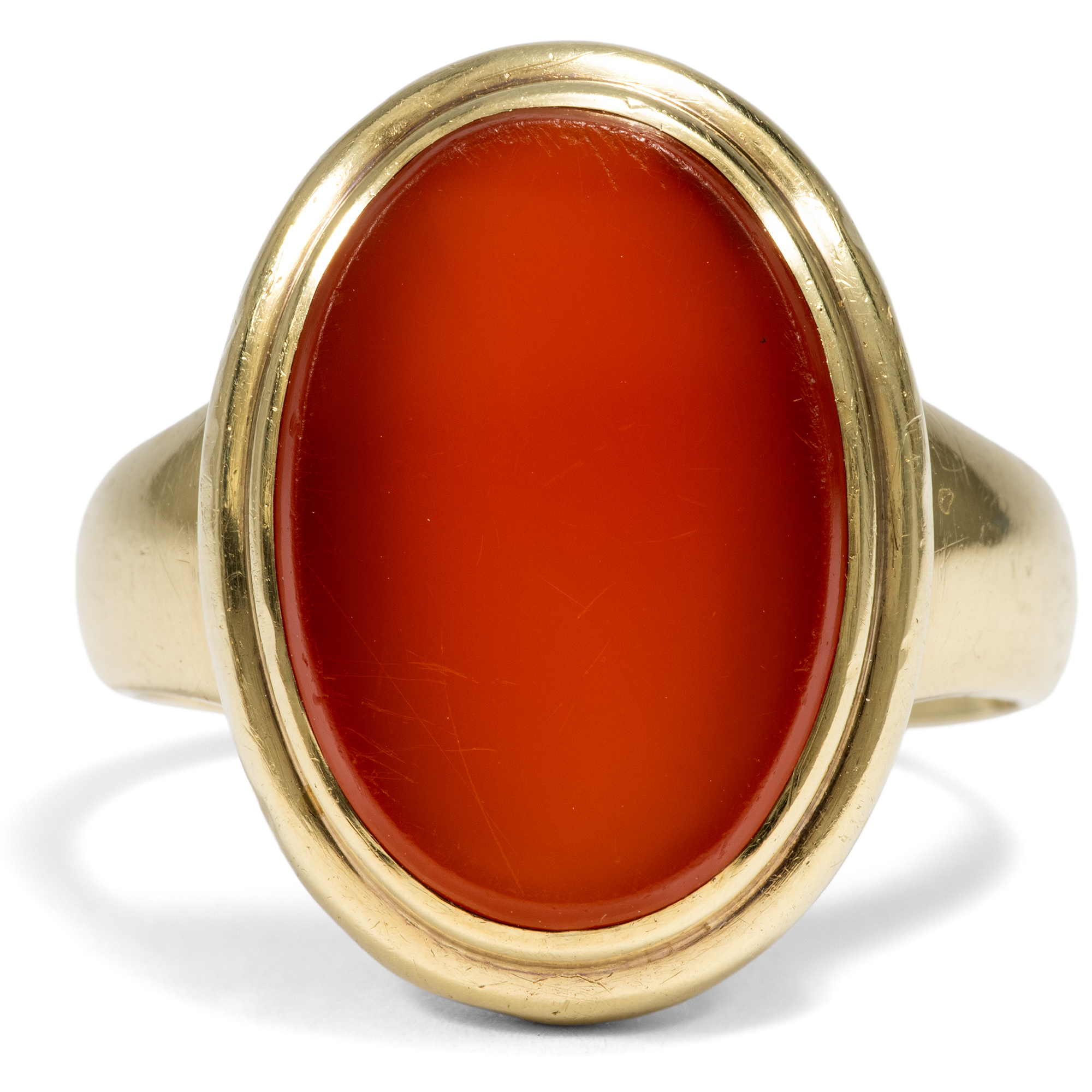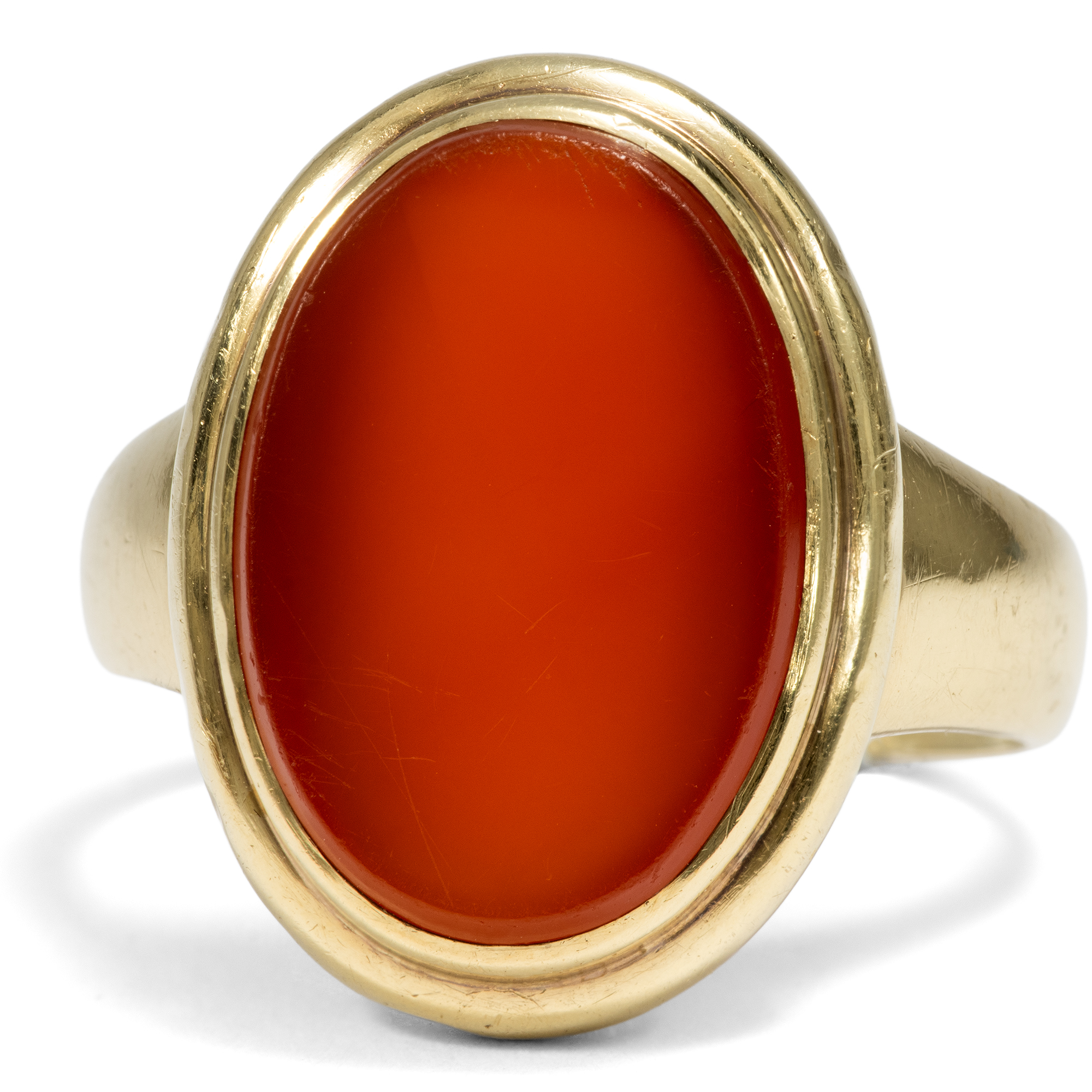 Ringe mit großen undurchsichtigen Schmucksteinen waren in der Zeit nach dem Zweiten Weltkrieg in Deutschland ausgesprochen beliebt. Sie wurden in großen Stückzahlen und vielen schönen Varianten vor allem in der „Goldstadt“ Pforzheim hergestellt. Im Katalog des Jahres 1959 der Pforzheimer Schmuckmanufaktur Wenz sind einige Ringe dieses Typus abgebildet. Der Text dazu erklärt im Ton der Zeit: „Schmuck hat von Anbeginn die Bestimmung, Freude und Farbe ins Leben zu tragen. Frauenschönheit verzichtet deshalb niemals auf die Ausdruckskraft edler Schmuckstücke, Ringe, Vorstecknadeln und Anhänger. Die in Jahrhunderten gesammelten Erfahrungen prägen die reife, zeitgültige Form und unübertreffliche Qualität des echten Pforzheimer Schmucks.“ Eine große Scheibe aus orange-rotem Karneol ist Mittelpunkt dieses Vintage-Rings aus 14-karätigem Gold. Eine kräftige, abgetreppte Zarge hält den Stein schnörkellos; eine breite, stabile Ringschiene schließt an. Der Stein eignet sich besonders zum Gravieren. So kann ein geschickter Steinschneider hier ein Wappen oder Monogramm hineingravieren. Jedoch ist der Stein auch in dieser unverzierten Form schön. Zu uns fand der Ring hier in Berlin; wir datieren ihn in die 1950er Jahre. Zitat aus dem Katalog: Kleinode der Goldstadt, Wenz, Pforzheim, 1959, S. 8.