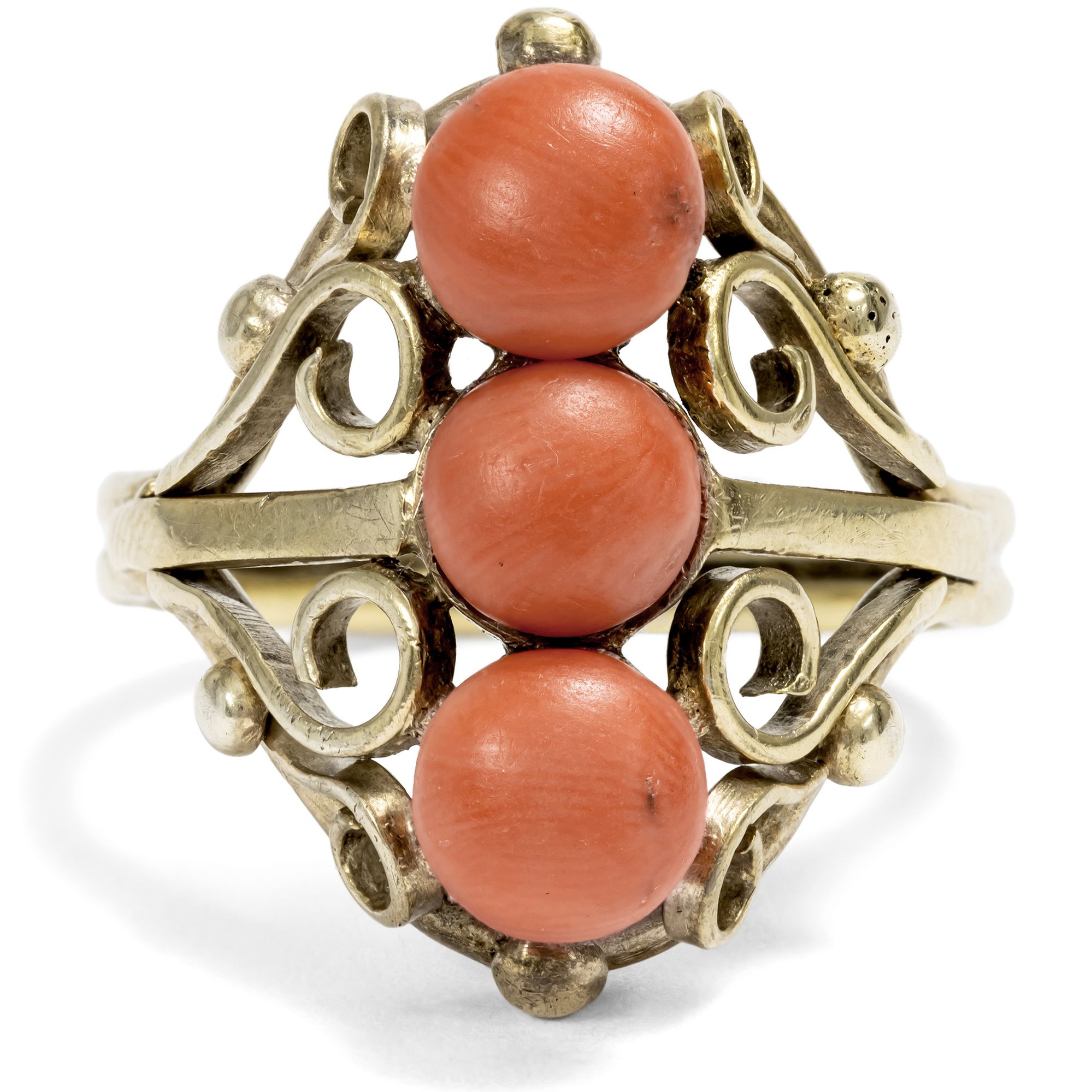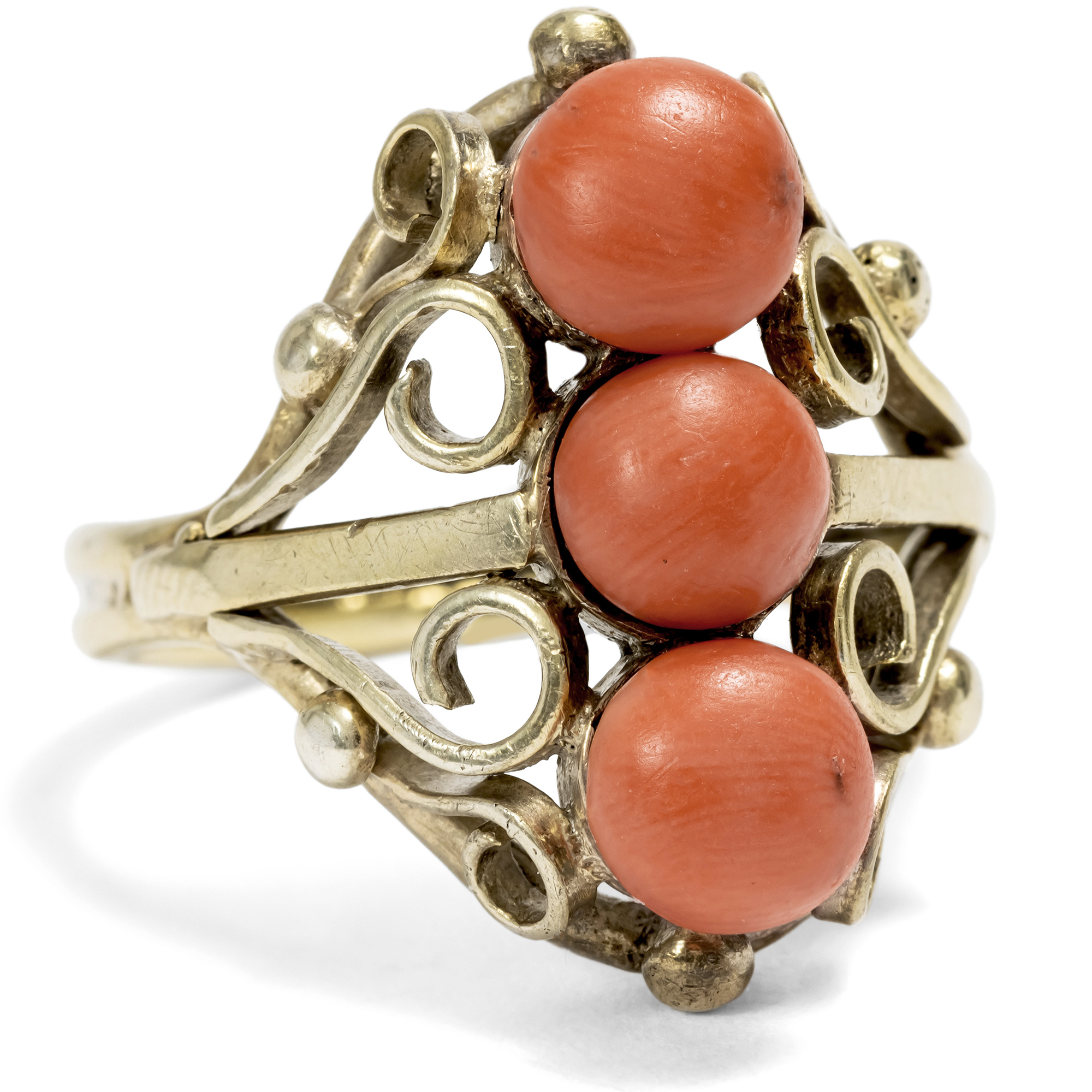 Drei lachsrote Korallen im runden Boutonschliff ist im vorliegenden Ring als kraftvoller Farbtupfer inszeniert. Sie ist als mittig in einer Reihe gesetzt und huldigen so der Schönheit des Meeres. Bögen und Spiralen aus vergoldetem Silber begleiten die Koralle und leiten zur Ringschiene über. Der Entwurf gefällt allerdings nicht nur durch die Schönheit des Naturmaterials. Auch die Form der Fassung mit ihren expressiven Dynamik ist elegant. Der Ring spricht die Formensprache des späten Art Déco, die „Retro“-Jewellery genannt wird: Die Formen sind kräftiger und körperhafter als in den 1920er Jahren. Auch die Farbigkeit des Schmucks veränderte sich: Die Mode der Jahre ab 1940 zog Schmuckstücke aus Gelbgold jenen aus Platin oder Weißgold vor und farbige Edelsteine und Korallen lösten Diamanten in ihrer Beliebtheit ab. Auch der hier vorliegende Ring wird daher in den Jahren um 1950 entstanden sein, er kam hier in Berlin zu uns.