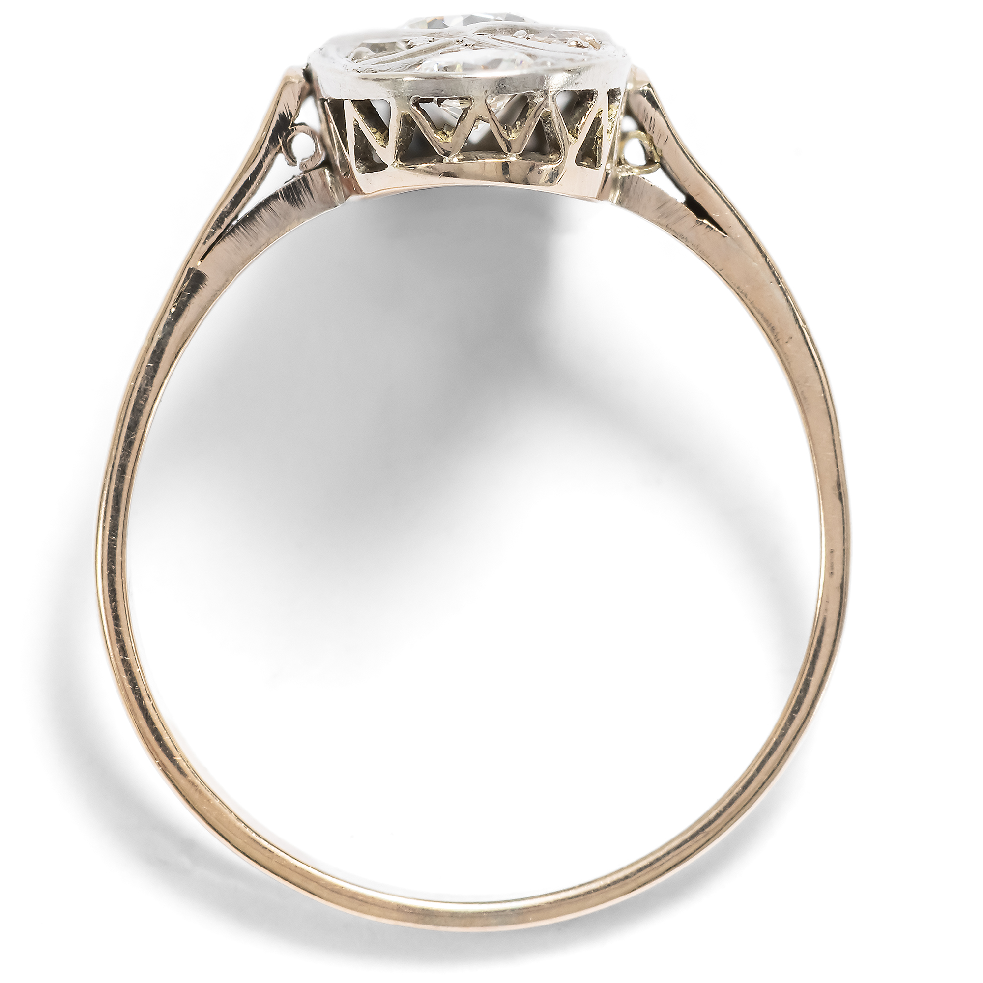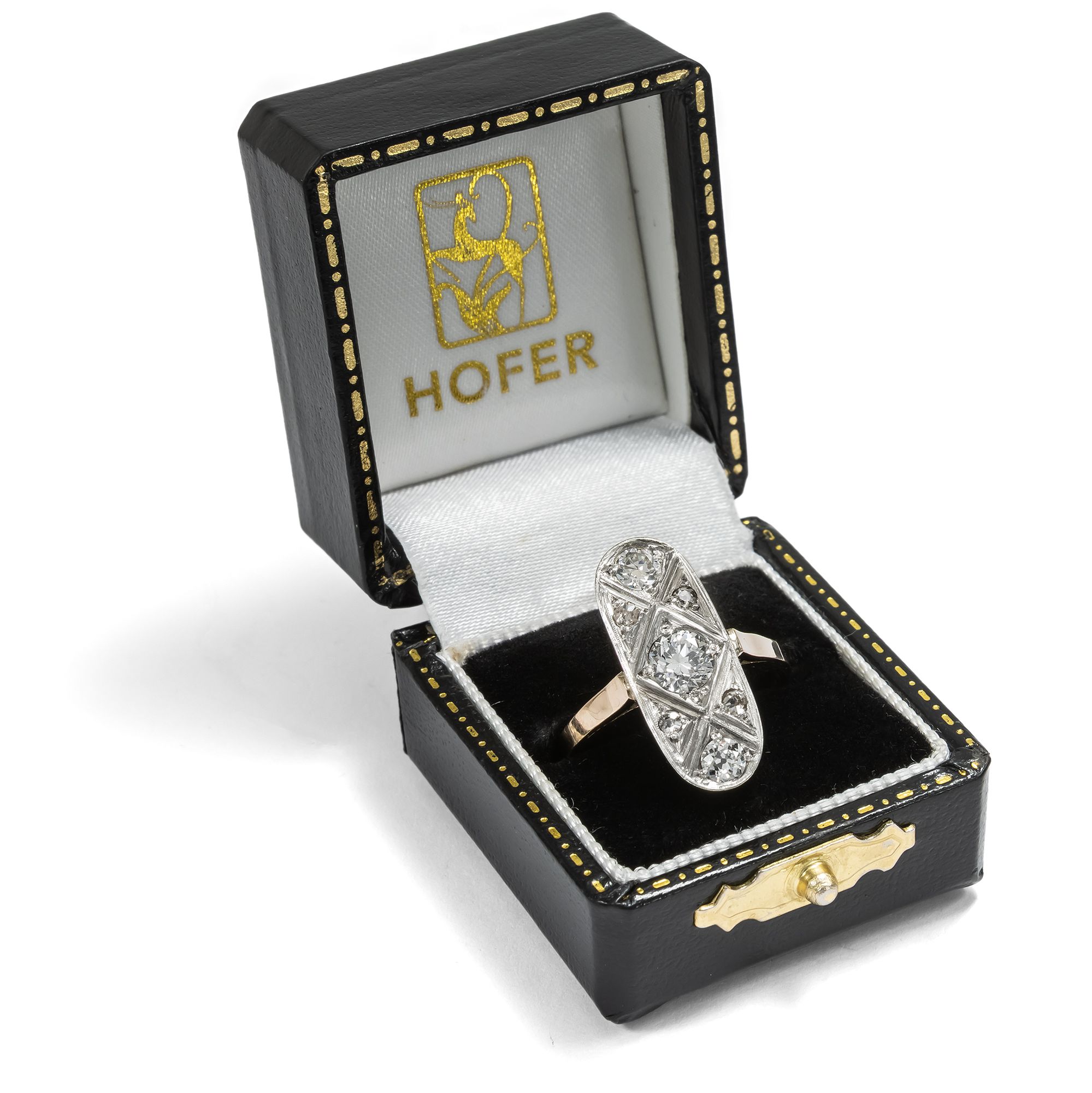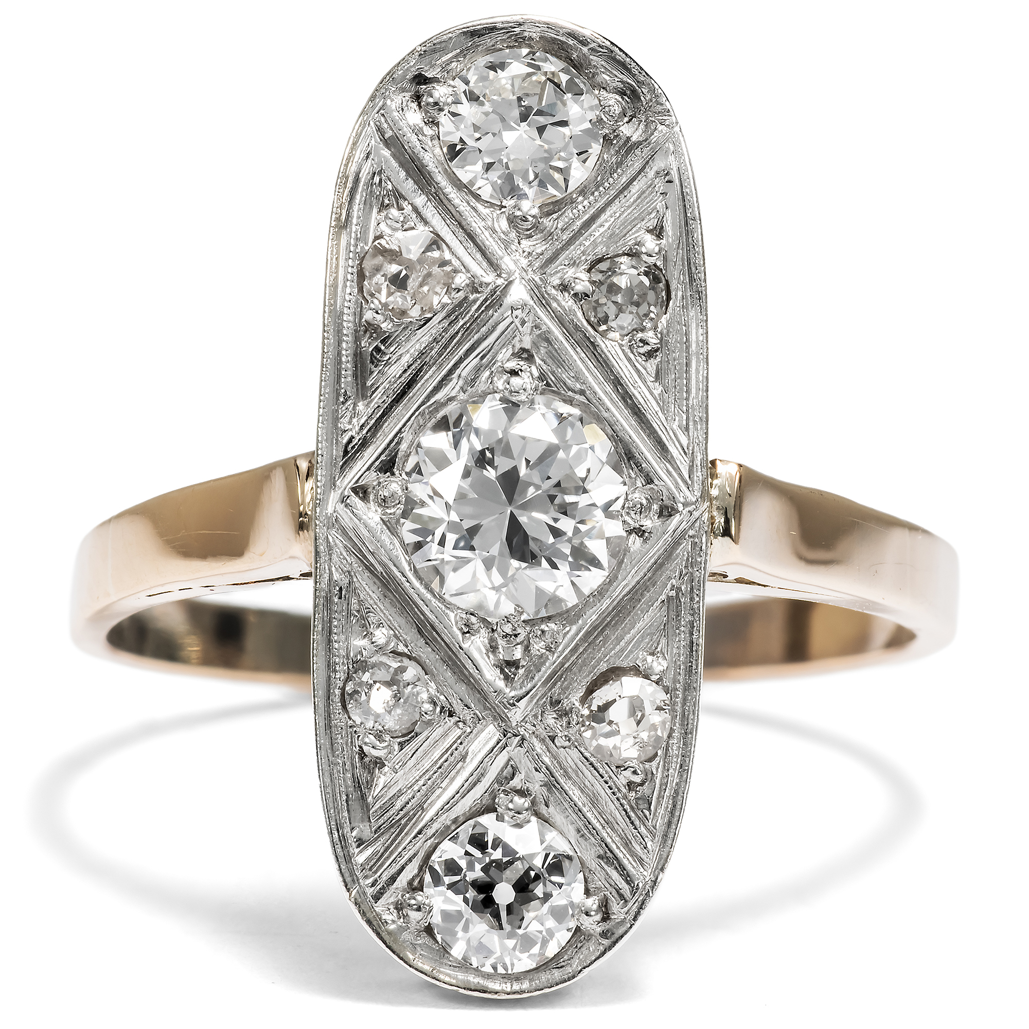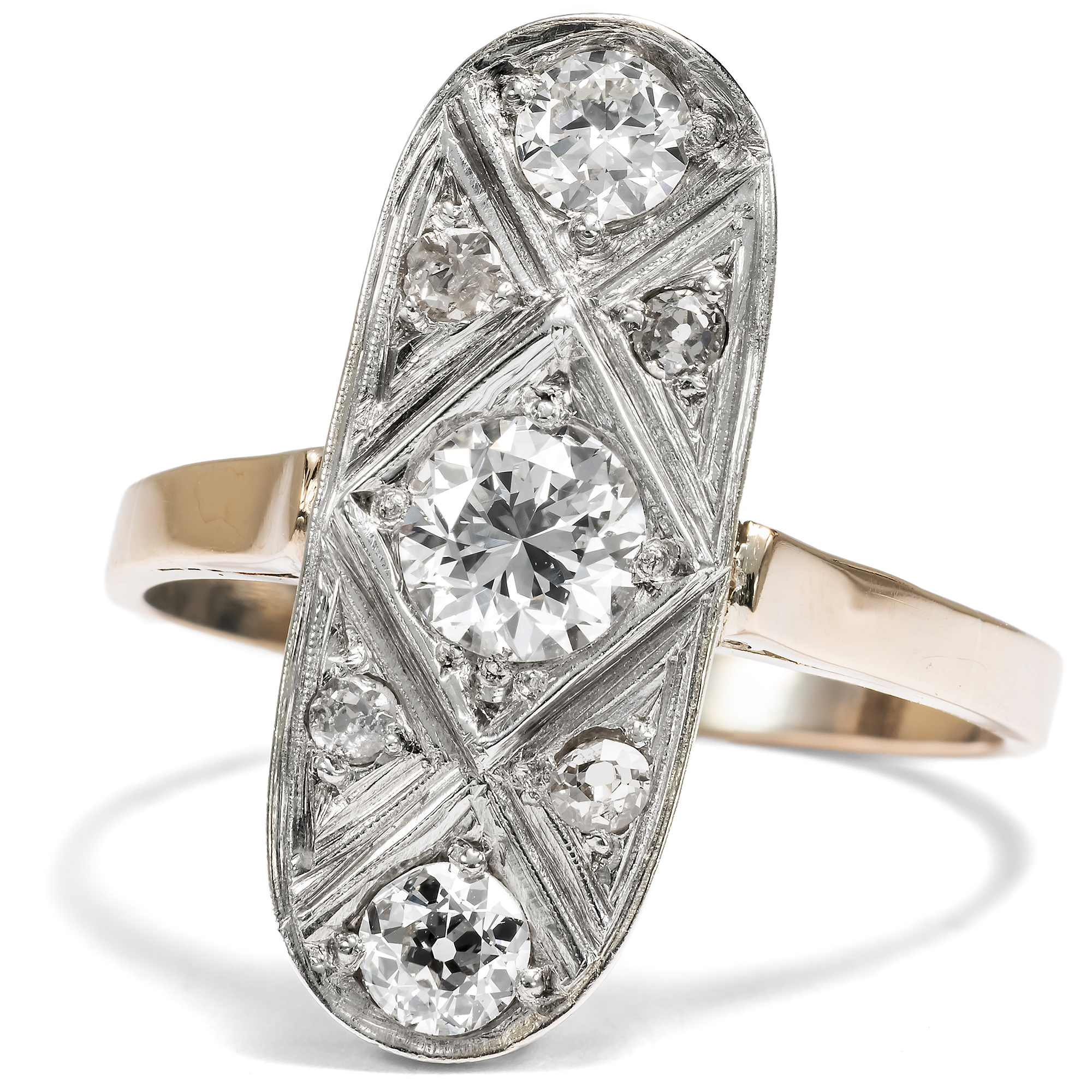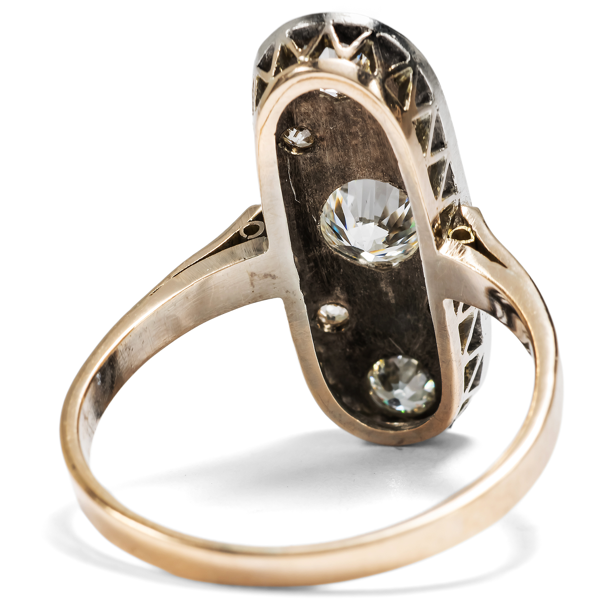 Der hier vorliegende Ring ist ein eindrucksvolles Schmuckstück. Der ein ganzes Fingerglied bedeckende Ringkopf ist als längliches, ovales Schiffchen gestaltet und verweist damit auf Vorbilder aus der Epoche des Art Déco. Die modernen, oft rasanten und stets einprägsamen Entwürfe haben nicht nur in der bewegten Zwischenkriegszeit mit großem Erfolg ihr Publikum gefunden. Vielfach hielten sich die Formen des Art Déco erstaunlich lange und wurden mit Erfolg den Zeitgeschmack angepasst. Bei unserem Ring verhält es sich nicht anders. Seine Formensprache ist dem Schmuck der 1920er Jahre nachempfunden, doch zeigen seine Punzierungen, dass er erst nach 1963 in Polen entstanden ist. Die Formen sind im Detail daher reduzierter und zugleich kraftvoller ausgeführt. Seine Oberfläche aus Silber ist vollständig Diamanten im Brillant-, Alt- und Achtkantschliff ausgefasst. Insgesamt etwa 0,94 ct Diamanten verleihen dem Ring ein kühles, elegantes Funkeln. Die unterschiedlichen Schliffe verraten, dass ein Teil der Diamanten in diesem Schmuckstück eine Zweitverwendung erfahren haben. Die Steine sind à jour in das kühl glänzende Metall eingelassen, d.h. die Fassungen sind rückseitig offen, wodurch sie ihr Feuer besonders gut entfalten können. Wir haben den Ring hier in Berlin entdeckt. Er ist sehr gut erhalten und ein wundervoller Blickfang am Finger.