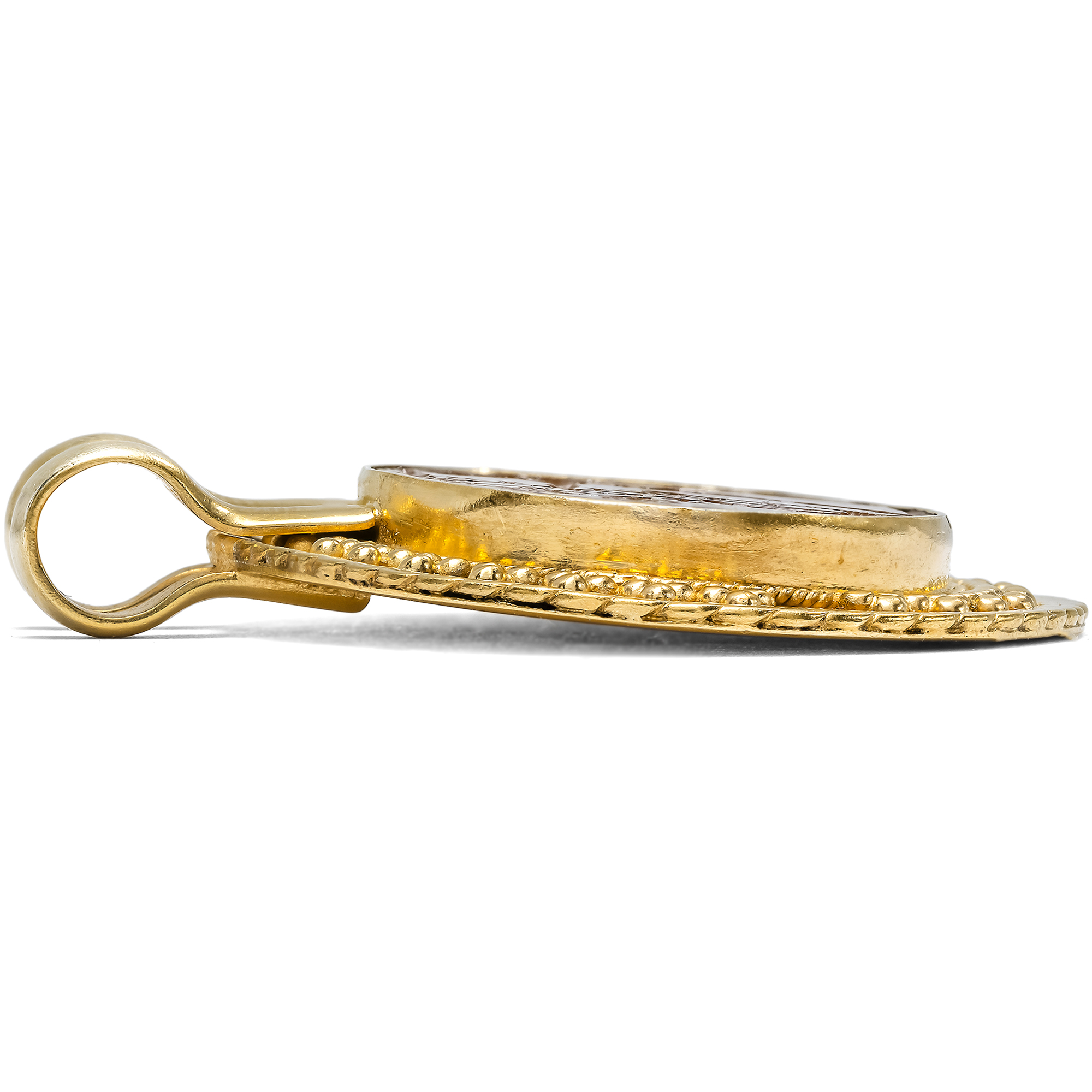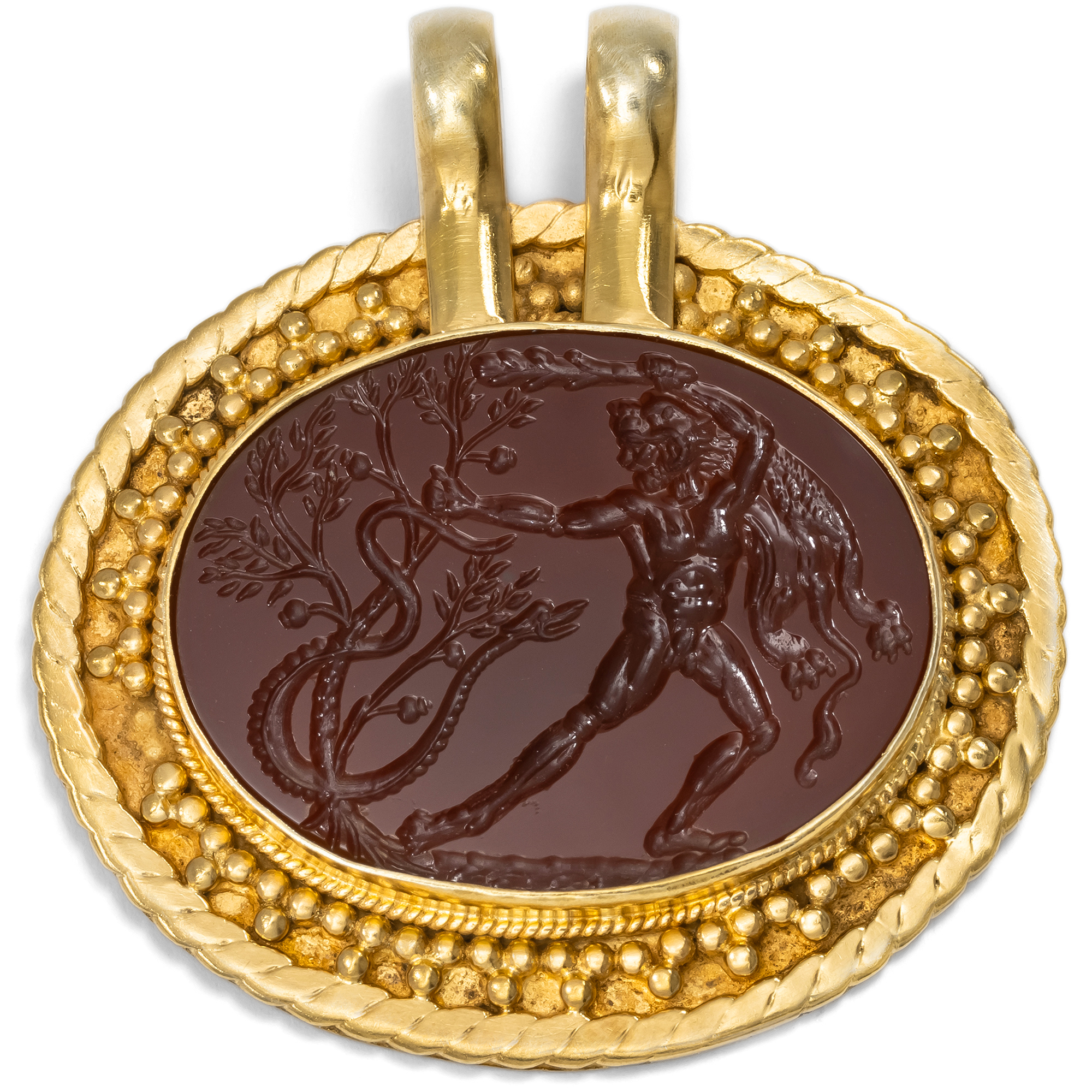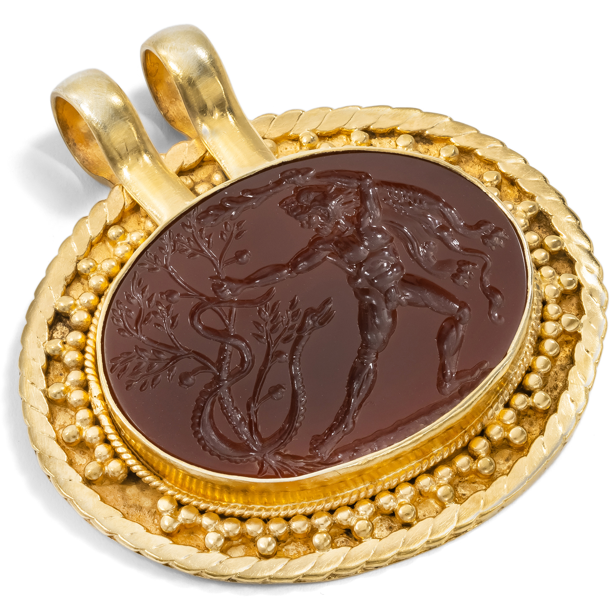 Herkules, der große Held und für seine Stärke berühmte Halbgott der Antike musste zwölf eigentlich unmögliche Aufgaben meistern, um den Tod seiner Frau zu sühnen. Er bezwang den Nemeischen Löwen, dessen Fell er fortan als Mantel trug, tötete die Lernäische Hydra und kämpfte mit vielen weiteren mythischen Tieren. Für die Menschen der Antike stellte er mit diesen Taten seine Ehre wieder her und bezeugte seinen vorbildlichen, tugendhaften Charakter. Der hier vorliegende Anhänger zeigt Herkules im Kampf mit der Schlange Ladon, welche den Apfelbaum der Hesperiden bewacht. Herkules steht rechts. Das Löwenfell weht hinter ihm, bald schlägt er schon mit seiner Keule auf den Kopf der Schlange ein. Er hat den Stamm des Baumes gefasst, es sind im detaillierten Schnitt des Intaglios sogar einige der Unsterblichkeit verheißenden Äpfel am Baum zu sehen. Die Szene ist mit einer großen Liebe zum Detail wiedergegeben. Jede Feinheit der Anatomie des Helden ist zu sehen, unter der Lupe offenbaren sich mit jedem Blick noch weitere Details. Die routinierte Ausführung und der elegante Entwurf legen nahe, dass es sich um eine Arbeit des 19. Jahrhunderts handelt. Die breite Rahmung aus vergoldetem Silber ist erst später hinzugefügt worden. Sie ist im Archäologischen Stil entworfen, wie er um 1870 herum modern war. Die Ausführung in vergoldetem Silber und der moderne Feingehaltsstempel zeigen jedoch, dass sie erst später entstanden ist. Wir denken, dass sie in den Jahren um 1980 herum entstanden ist, um die antike Gemme neu zu fassen. Wir haben den Anhänger in Rheinland-Pfalz entdeckt.