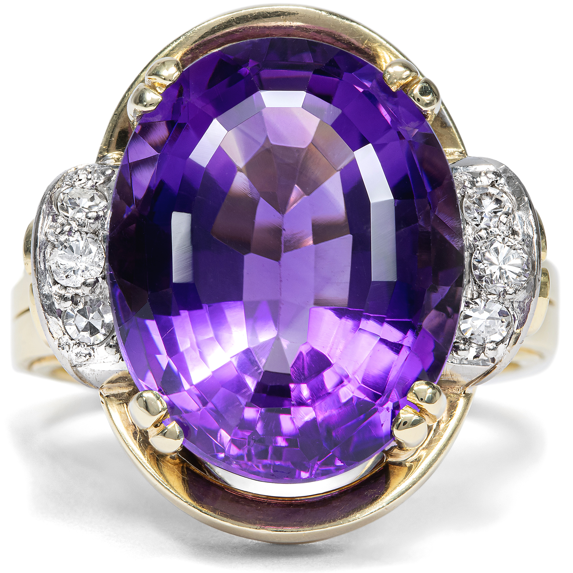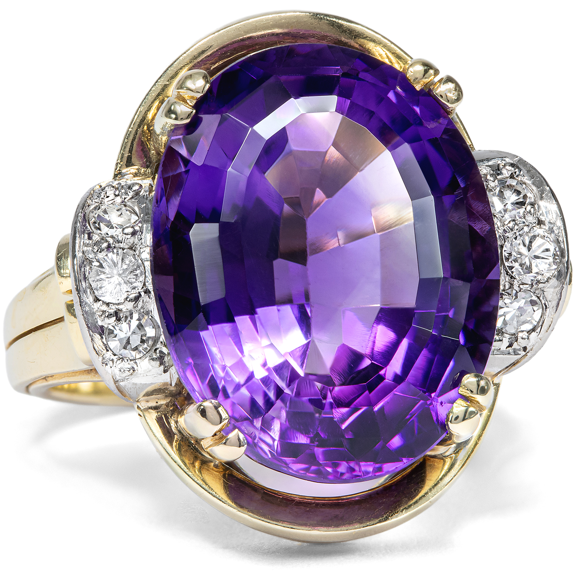 Einst galten Cocktailringe als rebellisch, denn sie setzen ein klares Zeichen: In den 1920er Jahren trugen Damen in den USA diese großen Schmuckstücke auf Partys, wo trotz der Prohibition Alkohol ausgeschenkt wurde, oft getarnt in bunten Cocktails. Prominent platziert auf dem Zeigefinger der linken Hand, war die Botschaft eines solchen Ringes klar: Seht her, ich habe Spaß am Leben und weiß es zu genießen! Um die Jahrhundertwende dann, zur Glanzzeit der Cocktailparty – als diese schon lange nicht mehr illegal war – gehörte ein schöner Cocktailring in jedes gut sortierte Schmuckkästchen. Auch dieser Ring zeigt sich in der mondänen Formensprache jener Zeit. In seiner Mitte glänzt ein Amethyst von tiefvioletter Farbe im ovalen Ceylonschliff. Der schöne, tiefviolette Edelstein wird von seitlichen Krappen sicher gefasst. Eine Rahmung samt Schiene aus Gelbgold ergänzt mit ihrer warmen Farbe das Leuchten des Edelsteins. Auf den Schultern fügen zwei Bögen mit Diamanten dem Stück ein weißes Glitzern hinzu. Die Formensprache des Ringes ist modern und auffallend, dem Aufbruch der Nachkriegsmoderne verpflichtet – ganz so, wie man es in den 1950er Jahren liebte. Die Datierung wird bestätigt durch eine Gravur im Ring, wir lesen dort das Datum des 2. September 1955. Der Ring fand von der Ostsee zu uns, ist aber sehr wahrscheinlich in Westdeutschland entstanden.