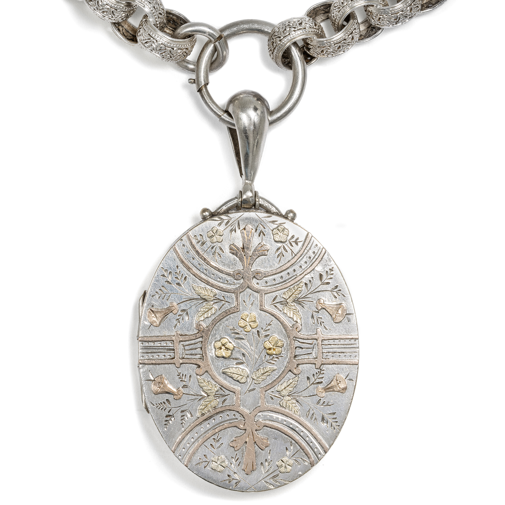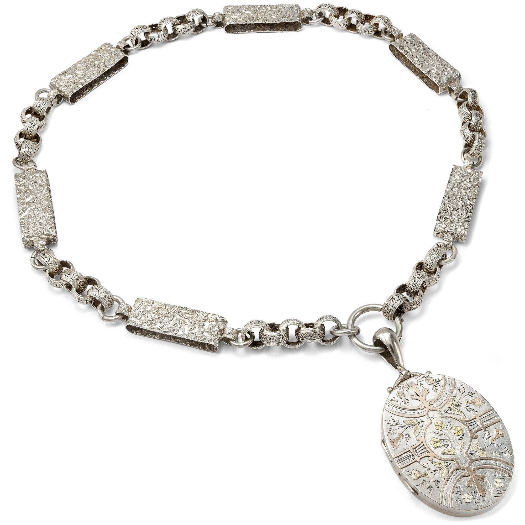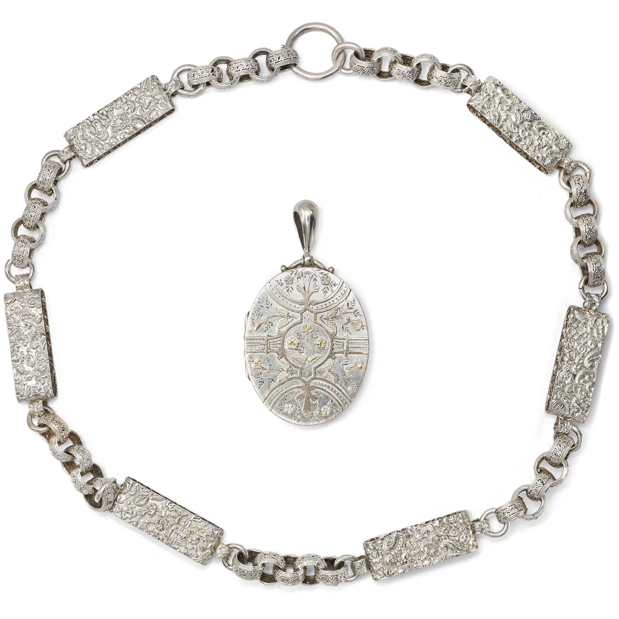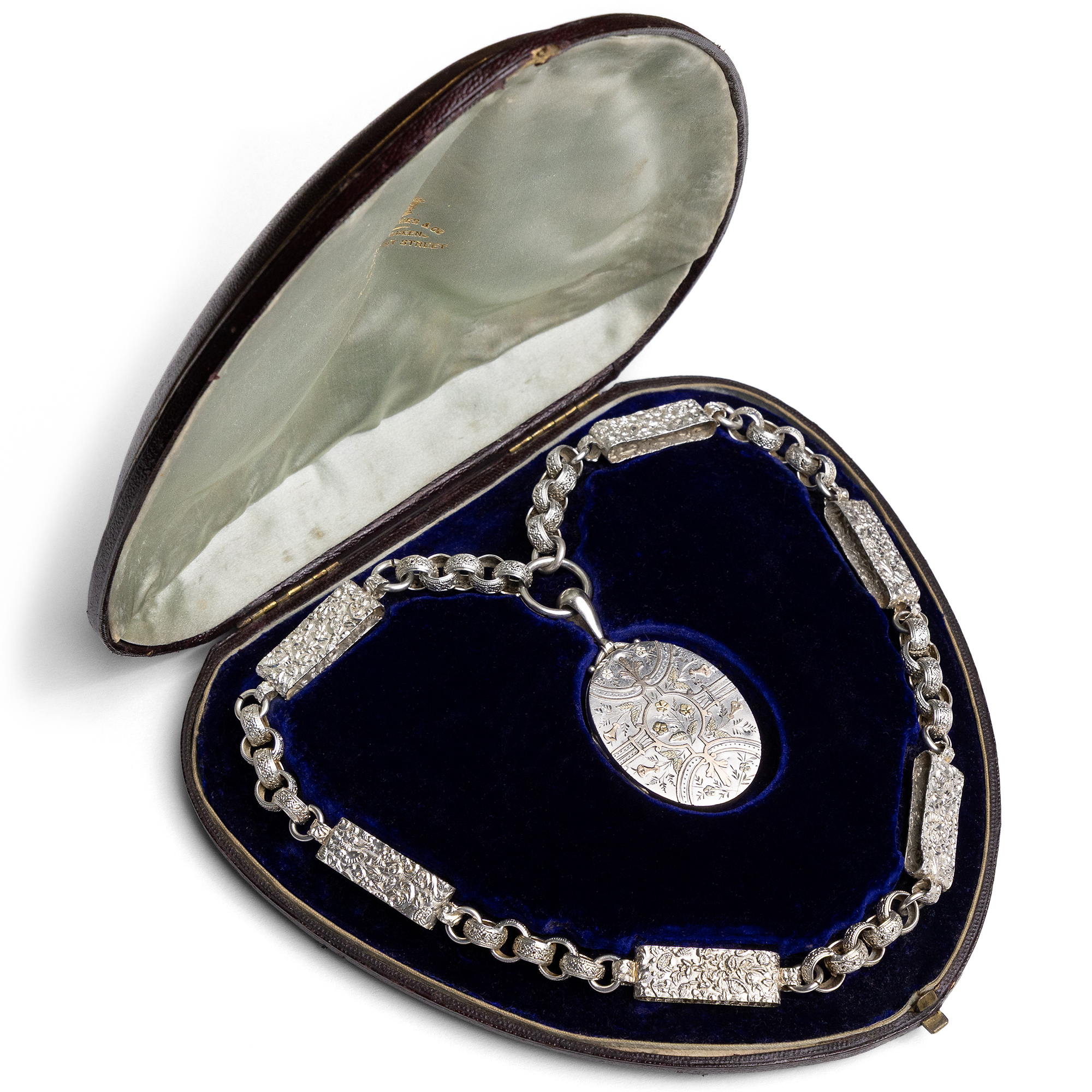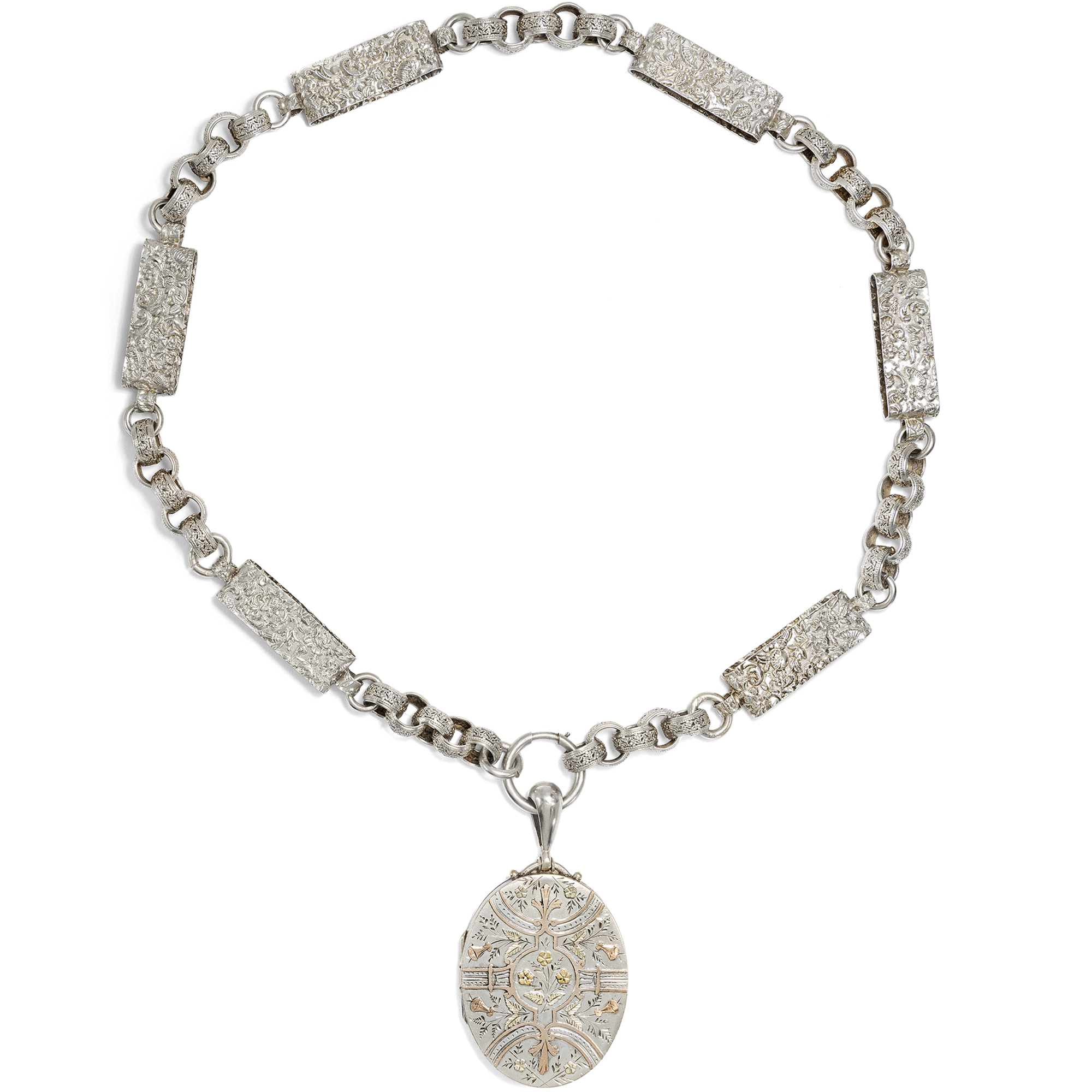 Im letzten Drittel des 19. Jahrhunderts begannen britische Künstler zunehmend, die tradierten Werte des Kunsthandwerks infrage zu stellen. Ein Ziel war dabei, sich von der Zurschaustellung kostbarer Materialien als Selbstzweck zu lösen. Nicht nur kostbare Juwelen in Gold konnten schön sein und sollten den Wert eines Schmuckstücks bestimmen – vielmehr sollte vor allem der ästhetische Wert eines Entwurfs wertgeschätzt werden. So entstand Silberschmuck, der von breiteren Schichten der Gesellschaft erworben werden konnte. Diese Haltung, der Schönheit einen über allem anderen stehenden Wert beizumessen, nannte man Ästhetizismus bzw. Aesthetic Movement. Form und Entwurf sollten dabei natürlich originell sein und sich nicht auf den althergebrachten Formen ausruhen, welche seit Jahrzehnten wiederholt wurden. Das hier vorliegende Collier zeigt dies mustergültig. Die Kette ist aus unterschiedlich geformten Gliedern gebildet. Sechs große Spangen aus Silber zeigen ein aufwändig geprägtes Muster aus Blütenformen, die an kräftig gewirktem Brokatstoff erinnern. Ineinander gelegte, breite Ringe mit ebenfalls reliefierter Oberfläche halten die Spangen zusammen und komplettieren das Collier. Das Medaillon selbst ist an einem schlichten Federring befestigt. Es zeigt eine glatte Rückseite, die Schauseite wirkt wie der Blick in einen blütenberankten Pavillon. Auflagen aus Rotgold und Gelbgold bilden zusammen mit feinen Gravuren ein Arrangement aus Trichterwinden und Vergissmeinnicht, denen in der Blumensprache die Bedeutung liebevollen Erinnerns zukommt. In seinem antiken, möglicherweise originalen Etui hat sich das Set hervorragend erhalten. Wir konnten es in London entdecken, wo es vermutlich von den Juwelieren Howell, James & Co. in der Regent Street hergestellt wurde.