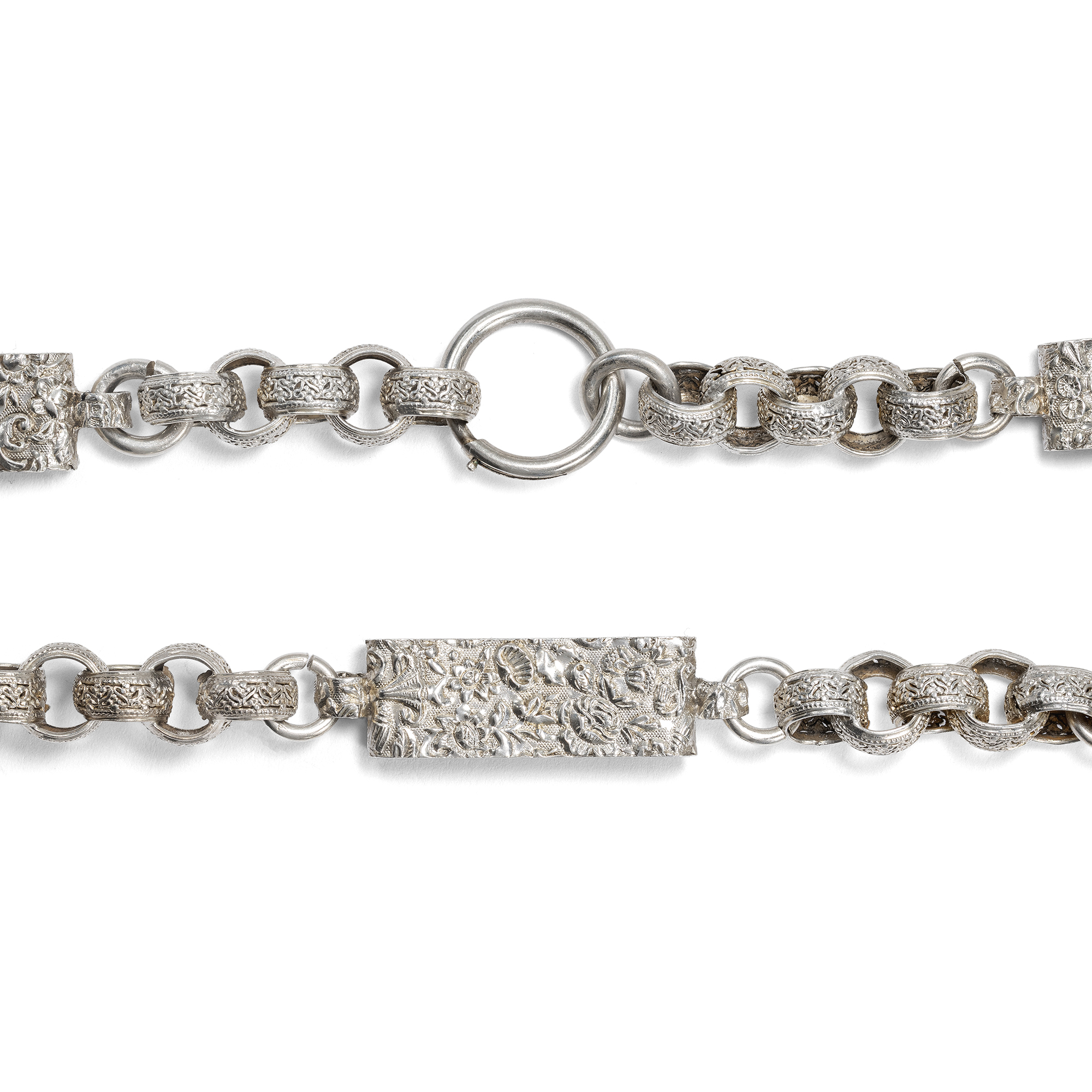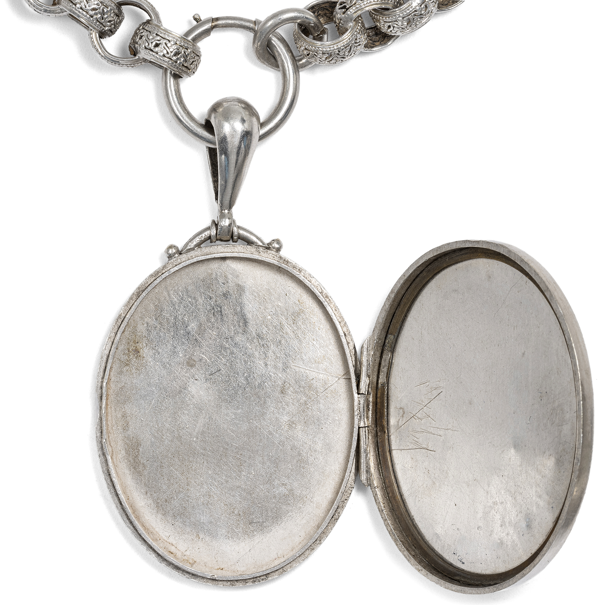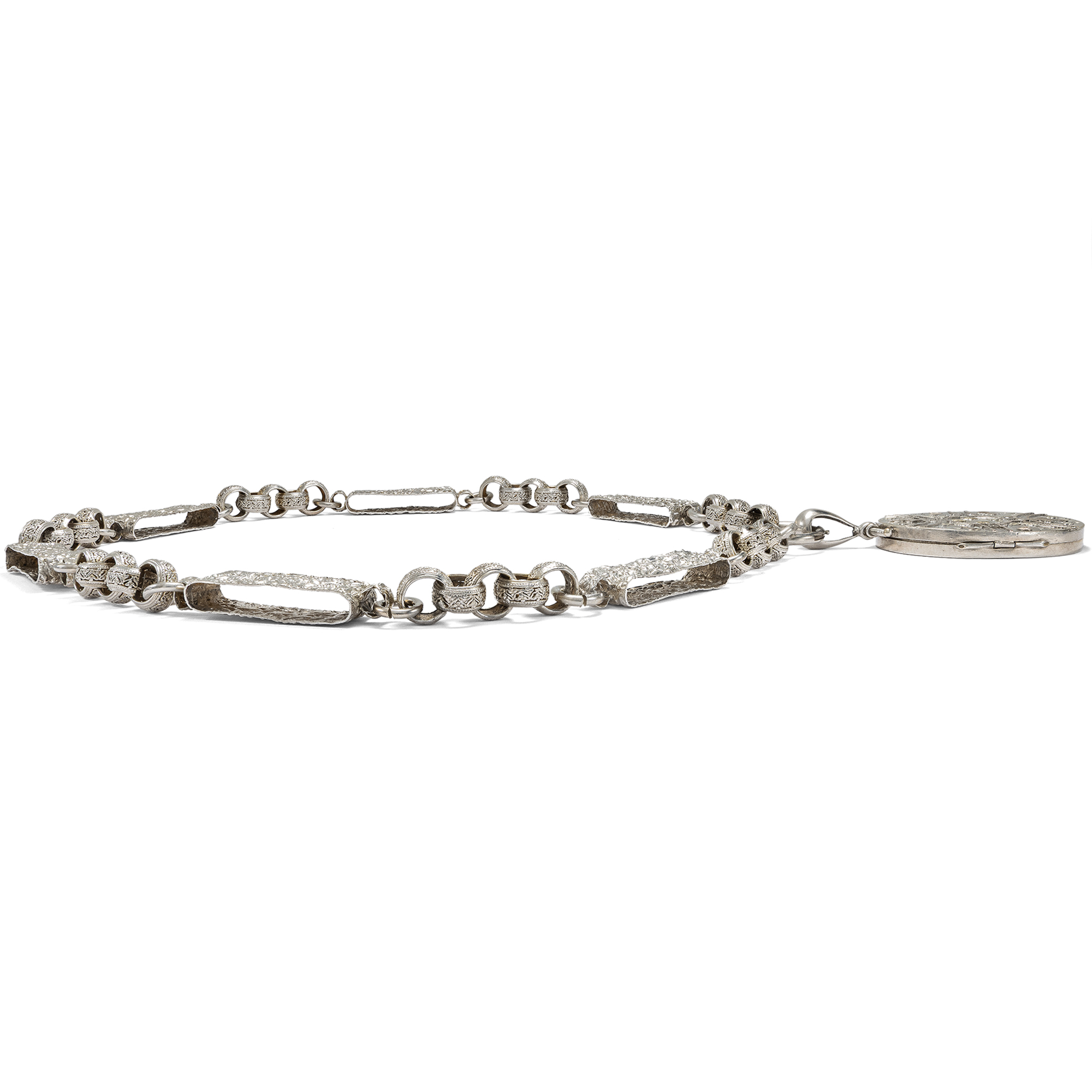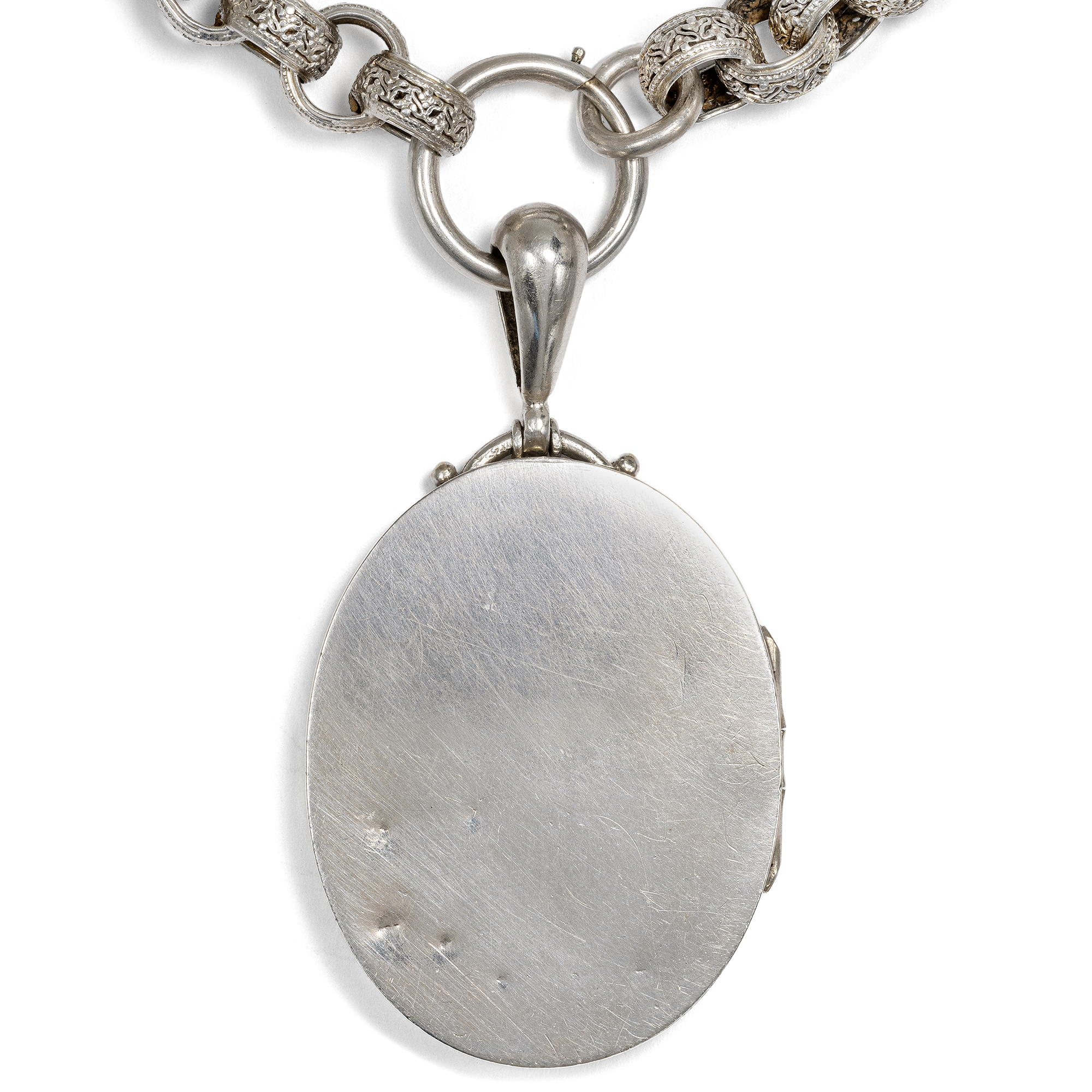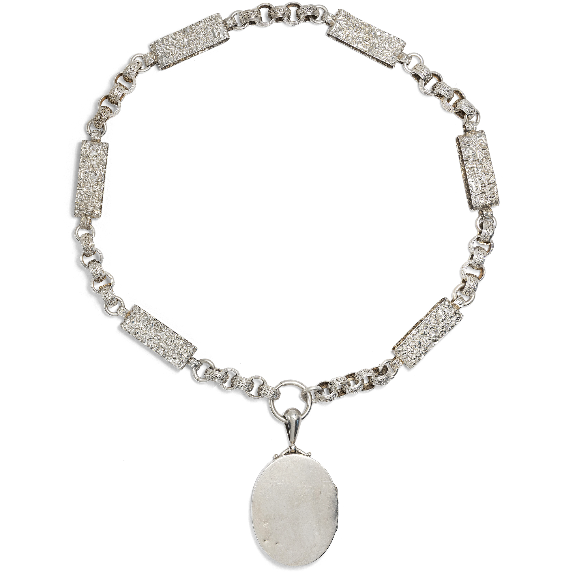 Im letzten Drittel des 19. Jahrhunderts begannen britische Künstler zunehmend, die tradierten Werte des Kunsthandwerks infrage zu stellen. Ein Ziel war dabei, sich von der Zurschaustellung kostbarer Materialien als Selbstzweck zu lösen. Nicht nur kostbare Juwelen in Gold konnten schön sein und sollten den Wert eines Schmuckstücks bestimmen – vielmehr sollte vor allem der ästhetische Wert eines Entwurfs wertgeschätzt werden. So entstand Silberschmuck, der von breiteren Schichten der Gesellschaft erworben werden konnte. Diese Haltung, der Schönheit einen über allem anderen stehenden Wert beizumessen, nannte man Ästhetizismus bzw. Aesthetic Movement. Form und Entwurf sollten dabei natürlich originell sein und sich nicht auf den althergebrachten Formen ausruhen, welche seit Jahrzehnten wiederholt wurden. Das hier vorliegende Collier zeigt dies mustergültig. Die Kette ist aus unterschiedlich geformten Gliedern gebildet. Sechs große Spangen aus Silber zeigen ein aufwändig geprägtes Muster aus Blütenformen, die an kräftig gewirktem Brokatstoff erinnern. Ineinander gelegte, breite Ringe mit ebenfalls reliefierter Oberfläche halten die Spangen zusammen und komplettieren das Collier. Das Medaillon selbst ist an einem schlichten Federring befestigt. Es zeigt eine glatte Rückseite, die Schauseite wirkt wie der Blick in einen blütenberankten Pavillon. Auflagen aus Rotgold und Gelbgold bilden zusammen mit feinen Gravuren ein Arrangement aus Trichterwinden und Vergissmeinnicht, denen in der Blumensprache die Bedeutung liebevollen Erinnerns zukommt. In seinem antiken, möglicherweise originalen Etui hat sich das Set hervorragend erhalten. Wir konnten es in London entdecken, wo es vermutlich von den Juwelieren Howell, James & Co. in der Regent Street hergestellt wurde.