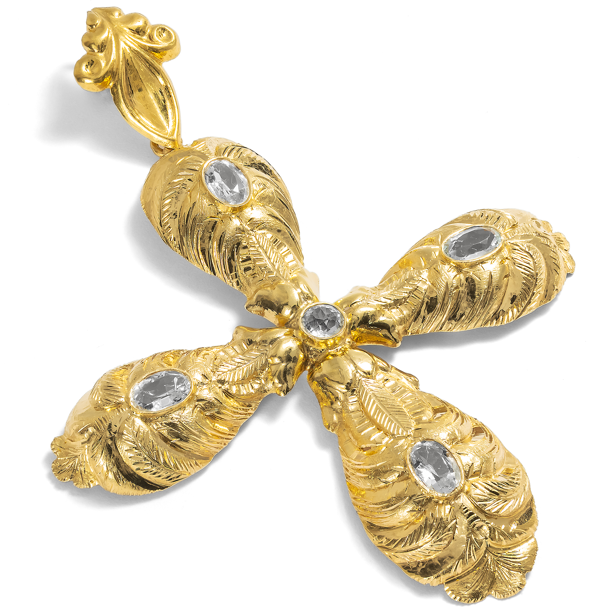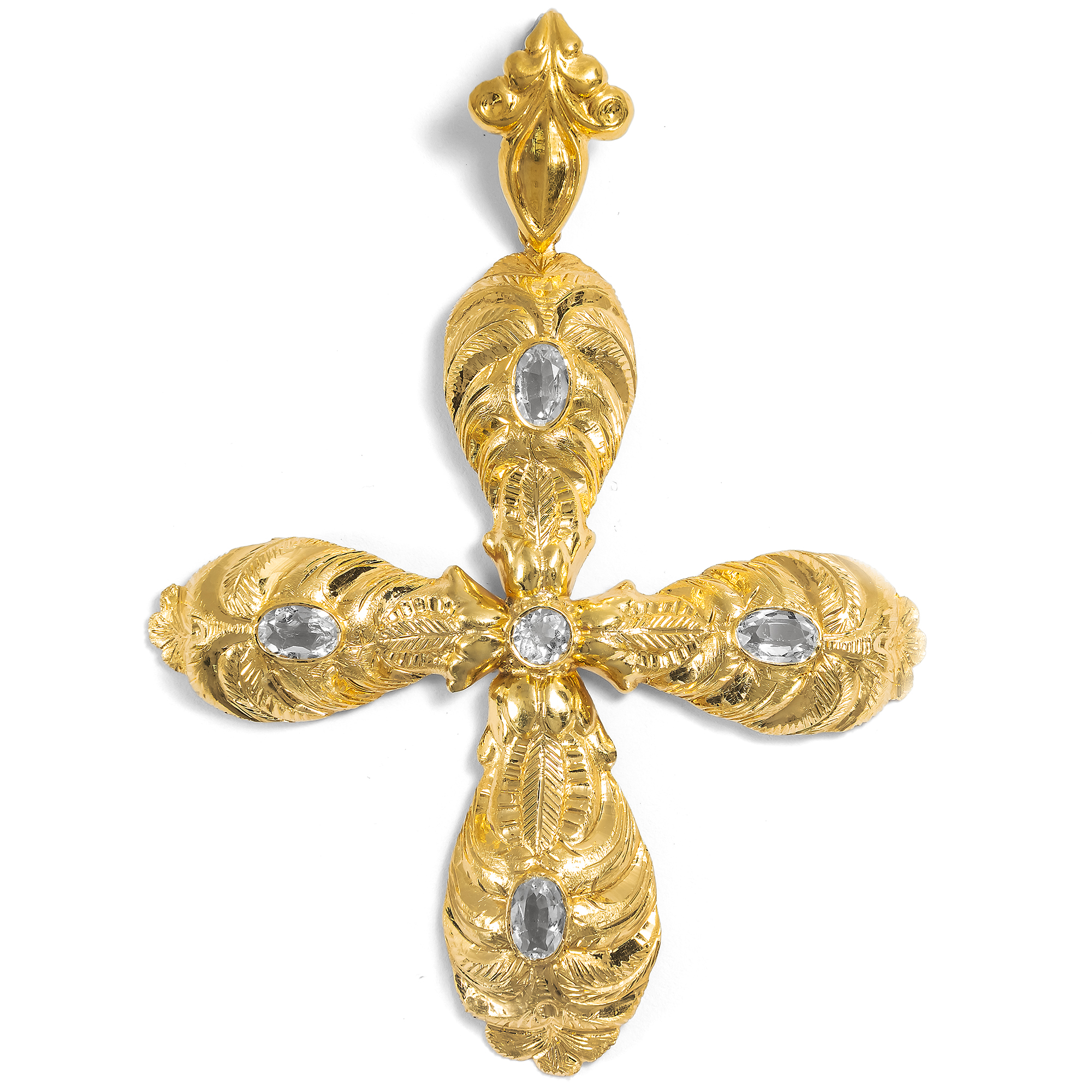 Der Mensch, die Natur und die Religion – das Zusammenspiel dieser drei Kräfte beschäftigte die Philosophen und Künstler im Zeitalter der Romantik. Man wendete sich gegen das Dogma der Kirche und verstand Glauben als zutiefst persönliche, subjektive Erfahrung. Religion sei „Sinn und Geschmack für das Unendliche“, argumentierte etwa der Theologe Friedrich Schleiermacher 1799. Für viele Romantiker konnte gerade die Natur die Erfahrung des Erhabenen, Unendlichen, und damit religiöse Empfindungen hervorrufen. Dies wird etwa in Caspar David Friedrichs Tetschener Altar auf einprägsame Weise bildhaft. Der hier vorliegende Anhänger entstand gegen Ende dieser Epoche. Dabei verbindet der Entwurf das klassische Motiv des Tatzenkreuzes mit subtiler naturalistischer Ornamentik. Fünf natürliche Aquamarine sind in Kreuzform angeordnet. Sie sind in voluminöse Goldelemente eingelassen, die in der Mitte jeweils aus einem Akanthus-Ornament zu entspringen scheinen. Ein jeder Arm des Kreuzes scheint aus Blättern oder Federn zu bestehen, die sich zum Aquamarin hin wölben. Selbst die Anhängerschlaufe ist ornamental gestaltet und vervollständigt so den opulenten Eindruck des Stückes. Sentimentale und naturalistische Motive in Gold und Farbsteinen prägten das Schmuckschaffen noch bis in die Mitte des 19. Jahrhunderts. Unser Kreuz entstand ausweislich seiner Verarbeitung, seines Entwurfs und Formats in der Zeit um 1830, als nach der kühlen, zurückhaltenden Ästhetik des Neoklassizismus und den Entbehrungen der napoleonischen Kriege wieder kräftige Farben und Volumina in die Welt der Mode zurückkehrten. Er ist ein wohlerhaltenes,sehr gut tragbares Beispiel für einen Schmuck aus der spätromantischen Zeit.