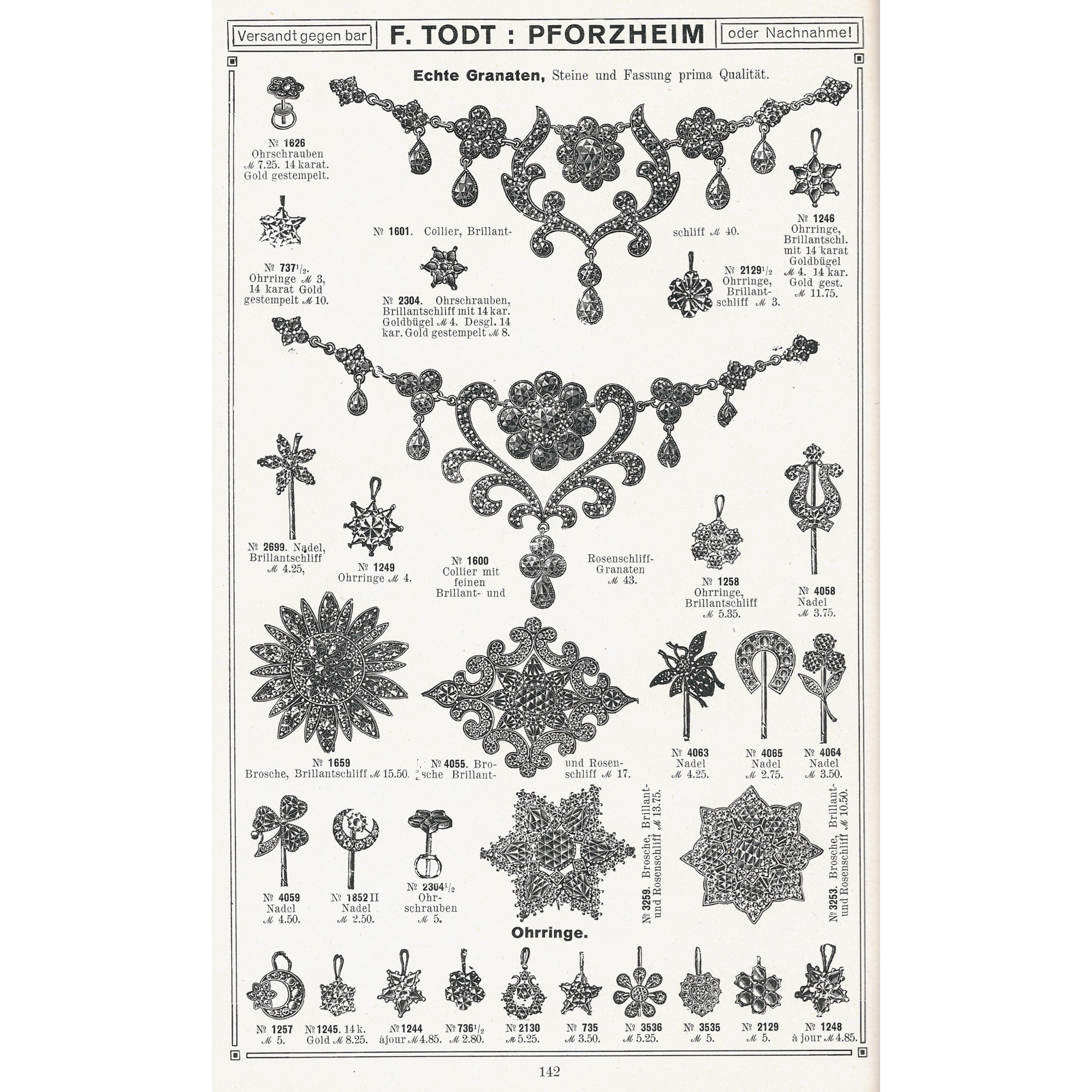 Seit Jahrhunderten schon werden die verführerisch rot leuchtenden Granate zu Schmuck ganz unterschiedlicher Art verarbeitet. Große, kostbare Steine schmückten einst die farbenfrohen Colliers des Barock und Rokoko. Die Form des Granatschmucks, die wir heute am ehesten mit diesem Stein verbinden – Sterne und Blüten, dicht an dicht besetzt mit unzähligen Granaten – entwickelte sich Mitte des 19. Jahrhunderts und wurde schnell zum Publikumsliebling. Das hier vorliegende Collier zeigt, wie beliebt Granatschmuck auch zu Beginn des 20. Jahrhunderts noch war. Der Entwurf präsentiert an einer zarten Kette, die aus kleinen Blüten aus je sieben Granaten gebildet wird, eine große, plastisch entworfene Blüte als Anhänger. Die Mitte ist kuppelförmig gewölbt, die Blütenblätter schwingen nach vorn. Feurigen Granate im Rosenschliff, sorgfältig in verschiedenen Größen gesetzt, lassen das Stück lebendig funkeln. Gefasst sind sie in vergoldetem Tombak, wobei das Metall schauseitig kaum sichtbar ist. Als ein besonderer Clou des Colliers lässt sich die Blüte abnehmen und separat als Brosche tragen! Hierin entspricht das Collier ganz dem Geschmack des frühen 20. Jahrhunderts, als solche wandelbaren Schmuckstücke eine große Mode waren. Wir bilden anbei eine Seite aus dem Katalog der Fa. Todt, Pforzheim aus dem Jahr 1914 ab, der zeigt, dass Granatschmucks noch weit bis in das 20. Jahrhundert hinein beliebt war. Vgl. Sie besonders die blütenförmige Brosche links unten. Unser Collier wird in den ersten Jahren nach 1900 entstanden sein. Ein wundervoller Blickfang, der noch heute zu vielerlei Outfits getragen werden kann.