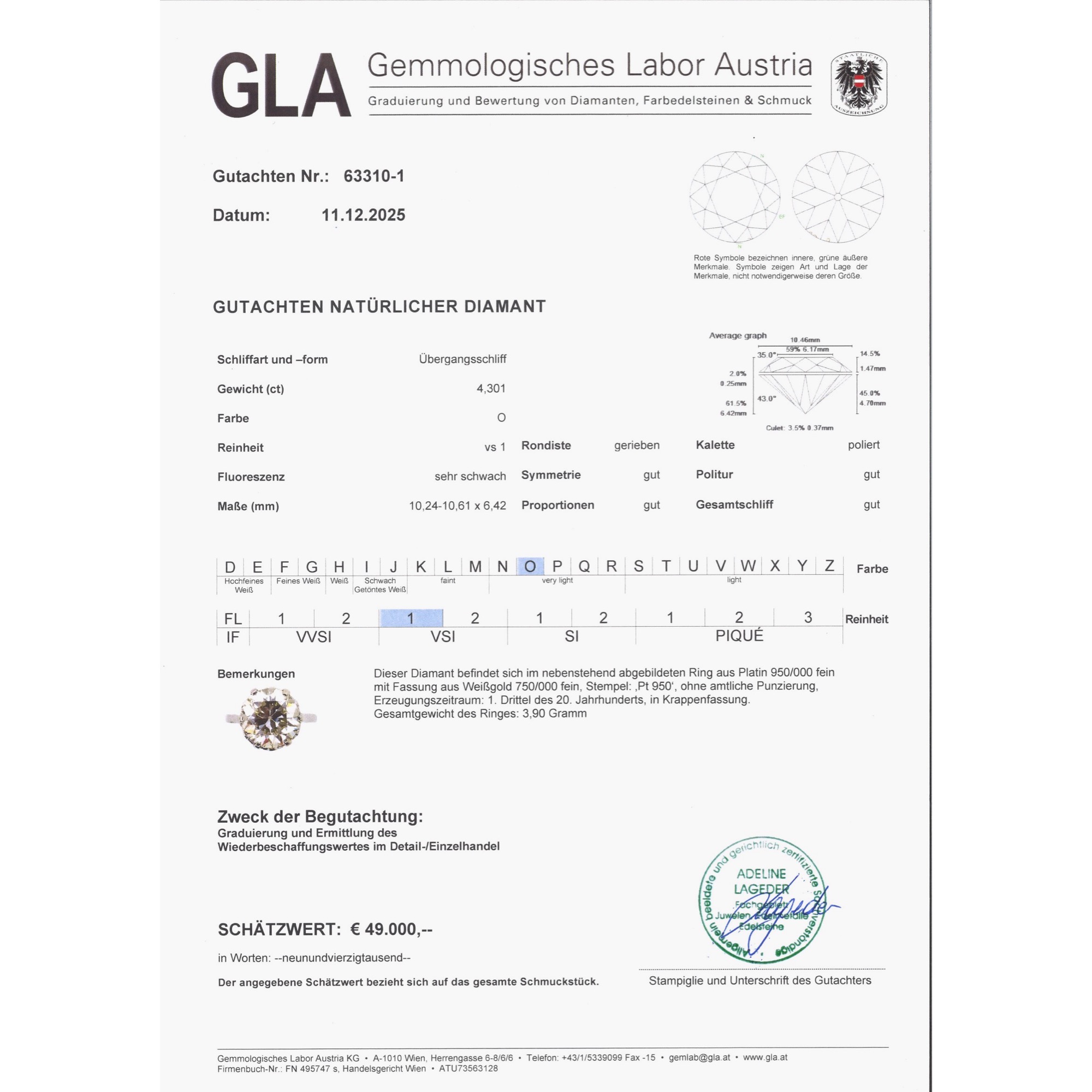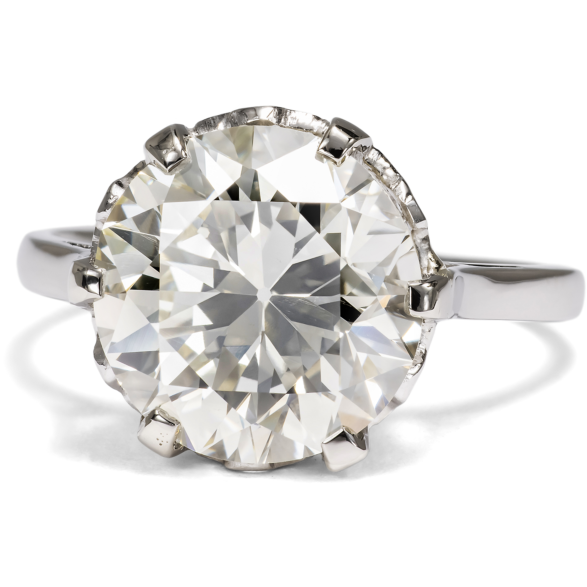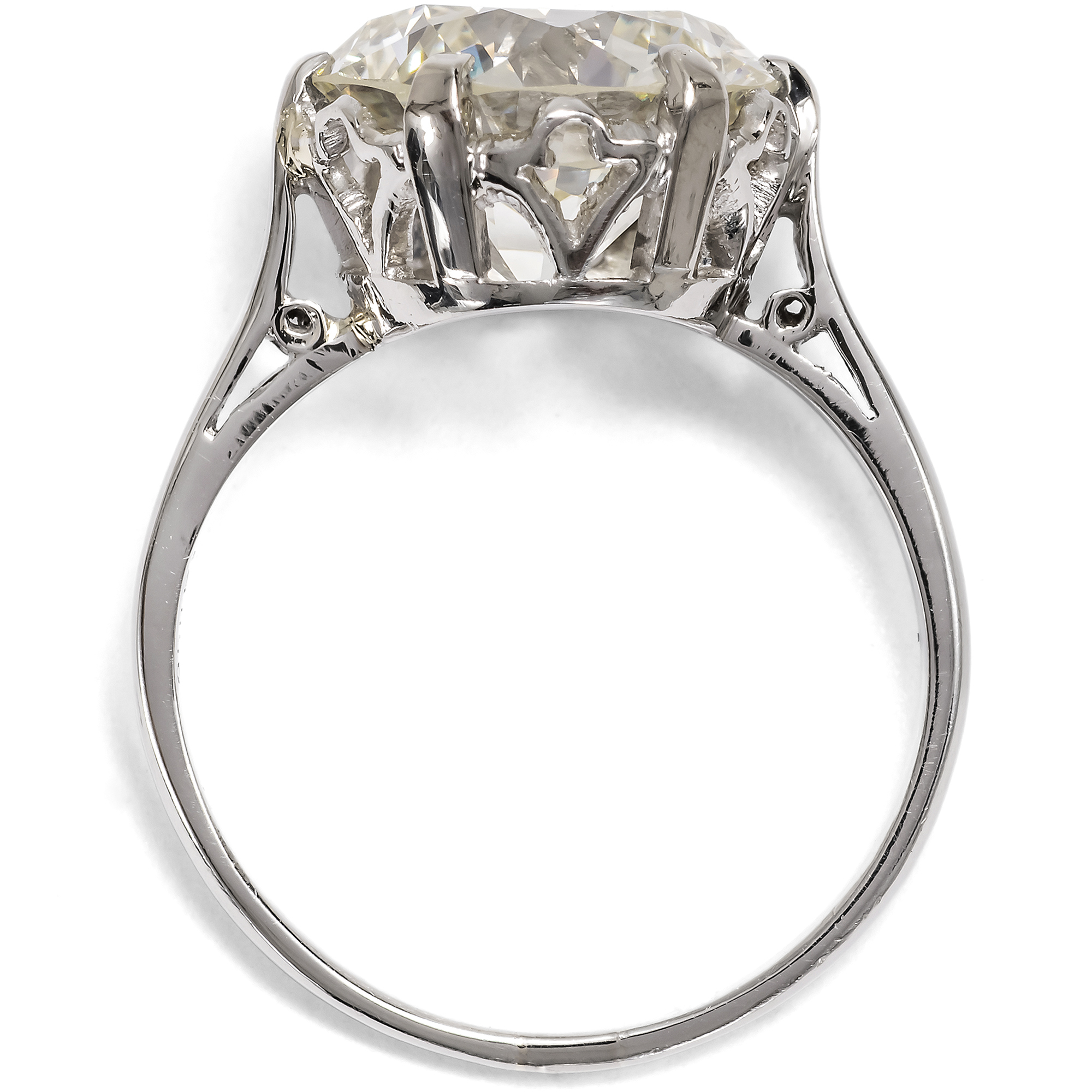 Ein großer, qualitätvoller Diamant von rund 4,30 Karat ist der Mittelpunkt dieses fein gearbeiteten Ringes. Der große Diamant ist im sog. „Übergangsschliff“ geformt, jener frühen Form des Brillantschliffes, welche den Übergang vom Altschliff zum modernen Vollschliff markiert. Er ist warm getönt, was ein schöner Grundton unter dem bunten Feuer des Steines ist. Zudem ist der Diamant sehr rein. Im Stein zeigen sich nur unter der Lupe sehr kleine Einschlüsse (VS1). Der Diamant funkelt in einer luftigen Krappenfassung aus hochkarätigem Weißgold, die von einer Ringschiene aus Platin gehalten wird. Von oben gesehen lenkt nichts vom prachtvollen Diamanten ab. Er steht ganz für sich und bestimmt die Wirkung des Schmuckstücks allein. Von der Seite gesehen überrascht die Fassung durch kleine Lilienblüten, welche zwischen die Krappen eingestellt sind. Der Schliff des Diamanten und die Gestaltung der eleganten Fassung lassen uns den Ring in die Jahre um 1930 datieren. Er kam aus der Schweiz zu uns, wo er möglicherweise auch entstanden ist. Begleitet wird der Ring von detaillierten Gutachten aus Wien.