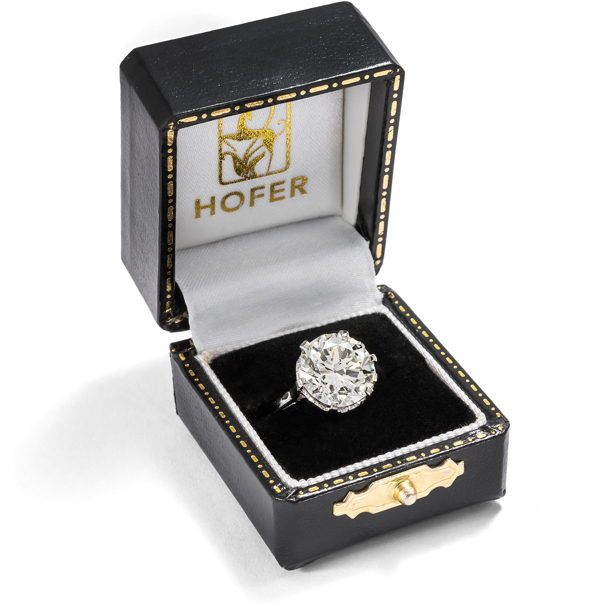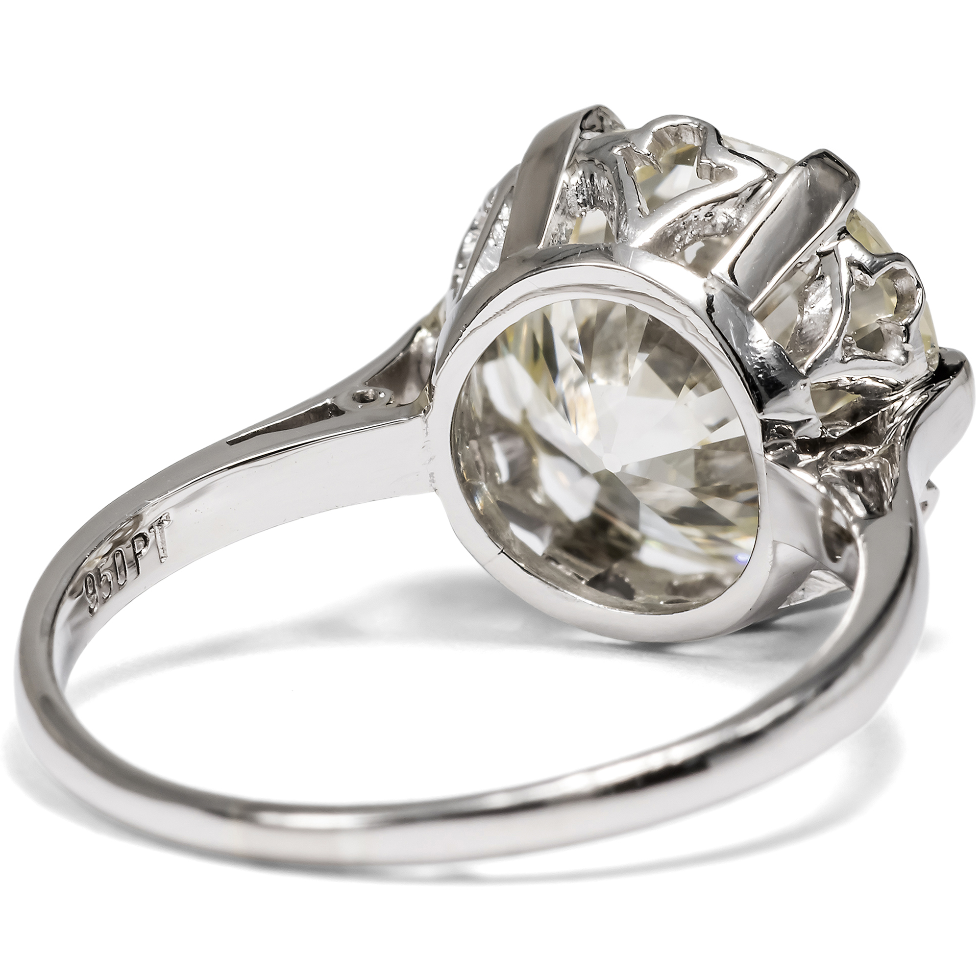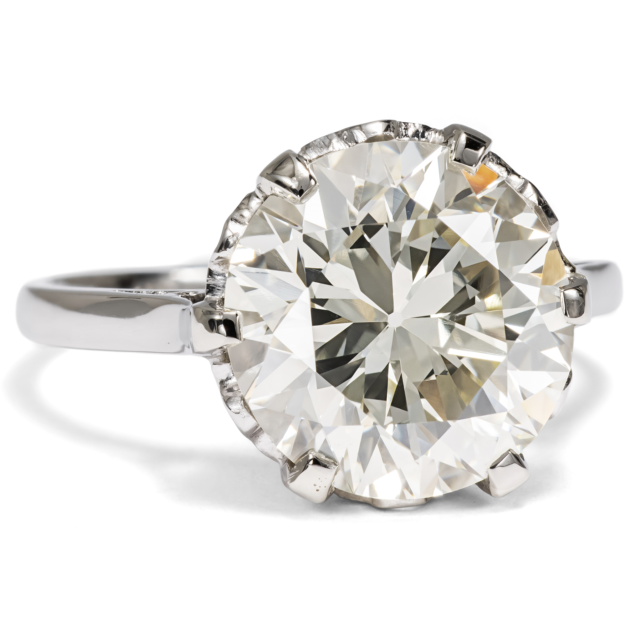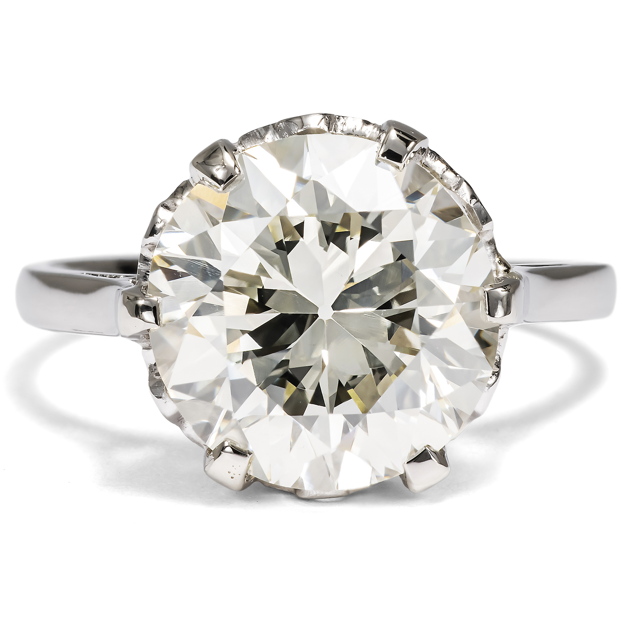 Ein großer, qualitätvoller Diamant von rund 4,30 Karat ist der Mittelpunkt dieses fein gearbeiteten Ringes. Der große Diamant ist im sog. „Übergangsschliff“ geformt, jener frühen Form des Brillantschliffes, welche den Übergang vom Altschliff zum modernen Vollschliff markiert. Er ist warm getönt, was ein schöner Grundton unter dem bunten Feuer des Steines ist. Zudem ist der Diamant sehr rein. Im Stein zeigen sich nur unter der Lupe sehr kleine Einschlüsse (VS1). Der Diamant funkelt in einer luftigen Krappenfassung aus hochkarätigem Weißgold, die von einer Ringschiene aus Platin gehalten wird. Von oben gesehen lenkt nichts vom prachtvollen Diamanten ab. Er steht ganz für sich und bestimmt die Wirkung des Schmuckstücks allein. Von der Seite gesehen überrascht die Fassung durch kleine Lilienblüten, welche zwischen die Krappen eingestellt sind. Der Schliff des Diamanten und die Gestaltung der eleganten Fassung lassen uns den Ring in die Jahre um 1930 datieren. Er kam aus der Schweiz zu uns, wo er möglicherweise auch entstanden ist. Begleitet wird der Ring von detaillierten Gutachten aus Wien.