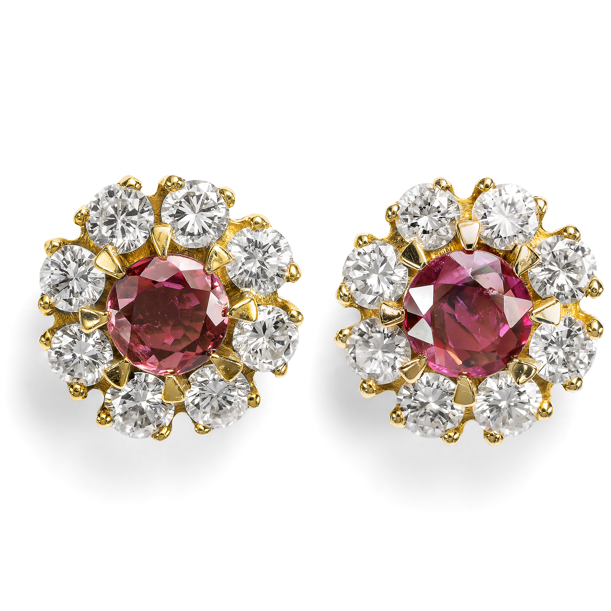 Rubine zählen zu den kostbarsten Edelsteinen überhaupt. Ihre Farbe, die von lebhaftem Karmin bis zu tiefem, glühendem Rot reicht, macht sie schon seit Jahrhunderten zu Objekten der Begierde. Ihr hoher Härtegrad macht sie zudem ideal für Schmuckstücke, die über Generationen hinweg getragen werden können. Das vorliegende Paar runder Ohrstecker trägt jeweils einen dieser natürlichen Edelsteine, eingefasst in einen Kranz aus acht funkelnden weißen Brillanten. Die Edelsteine ruhen in Fassungen aus hochkarätigem Gelbgold, die so gearbeitet sind, dass viel Licht an die Steine gelangt und ihr Feuer ungehindert zur Geltung kommt. Insgesamt sind etwa 1,40 Karat Diamanten im Brillantschliff gefasst, während die beiden Rubine zusammen etwas mehr als ein Karat auf die Waage bringen. Die Ohrstecker aus den 1980er Jahren sind hervorragend erhalten und wurden in der Schmuckmanufaktur Georg Leicht in Pforzheim gefertigt. Ein unabhängiges Gutachten bestätigt die Qualität der verwendeten Materialien. Ein Paar in klarer Form und von zeitloser Schönheit, geschaffen, um dezent und dennoch unübersehbar zu strahlen.