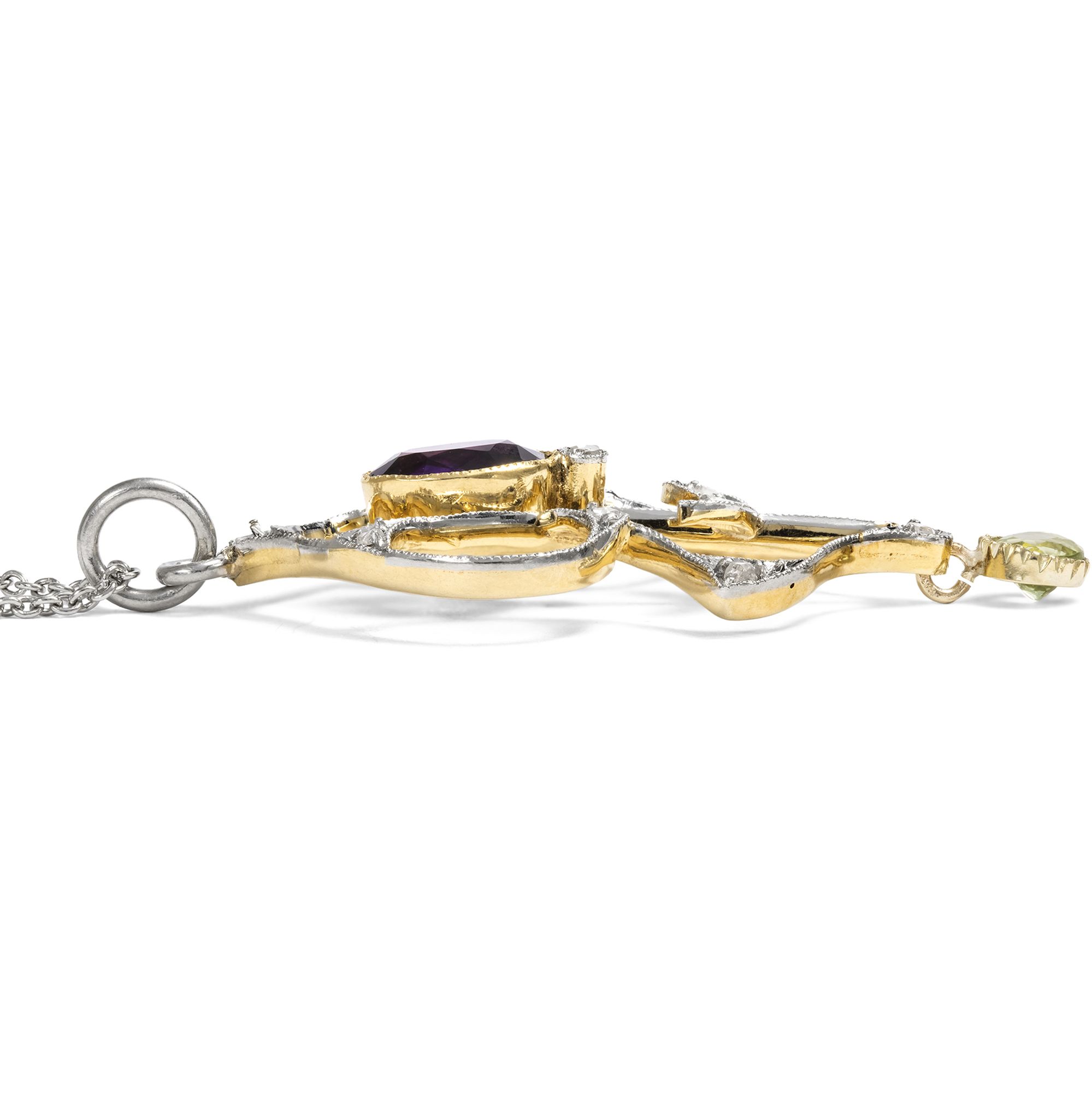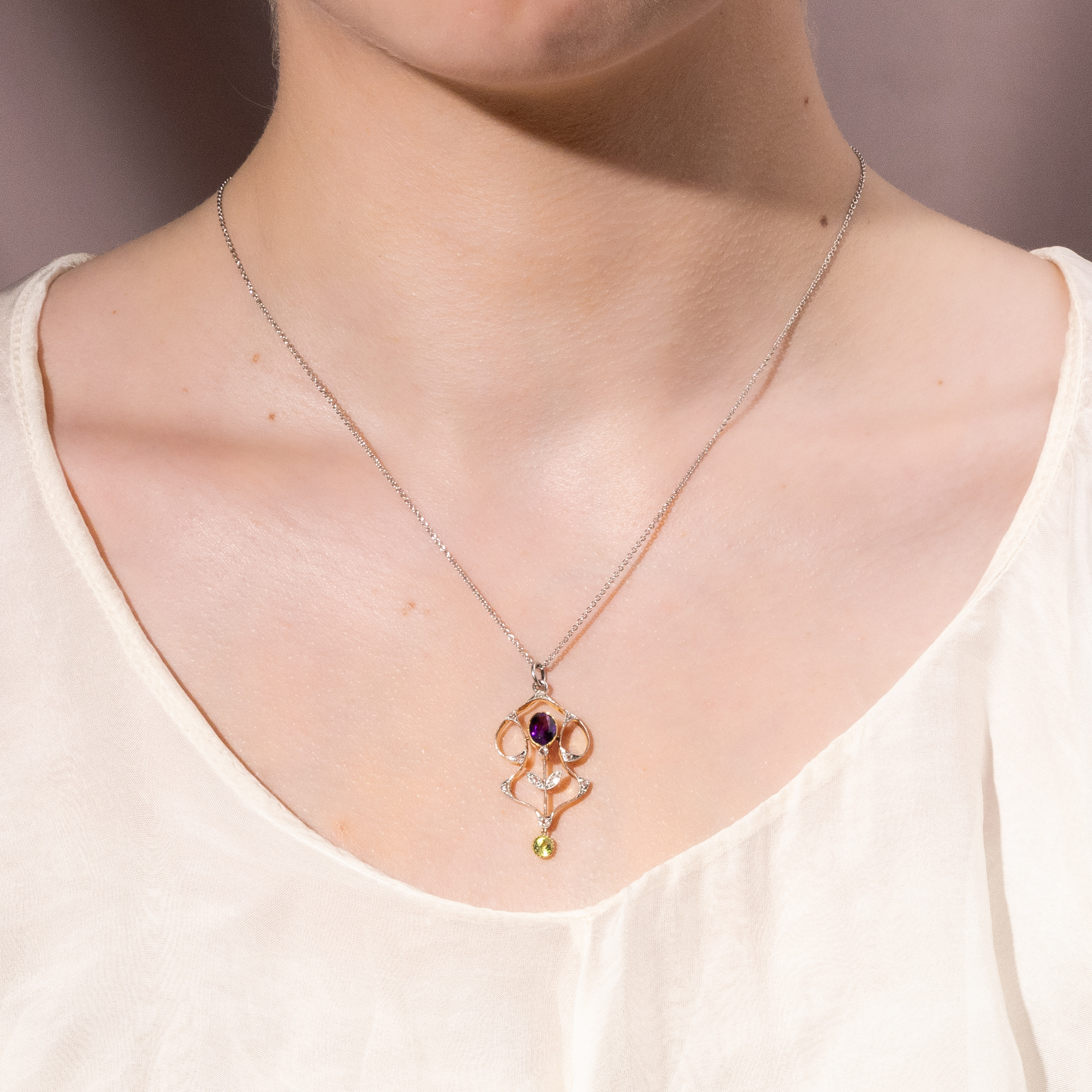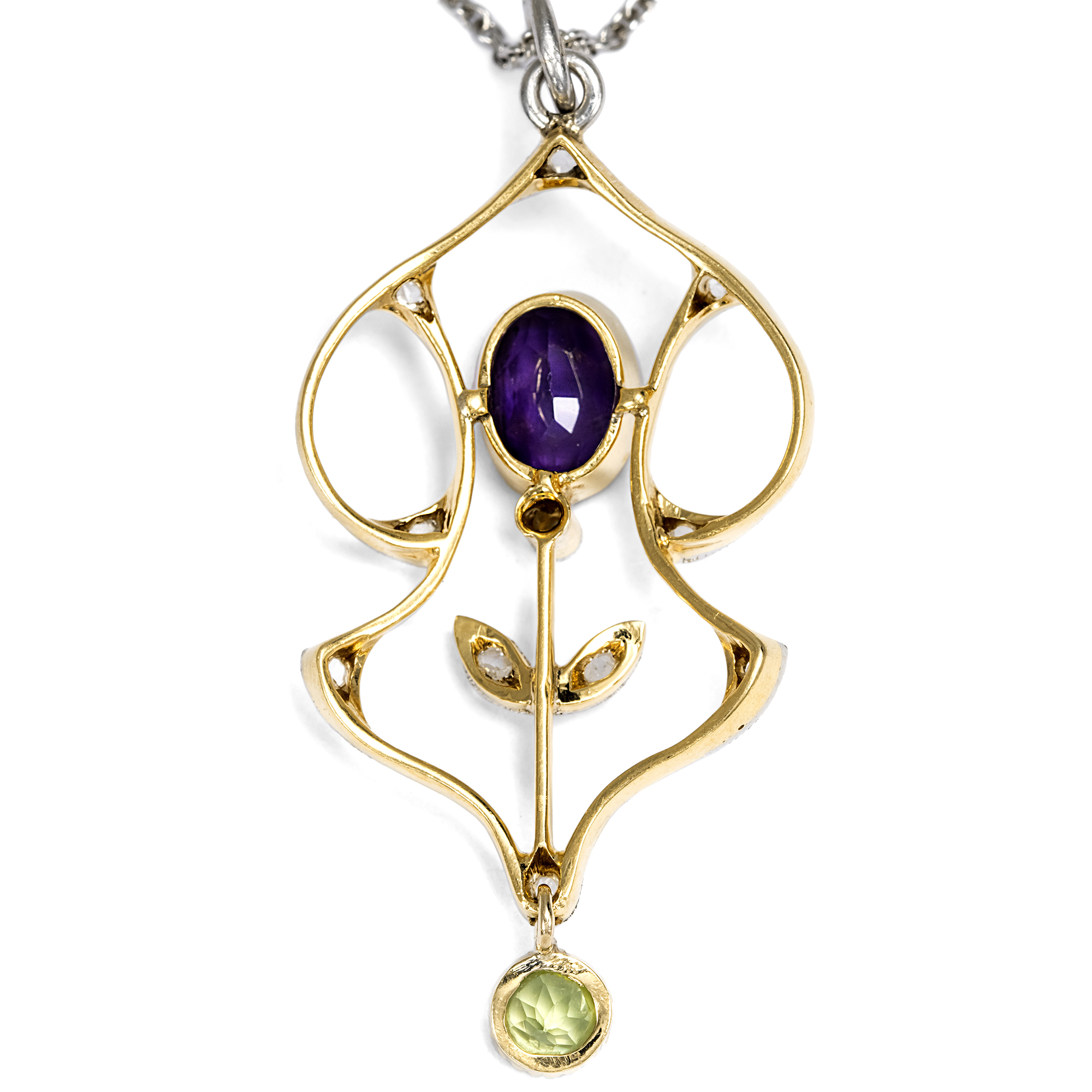 Als die Suffragetten in den frühen Jahren des 20. Jahrhunderts mehr Rechte für Frauen erkämpften, etablierte sich alsbald ein bestimmter Farbklang zu ihrer Erkennung: Grün, Weiß und Violett. Eine der führenden Figuren der Frauenbewegung, Emmeline Pethick-Lawrence, hatte diesen aus symbolischen Gründen vorgeschlagen. So schrieb sie 1908: „Purpur, wie jedermann weiß, ist eine königliche Farbe. Es steht für das königliche Blut, das in den Adern einer jeden Suffragette fließt, für den Instinkt der Freiheit und Würde; Weiß steht für die Reinheit im privaten und öffentlichen Leben; Grün ist die Farbe der Hoffnung und des Frühlings.“ Nur wenig später, im Jahre 1910, ließ der Union Labor Advocate – die Zeitschrift der National Women’s Trade Union League – verlauten, die Farben seien auch als Akronym zu verstehen. Nehme man die Anfangsbuchstaben der Farben Grün, Weiß und Violett, so könnten diese ebenfalls für „Give Women Vote“ stehen, also: „Gebt Frauen das Wahlrecht“ – das, wofür die Suffragetten kämpften. Auch dies trug weiter zur Popularisierung des Farbklanges bei. Frauen trugen als Erkennungszeichen Schleifen in diesen Farben, Kleidung oder Schärpen, aber auch kostbaren Schmuck. Britische Schmuckfirmen wie Child & Child, Mappin & Webb, aber auch das berühmte Warenhaus Liberty verkauften in den Anfangsjahren des 20. Jahrhunderts verschiedenste Schmuckstücke in den Farben der Suffragetten. Im Fall des vorliegenden Kettenanhängers finden sich weiße Diamanten sowie ein violetter Amethyst und ein grüner Peridot – genau die Farben also, die zur Entstehungszeit des Anhängers als die Farben der Suffragetten galten. Die luftig durchbrochene Komposition ist mit hellem Platin belegt und zeigt die typische Formensprache der ersten Jahre des 20. Jahrhunderts. Sehr wahrscheinlich gehörte der Peridot mit seiner Fassung nicht immer schon zu dem Anhänger, denn die Farbe der Goldlegierung unterscheidet sich ein wenig von der des Anhängers. Ursprünglich war hier vielleicht eine Perle, oder ein zweiter Amethyst angefügt. Der Bezug zur Geschichte der Suffragetten wurde also erst in späterer Zeit hergestellt. Als Hommage an diese wichtige Zeit hat er uns gleichwohl sehr gut gefallen. Wir haben den Anhänger in London entdeckt und um eine zarte Ankerkette aus Platin ergänzt.