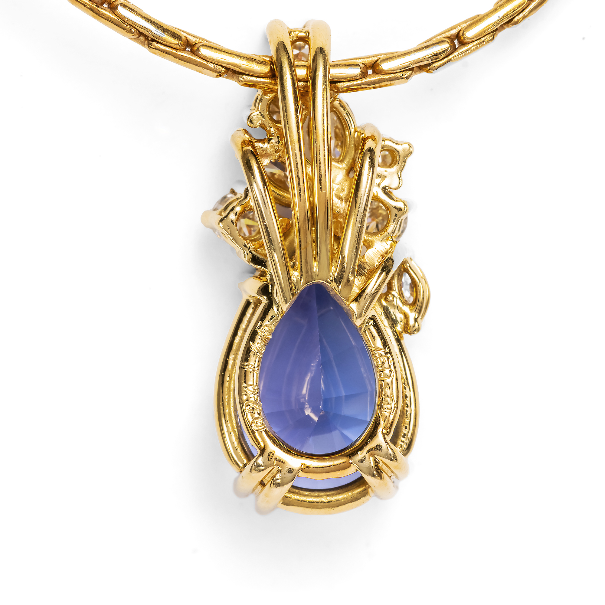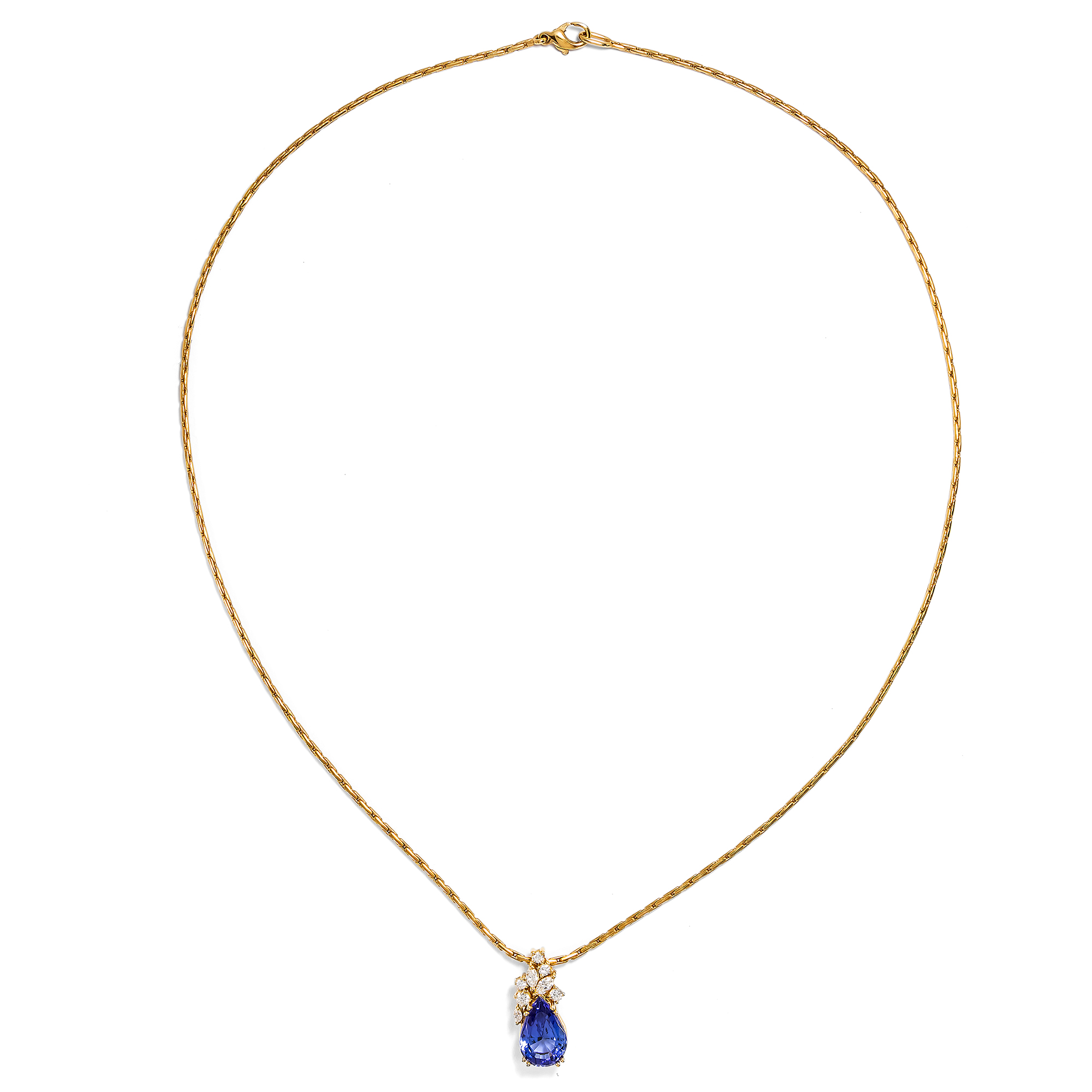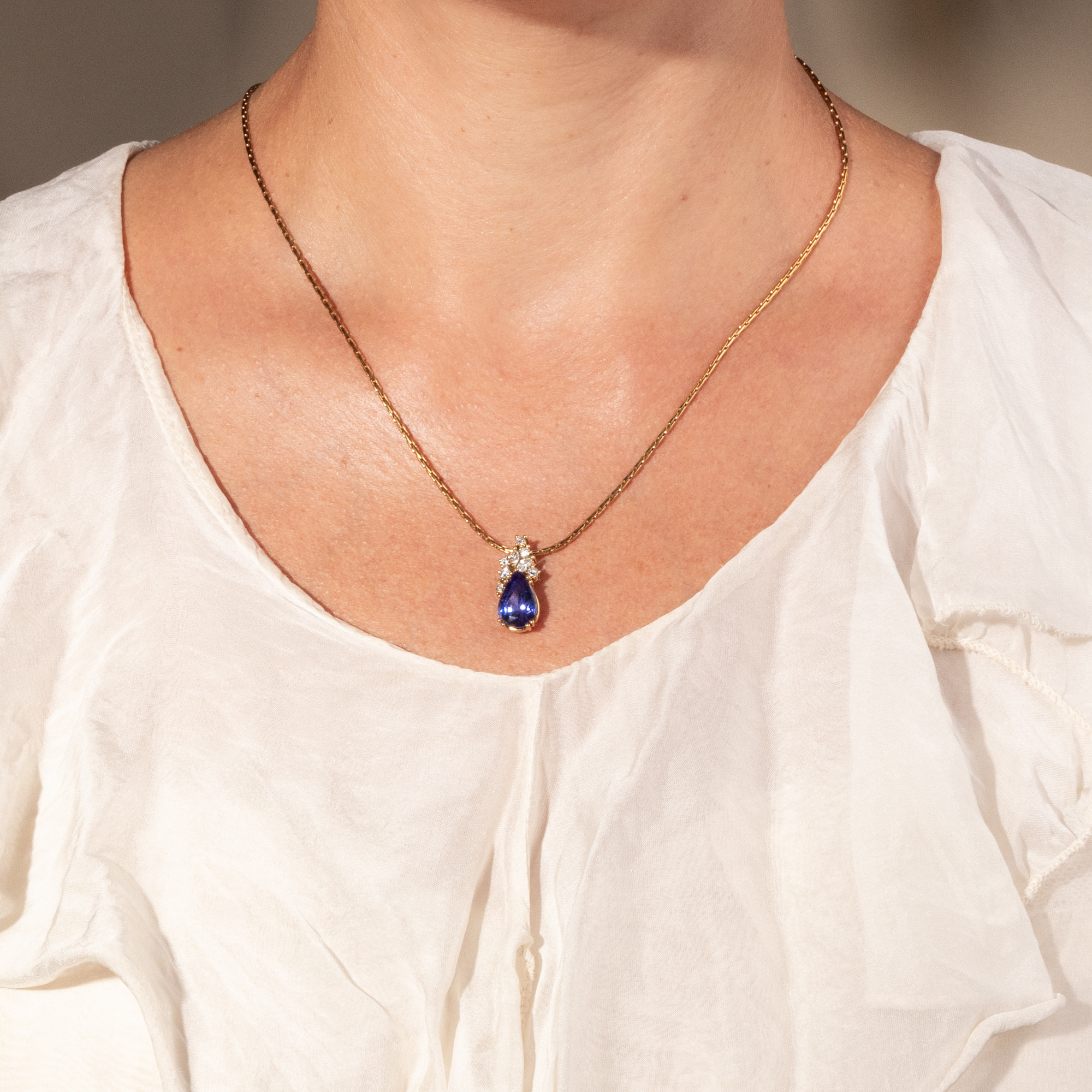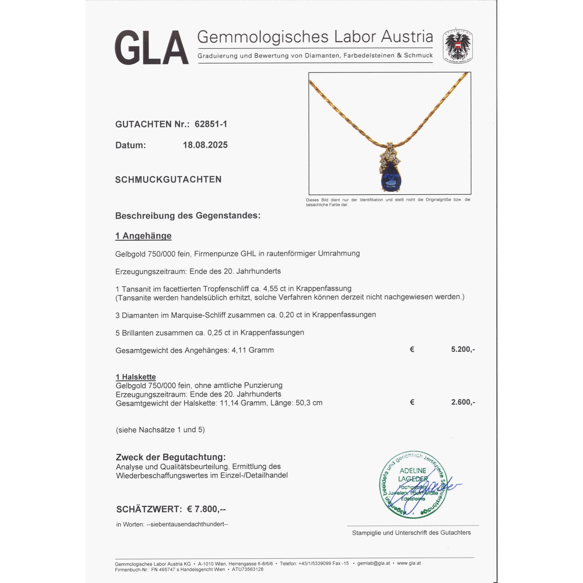 Als im Jahr 1967 Gemmologen erstmals unbekannte, tiefblaue Edelsteine aus dem Steppensand Tansanias nach New York brachten, ahnte zunächst niemand, welch außergewöhnlicher Schatz dort entdeckt worden war. Allein die Einkäufer bei Tiffany & Co. erkannten ihre Einzigartigkeit und sicherten sich die Rechte an diesem neuen Mineral. Der Edelstein, der auf der Erdoberfläche tausendmal seltener vorkommt als der Diamant, erhielt den Namen Tansanit – eine Hommage an sein Herkunftsland. Seine Farbe und strahlende Klarheit machten den Tansanit bald zu einem der begehrtesten Edelsteine der Welt. Der hier vorliegende Anhänger trägt einen prachtvollen Tansanit von etwa 4,55 Karat. Sein intensives Blau mit feinen violetten Nuancen erinnert an die Blüten einer Hyazinthe. Der Edelstein ist in Tropfenform geschliffen und bildet das Herzstück des Entwurfs. Darüber schimmern acht funkelnde Diamanten im Marquise- und Brillantschliff mit einem Gesamtgewicht von etwa 0,45 Karat. Sie sind in feine Krappen gefasst und verbinden sich zu einer harmonischen Komposition, die rückseitig zugleich die Aufnahme für die Goldkette bildet. Ein unabhängiges Gutachten aus Wien begleitet dieses Schmuckstück und beschreibt die Qualität der hier verwendeten Materialien und Edelsteine. So vereinen sich in diesem Anhänger aus der Manufaktur von Georg H. Leicht in Pforzheim Seltenheit und natürliche Schönheit zu einer bleibenden Kostbarkeit.