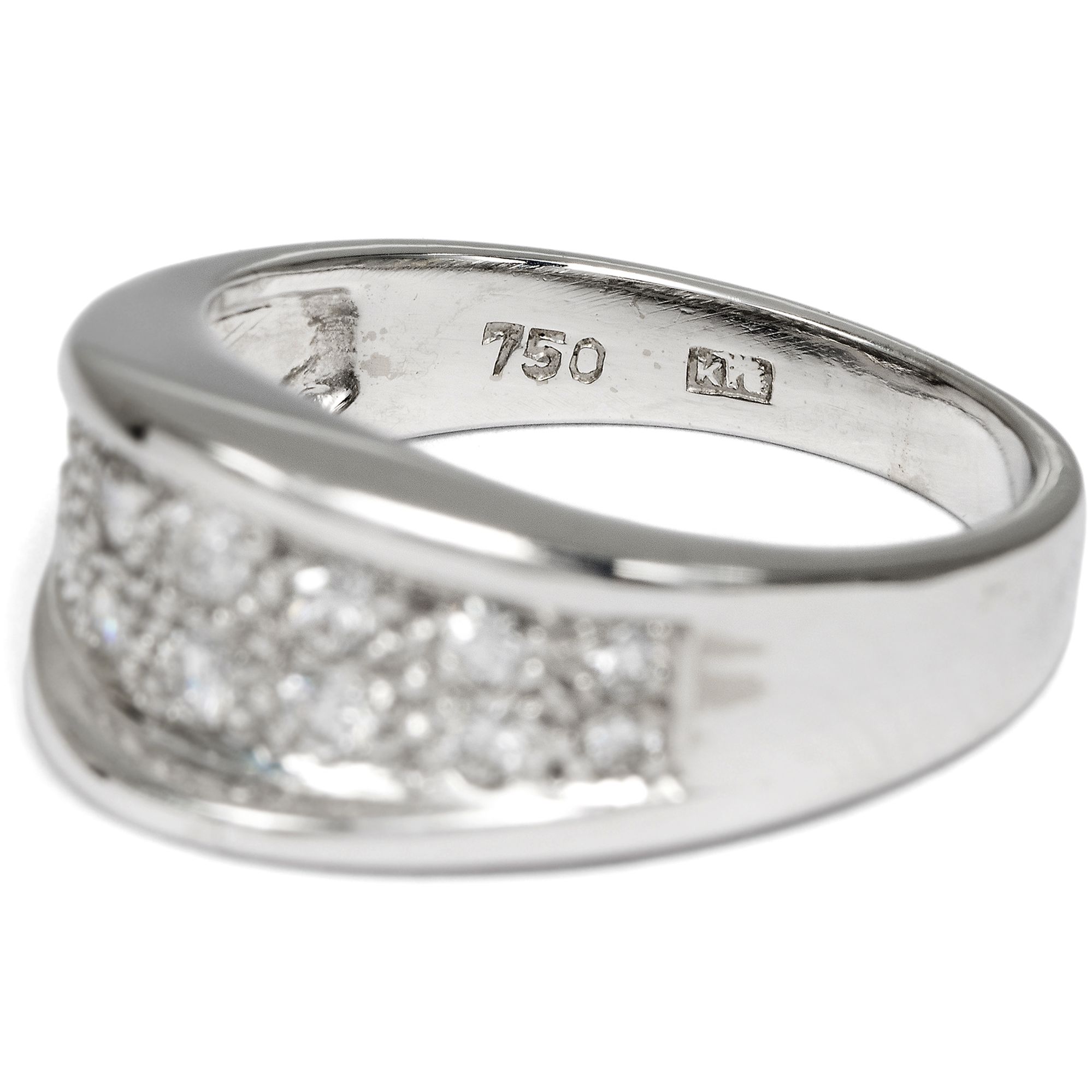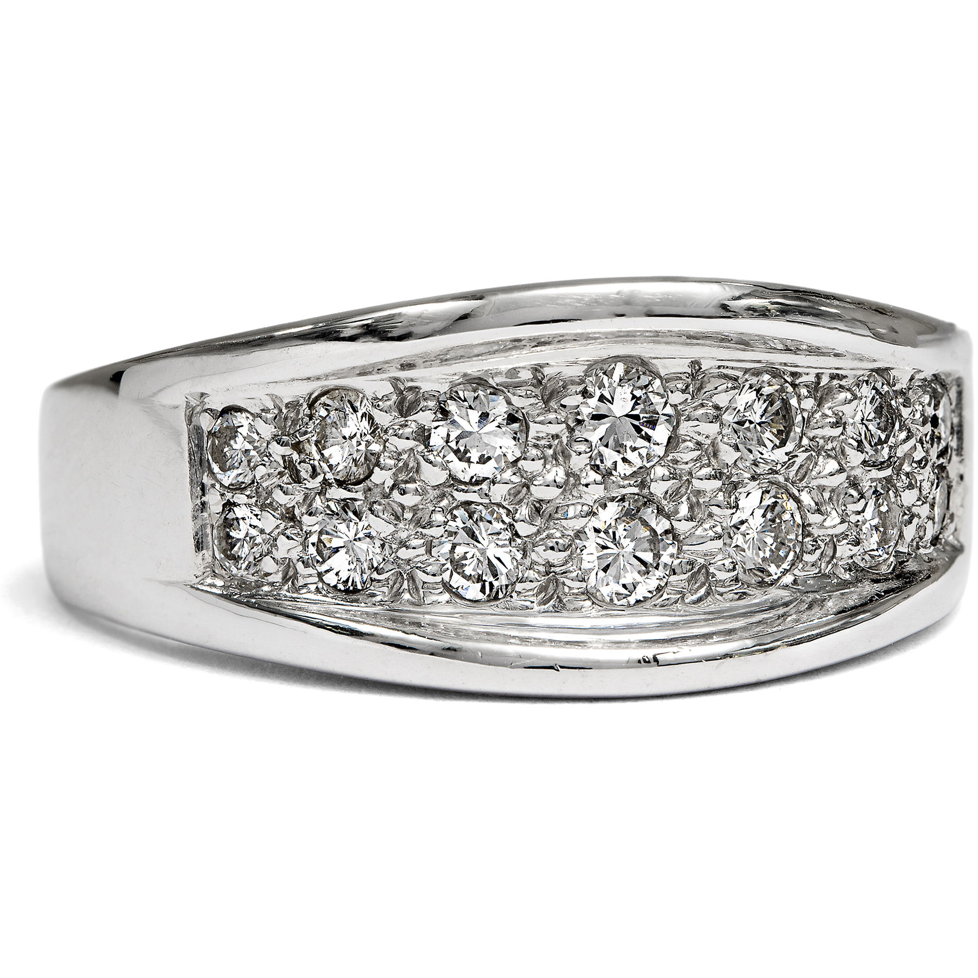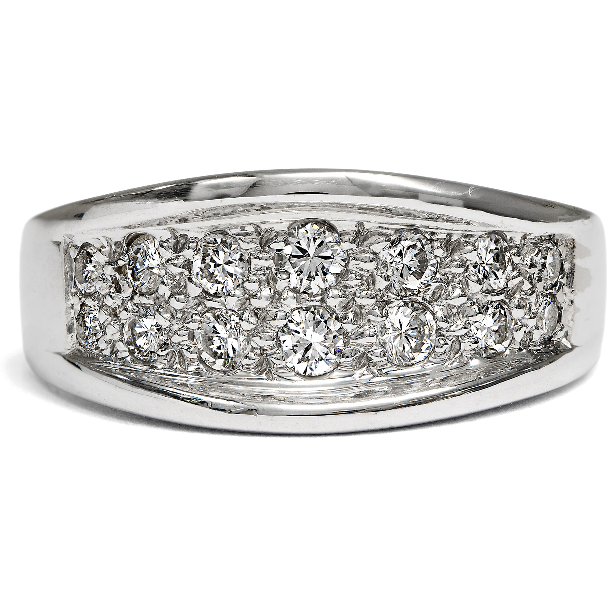 Dieser elegante Vintage-Ring aus hochkarätigem Weißgold, entstanden um 1980, entfaltet ein lebendiges Spiel weißer Lichtreflexe. Seine Oberfläche ist mit vierzehn Diamanten von zusammen etwa 0,44 ct dicht besetzt und wirkt wie ein funkelndes Feld aus Brillanz. Die verwendeten Steine sind von ausgesuchter Qualität: ausschließlich Diamanten der Farbstufe Feines Weiß (Top Wesselton) mit sehr guter Reinheit (VSI). Im Brillantschliff gearbeitet, zeigen sie ein lebhaftes, feuriges Funkeln. Zwei Reihen im Verlauf angeordneter Diamanten bilden den markanten Mittelpunkt des Designs. Die dynamisch gewölbte Schauseite ist vollständig im Pavé gefasst. Zwei hochgezogene Bögen strukturieren die Form und verstärken den Eindruck eines funkelnden Bandes aus Licht. So entsteht ein Schmuckstück von eindrucksvoller Präsenz und klarer, zeittypischer Gestaltung. Laut Stempelung handelt es sich um eine Arbeit der Juwelen- und Goldwarenfabrik Ludwig Carl Köhler, gegründet 1879 in Schwäbisch Gmünd, einem der bedeutendsten Zentren der deutschen Schmuckindustrie. Das Unternehmen spezialisierte sich auf die Herstellung hochwertiger Ringe. Bereits 1900 wurde die Manufaktur auf der Pariser Weltausstellung mit einer Silbermedaille ausgezeichnet. Der Ring, der hier in Berlin zu uns fand, überzeugt durch seine sorgfältige Ausführung und ist ein wirkungsvolles Highlight an jeder Hand.