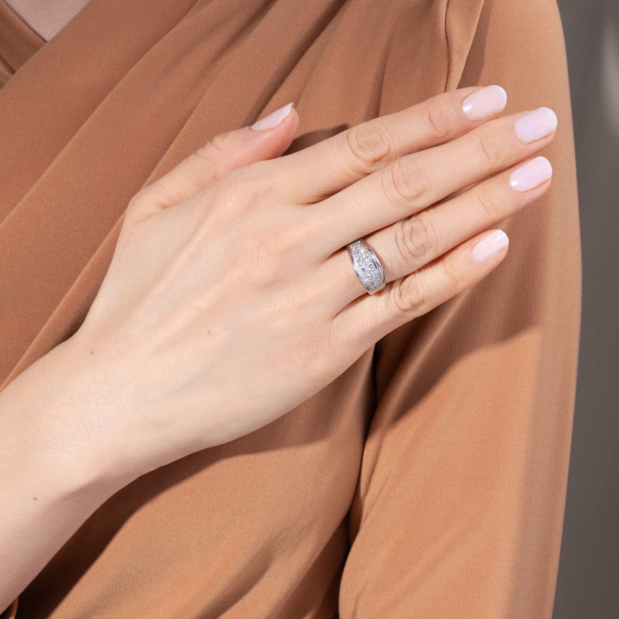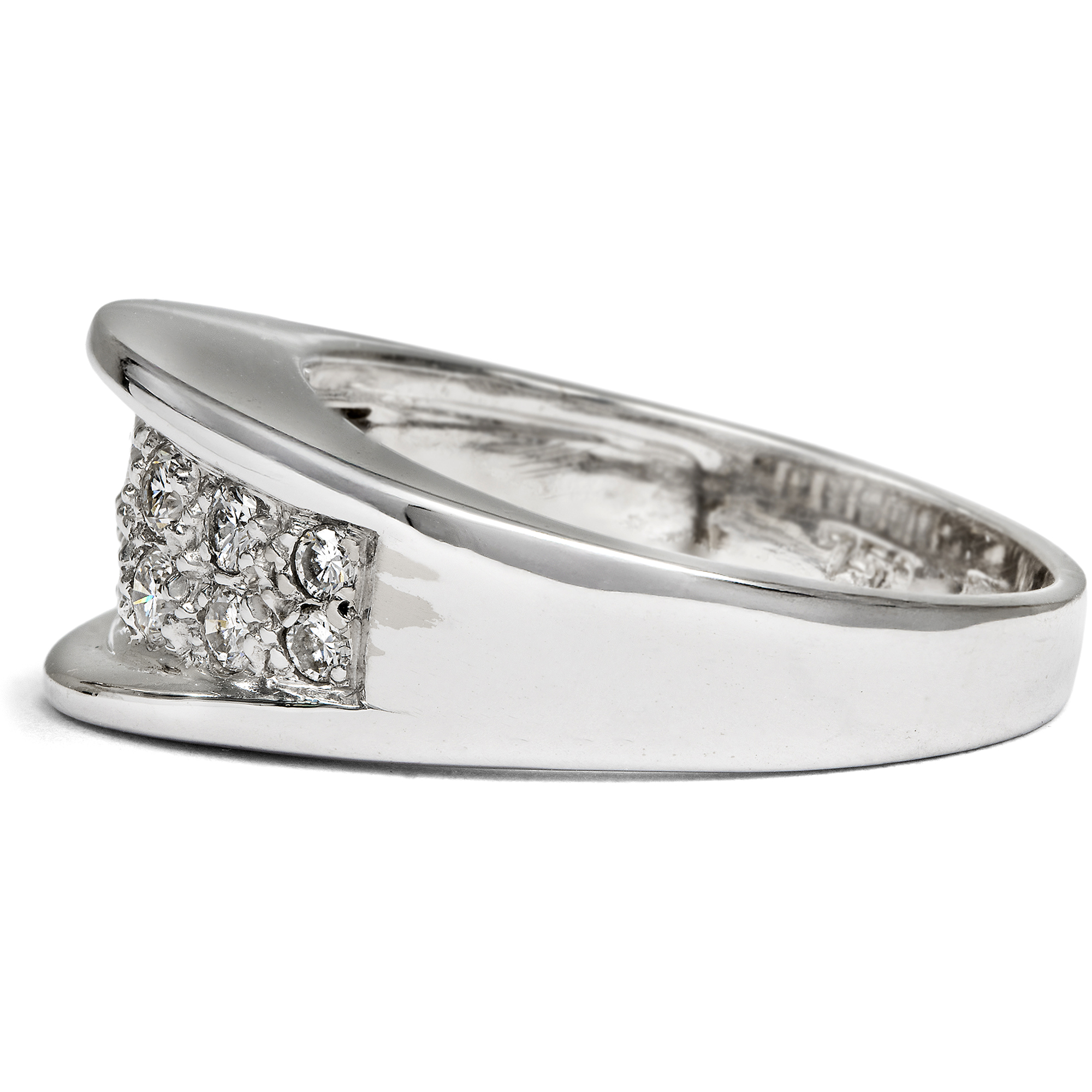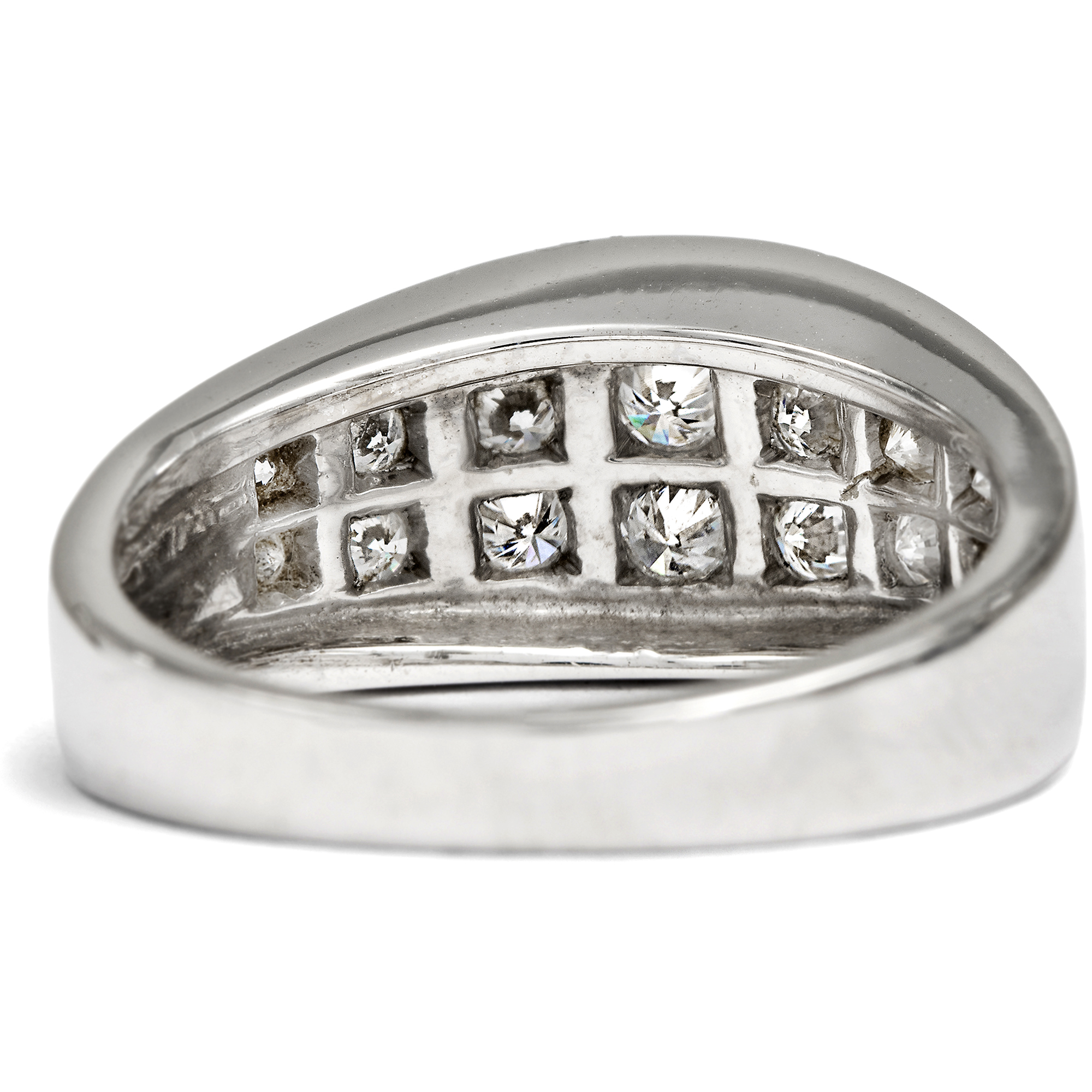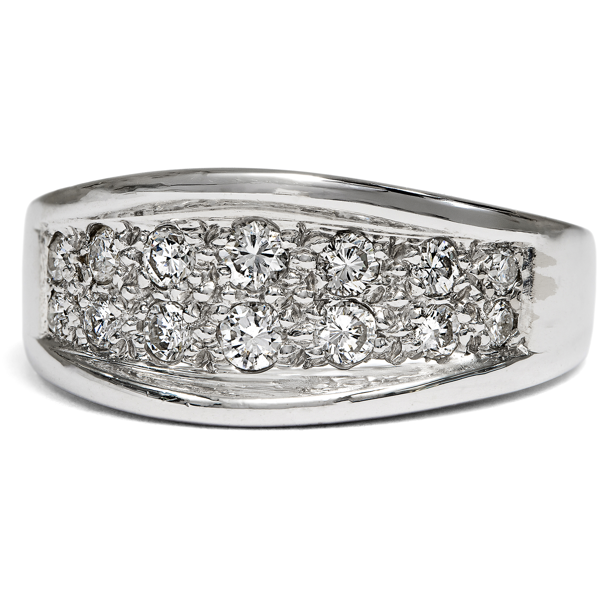 Dieser elegante Vintage-Ring aus hochkarätigem Weißgold, entstanden um 1980, entfaltet ein lebendiges Spiel weißer Lichtreflexe. Seine Oberfläche ist mit vierzehn Diamanten von zusammen etwa 0,44 ct dicht besetzt und wirkt wie ein funkelndes Feld aus Brillanz. Die verwendeten Steine sind von ausgesuchter Qualität: ausschließlich Diamanten der Farbstufe Feines Weiß (Top Wesselton) mit sehr guter Reinheit (VSI). Im Brillantschliff gearbeitet, zeigen sie ein lebhaftes, feuriges Funkeln. Zwei Reihen im Verlauf angeordneter Diamanten bilden den markanten Mittelpunkt des Designs. Die dynamisch gewölbte Schauseite ist vollständig im Pavé gefasst. Zwei hochgezogene Bögen strukturieren die Form und verstärken den Eindruck eines funkelnden Bandes aus Licht. So entsteht ein Schmuckstück von eindrucksvoller Präsenz und klarer, zeittypischer Gestaltung. Laut Stempelung handelt es sich um eine Arbeit der Juwelen- und Goldwarenfabrik Ludwig Carl Köhler, gegründet 1879 in Schwäbisch Gmünd, einem der bedeutendsten Zentren der deutschen Schmuckindustrie. Das Unternehmen spezialisierte sich auf die Herstellung hochwertiger Ringe. Bereits 1900 wurde die Manufaktur auf der Pariser Weltausstellung mit einer Silbermedaille ausgezeichnet. Der Ring, der hier in Berlin zu uns fand, überzeugt durch seine sorgfältige Ausführung und ist ein wirkungsvolles Highlight an jeder Hand.