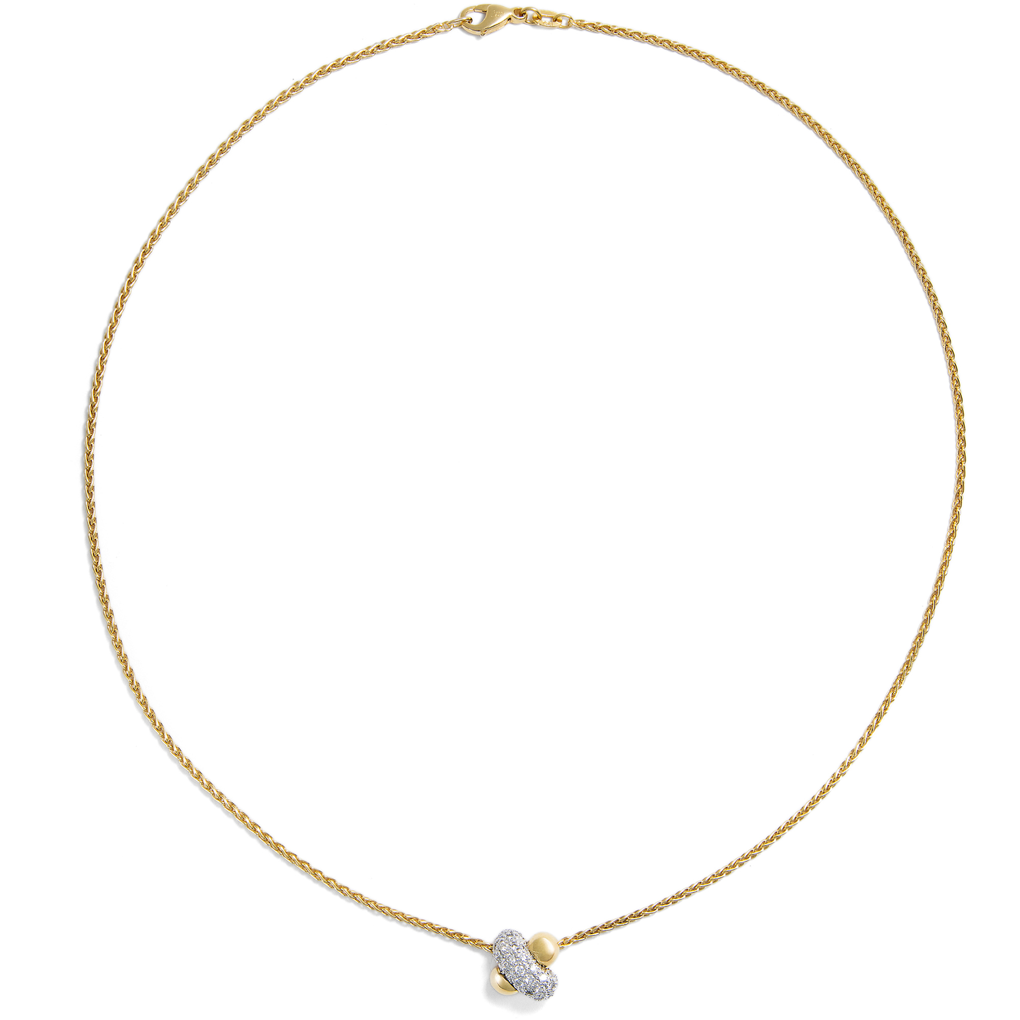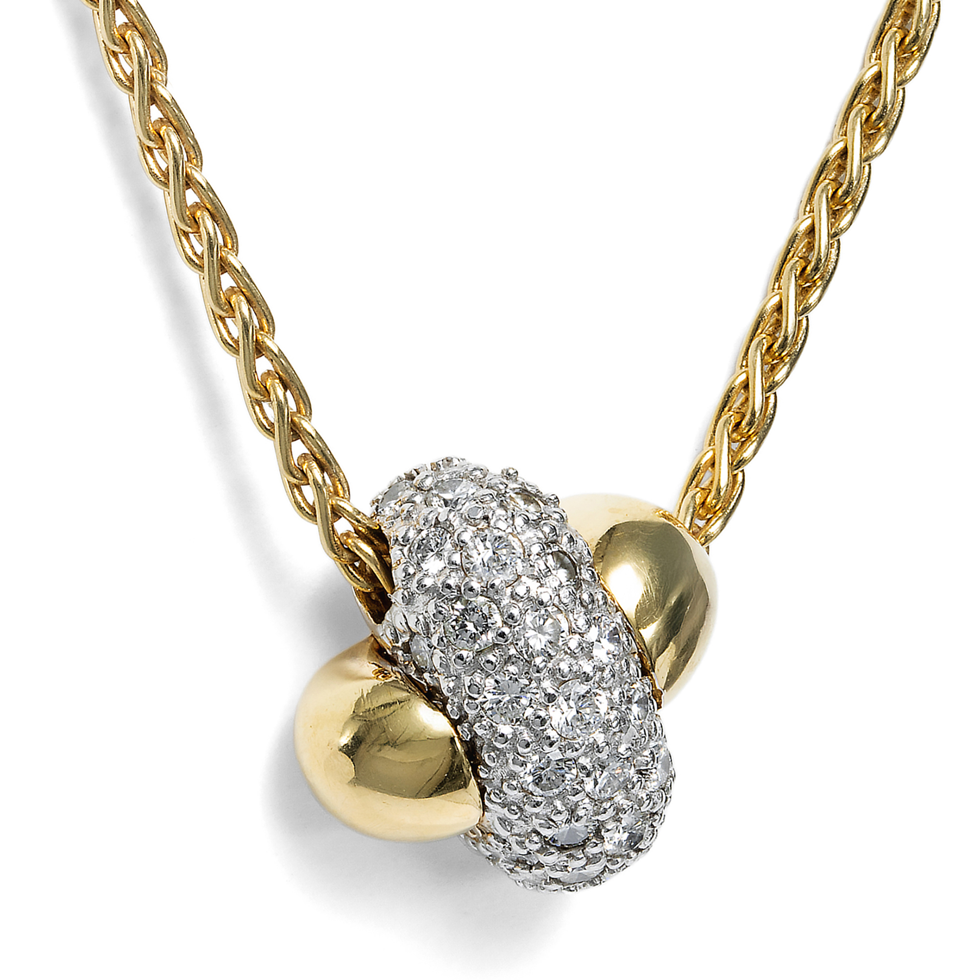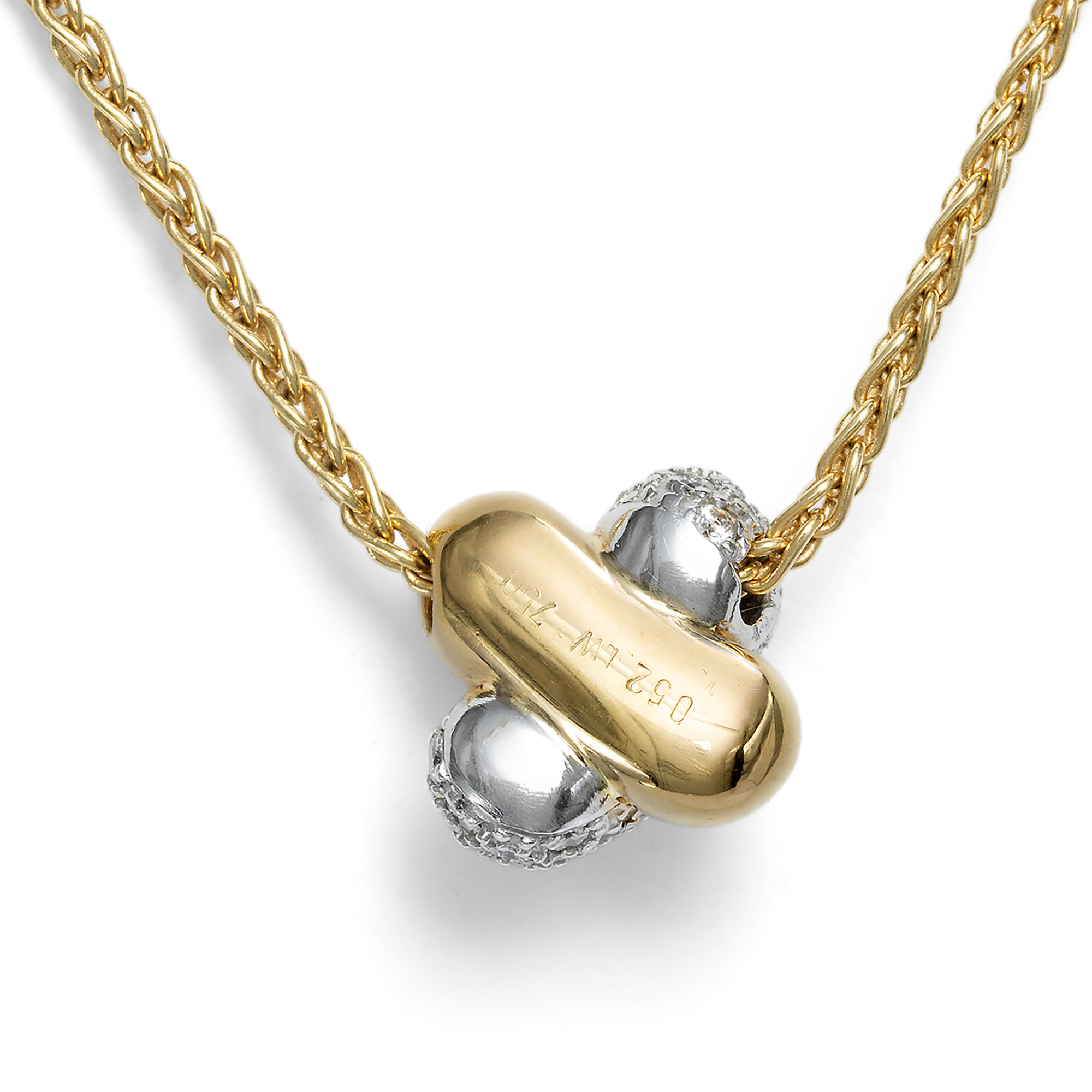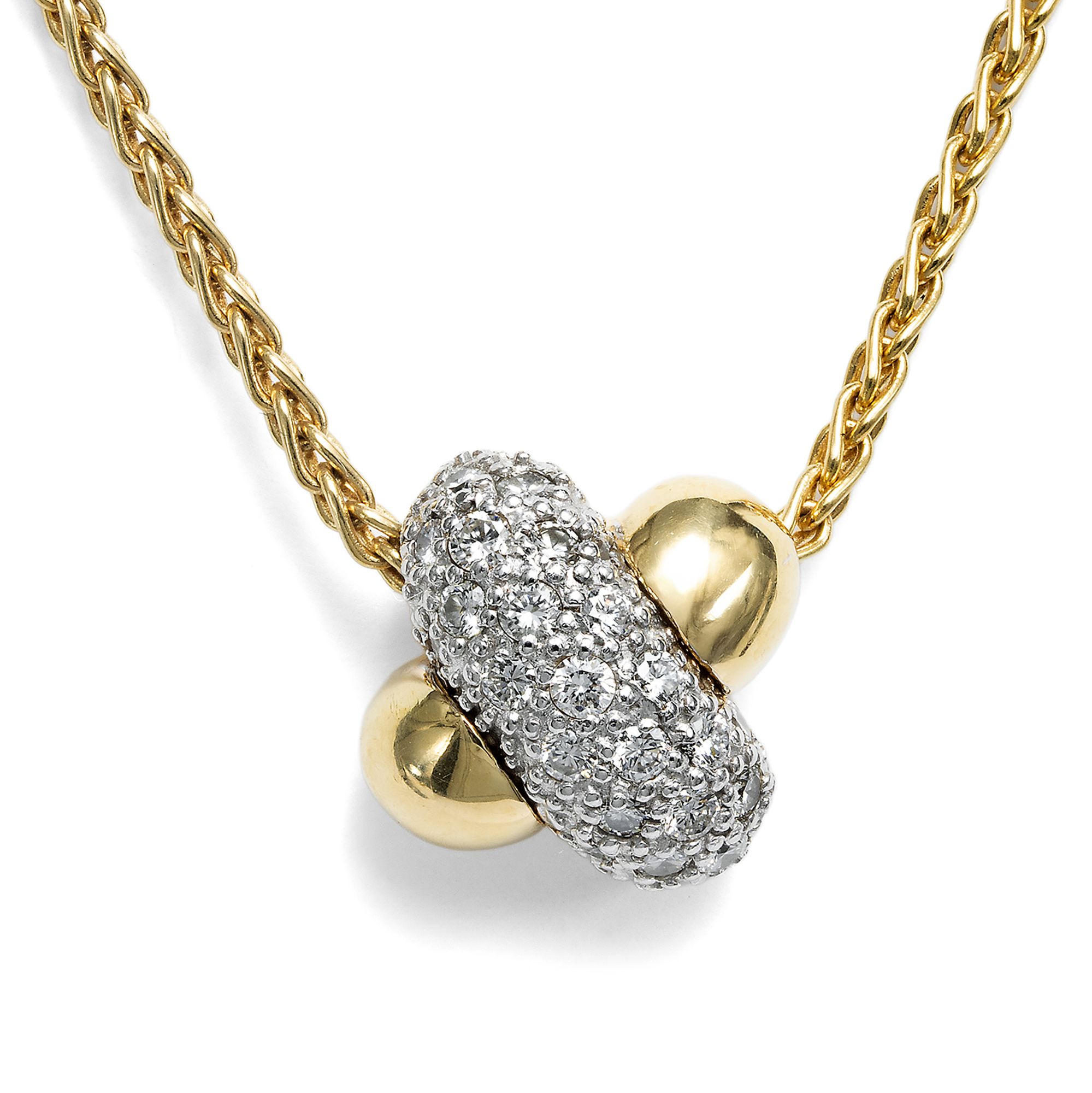 An einer kräftigen, solide gearbeiteten Zopfkette ist beweglich ein Anhänger befestigt. Es handelt sich um einen sogenannten Gleiter, der ohne Schlaufe direkt auf der Kette sitzt und so einen harmonischen Colliereffekt erzeugt. Der massiv ausgeführte Anhänger ist als stark gewölbtes Andreaskreuz gestaltet. Ein abgerundeter Balken besteht aus Gelbgold, der zweite ist aus Weißgold gearbeitet. In das weißgoldene Element sind 34 Diamanten im Brillantschliff eingelassen, die zusammen ein Gewicht von etwa 0,52 Karat aufweisen und durch ihre sehr gute Qualität überzeugen. Nach Angaben der Vorbesitzerin wurde dieses Collier Mitte der 1990er Jahre beim Stieglitzer Juwelier Lorenz erworben. Es befindet sich bis heute in hervorragendem Erhaltungszustand und eignet sich als unkomplizierter täglicher Begleiter, der auch zu einem schlichten T-Shirt getragen werden kann.