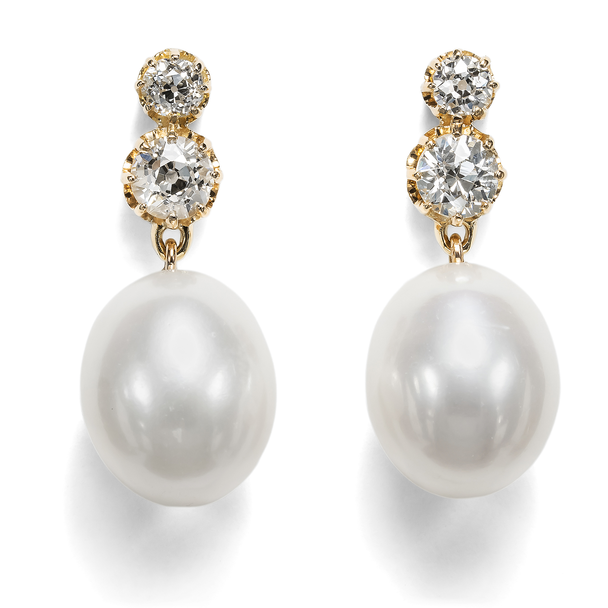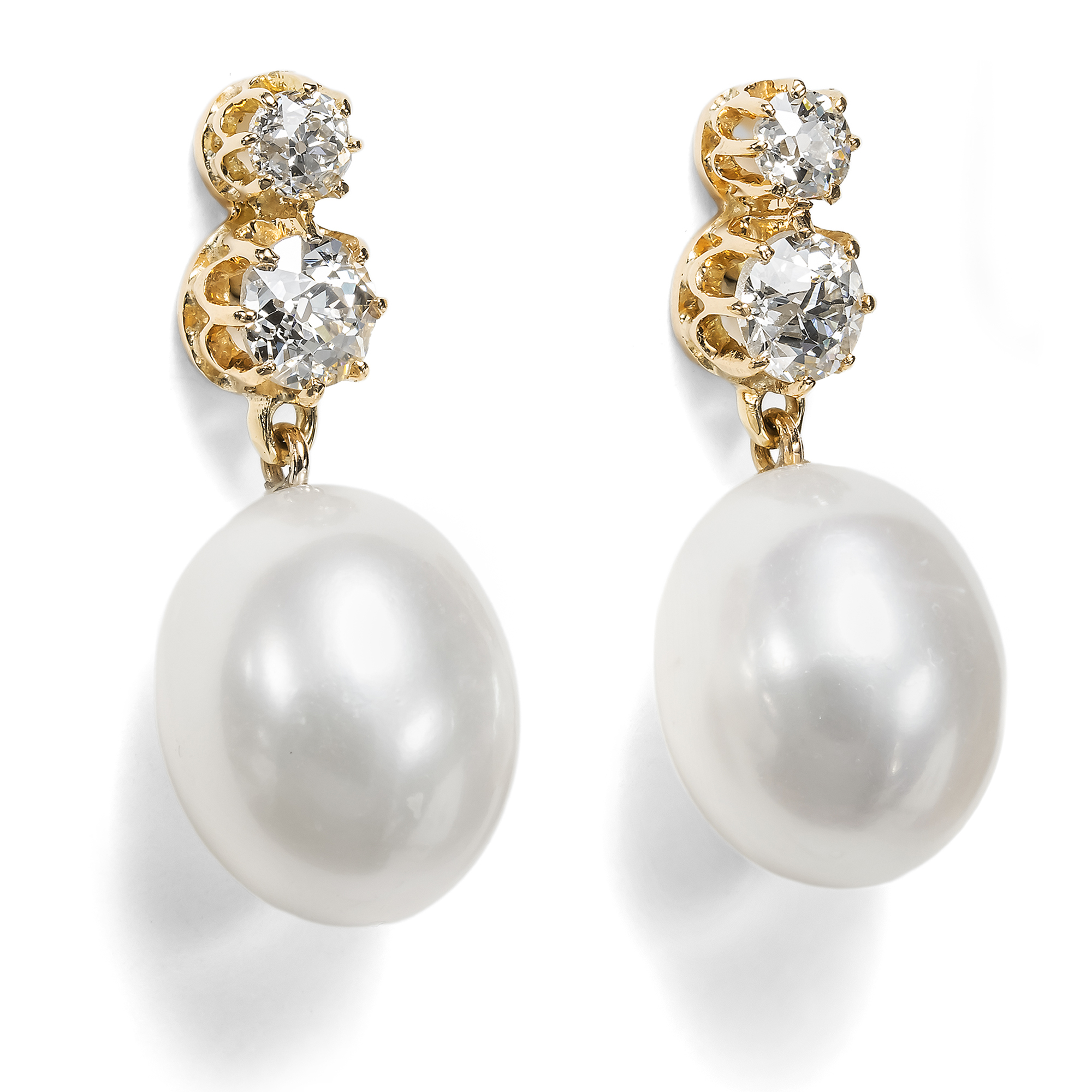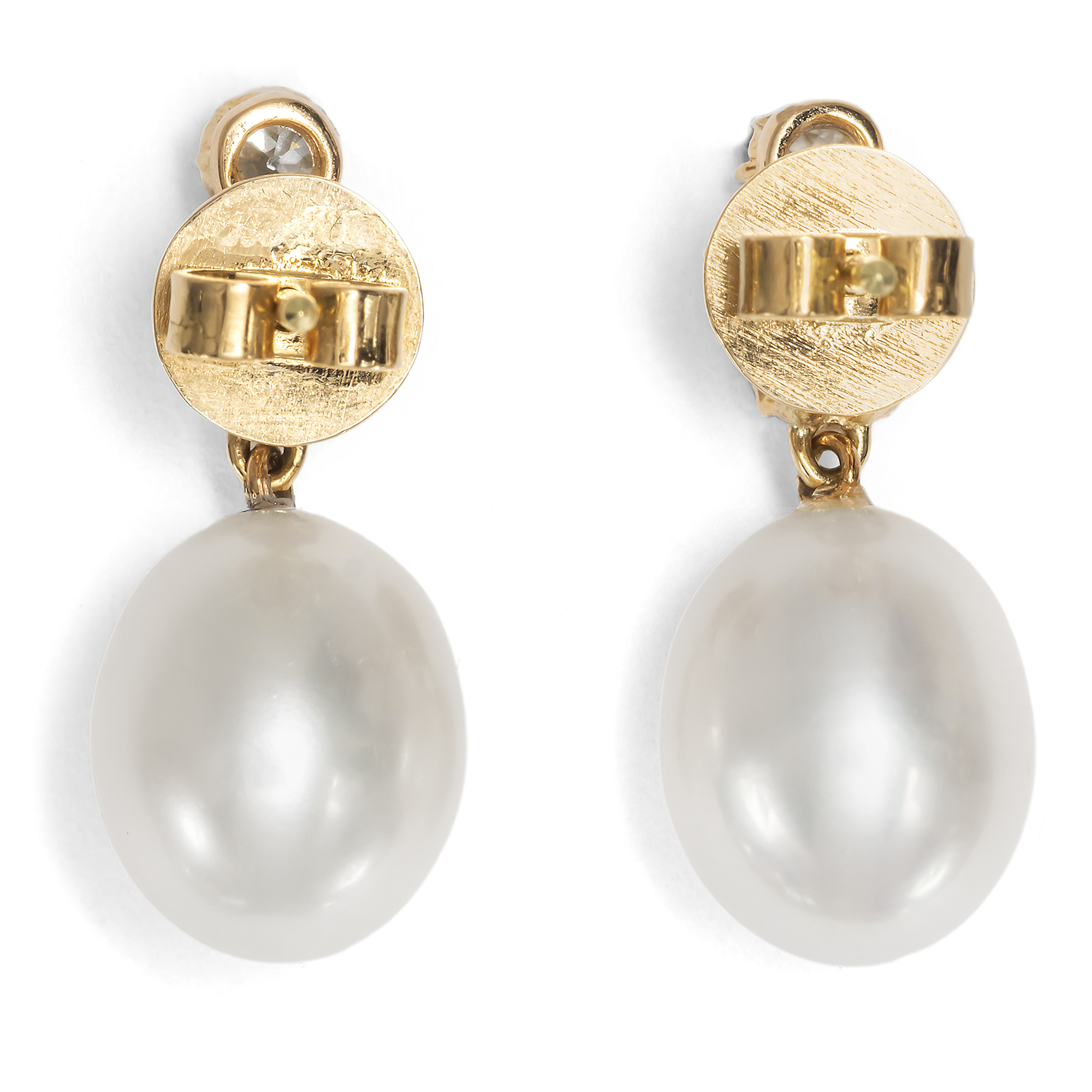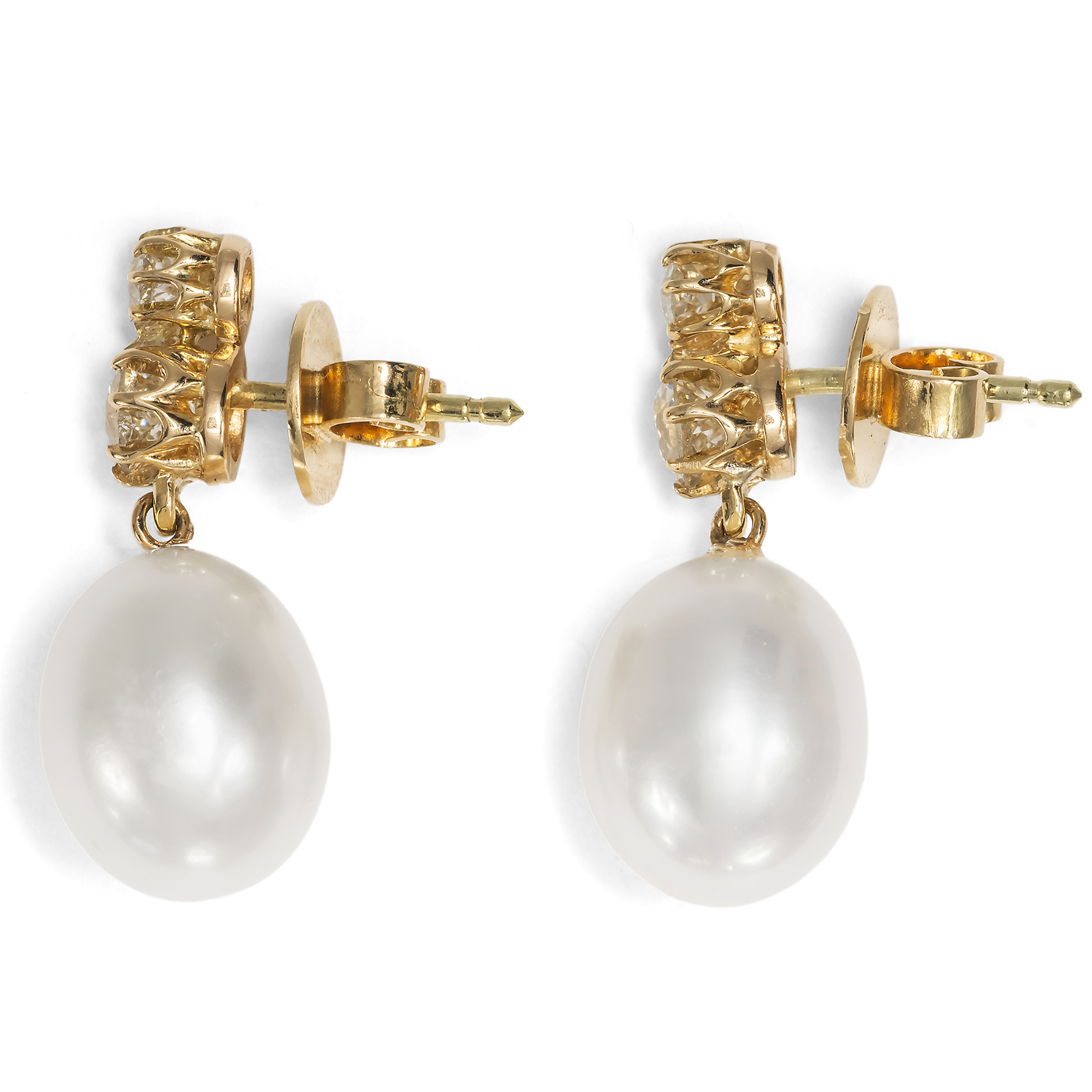 Ohrhänger von kleinem Format, doch teils von großer Kostbarkeit, erfreuten sich im ausgehenden 19. Jahrhundert besonderer Beliebtheit: „Kleine Gehänge werden noch immer gern getragen. Eine Perle, ein großer Diamant dicht am Ohrläppchen und höchstens ein herabfallender Stein genügen vollkommen“, hieß es 1897 im einflussreichen Damenjournal Der Bazar. Illustrirte Damen-Zeitung (43. Jahrgang 1897, Nr. 43, S. 577). Bei der Gestaltung des hier vorliegenden Ohrschmucks hat sich unser Goldschmied diese Empfehlung zu Herzen genommen. Die Ohrringe präsentieren je zwei Altschliff-Brillanten in ihren antiken Fassungen der Jahre um 1890 von zusammen etwa 0,90 ct Gewicht. Wie in jener Zeit üblich, wurden sie vor allem für ihr Feuer und ihre Brillanz ausgewählt; Eigenschaften, die sie im damals neuen elektrischen Licht besonders begehrenswert erscheinen ließen. Je ein größerer Stein mit einem Gewicht von etwa 0,30 ct funkelt unter einem kleineren Diamanten von etwa 0,15 ct. Beide Steine sind in ihren Krappenfassungen übereinandergesetzt. Zur Brillanz der Diamanten hat unser Goldschmied den cremigen Lüster zweier großer moderner Perlen gesellt. So ergibt sich von oben nach unten ein leichter, harmonischer Größenverlauf sowie ein eleganter Farbübergang vom Weiß der Edelsteine über das Creme der Perlen bis hin zum leuchtenden Ton des rötlichen Goldes. Ob die Korrespondentinnen und Leserinnen des Bazar wohl ahnten, dass diese Schmuckmode ihrer Zeit einst als zeitlos und klassisch gelten würde – gerade aufgrund der Reduzierung auf je zwei kostbare Juwelen? Bei uns warten die Ohrhänger nun auf eine Trägerin, die Wert auf eine klassische und vielfach kombinierbare Schmuckgarderobe legt.