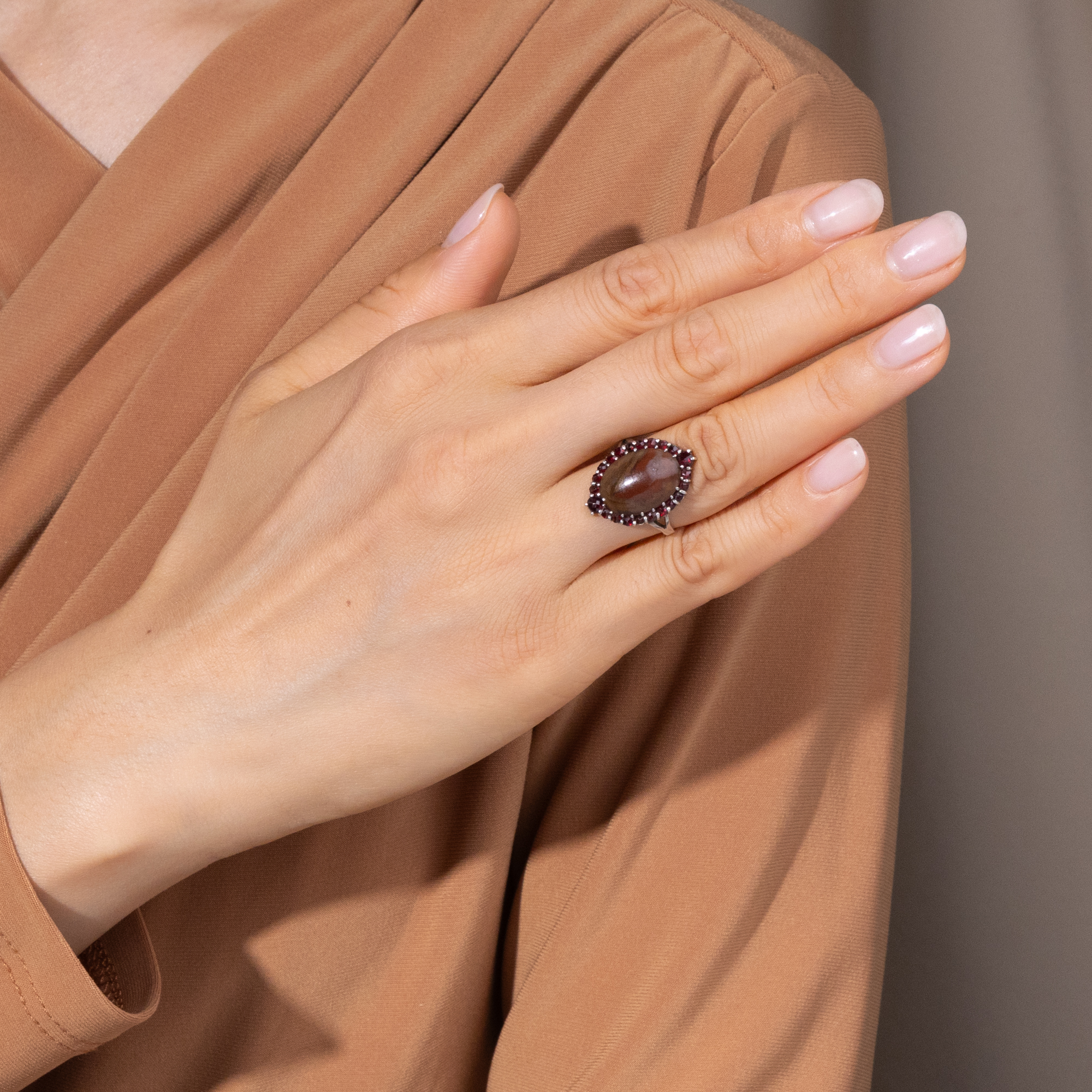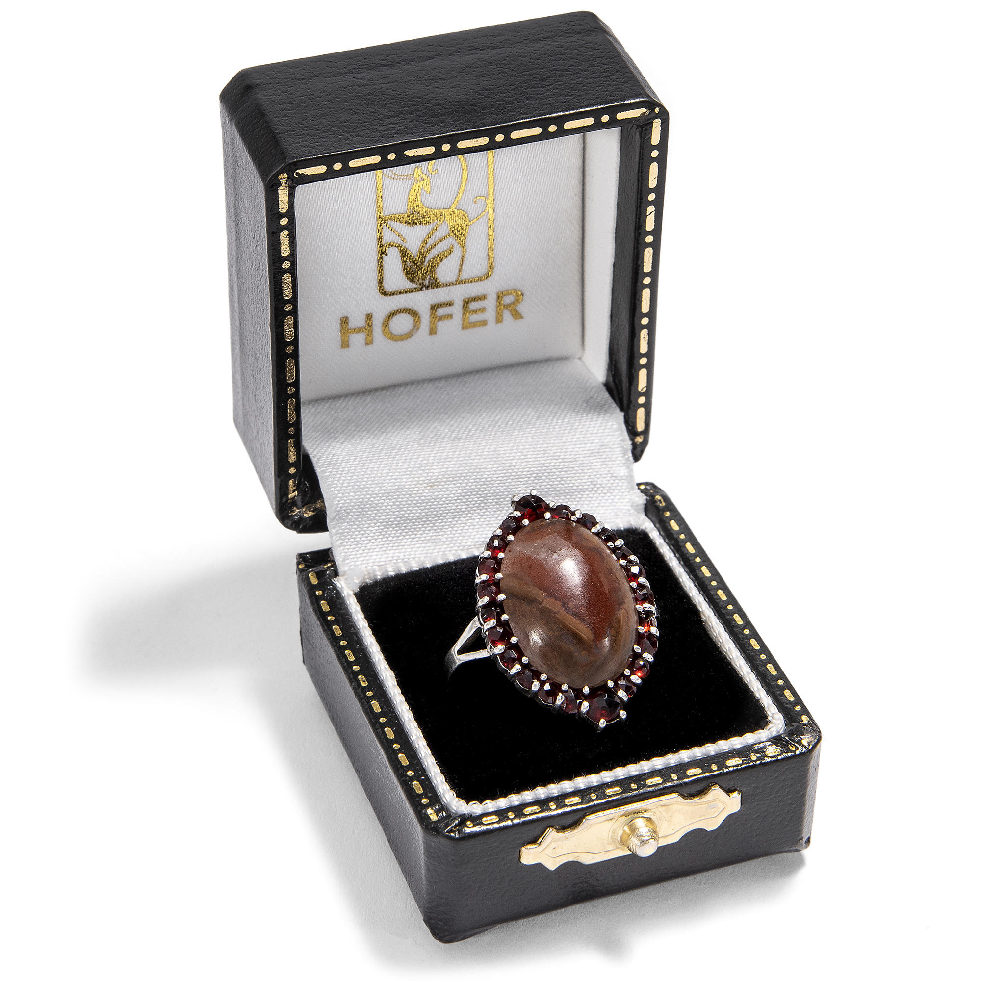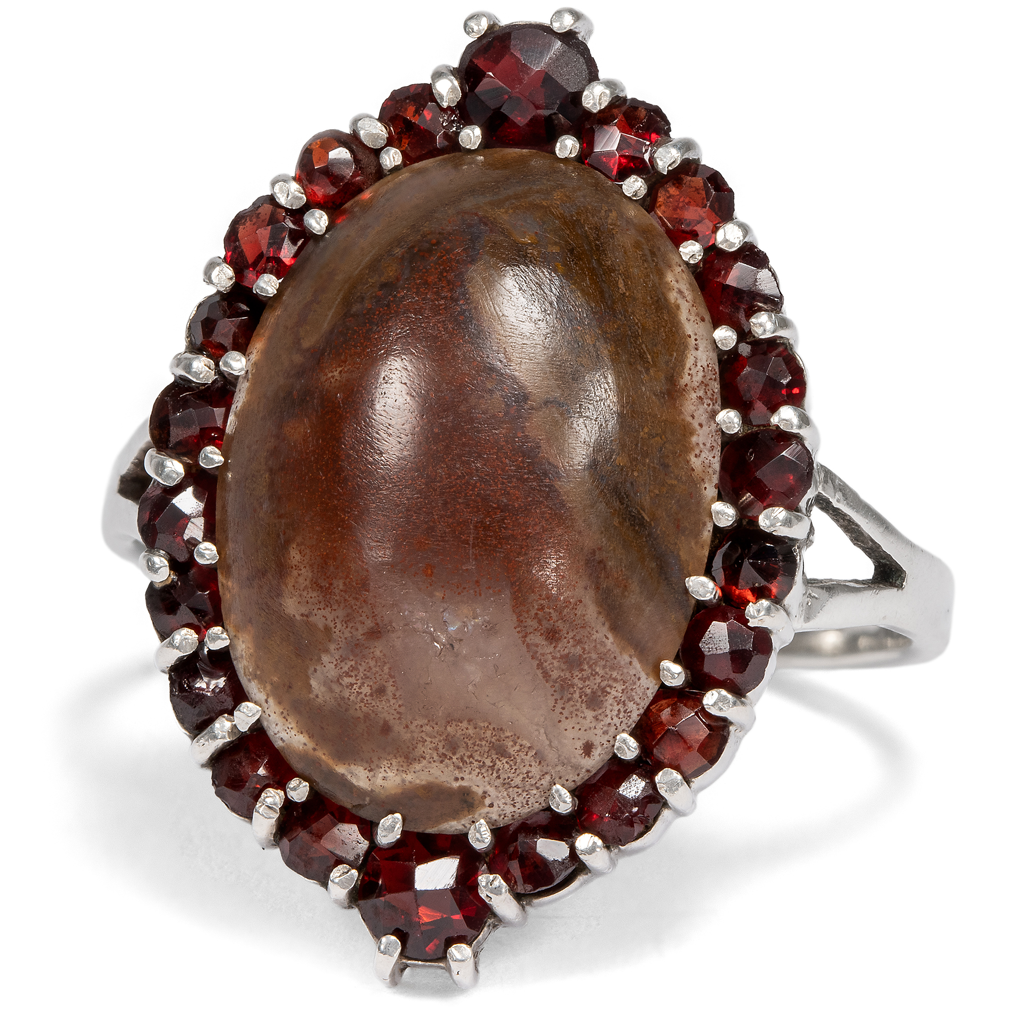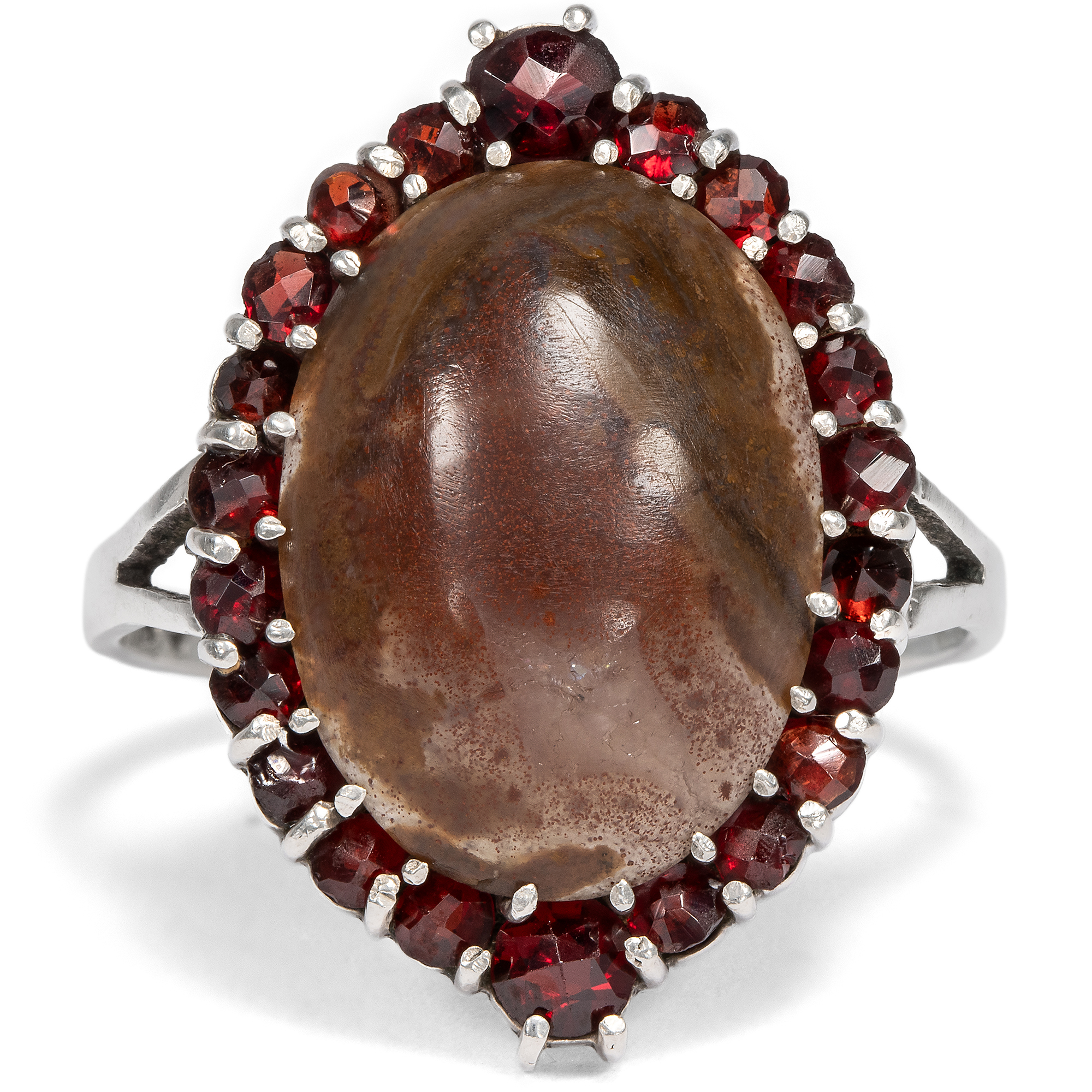Dieser elegante Ring aus den Jahren um 1930 hält in einem Rahmen aus Granaten einen ovalen Achatcabochon in seiner Mitte. Der Achat, eine Varietät des Quarzes, schimmert im Licht. Im Gegenlicht verrät der Stein eine interessante, natürliche Struktur in seinem Innern. Sie besteht aus braunen und rostroten Partien, die den halbdurchsichtigen Körper des Steins durchziehen. Ringsum den Achat sind 22 Granate im Rosenschliff angeordnet. Ihr tiefrotes Funkeln bildet einen schönen Kontrast zum matten Schimmern des Achats. Die klare Geometrie, die harmonischen Proportionen und die kunstvolle Handarbeit lassen uns den Ring in die 1920er oder 1930er Jahre datieren. Entdeckt haben wir den Ring in Stuttgart.