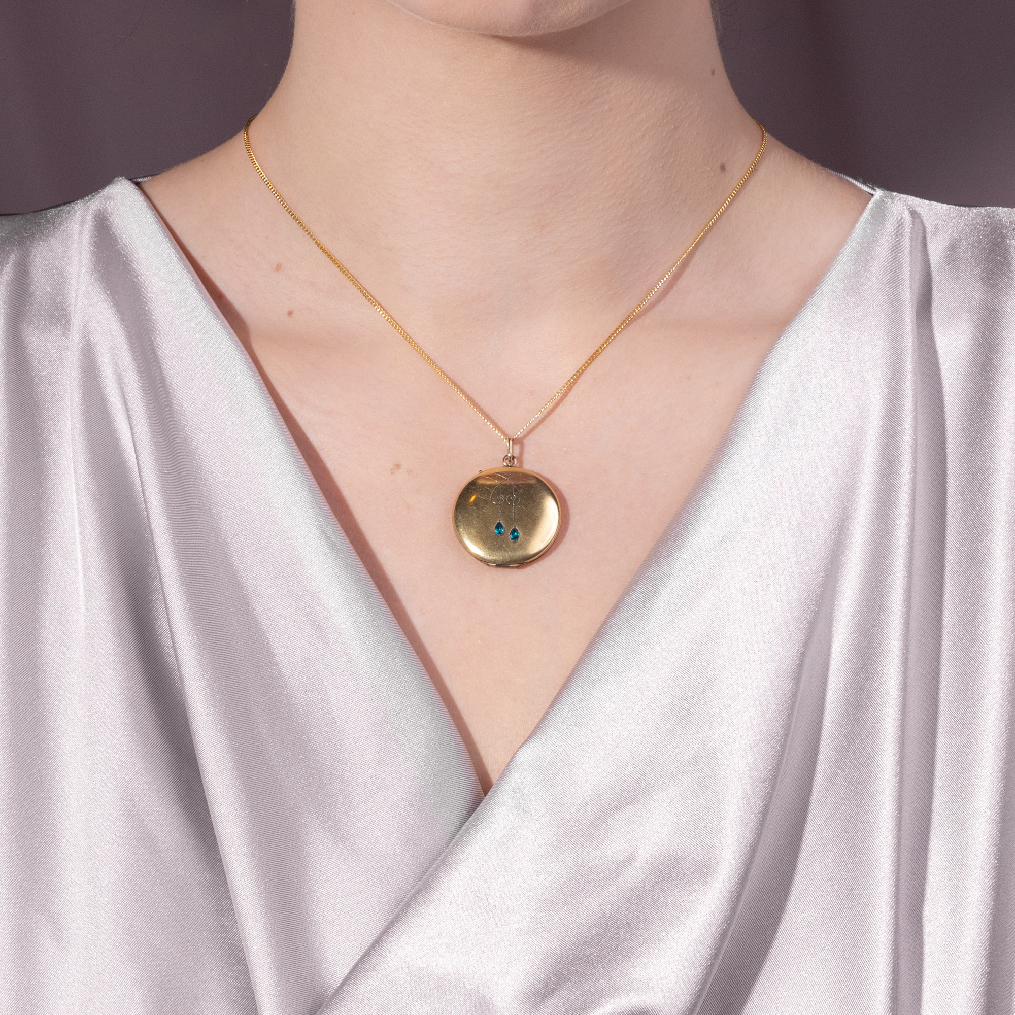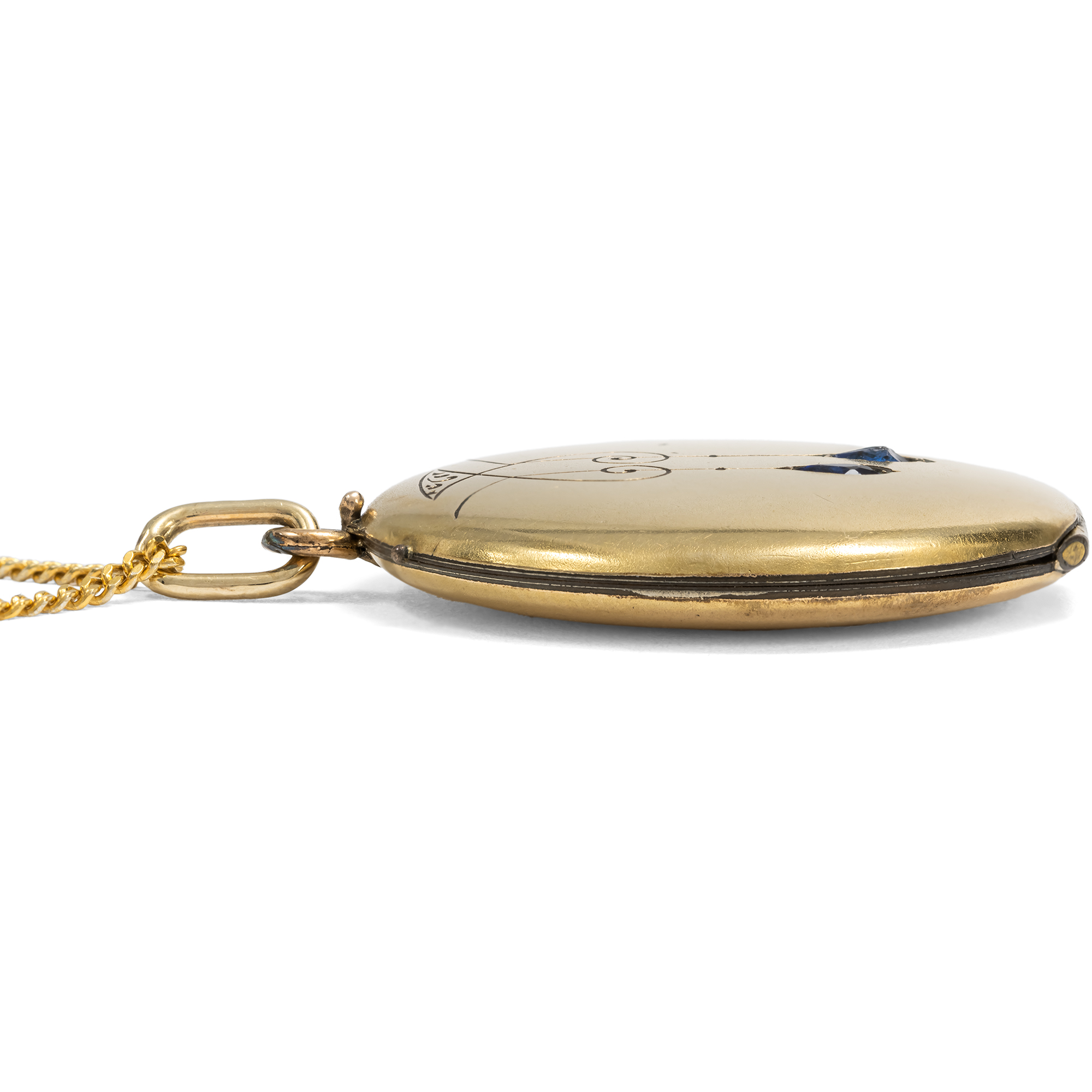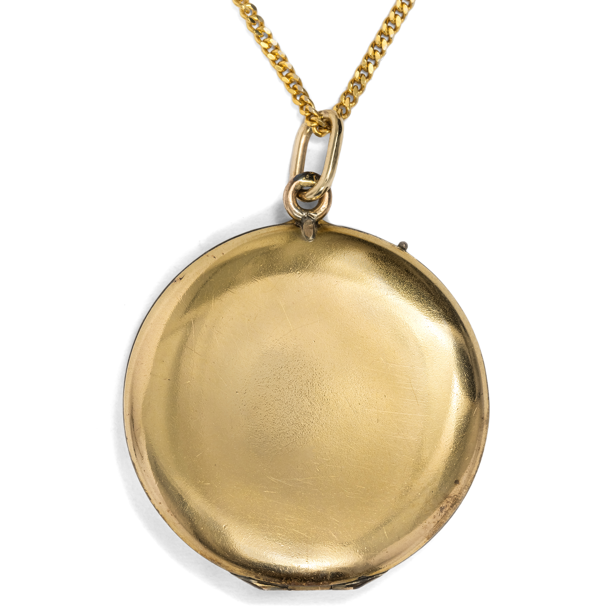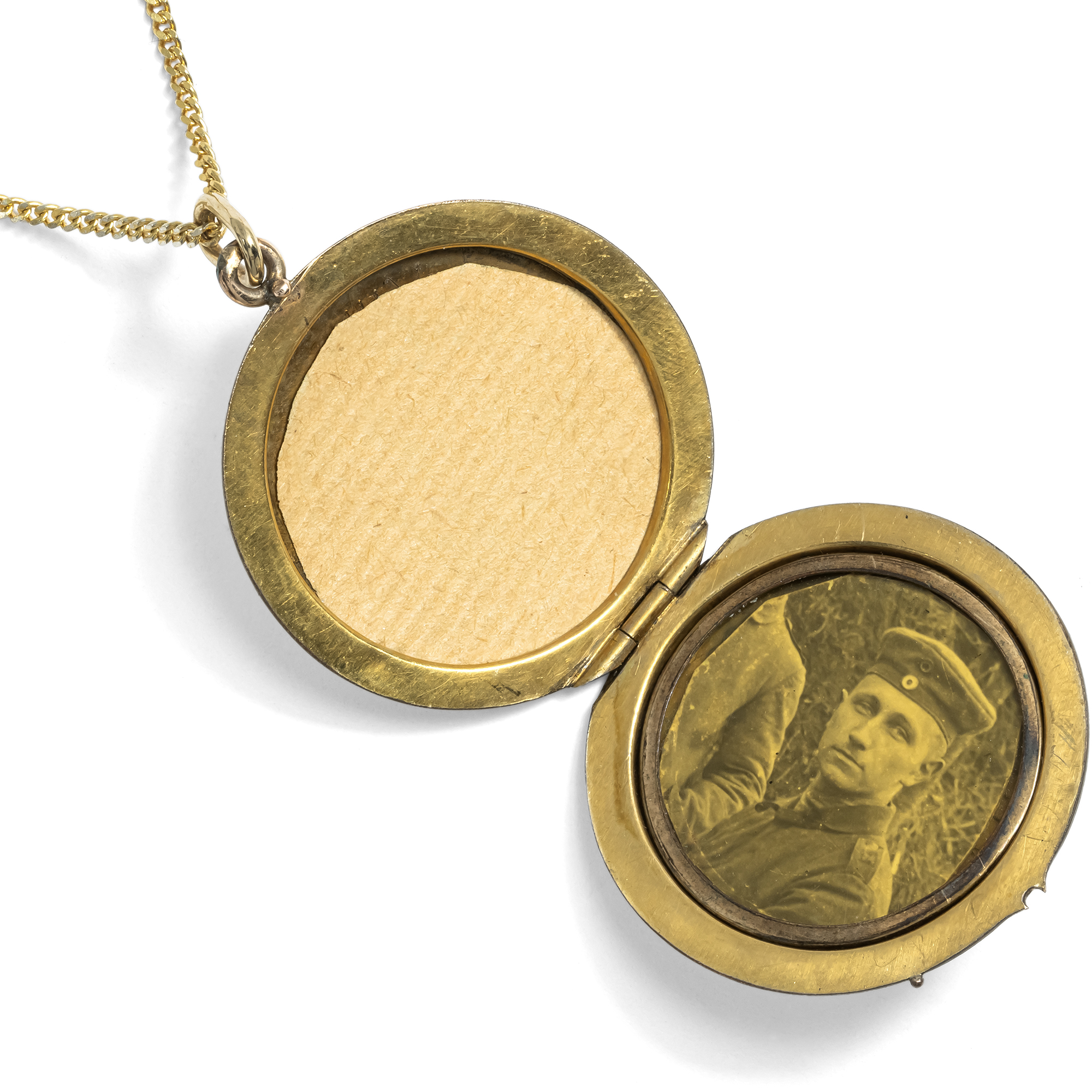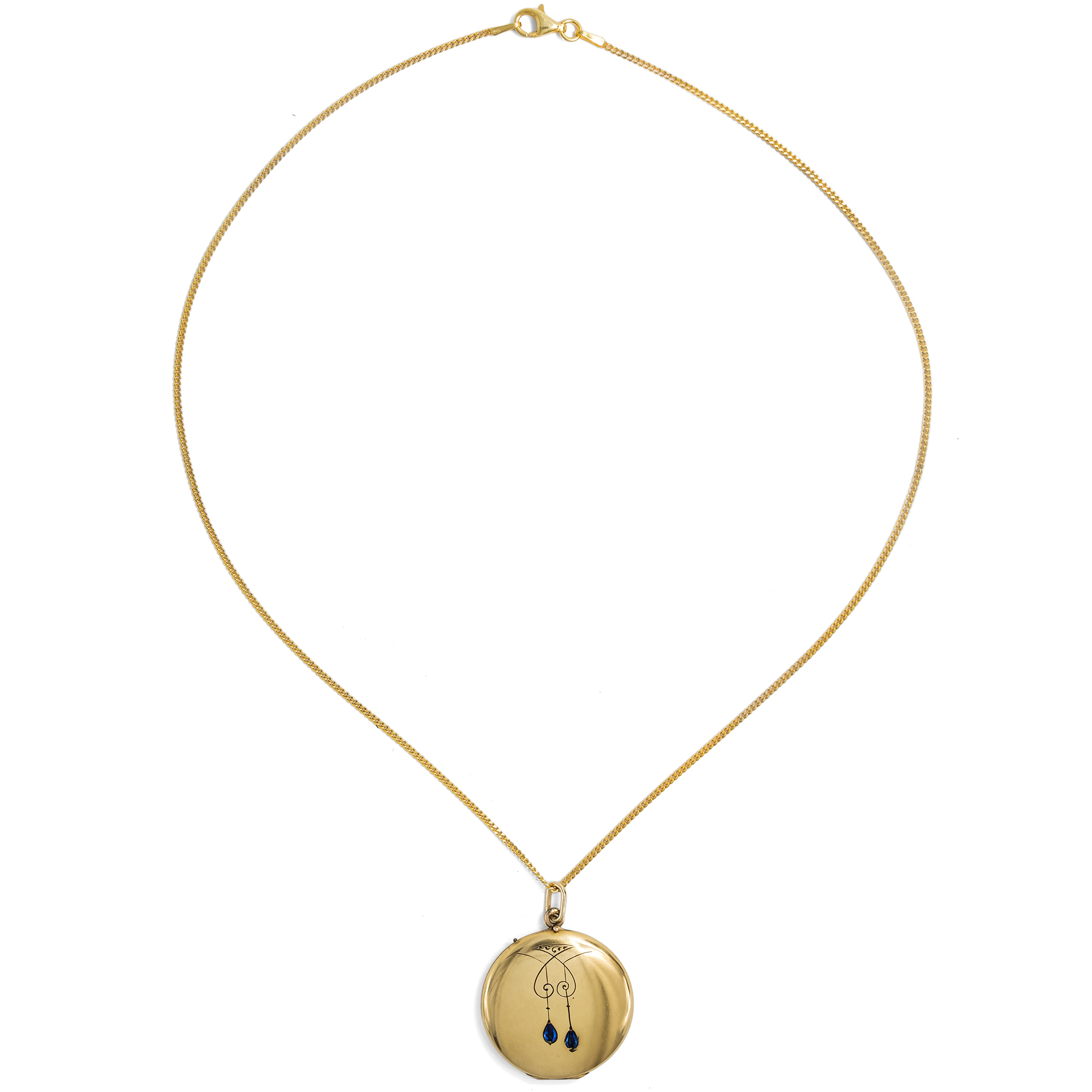 Im Laufe des 19. Jahrhunderts geriet mit dem finanziell und politisch erstarkenden Bürgertum eine neue Käufergruppe in den Blick der Schmuckmacher. Schmuckstücke wurden nicht mehr länger nur aus kostbarem Gold und Edelsteinen hergestellt, sondern auch günstigere Materialien kamen zum Einsatz, in welchen sich schmückende Entwürfe nach allen Fassons der Mode realisieren ließen. Das vorliegende Fotomedaillon aus der Zeit um 1910 ist solch ein Stück, das auf den ersten Blick aus Gold zu bestehen scheint. Doch ist es eigentlich aus sog. „Gold Doublé“ gefertigt, auch Walzgold genannt: eine dünne Schicht Gold wurde unter hohem Druck auf ein unedles Trägermetall aufgewalzt. Diese besondere Art der Vergoldung ist dadurch besonders dick und haltbar, sie lässt sich sogar gravieren! Kombiniert ist das Walzgold hier mit zwei tropfenförmigen blauen Glassteinen, die wie kostbare Pendel aus dem gravierten Ornament am oberen Rand hervorblicken. Das Innere bietet Raum für ein zurechtgeschnittenes Foto, wie es mit der Popularisierung der Fotografie bereits um 1900 für eine wachsende Gesellschaftsschicht erhältlich war. Eine Kette aus vergoldetem Sterlingsilber komplettiert den Anhänger. Zu uns kam das Medaillon aus einem Berliner Nachlass.