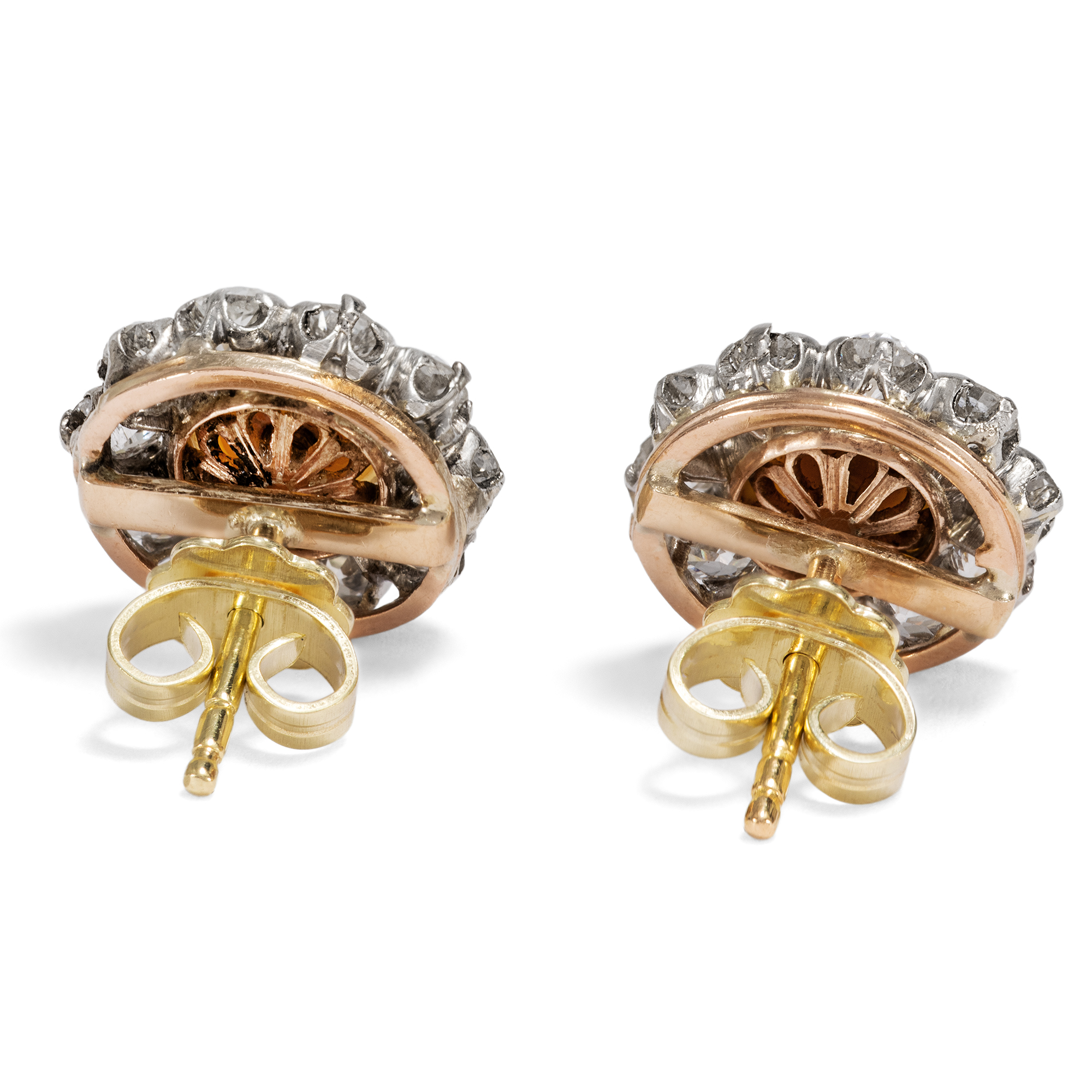 Wer Schmuckkataloge, Modekupfer und auch Portraitfotografien der 1890er Jahre durchschaut, wird eines kaum finden: Lange Ohrringe. „Ohrgehänge erfreuen sich [...] nicht mehr der gleichen Gunst wie früher“, schrieb hierzu das Modemagazin Bazar im Dezember 1897. Die Lust, sich zu schmücken, lebte selbstredend aber weiter. Und so ist in Katalogen und Modeillustrationen der Zeit stattdessen eine große Vielfalt kleiner Ohrstecker und winziger Hänger zu bewundern, die nicht mit großem Pomp, sondern mit luxuriösen Materialien und vornehmer Zurückhaltung beeindrucken. Für den Abend und die Ballgarderobe trug man funkelnde Diamantohrringe, um die neuesten Colliers und Diademe mit Diamantbesatz zu ergänzen. Das vorliegende Paar Ohrringe vereint auf kleinstem Raum erlesene Materialien und konnte auch zum Ballkleid getragen werden. Je ein Kranz aus weißen Altschliff-Diamanten schmiegt sich, in Platin gebettet, um eine Naturperle, sodass der Eindruck einer kleinen Blüte entsteht. Die Naturperlen haben eine natürliche, leicht gedrückte Boutonform, sodass sie nicht zu weit über den Diamantkranz hinausragen, und zeigen sich in einem warmen Cremeton mit feinem Orient. Die Diamanten wiegen zusammen etwa 3,08 ct und zeigen sich in schönen, individuellen Altschliffen, die ebenso wie die Verarbeitung und der Entwurf auf einen Entstehungszeitraum gegen Ende des 19. Jahrhunderts verweisen. Wir konnten das schöne und klassische Paar Ohrringe aus einer hochwertigen deutschen Privatsammlung erwerben. Es ist sehr gut erhalten. Die Stecker wurden in jüngerer Zeit erneuert, sodass sich das Paar sicher und unkompliziert tragen lässt.