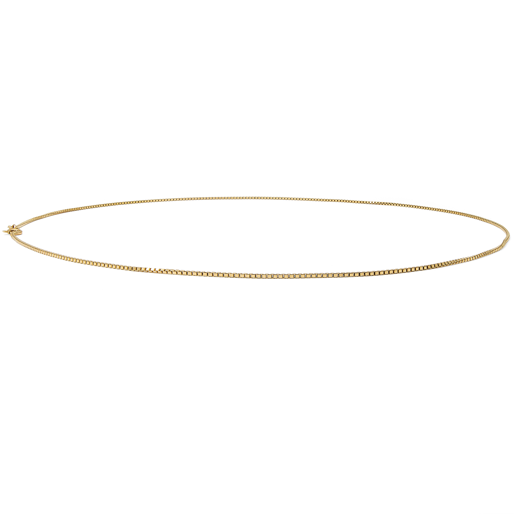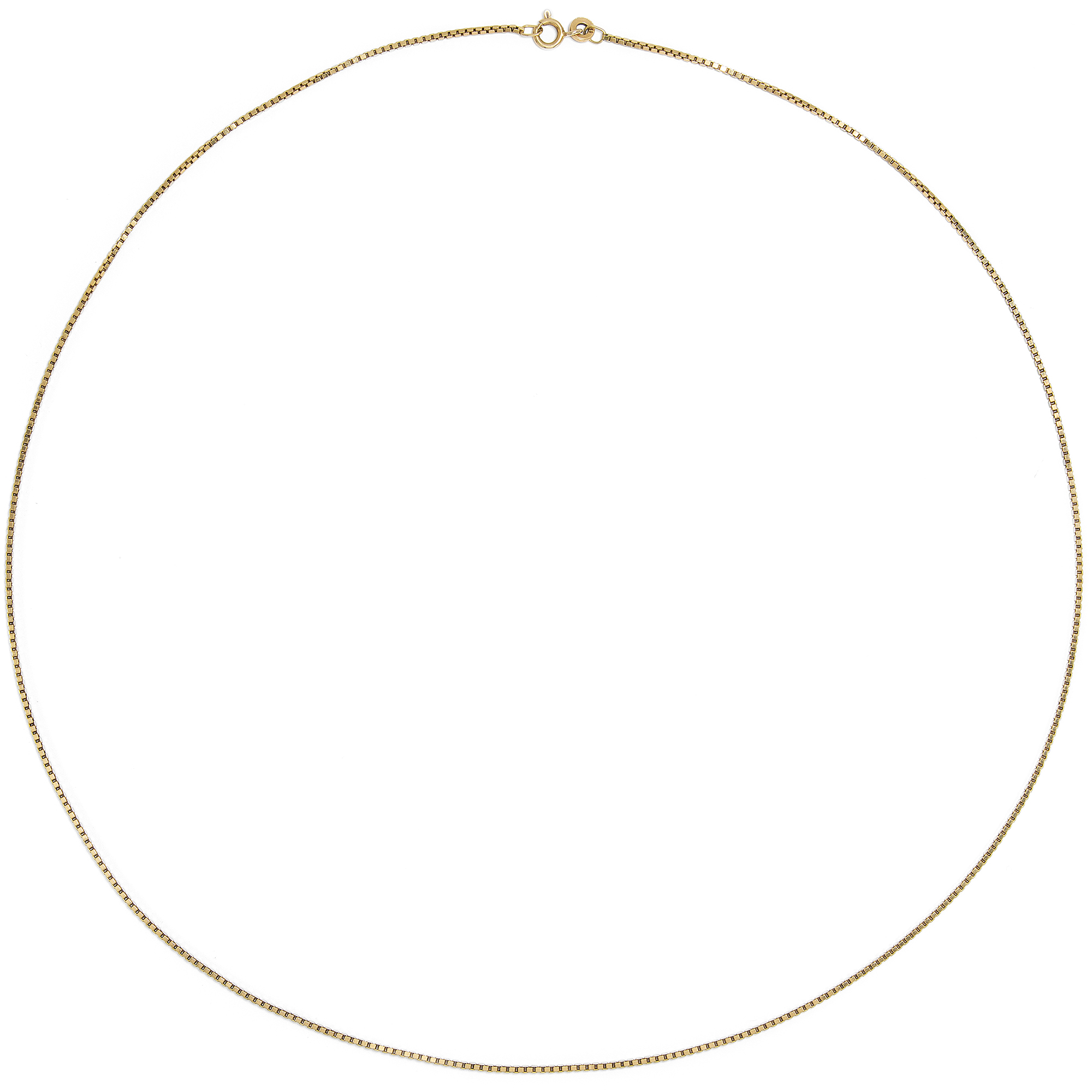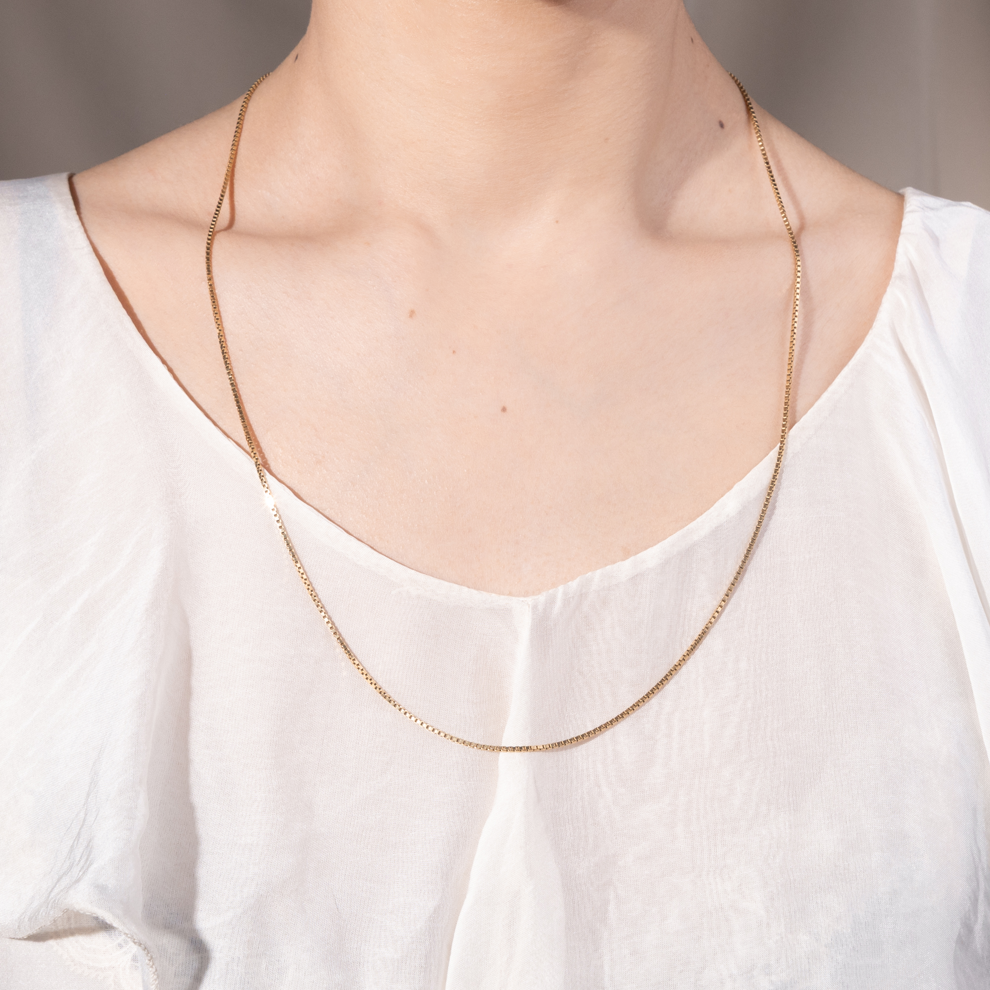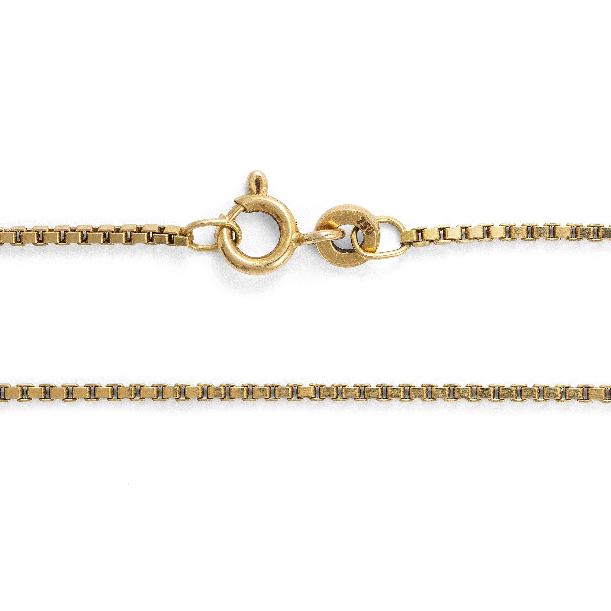 Die Venezianerkette verdankt ihren Namen einer möglicherweise venezianischen Goldschmiedetradition, bei der dicht gefügte, würfelförmig ineinandergreifende Glieder zu einer Kette zusammengesetzt werden. Durch die kompakte Struktur entstehen ruhige, polierte Flächen, die das Licht besonders schön reflektieren und der Kette ihre klare, elegante Wirkung verleihen. Durch diese Konstruktion liegt die Venezianerkette besonders geschmeidig am Hals und zeigt einen gleichmäßigen Fall. Unter Juwelieren gilt sie deshalb als eine der „stillen“ Kettenformen: Anders als Ketten aus größeren Gliedern, die beim Tragen klirren oder scheppern können, verursacht die Venezianerkette getragen keinerlei Geräusche. Ein solches Beispiel liegt hier in Gelbgold vor. Die Vintage-Kette aus der zweiten Hälfte des 20. Jahrhunderts leuchtet im warmen Ton 18-karätigen Goldes und zeigt das klassische Venezianermuster. Sie kann sowohl für sich allein getragen werden als auch als feine Begleiterin für einen Anhänger dienen. Mit einer Länge von 59,5 cm und einer Breite von etwa 1,2 mm ist sie vielseitig tragbar.