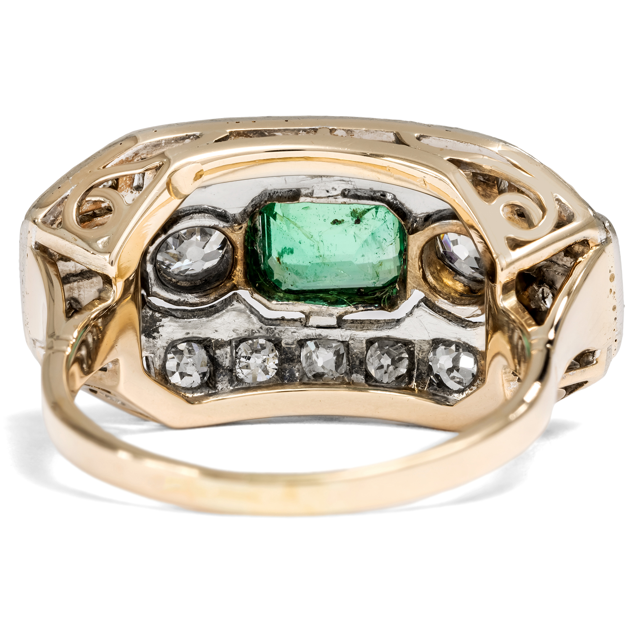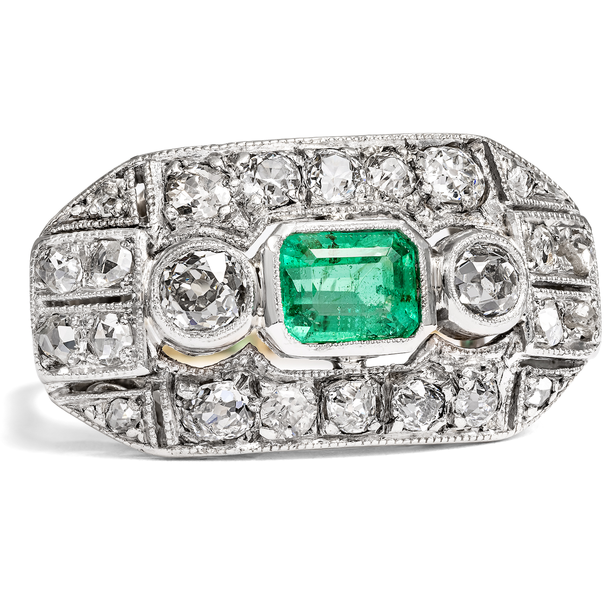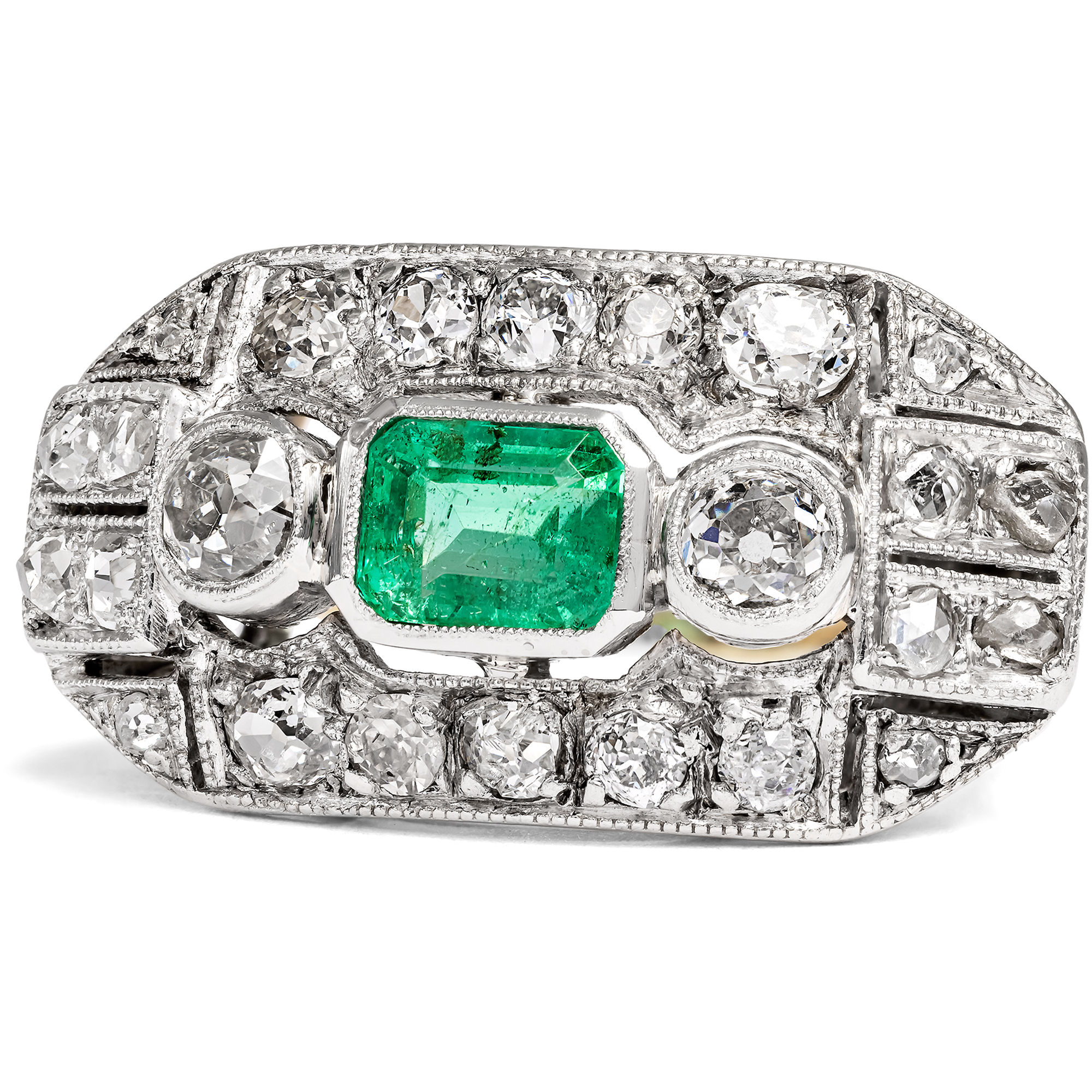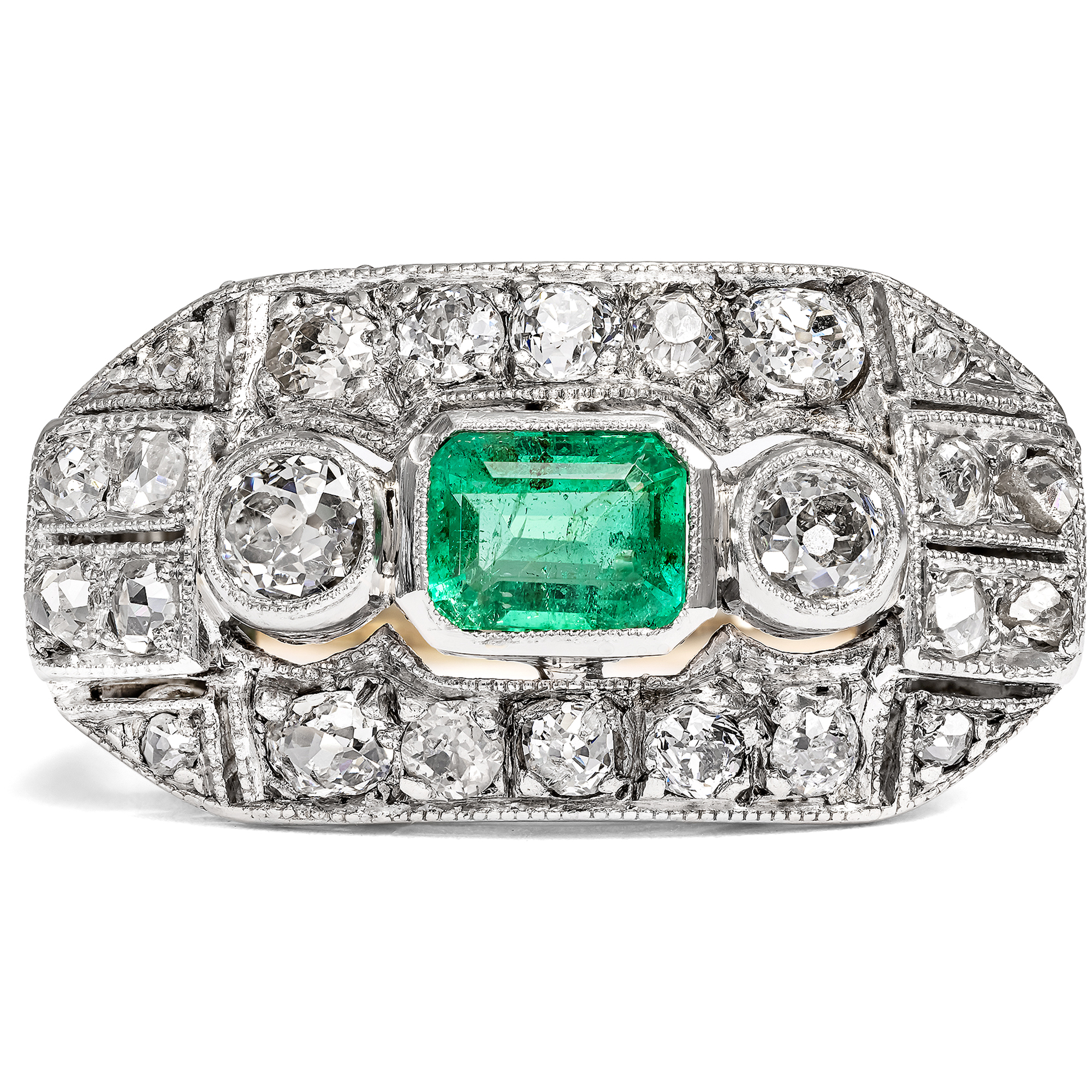 Ein leuchtend grüner Smaragd aus Kolumbien sowie 24 Diamanten im Altschliff und Rosenschliff bilden den Besatz dieses Ringes. Um sie herum entfalten sich auf dem länglichen Ringkopf geometrische Muster, reich belegt mit weiteren Diamanten und funkelnden Millegriffes. Zarte gesägte Schattenfugen gliedern die Oberfläche aus Silber zusätzlich. Dieser Typus des Ringes mit großzügig proportioniertem, rechteckigem Ringkopf kam der Vorliebe der Epoche für Schmuckentwürfe entgegen, deren Oberflächen sich ganz in weißes Licht aufzulösen schienen. Auch waren einfache, flächige Grundformen perfekt dazu geeignet, die filigranen Verarbeitungstechniken dieser Zeit zur Geltung zu bringen. Neben seinem charakteristischen Entwurf und seinen Diamantschliffen spricht auch die Verarbeitung für eine Entstehung zur Zeit der Weimarer Republik. Denn während der Ring aus Gold gefertigt ist, liegt dem Ringkopf eine feine Schicht aus Silber auf, wie sich unter der Lupe offenbart. Diese Kombination von weißer Schauseite auf goldenem Unterbau ist charakteristisch für Entwürfe der ersten Hälfte des 20. Jahrhunderts. Der Ring ist sehr gut erhalten und wird mit einem Gutachten aus Wien geliefert.