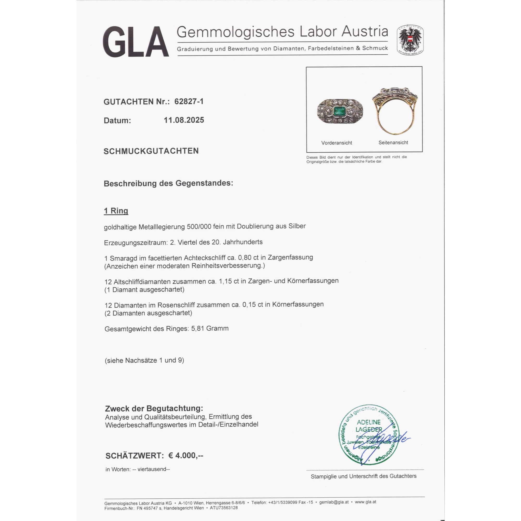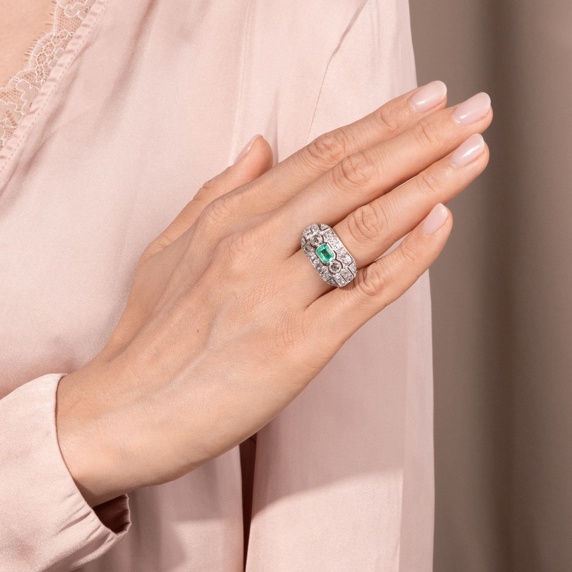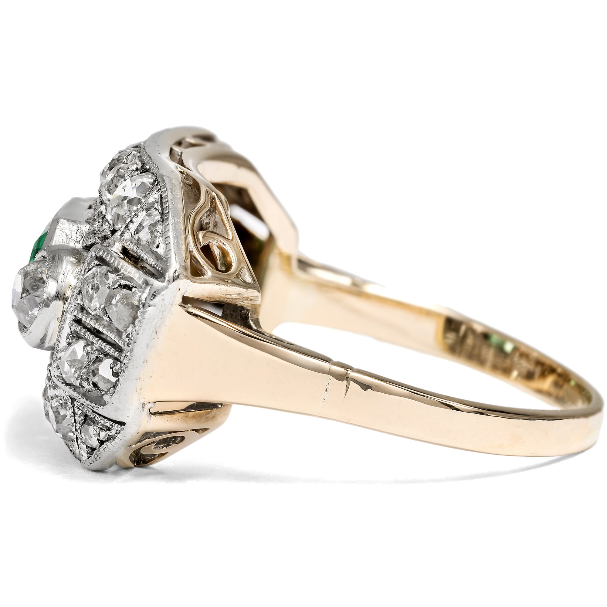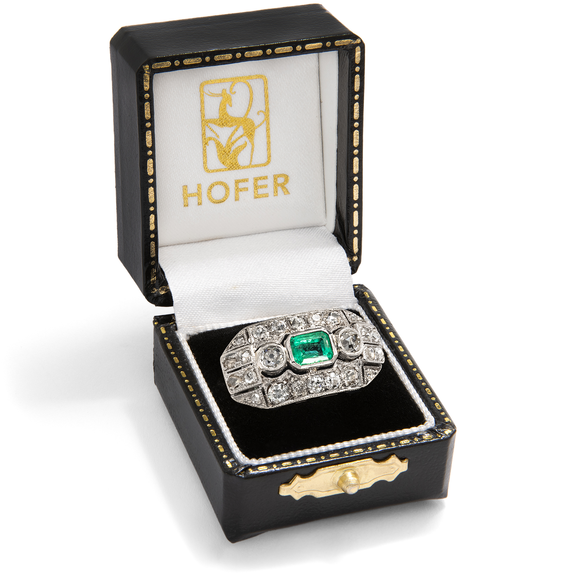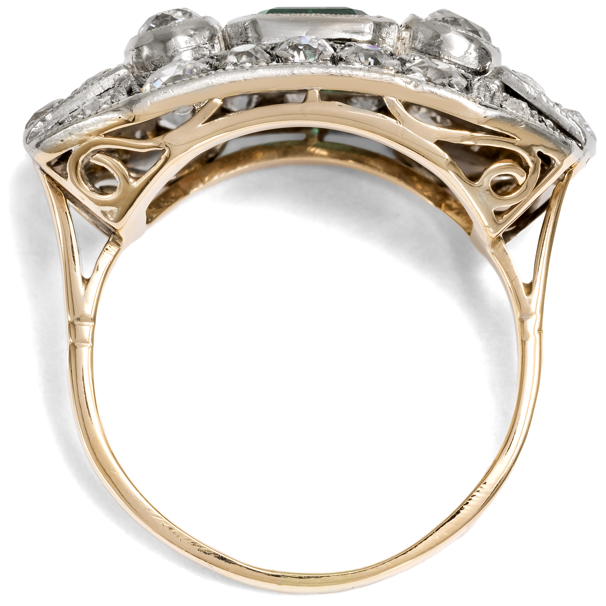 Ein leuchtend grüner Smaragd aus Kolumbien sowie 24 Diamanten im Altschliff und Rosenschliff bilden den Besatz dieses Ringes. Um sie herum entfalten sich auf dem länglichen Ringkopf geometrische Muster, reich belegt mit weiteren Diamanten und funkelnden Millegriffes. Zarte gesägte Schattenfugen gliedern die Oberfläche aus Silber zusätzlich. Dieser Typus des Ringes mit großzügig proportioniertem, rechteckigem Ringkopf kam der Vorliebe der Epoche für Schmuckentwürfe entgegen, deren Oberflächen sich ganz in weißes Licht aufzulösen schienen. Auch waren einfache, flächige Grundformen perfekt dazu geeignet, die filigranen Verarbeitungstechniken dieser Zeit zur Geltung zu bringen. Neben seinem charakteristischen Entwurf und seinen Diamantschliffen spricht auch die Verarbeitung für eine Entstehung zur Zeit der Weimarer Republik. Denn während der Ring aus Gold gefertigt ist, liegt dem Ringkopf eine feine Schicht aus Silber auf, wie sich unter der Lupe offenbart. Diese Kombination von weißer Schauseite auf goldenem Unterbau ist charakteristisch für Entwürfe der ersten Hälfte des 20. Jahrhunderts. Der Ring ist sehr gut erhalten und wird mit einem Gutachten aus Wien geliefert.