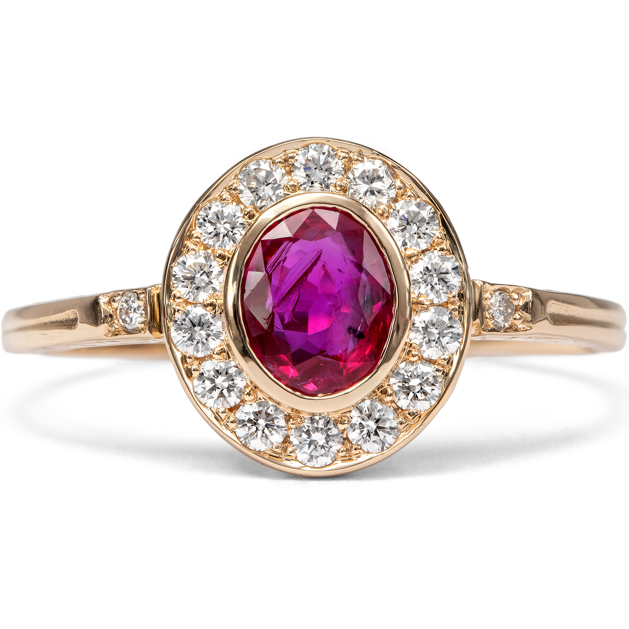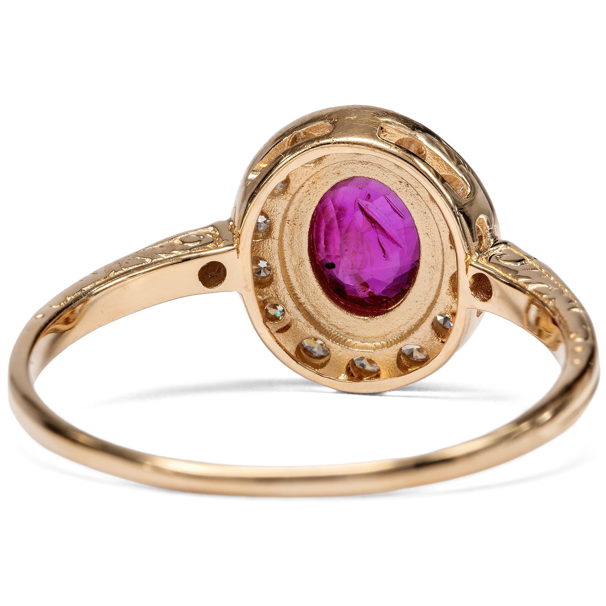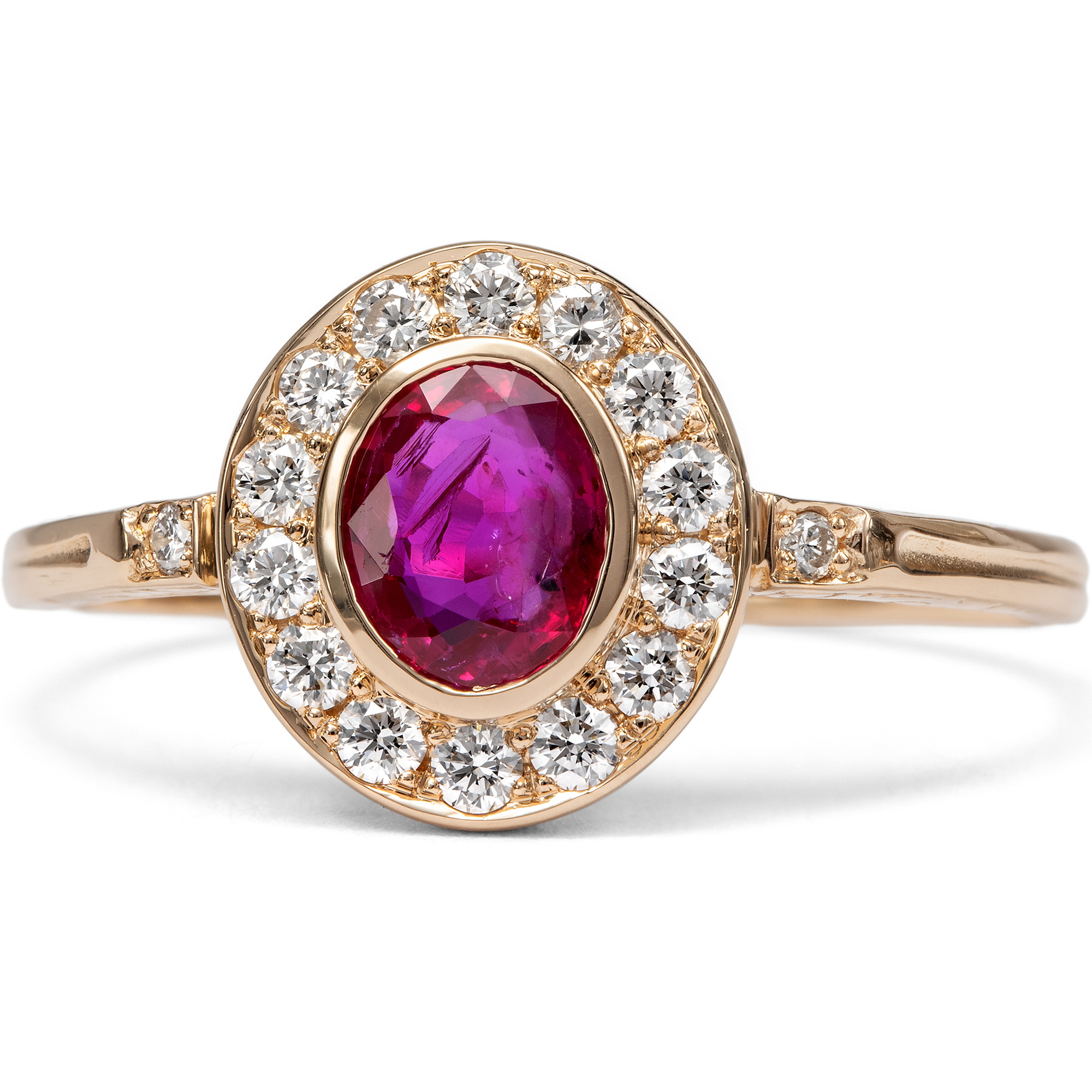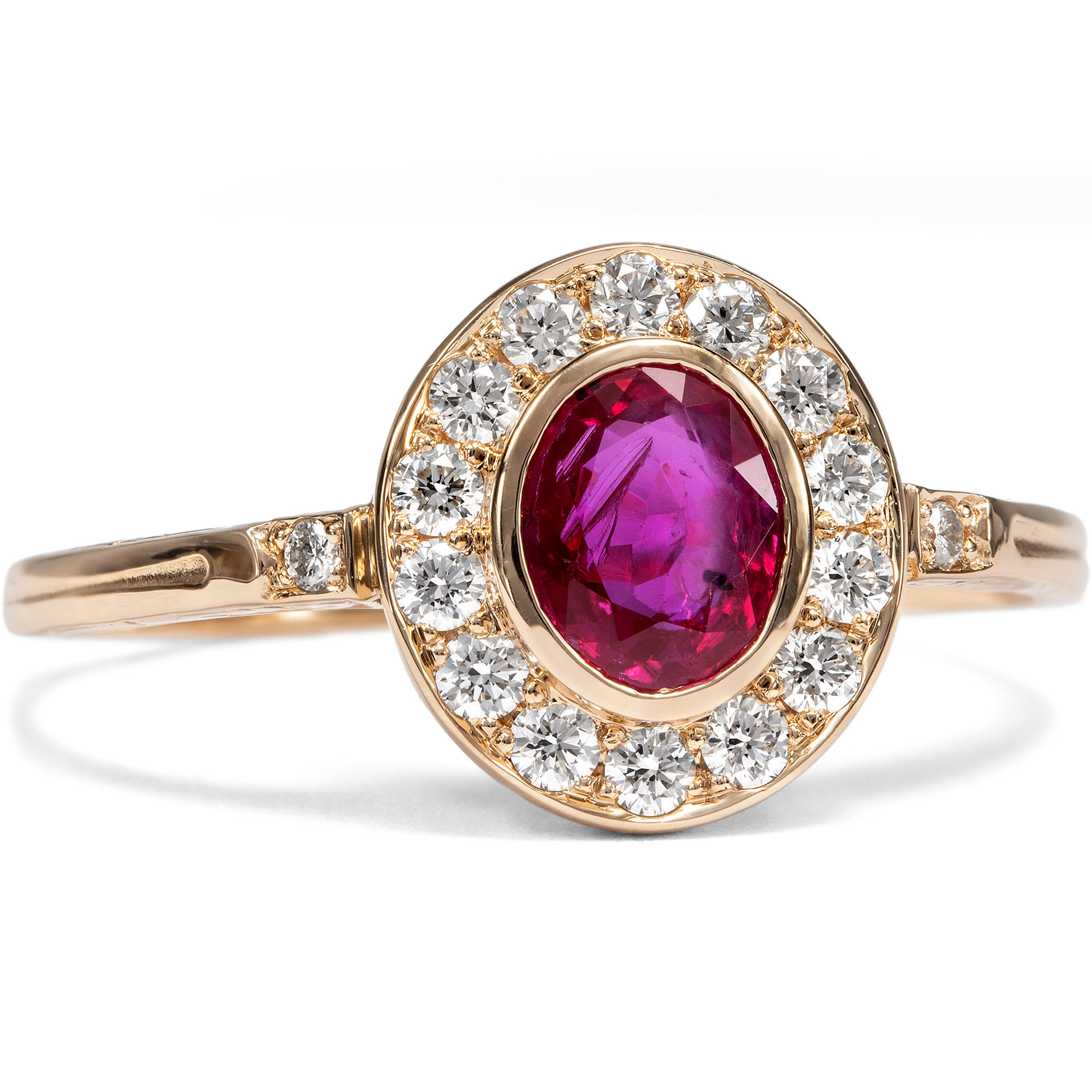 Dieser Ring aus unserer Werkstatt ist ein klassischer Entourage-Ring. Diese Ringform, bei der ein größerer Mittelstein ringsherum von Diamanten umgeben ist, ist nach dem französischen Wort „entourage“ für Begleitung oder Gefolge benannt. Entourage-Ringe gehören zu den großen Klassikern der Schmuckgeschichte und begegnen uns in allen Jahrhunderten, stets der jeweiligen Mode angepasst. Im vorliegenden Ring bildet ein natürlicher, unbehandelter Rubin aus Burma den strahlenden Mittelpunkt des Entwurfs. Der Edelstein zeigt ein lebendiges, tiefes Rot von besonderer Intensität, jene begehrte Farbqualität, die seit Jahrhunderten mit den berühmten Vorkommen Burmas verbunden wird und als Inbegriff kostbarer Rubine gilt. Vierzehn Diamanten im Brillantschliff von sehr guter Qualität und feinem Weiß säumen den Mittelstein und umgeben ihn mit festlichem Funkeln. Zwei weitere Diamanten zieren die Ringschultern. Insgesamt vereinen sich hier 0,36 Karat exzellente Diamanten. Alle Edelsteine sind in warm glänzendes, hochkarätiges Roségold gefasst, das den Farbton des Rubins besonders schön zur Geltung bringt. Der Ring wurde mit Blick auf besten Tragekomfort entworfen. Aufgrund seiner flachen Bauweise und der Edelsteinfassungen ohne störende Krappen lässt er sich problemlos täglich tragen. Die Ringschultern sind an den Seiten mit zarten Ornamenten nach Vorbildern der Zeit um 1890 verziert; alle Elemente sind bewusst fein und zurückhaltend gehalten, um den Blick ganz auf die Schönheit der Edelsteine zu lenken. Der Ring wurde vollständig in Deutschland für uns gefertigt, in Werkstätten in Pforzheim, Idar-Oberstein und hier in Berlin. Die Diamanten sind hier erstmals in einem Schmuckstück verwendet worden, bei dem Rubin handelt es sich um einen antiken Edelstein.