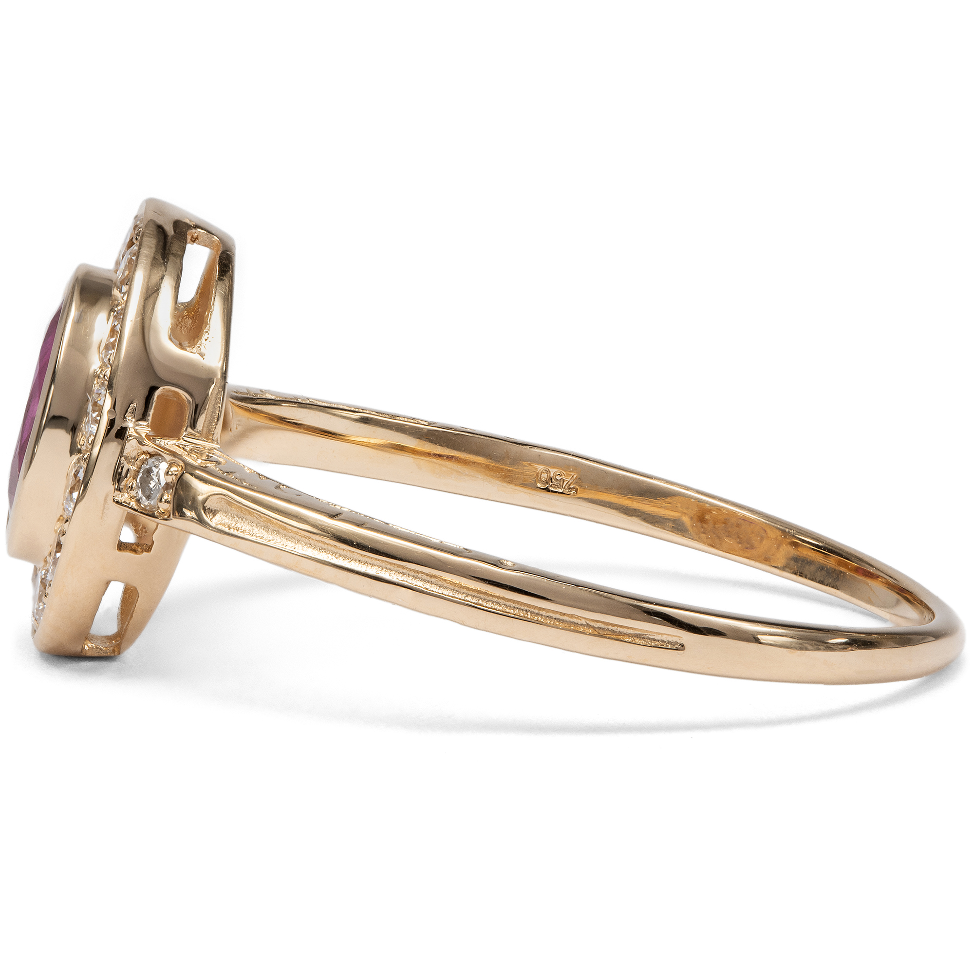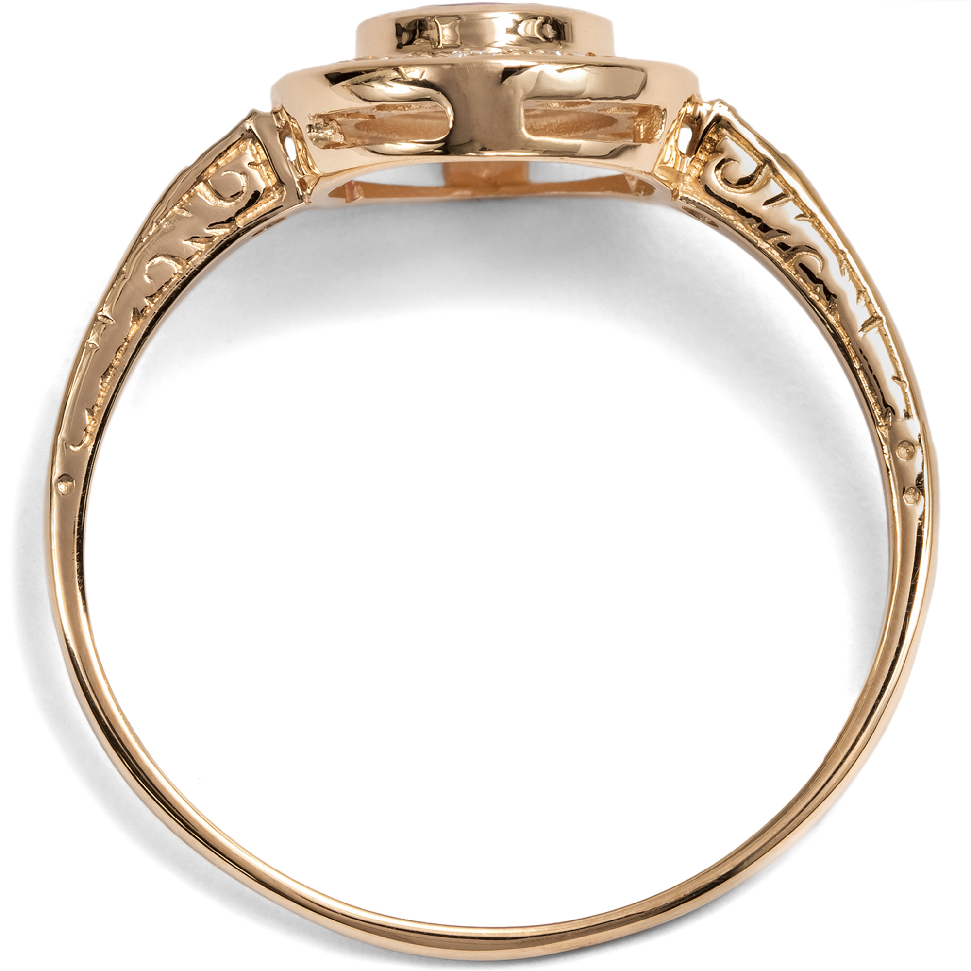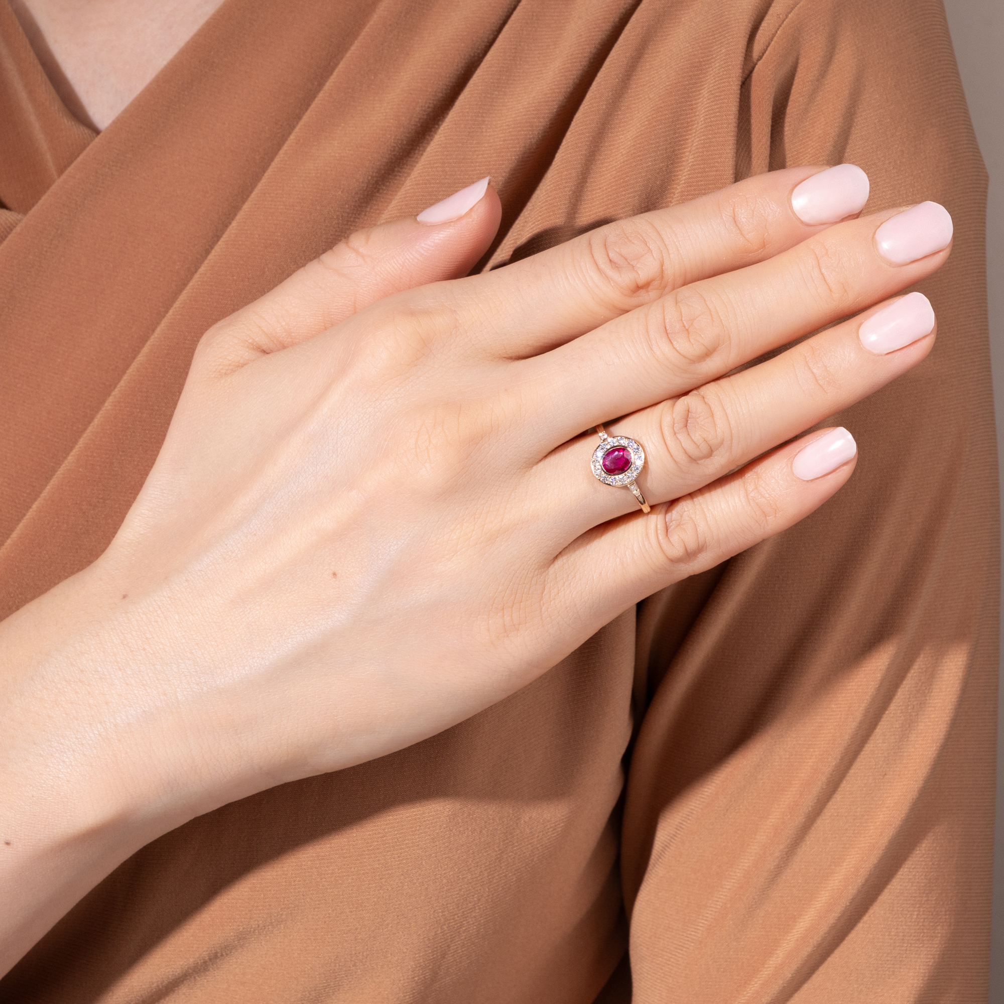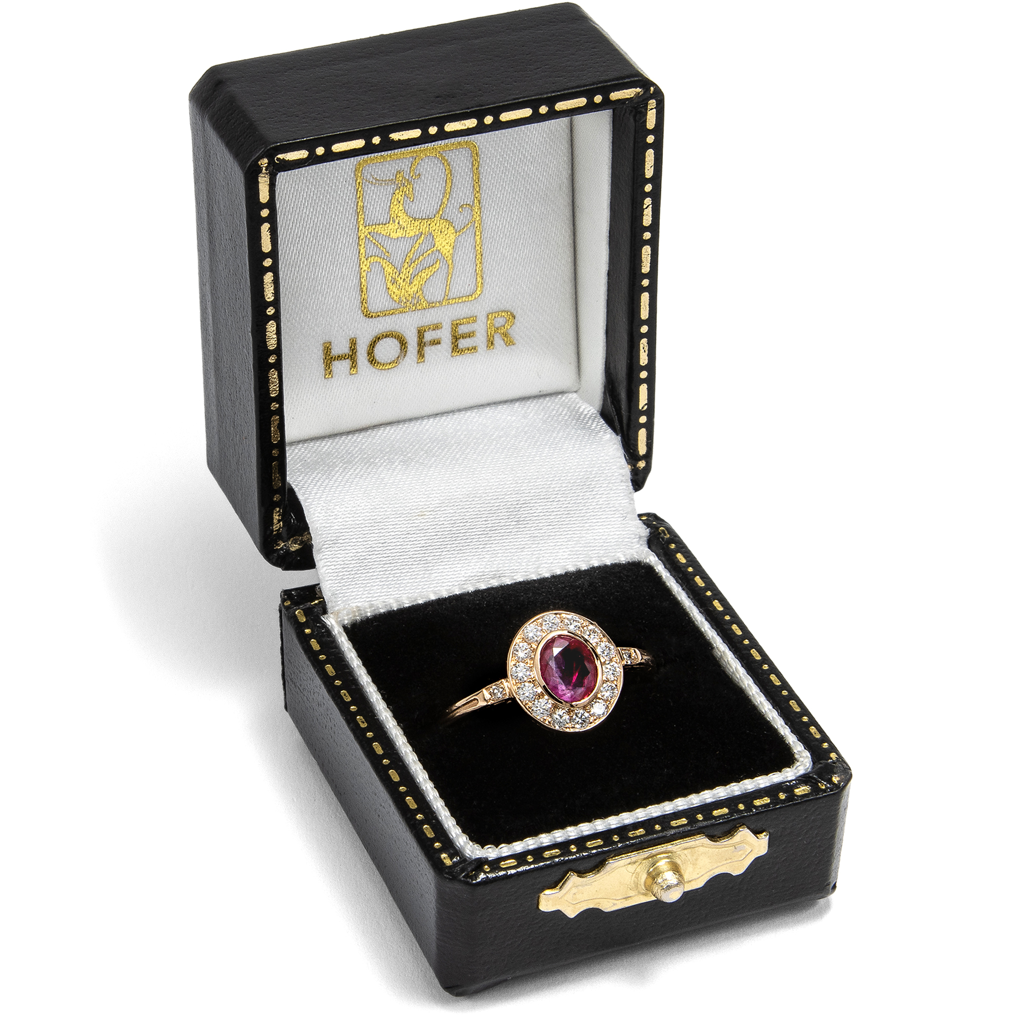 Dieser Ring aus unserer Werkstatt ist ein klassischer Entourage-Ring. Diese Ringform, bei der ein größerer Mittelstein ringsherum von Diamanten umgeben ist, ist nach dem französischen Wort „entourage“ für Begleitung oder Gefolge benannt. Entourage-Ringe gehören zu den großen Klassikern der Schmuckgeschichte und begegnen uns in allen Jahrhunderten, stets der jeweiligen Mode angepasst. Im vorliegenden Ring bildet ein natürlicher, unbehandelter Rubin aus Burma den strahlenden Mittelpunkt des Entwurfs. Der Edelstein zeigt ein lebendiges, tiefes Rot von besonderer Intensität, jene begehrte Farbqualität, die seit Jahrhunderten mit den berühmten Vorkommen Burmas verbunden wird und als Inbegriff kostbarer Rubine gilt. Vierzehn Diamanten im Brillantschliff von sehr guter Qualität und feinem Weiß säumen den Mittelstein und umgeben ihn mit festlichem Funkeln. Zwei weitere Diamanten zieren die Ringschultern. Insgesamt vereinen sich hier 0,36 Karat exzellente Diamanten. Alle Edelsteine sind in warm glänzendes, hochkarätiges Roségold gefasst, das den Farbton des Rubins besonders schön zur Geltung bringt. Der Ring wurde mit Blick auf besten Tragekomfort entworfen. Aufgrund seiner flachen Bauweise und der Edelsteinfassungen ohne störende Krappen lässt er sich problemlos täglich tragen. Die Ringschultern sind an den Seiten mit zarten Ornamenten nach Vorbildern der Zeit um 1890 verziert; alle Elemente sind bewusst fein und zurückhaltend gehalten, um den Blick ganz auf die Schönheit der Edelsteine zu lenken. Der Ring wurde vollständig in Deutschland für uns gefertigt, in Werkstätten in Pforzheim, Idar-Oberstein und hier in Berlin. Die Diamanten sind hier erstmals in einem Schmuckstück verwendet worden, bei dem Rubin handelt es sich um einen antiken Edelstein.