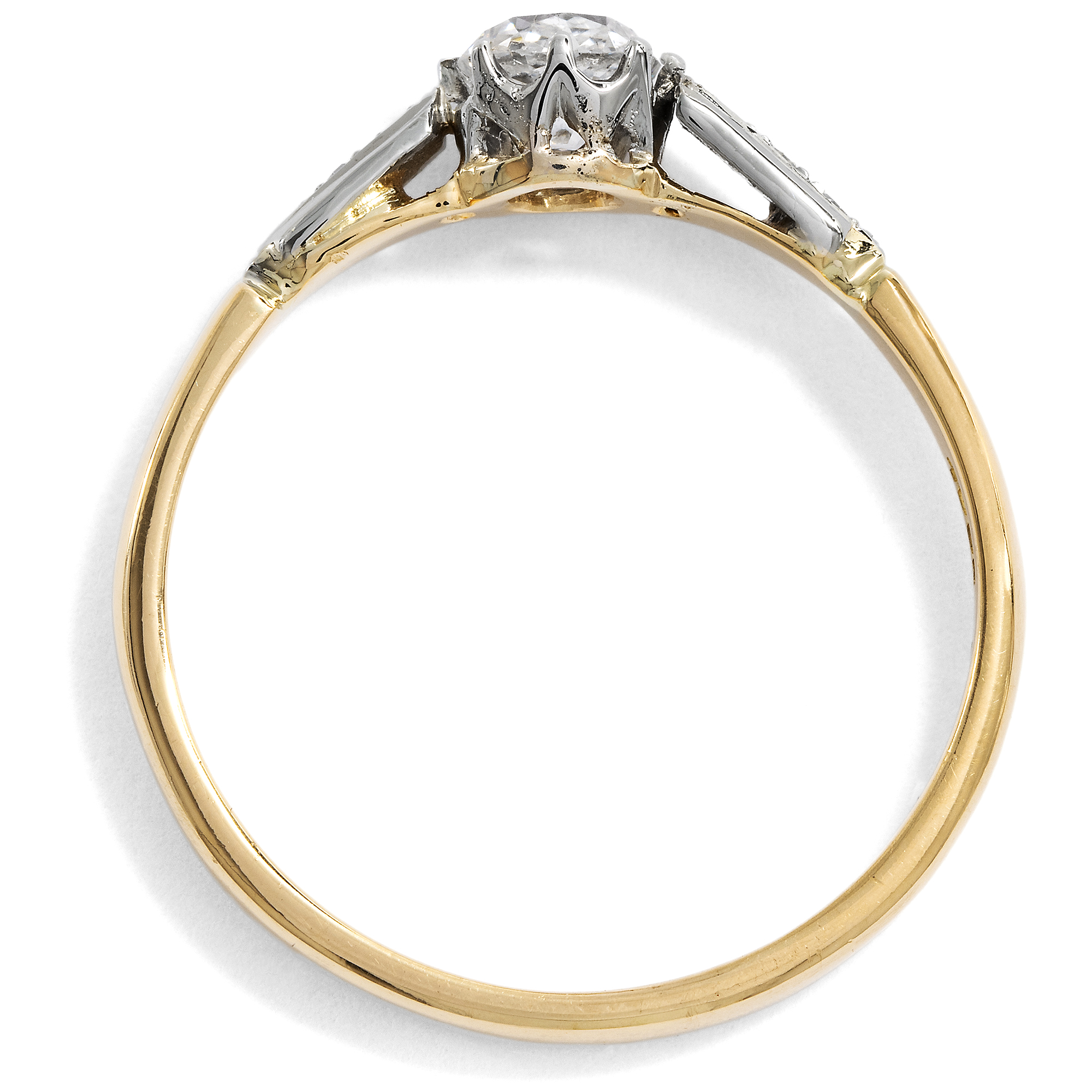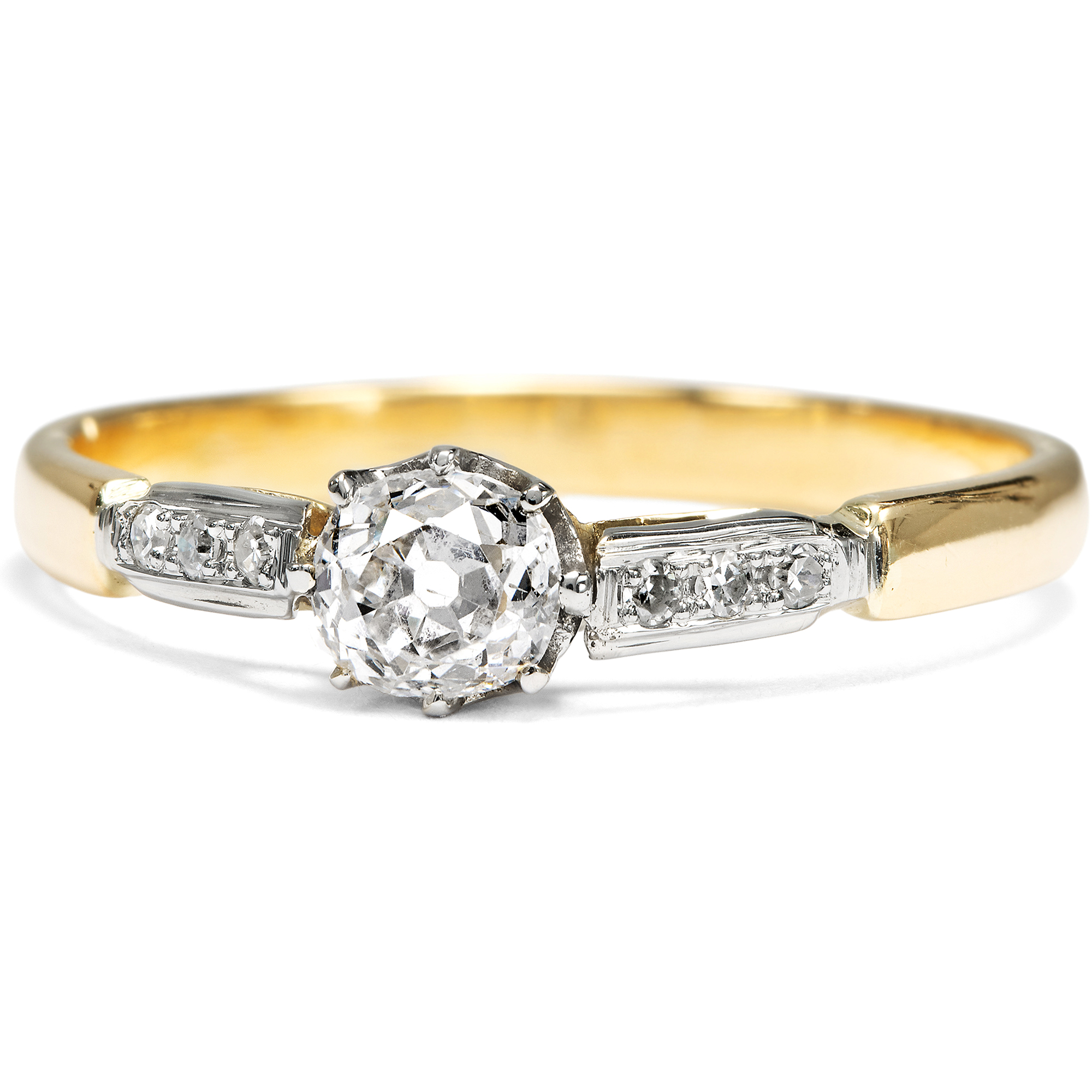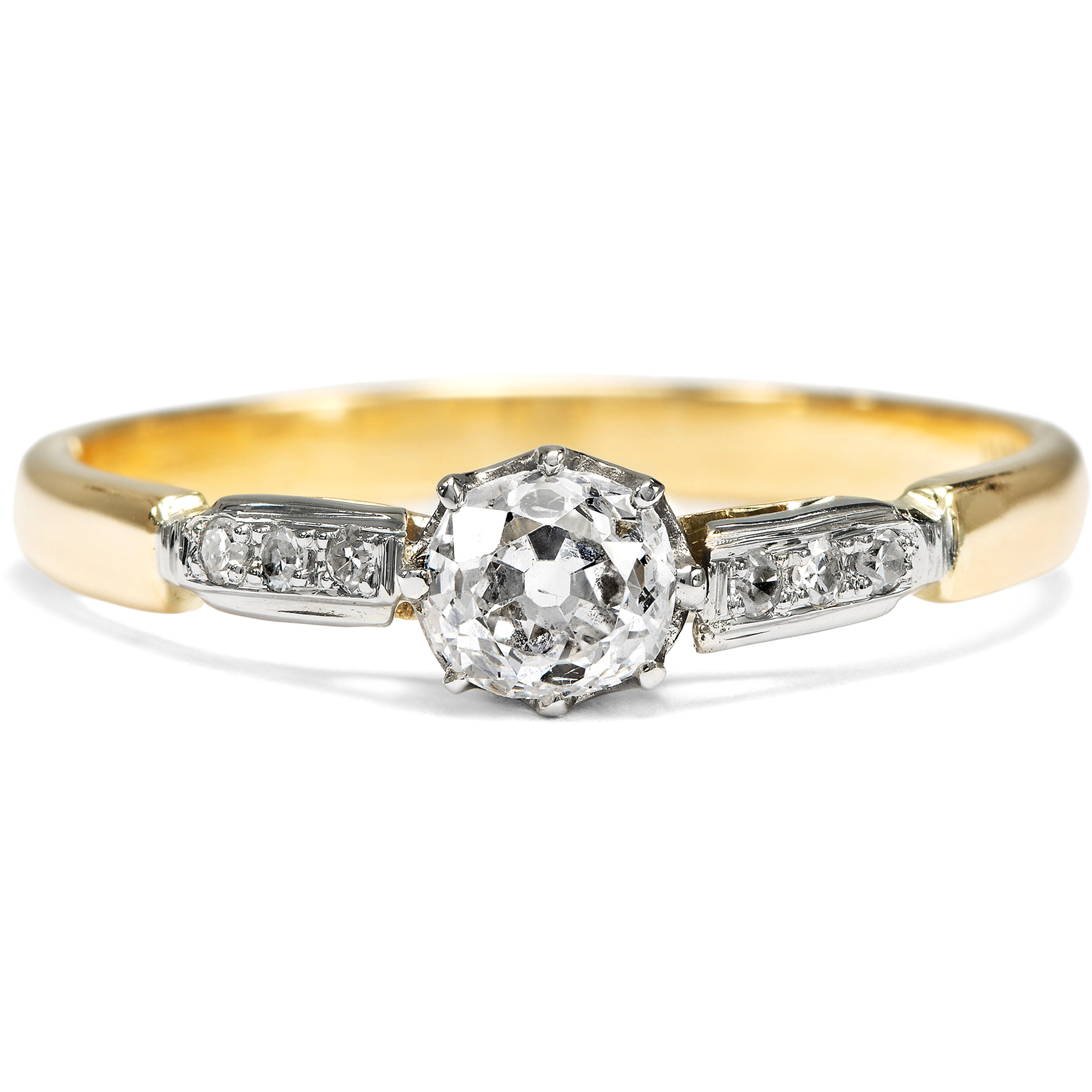 „Mögen die bevorzugten Schmucksteine auch wechseln und erst nach Jahren wieder ihre Auferstehung als Liebling der Damen feiern – der Brillant hat noch nie seine Stellung verloren, gleichmäßig wie sein untadelig klares Feuer überdauert er alle Strömungen der Mode. Verständlich darum, daß so viele Wünsche heimlich nach Ringen mit Diamanten zielen...“ (Aus einer Juwelen-Broschüre der 1930er Jahre) Kaum ein Schmuckstück hat die Bedeutung und tiefe Symbolik eines Diamantringes. Als Zeichen immerwährender Liebe und Verbundenheit wird der Diamant als das härteste Mineral der Erde schon seit Jahrhunderten als Schmuckstein getragen. Besonders ein Diamant im Altschliff ist dabei ein individuelles Geschenk; denn anders als die heutigen Brillanten im modernen Vollschliff, von denen beinahe der eine aussieht wie der andere, kann man sich bei Diamanten im Altschliff immer an einer ganz eigenen, von Hand geschaffenen Proportion und Form erfreuen. Der zentrale Altschliff-Brillant, der uns hier in einem fein gearbeiteten Ring der Zeit um 1920 entgegentritt, hat ein Gewicht von 0,42 Karat und zeigt sich individuell facettiert und von schöner Qualität. Der Solitär wird von einem zarten Krappenkrönchen gehalten, das ebenso wie die Ringschultern mit sechs kleineren Achtkandiamanten aus hellem Platin gearbeitet ist. Eine schlichte Schiene aus hochkarätigem Gelbgold macht das Schmuckstück komplett. Der klassisch schöne Ring aus den Jahren um 1920 wurde in England gefertigt. Wir haben ihn in unserer Werkstatt polieren lassen, sodass er nun wieder fast so glänzt wie vor einhundert Jahren!