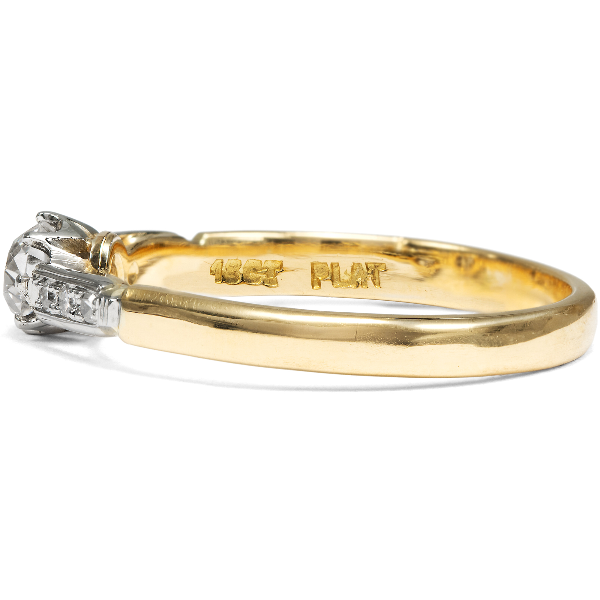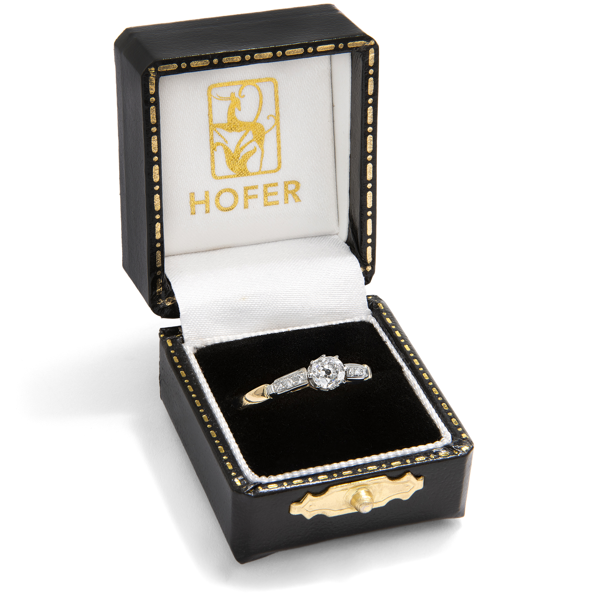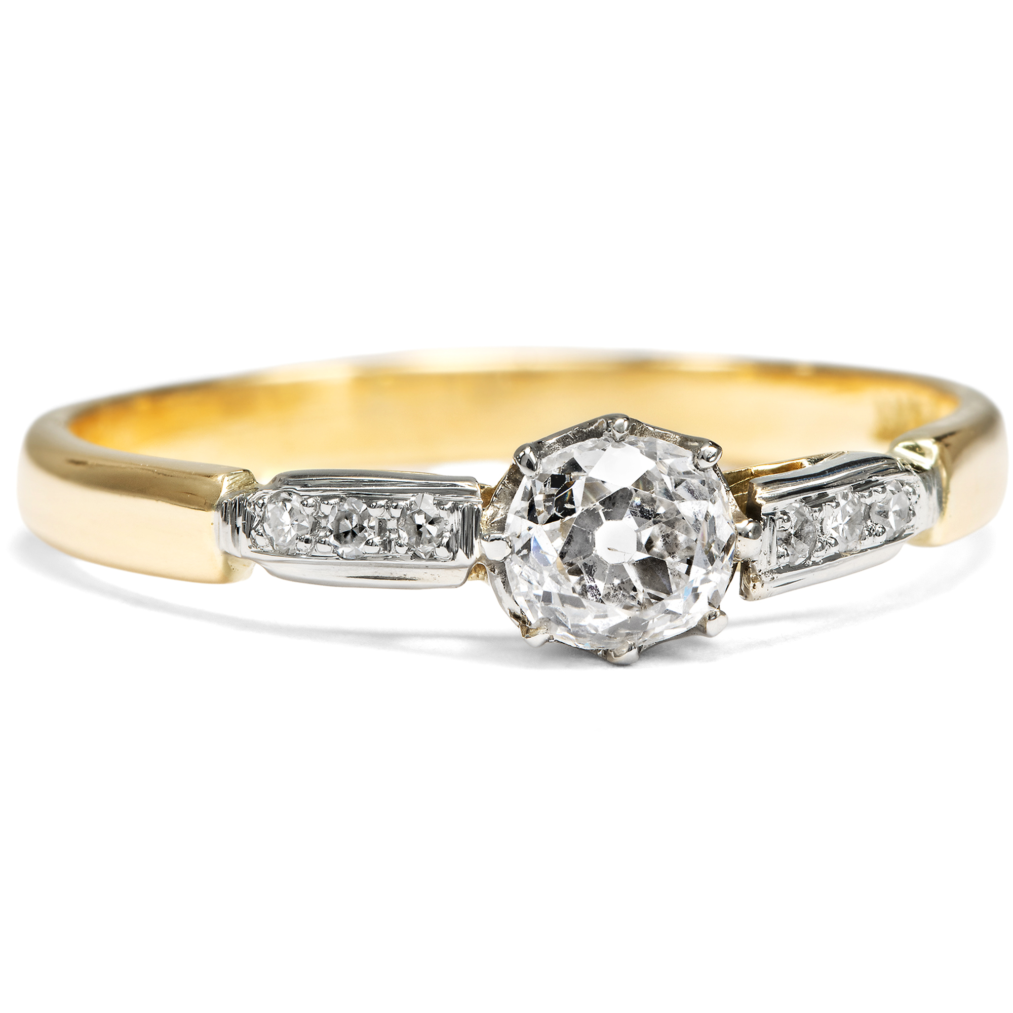 „Mögen die bevorzugten Schmucksteine auch wechseln und erst nach Jahren wieder ihre Auferstehung als Liebling der Damen feiern – der Brillant hat noch nie seine Stellung verloren, gleichmäßig wie sein untadelig klares Feuer überdauert er alle Strömungen der Mode. Verständlich darum, daß so viele Wünsche heimlich nach Ringen mit Diamanten zielen...“ (Aus einer Juwelen-Broschüre der 1930er Jahre) Kaum ein Schmuckstück hat die Bedeutung und tiefe Symbolik eines Diamantringes. Als Zeichen immerwährender Liebe und Verbundenheit wird der Diamant als das härteste Mineral der Erde schon seit Jahrhunderten als Schmuckstein getragen. Besonders ein Diamant im Altschliff ist dabei ein individuelles Geschenk; denn anders als die heutigen Brillanten im modernen Vollschliff, von denen beinahe der eine aussieht wie der andere, kann man sich bei Diamanten im Altschliff immer an einer ganz eigenen, von Hand geschaffenen Proportion und Form erfreuen. Der zentrale Altschliff-Brillant, der uns hier in einem fein gearbeiteten Ring der Zeit um 1920 entgegentritt, hat ein Gewicht von 0,42 Karat und zeigt sich individuell facettiert und von schöner Qualität. Der Solitär wird von einem zarten Krappenkrönchen gehalten, das ebenso wie die Ringschultern mit sechs kleineren Achtkandiamanten aus hellem Platin gearbeitet ist. Eine schlichte Schiene aus hochkarätigem Gelbgold macht das Schmuckstück komplett. Der klassisch schöne Ring aus den Jahren um 1920 wurde in England gefertigt. Wir haben ihn in unserer Werkstatt polieren lassen, sodass er nun wieder fast so glänzt wie vor einhundert Jahren!