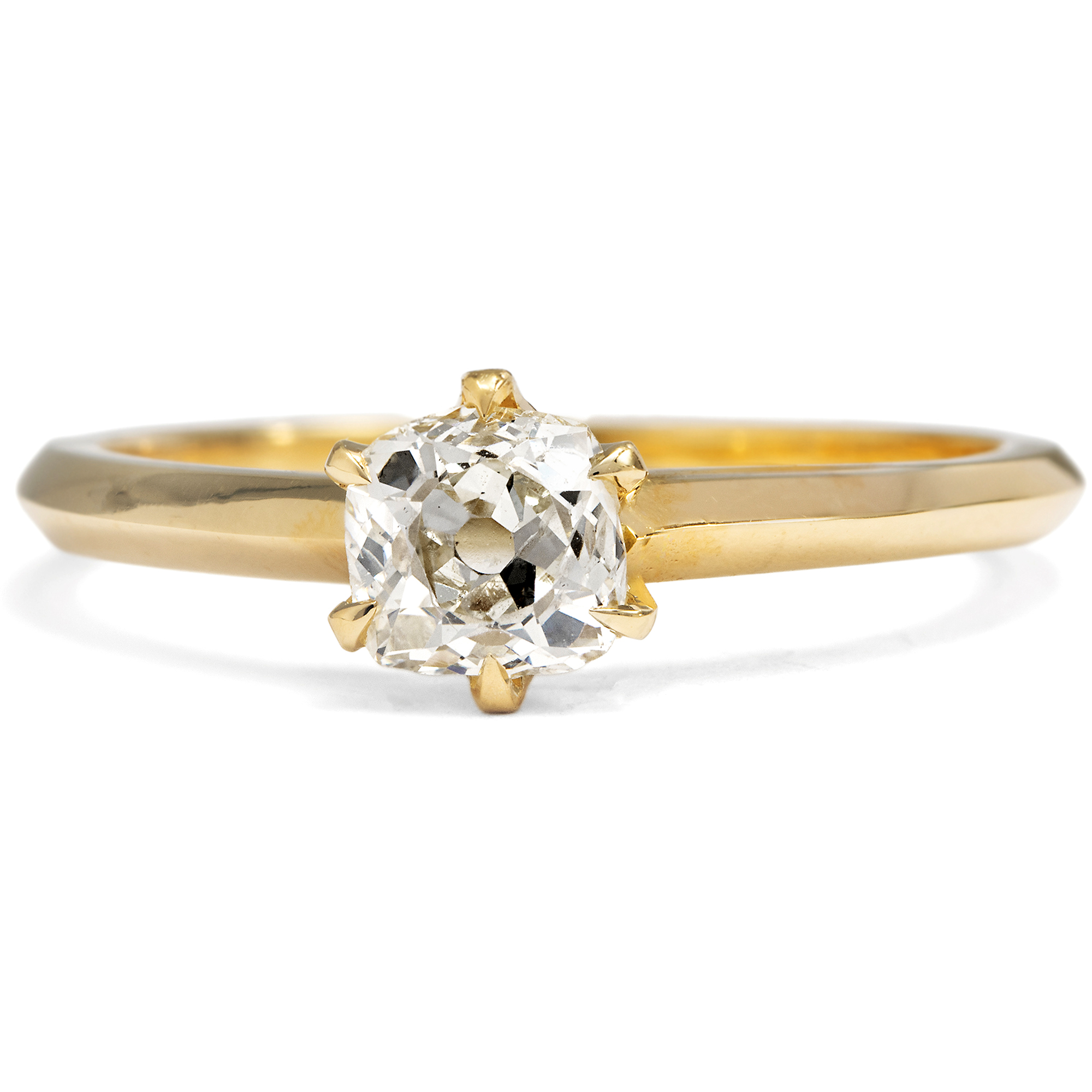 Der klassische Solitärring, also ein Ring mit nur einem Diamanten, wurde durch einen Entwurf des Juweliers Tiffany & Co. aus dem Jahr 1886 popularisiert. Bis heute ist diese Form des Rings der Inbegriff des Verlobungsrings geblieben: In ihm bündelt sich die gesamte Symbolkraft, die man von einem Schmuckstück erwarten kann, das ein Versprechen trägt. Der hier vorliegende Solitärring ist auf unseren Auftrag hin in Berlin entstanden. In seiner Mitte präsentiert er einen Diamanten im Altschliff aus den Jahren um 1850. Der Stein ist ein Halbkaräter mit einem Gewicht von 0,51 Karat. Natürliche Einschlüsse in Form von kleinen Pünktchen und schwarzen Fahnen machen den Stein zu einem Unikat. Seine Brillanz ist trotz dieser Einschlüsse dennoch gut; seine Farbe ist warm getönt (K). Der historische Diamant wird von sechs Krappen aus Gelbgold sicher gehalten, deren warmer Glanz gut zum warmen Ton des Diamanten passt. Der Ring ist von uns nachhaltig hergestellt worden: Sowohl der Diamant als auch das Gold des Rings wurden hier in Zweitverwendung eingesetzt. Es handelt sich um wiederverwendete, historische Materialien.