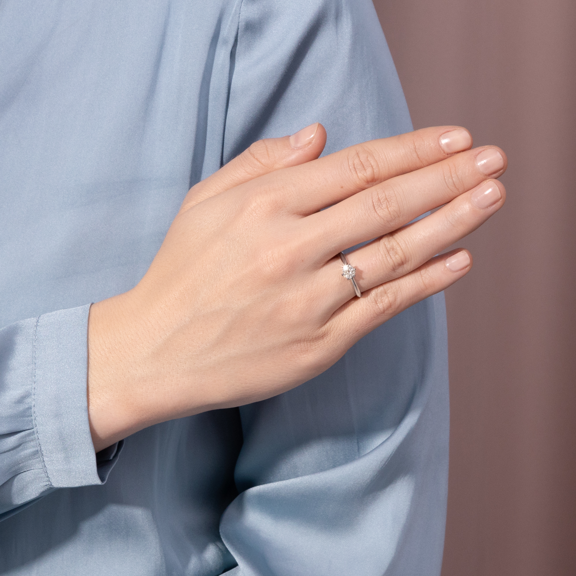 Der klassische Solitärring, also ein Ring mit nur einem Diamanten, wurde von Charles Lewis Tiffany im Jahr 1886 popularisiert. Erst rund 20 Jahre zuvor waren in Südafrika neue, ergiebige Diamantvorkommen entdeckt worden, sodass Schmuck mit Diamanten nun zum ersten Mal für breitere Bevölkerungsschichten erschwinglich wurde. Die Erfindung des Diamantsolitärs war daher die geradezu notwendige Folge – und bis heute ist diese Form des Rings der Inbegriff des Verlobungsrings geblieben. Ein solcher Solitärring ist in unserem Auftrag hier in Berlin entstanden. In seiner Mitte präsentiert er einen historischen Diamanten von 0,64 Karat Gewicht, gehalten von sechs Krappen. Der Stein im kissenförmigen Altschliff wurde um die Mitte des 19. Jahrhunderts herum geschliffen. Kleine Einschlüsse machen den Stein zu einem Unikat und bezeugen seine Echtheit und natürliche Entstehung. Die Farbe des Diamanten ist ein leicht warm getöntes Weiß+ (Top Crystal, I), wodurch der Ring eine sympathische Wärme behält. Der Ring ist von uns nachhaltig hergestellt worden: Sowohl der Diamant als auch das Platin des Rings werden hier in Zweitverwendung genutzt. Es handelt sich um historische Materialien.