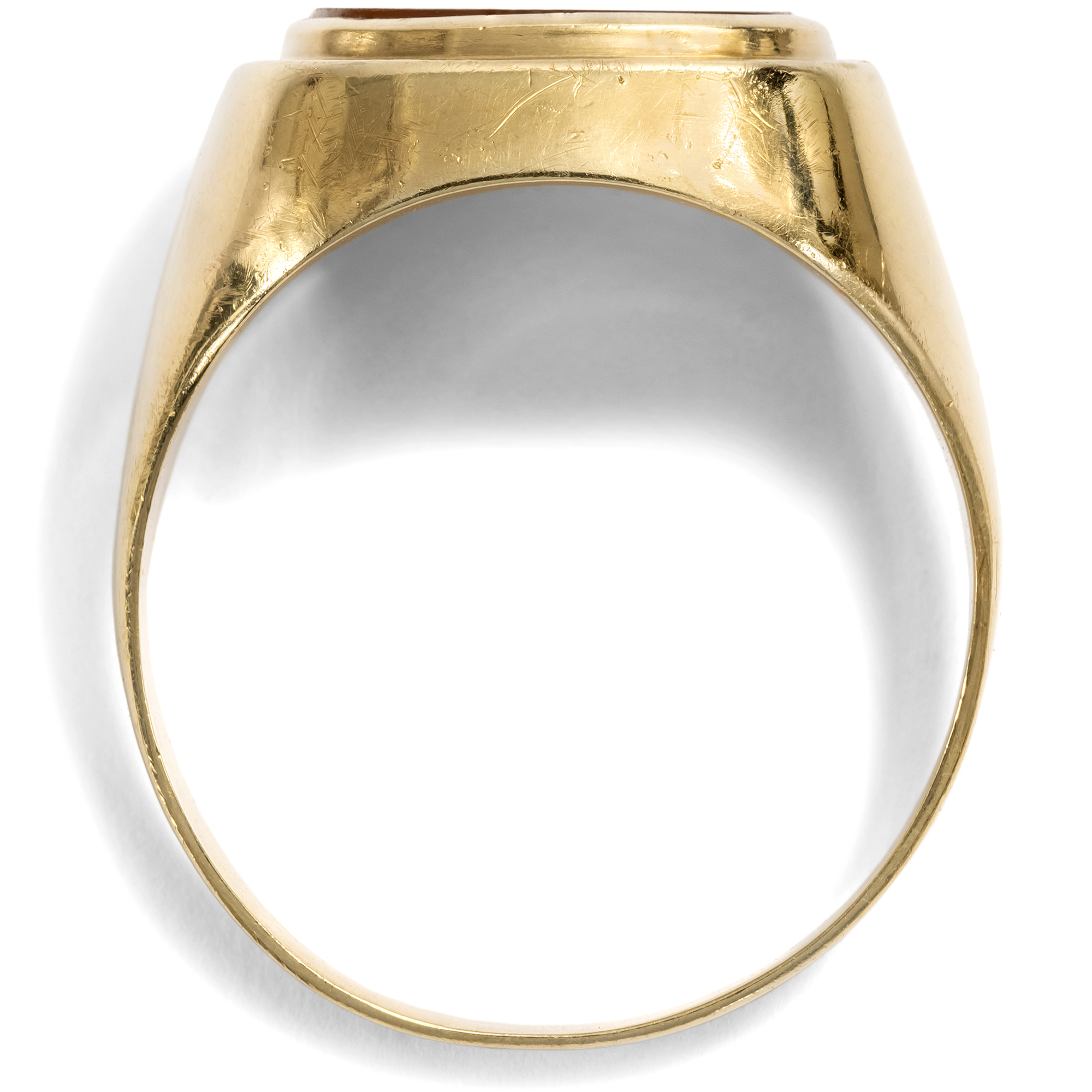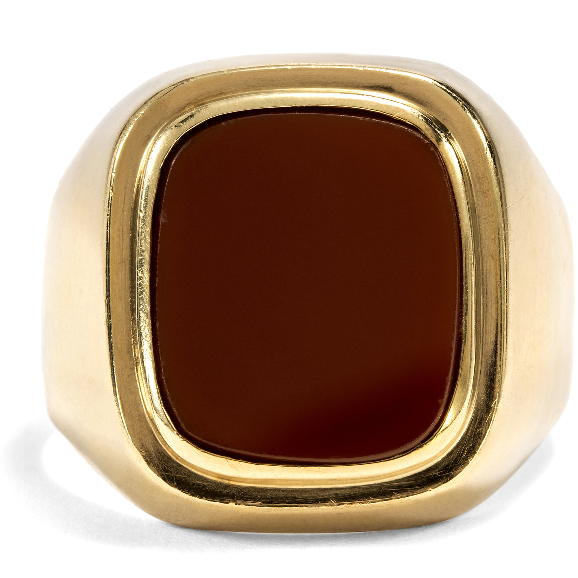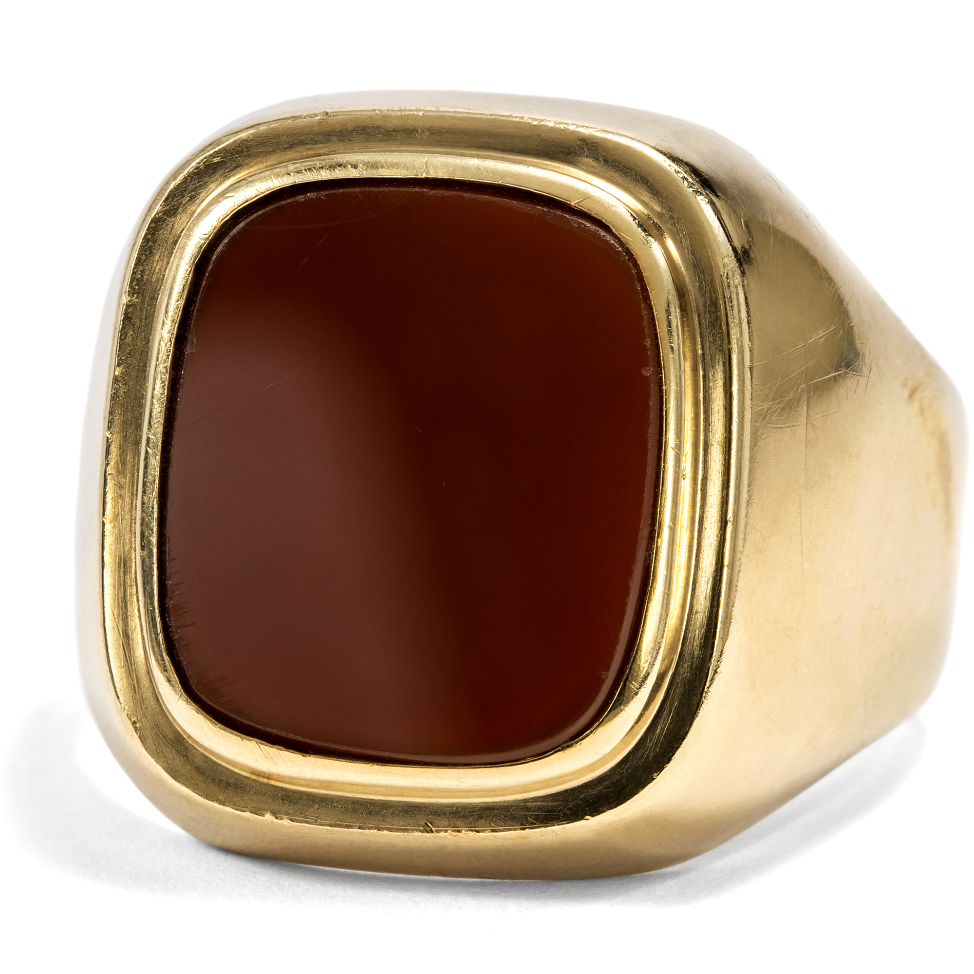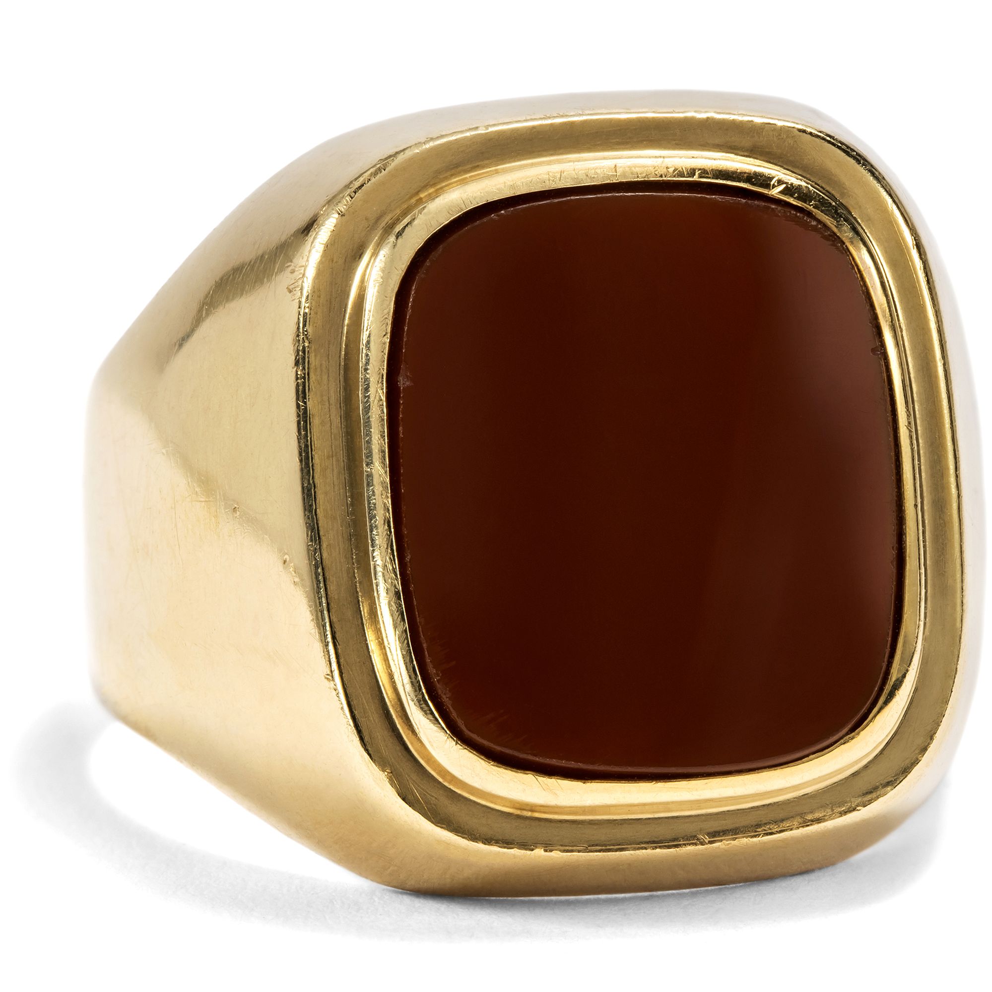 Der Karneol ist ein Stein mit jahrtausendealter Geschichte. Schon Hildegard von Bingen erwähnte ihn in ihren Schriften, und bereits vor ihr war er den Etruskern als Schmuckstein bekannt. Auch die Römer nutzten ihn gern für Gemmen, denn neben seiner feurigen Farbe bietet er den Vorteil, gut gravierbar zu sein, sodass er sich ideal zur Herstellung von Intaglios eignet. Denn zu allen Gelegenheiten, in denen wir heute unsere Unterschrift leisten oder unseren Ausweis vorzeigen, benutzten die Menschen der Antike ein Siegel. Der Siegelabdruck diente der Beglaubigung von Briefen und Urkunden, zum Verschließen von Waren, Vorräten, Truhen oder Türen. Ein Siegelring war somit ein unverzichtbares Utensil für den wohlhabenden Bürger und zeitgleich auch Statussymbol. In diesen Siegelring ist ein farbintensiver Karneol eingelassen, zur Tafel geschliffen und glatt poliert. Der Stein zeigt sich in einer goldenen Fassung im Zeitgeschmack der Wirtschaftswunderjahre, welche die Details mit abgerundeten Kanten artikuliert. Er eignet sich dazu, ein Wappen eingravieren zu lassen. Der Ring kam hier in Berlin zu uns und ist gut erhalten.