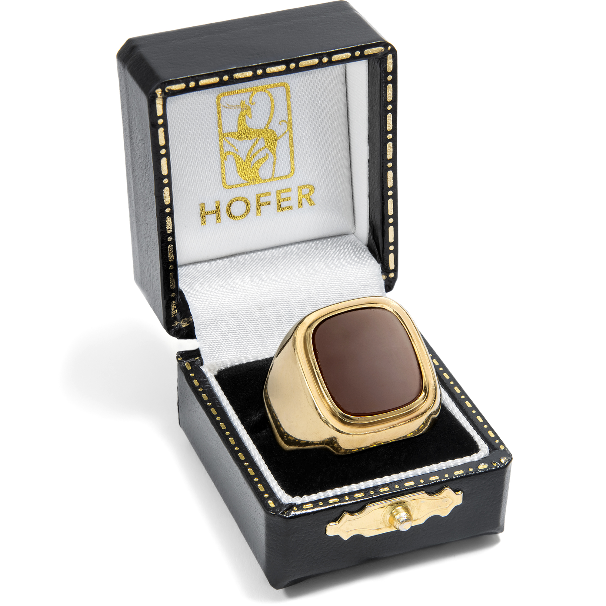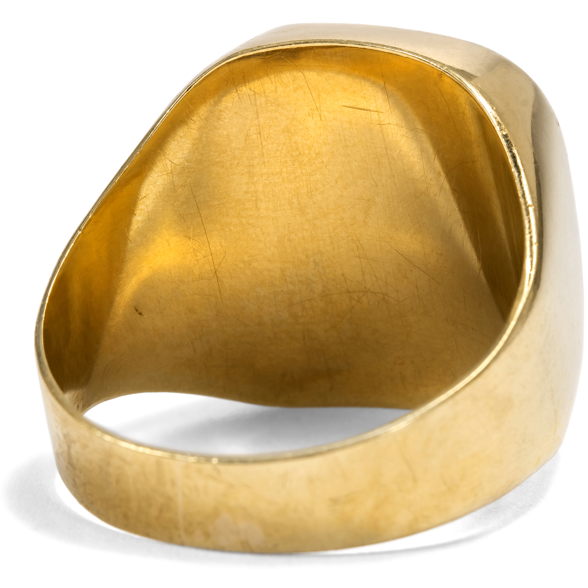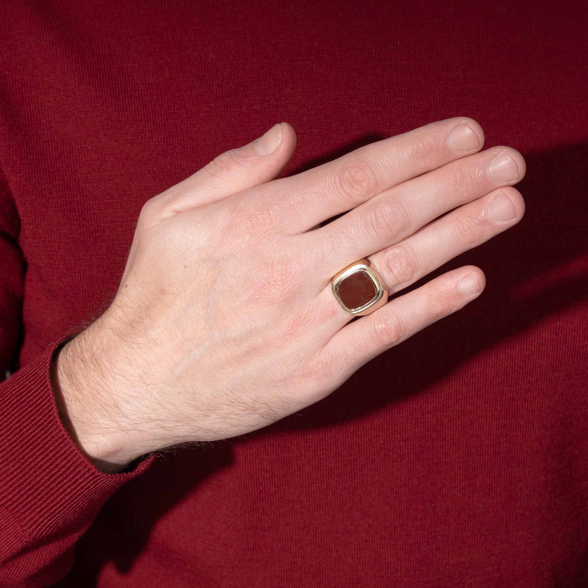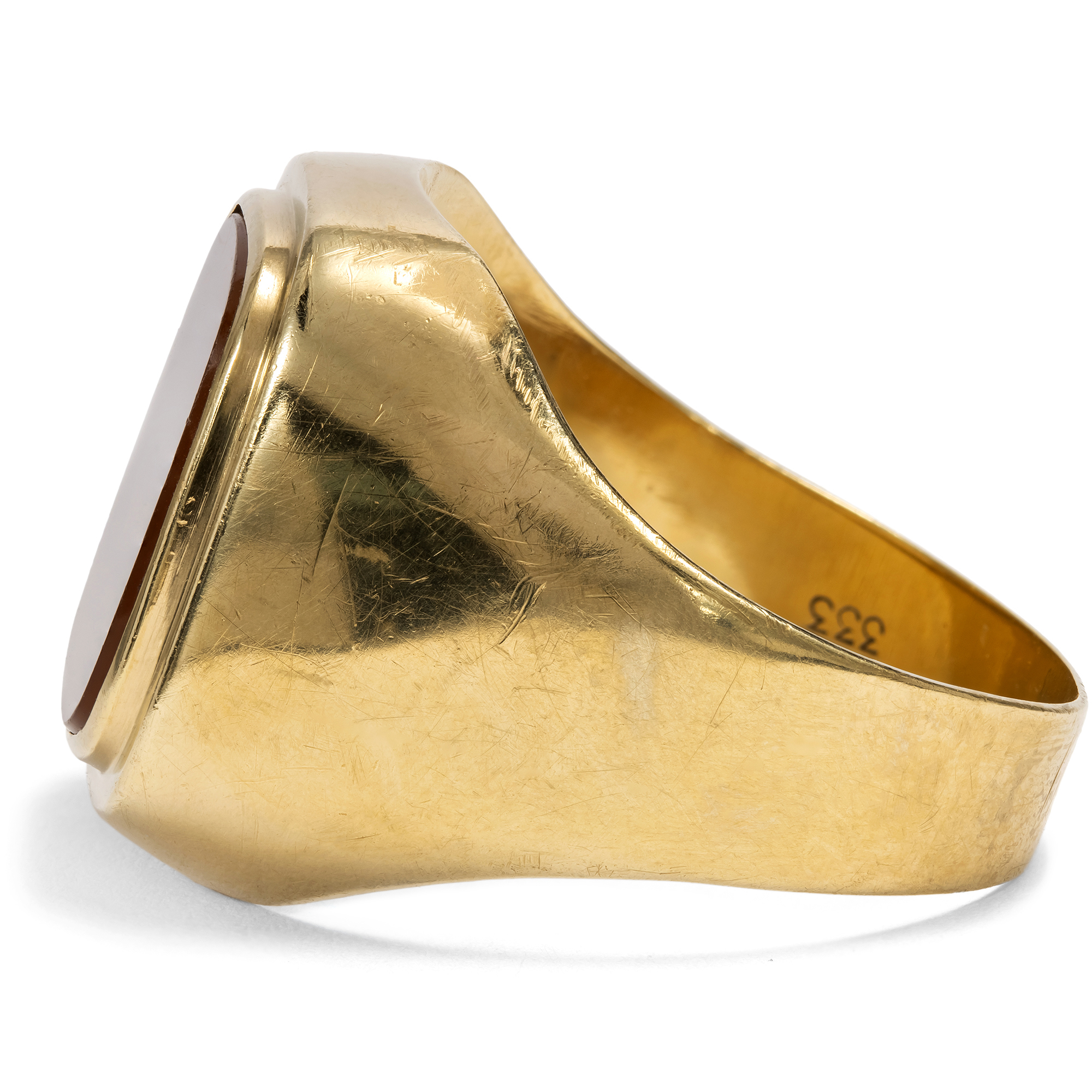 Der Karneol ist ein Stein mit jahrtausendealter Geschichte. Schon Hildegard von Bingen erwähnte ihn in ihren Schriften, und bereits vor ihr war er den Etruskern als Schmuckstein bekannt. Auch die Römer nutzten ihn gern für Gemmen, denn neben seiner feurigen Farbe bietet er den Vorteil, gut gravierbar zu sein, sodass er sich ideal zur Herstellung von Intaglios eignet. Denn zu allen Gelegenheiten, in denen wir heute unsere Unterschrift leisten oder unseren Ausweis vorzeigen, benutzten die Menschen der Antike ein Siegel. Der Siegelabdruck diente der Beglaubigung von Briefen und Urkunden, zum Verschließen von Waren, Vorräten, Truhen oder Türen. Ein Siegelring war somit ein unverzichtbares Utensil für den wohlhabenden Bürger und zeitgleich auch Statussymbol. In diesen Siegelring ist ein farbintensiver Karneol eingelassen, zur Tafel geschliffen und glatt poliert. Der Stein zeigt sich in einer goldenen Fassung im Zeitgeschmack der Wirtschaftswunderjahre, welche die Details mit abgerundeten Kanten artikuliert. Er eignet sich dazu, ein Wappen eingravieren zu lassen. Der Ring kam hier in Berlin zu uns und ist gut erhalten.