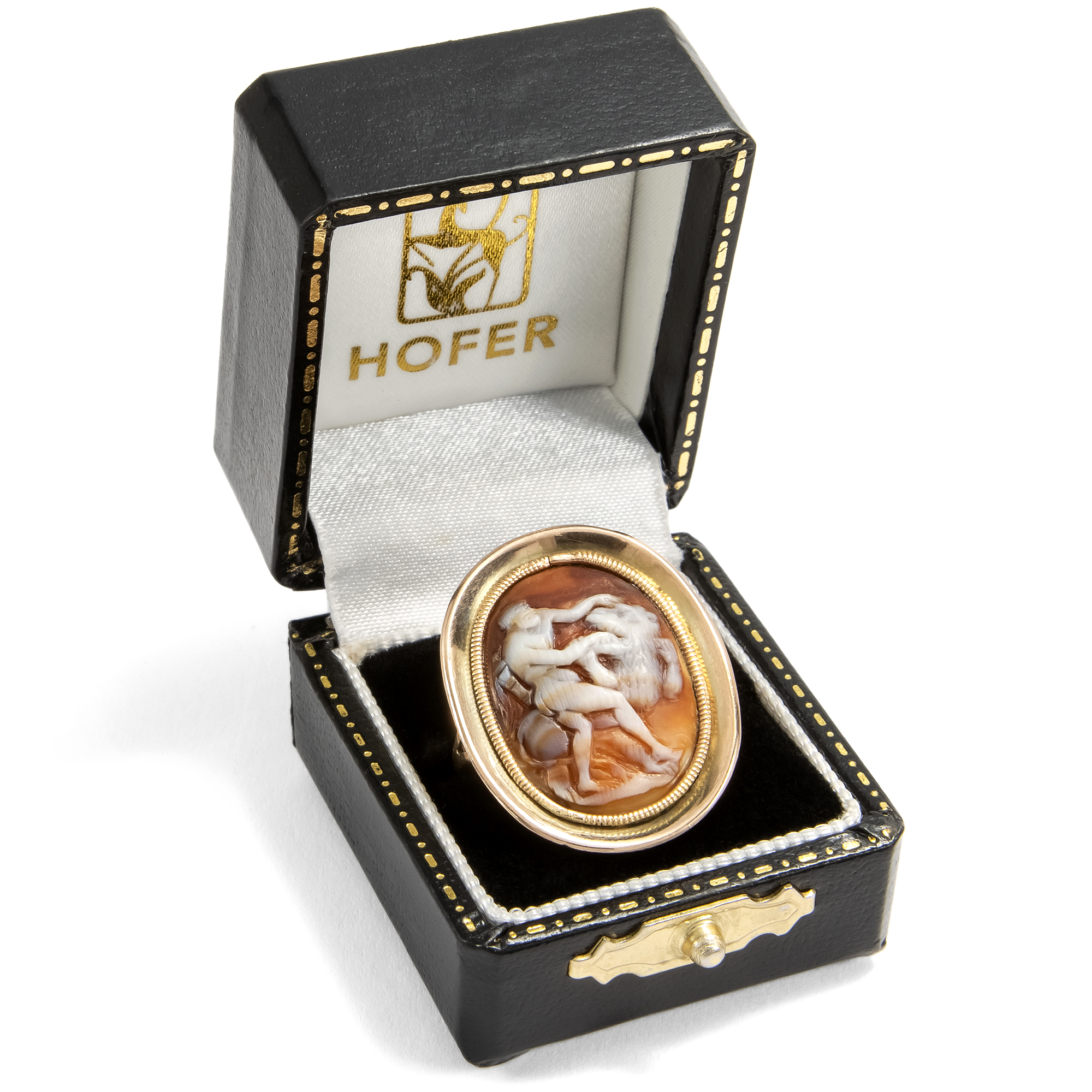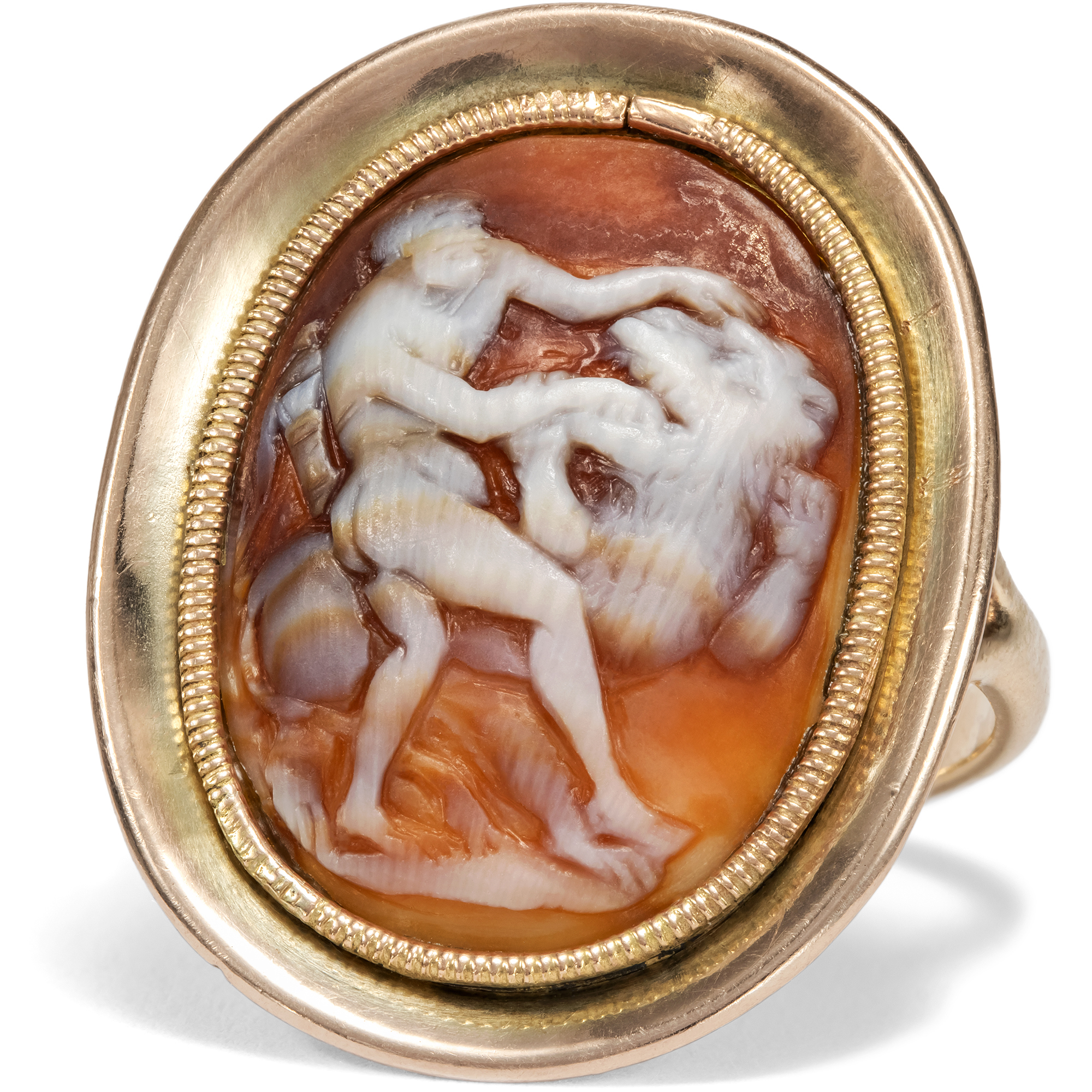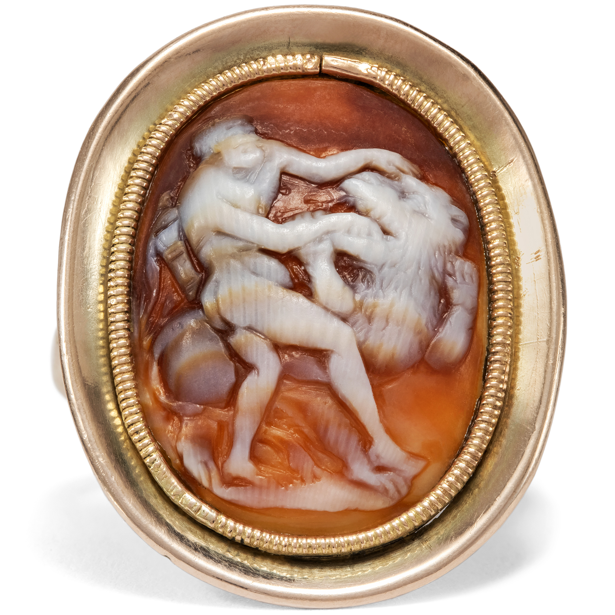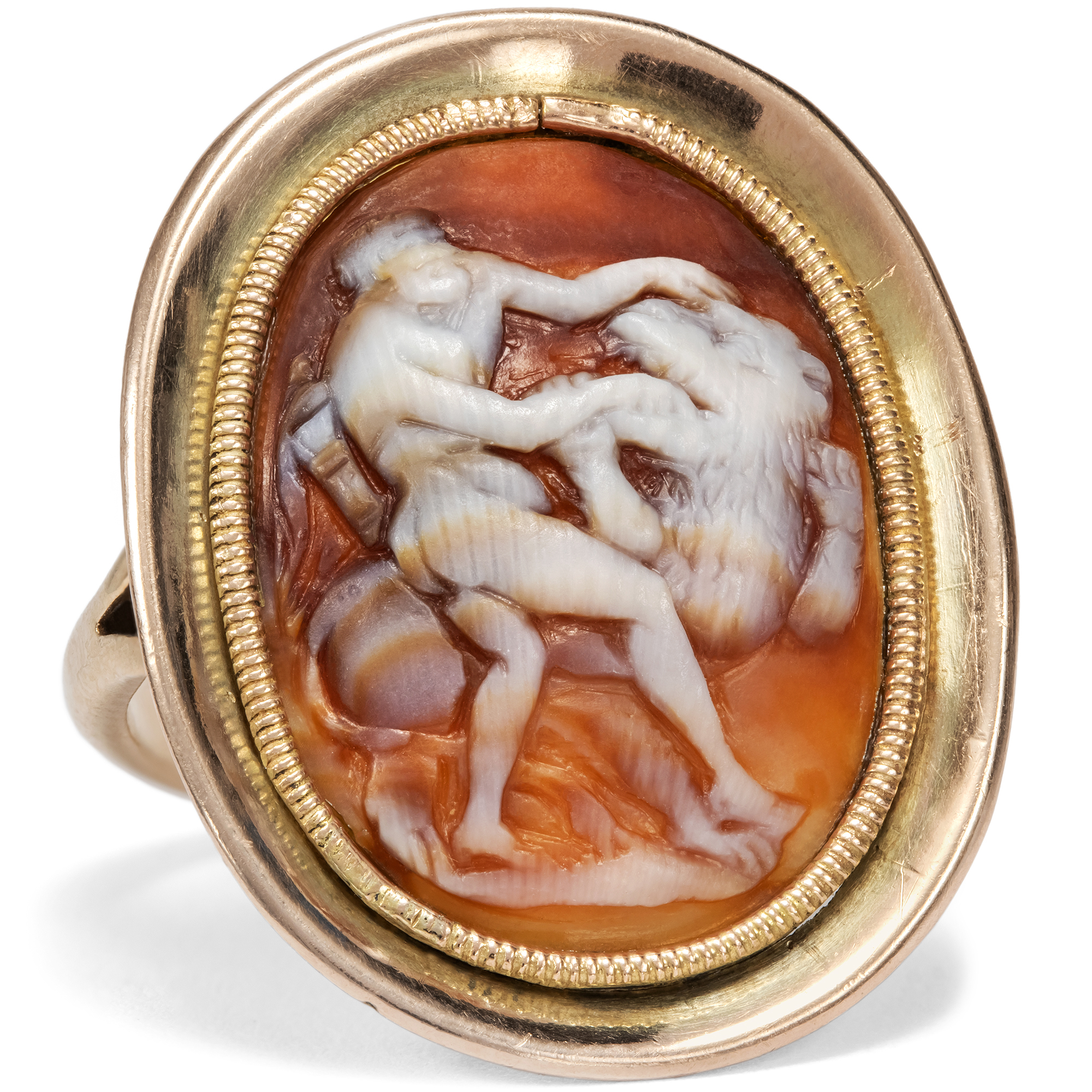 Zahlreiche Geschichten ranken sich um die Stärke und den Mut des Halbgottes Herkules und um die Aufgaben, die ihm auferlegt wurden. Zu den berühmtesten gehört der Kampf mit dem Nemeischen Löwen, einem Ungeheuer von solcher Kraft, dass keine Waffe seine Haut zu durchdringen vermochte. Herkules bezwang das Tier schließlich mit bloßen Händen und machte dessen Fell zu seinem unverkennbaren Attribut. Fortan schützte es ihn wie eine Rüstung und wurde zum Sinnbild seiner Unbesiegbarkeit. Die hier dargestellte Szene hält den dramatischen Moment dieses Kampfes fest. Mensch und Tier sind eng ineinander verschlungen, die Spannung des Augenblicks ist in die kleine Fläche der Kamee verdichtet und mit großer Virtuosität herausgearbeitet. Der Stein, in den diese Darstellung erhaben eingeschnitten ist, ist ein natürlicher Achat. Seine feinen, in Schichten aufgebauten Strukturen ermöglichen es dem Steinschneider, mit Hell und Dunkel zu spielen und die Figuren plastisch hervortreten zu lassen. Bereits in der Antike wusste man diese Eigenschaften zu nutzen und koche die Steine im Honig, um die Kontraste der Lagen noch stärker hervorzuheben. Die Kamee ist in eine breite, goldene Fassung eingesetzt, die ihre Wirkung ruhig und wirkungsvoll unterstützt. Sowohl die Gemme als auch ihre Fassung stammen aus der Zeit um 1800. Die Ringschiene wurde zu einem späteren Zeitpunkt ergänzt und macht aus der historischen Gemme ein tragbares Schmuckstück. Entdeckt haben wir den spannenden Ring in München.
