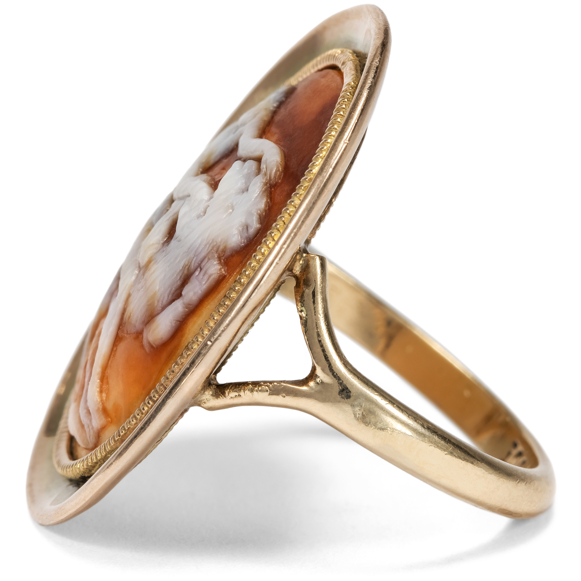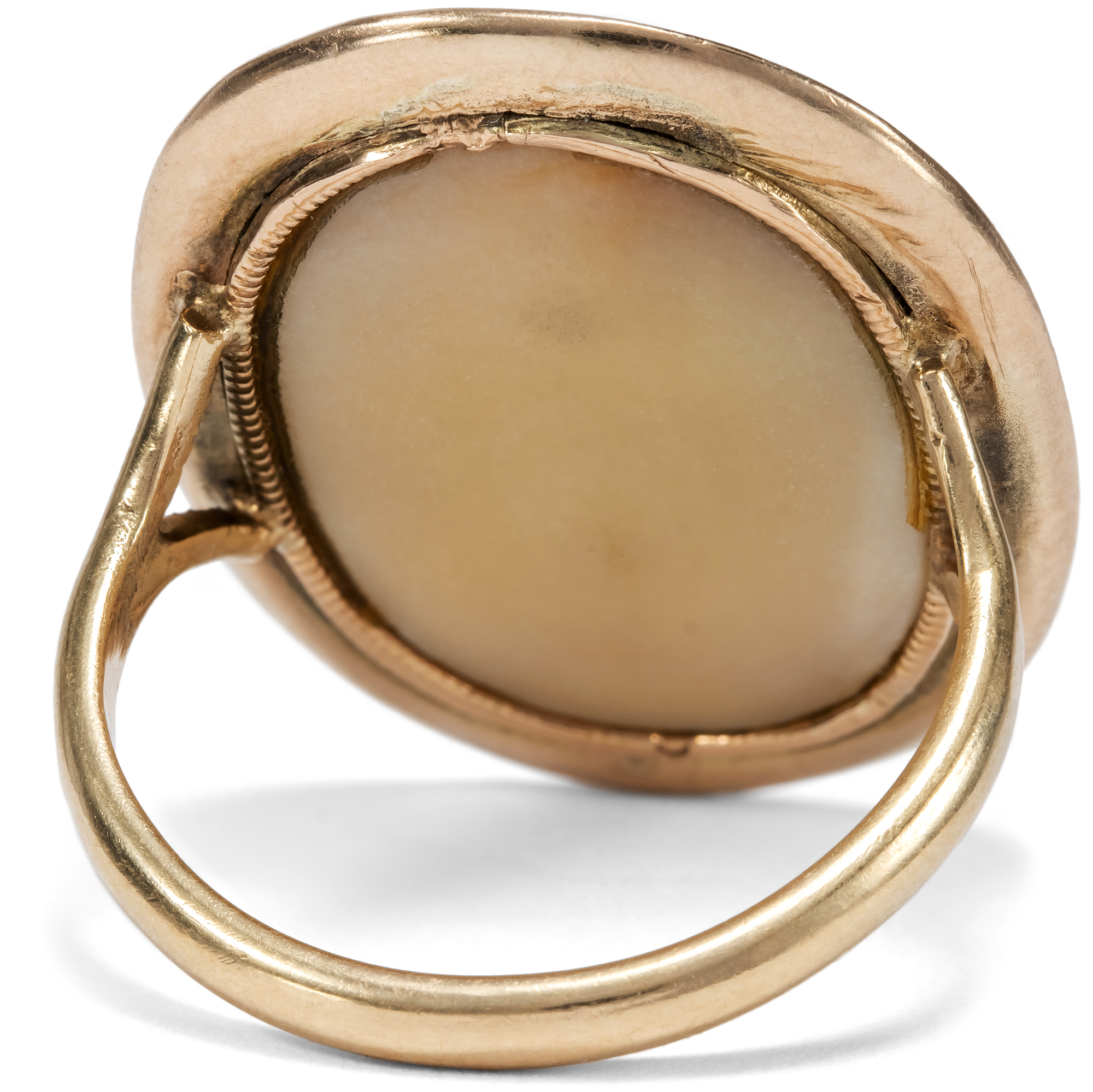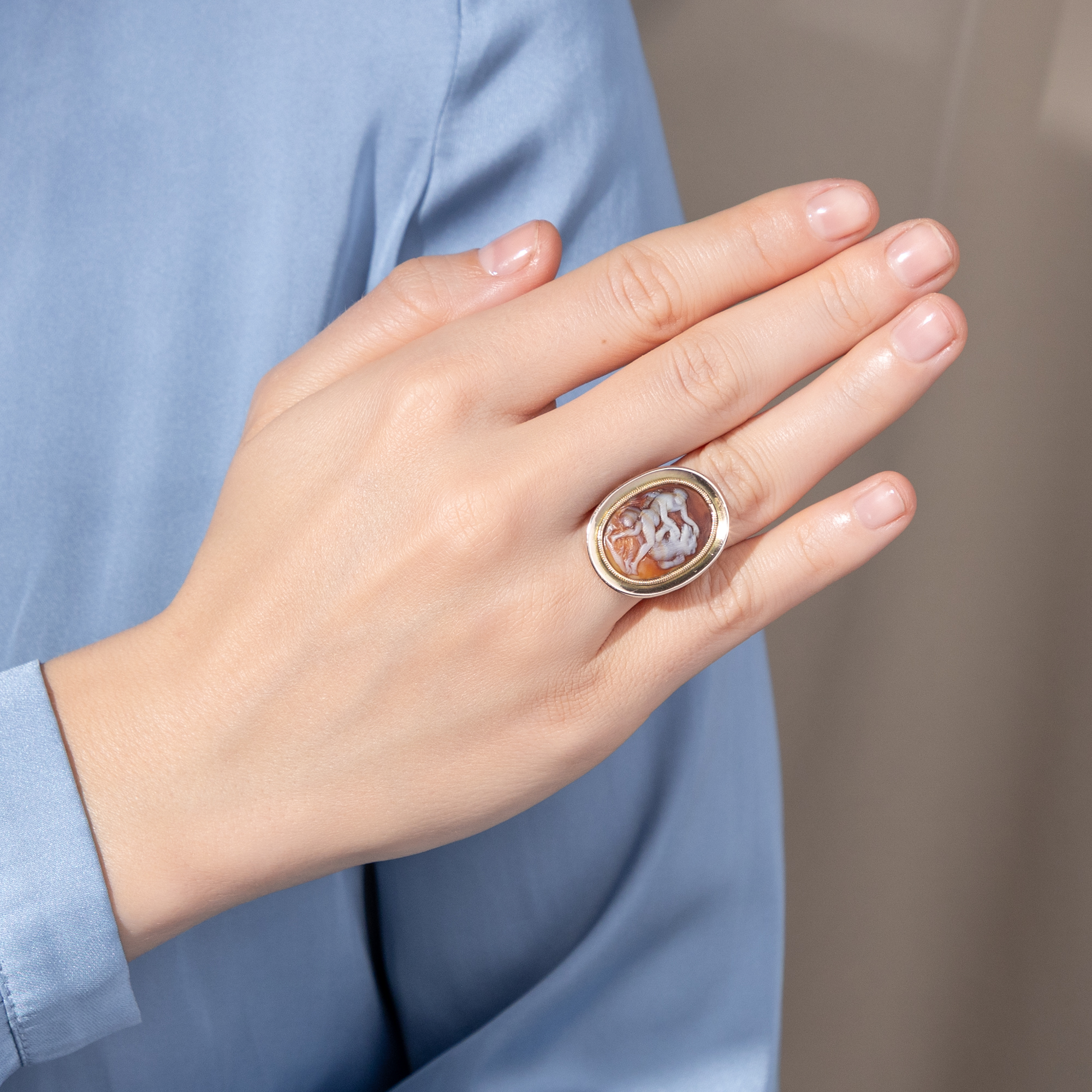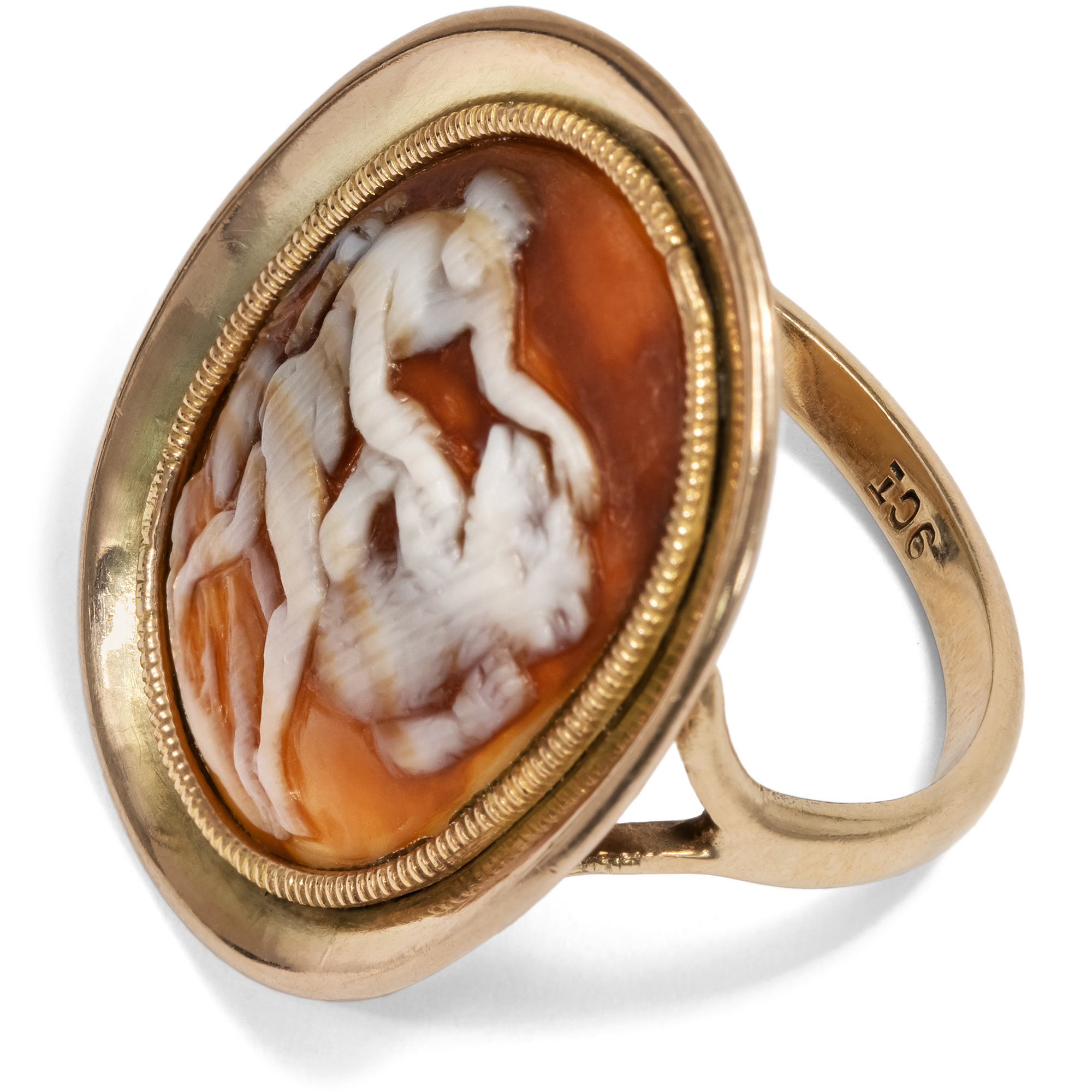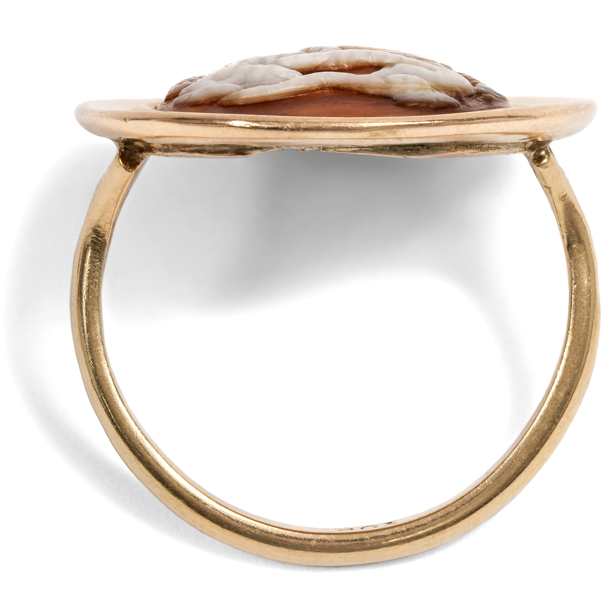 Zahlreiche Geschichten ranken sich um die Stärke und den Mut des Halbgottes Herkules und um die Aufgaben, die ihm auferlegt wurden. Zu den berühmtesten gehört der Kampf mit dem Nemeischen Löwen, einem Ungeheuer von solcher Kraft, dass keine Waffe seine Haut zu durchdringen vermochte. Herkules bezwang das Tier schließlich mit bloßen Händen und machte dessen Fell zu seinem unverkennbaren Attribut. Fortan schützte es ihn wie eine Rüstung und wurde zum Sinnbild seiner Unbesiegbarkeit. Die hier dargestellte Szene hält den dramatischen Moment dieses Kampfes fest. Mensch und Tier sind eng ineinander verschlungen, die Spannung des Augenblicks ist in die kleine Fläche der Kamee verdichtet und mit großer Virtuosität herausgearbeitet. Der Stein, in den diese Darstellung erhaben eingeschnitten ist, ist ein natürlicher Achat. Seine feinen, in Schichten aufgebauten Strukturen ermöglichen es dem Steinschneider, mit Hell und Dunkel zu spielen und die Figuren plastisch hervortreten zu lassen. Bereits in der Antike wusste man diese Eigenschaften zu nutzen und koche die Steine im Honig, um die Kontraste der Lagen noch stärker hervorzuheben. Die Kamee ist in eine breite, goldene Fassung eingesetzt, die ihre Wirkung ruhig und wirkungsvoll unterstützt. Sowohl die Gemme als auch ihre Fassung stammen aus der Zeit um 1800. Die Ringschiene wurde zu einem späteren Zeitpunkt ergänzt und macht aus der historischen Gemme ein tragbares Schmuckstück. Entdeckt haben wir den spannenden Ring in München.