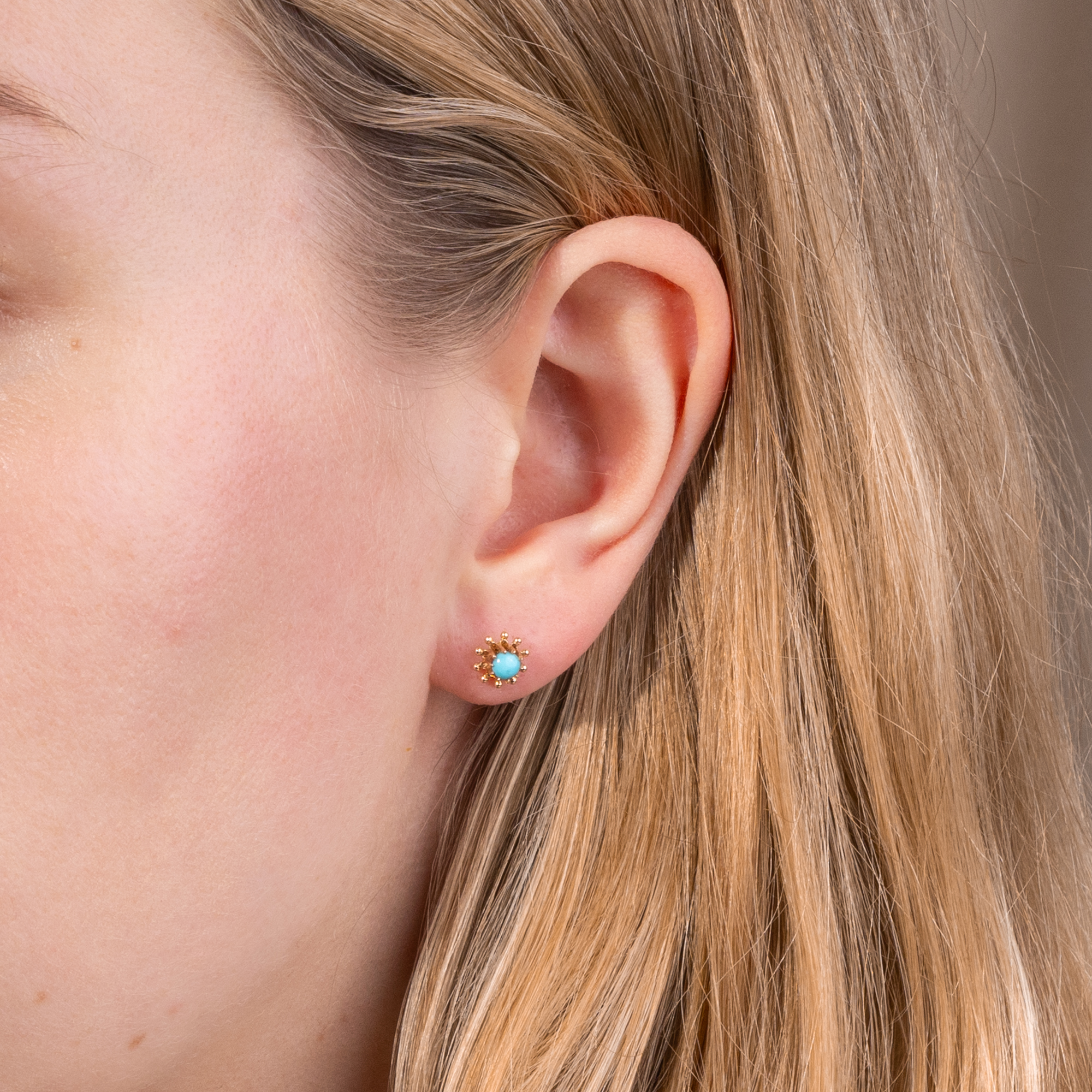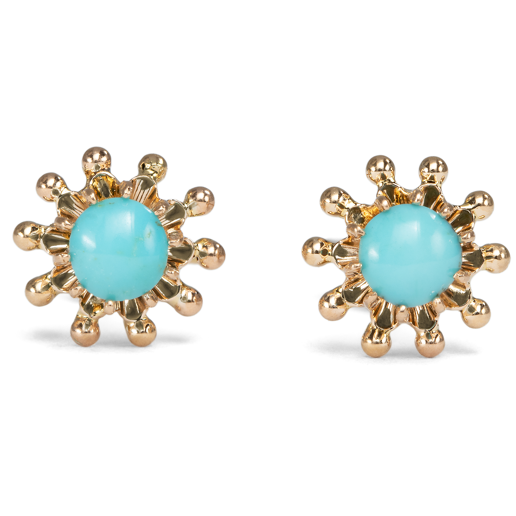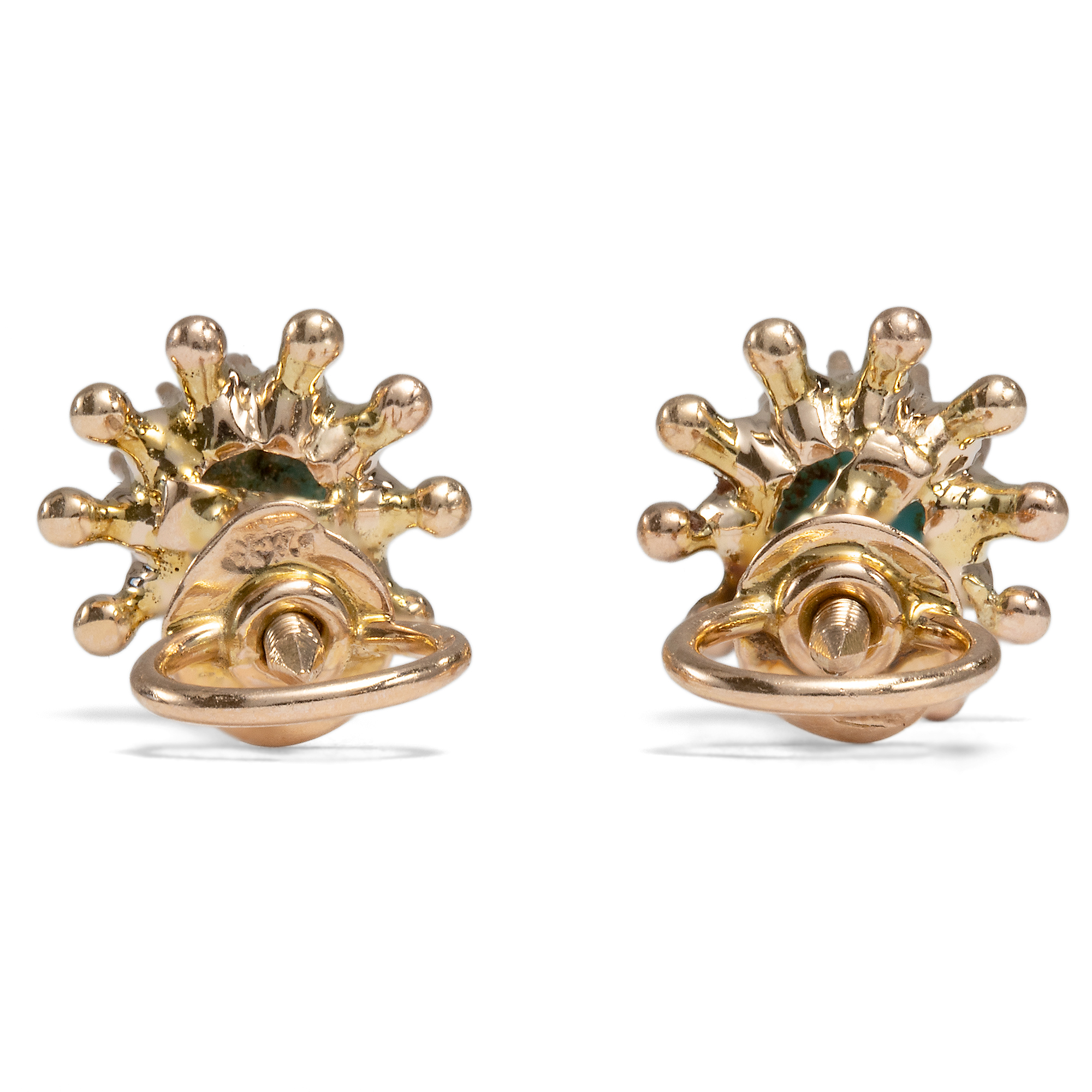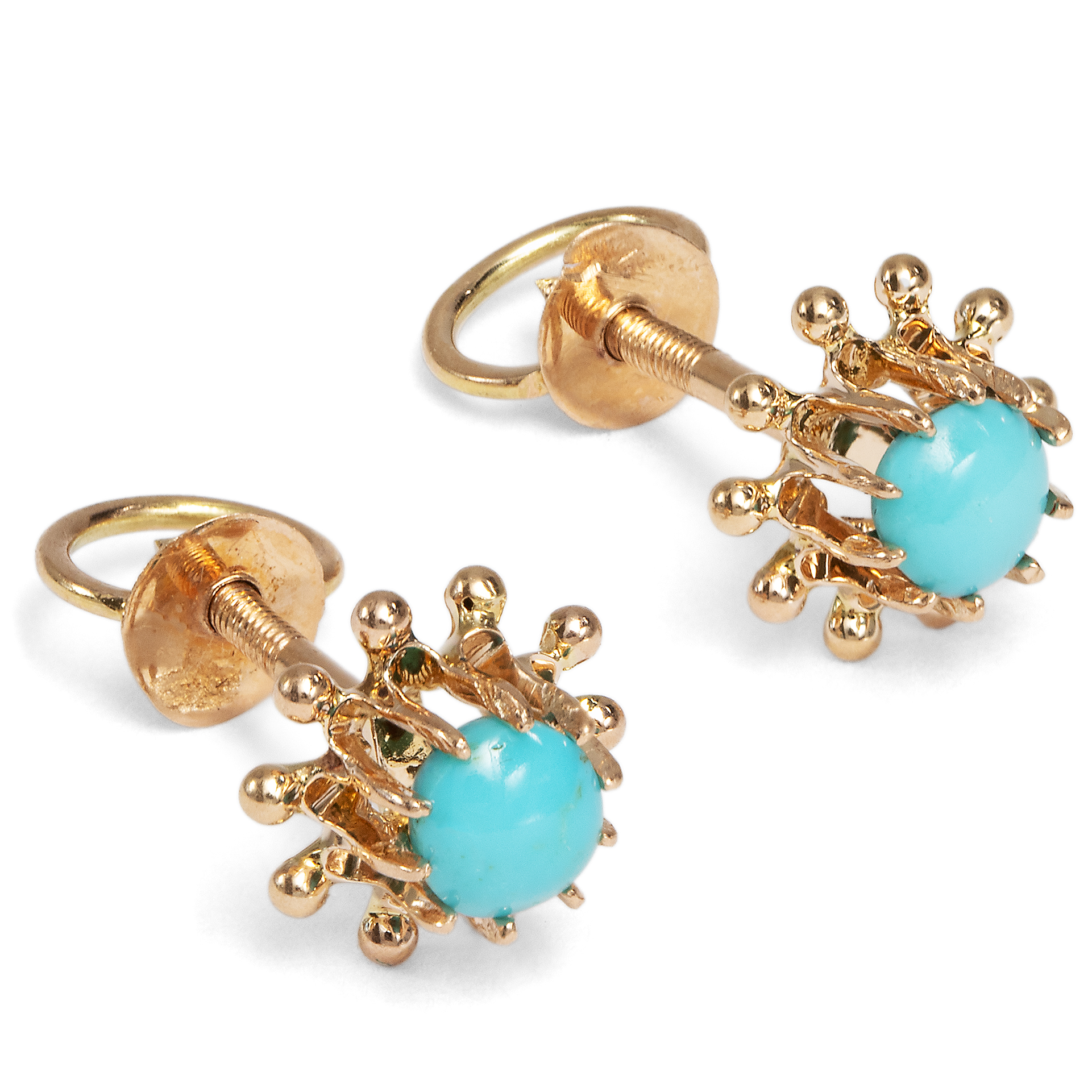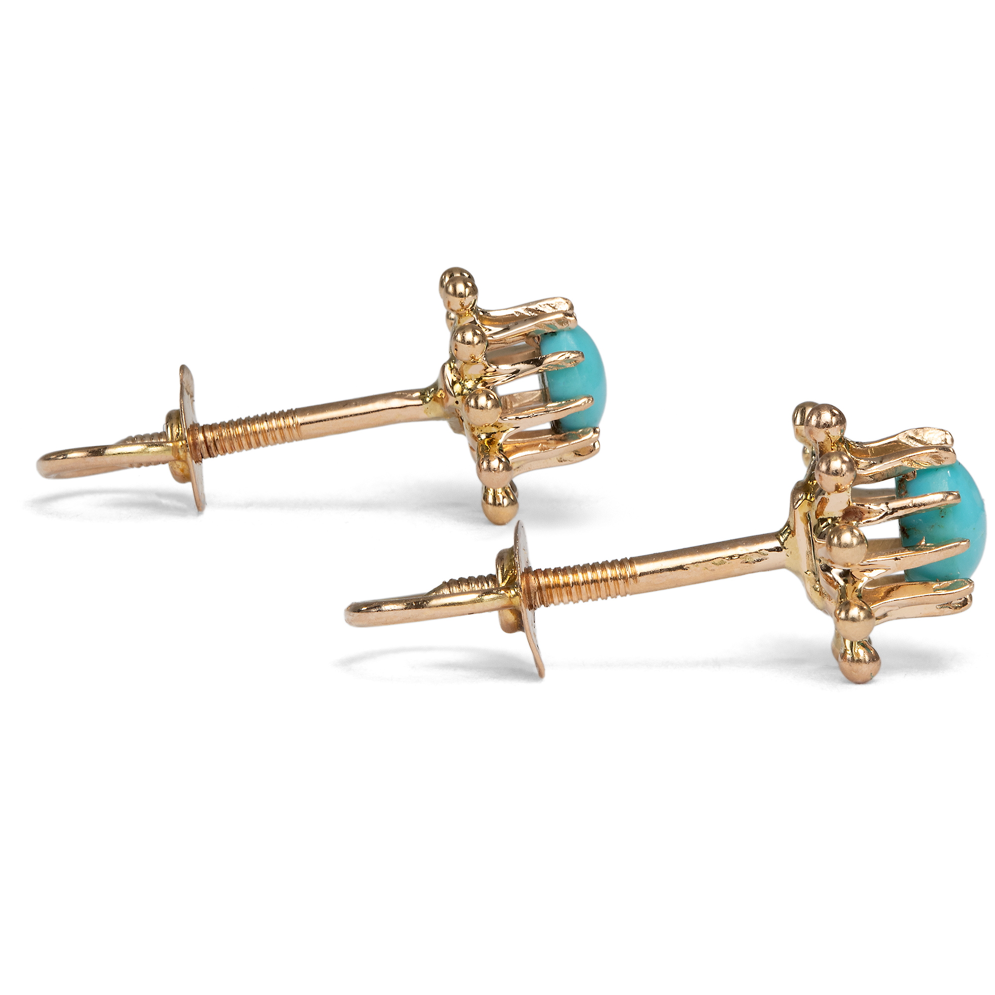Türkise in Schmuckstücken werden oft aufgrund ihrer symbolhaften Farbe eingesetzt, die an die Blüten des Vergissmeinnicht erinnert. In dieser Bedeutung wurden sie gern verschenkt, und sollten so die Trägerin immer an den Überbringer erinnern. Die hier vorliegenden niedlichen Ohrstecker sind in den ersten Jahren des vorigen Jahrhunderts entstanden. In ihrer Mitte halten sie jeweils einen Cabochon aus himmelblauem Türkis. Die hochwertigen und gleichmäßig gewachsenen Edelsteine sind als runde Cabochons gestaltet und leuchten wie ein wolkenloser Sommerhimmel. Gehalten werden die farbigen Steine von einer durchbrochenen blütenförmigen Fassung aus rötlichem Gold. Zeittypische Schraubenmuttern sichern die Stecker vor Verlust. Laut Stempelung wurde der Ohrschmuck in den Jahren zwischen 1902 und 1922 in die österreichische Stadt Linz importiert. Entstanden sind sie möglicherweise in Deutschland. Sie sind sehr gut erhalten und ein bezaubernder kleiner Farbakzent am Ohr.