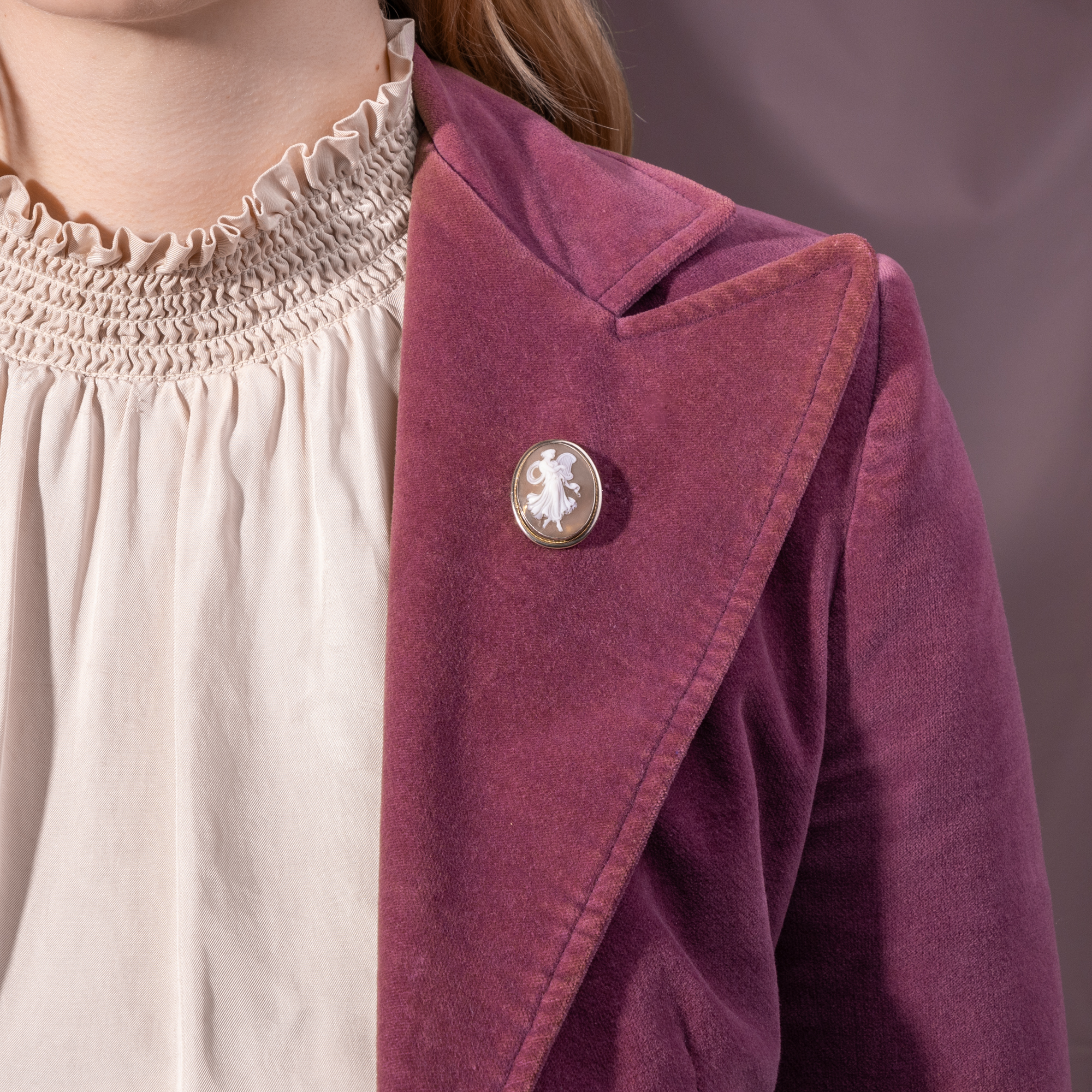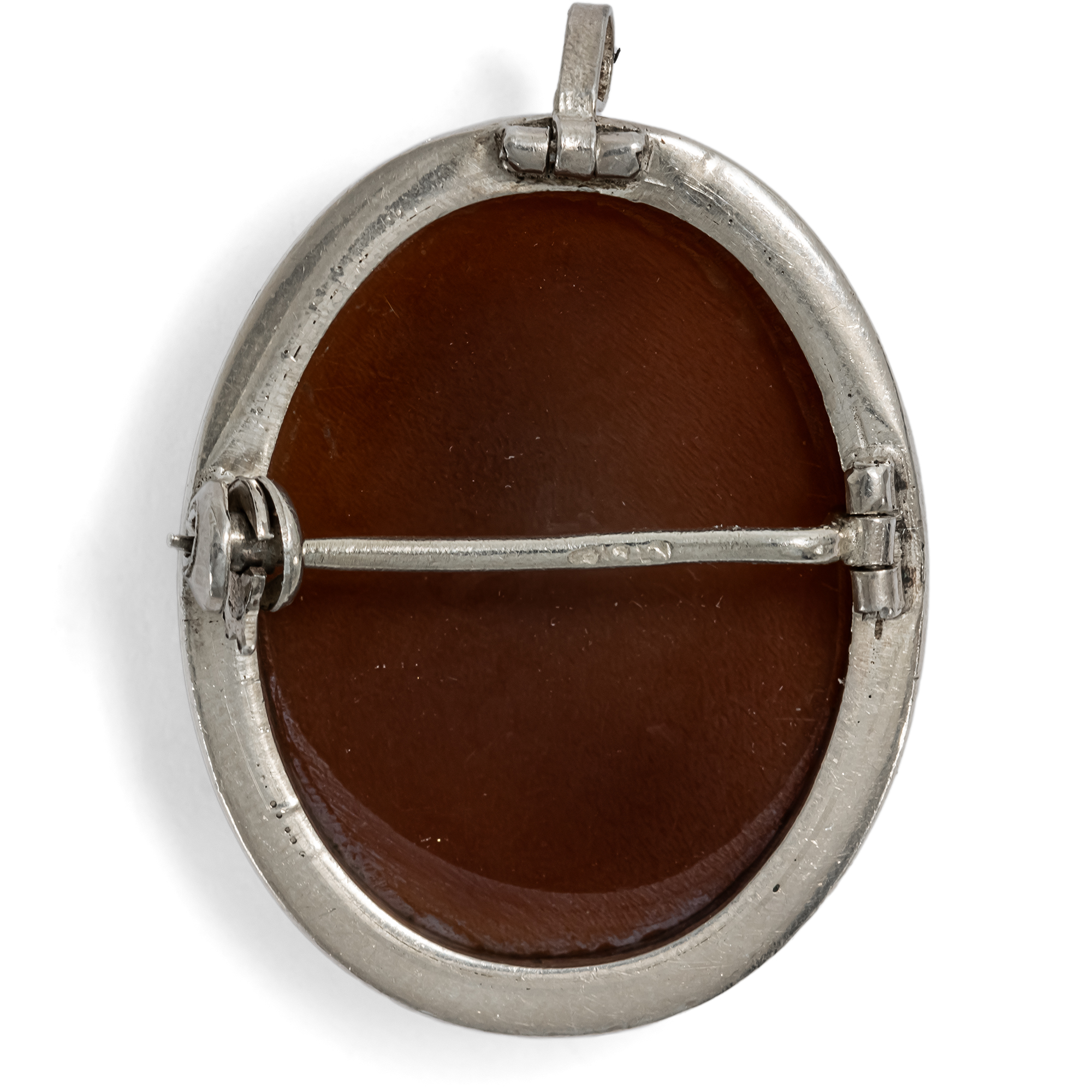 Im 19. Jahrhundert wurde Gemmenschmuck allgegenwärtig. Im Gegensatz zu früheren Epochen, in denen Gemmen vor allem in verschlossenen Kabinetten verwahrt wurden und nur den Sammler erfreuten, waren sie nun dazu gedacht, getragen zu werden – als transportable Kunstwerke, die von allen bewundert werden konnten. Die vorliegende Arbeit aus den Jahren um 1960 steht in dieser Tradition und zeigt eine Figur der klassischen Mythologie: Terpsichore, die jugendliche Muse der Dichtung und des Tanzes. Sie zählt zu den neun kunstreichen Töchtern des Zeus und der Mnemosyne, die einst den Götterhimmel des antiken Griechenlands bevölkerten. Unsere Kamee zeigt sich beim Tanz mit wehendem Gewand und einer Harfe in der Hand. Die Kamee ist mit hoher Wahrscheinlichkeit am Gold von Neapel entstanden. Eine schlichte Fassung aus Silber macht sie sowohl als Brosche als auch als Anhänger tragbar.