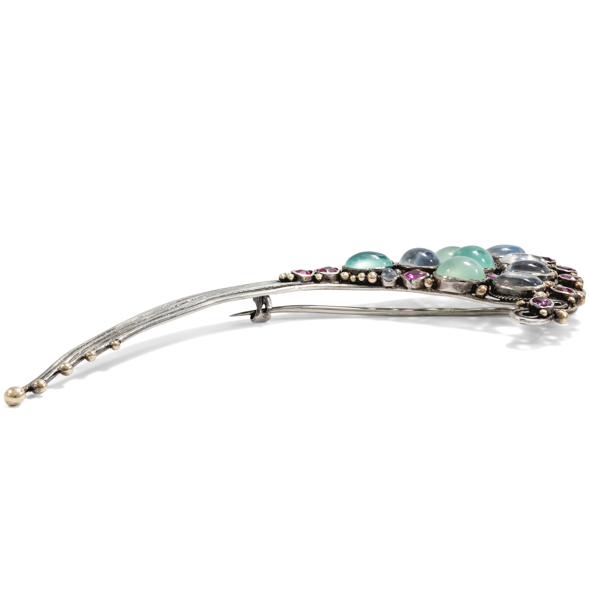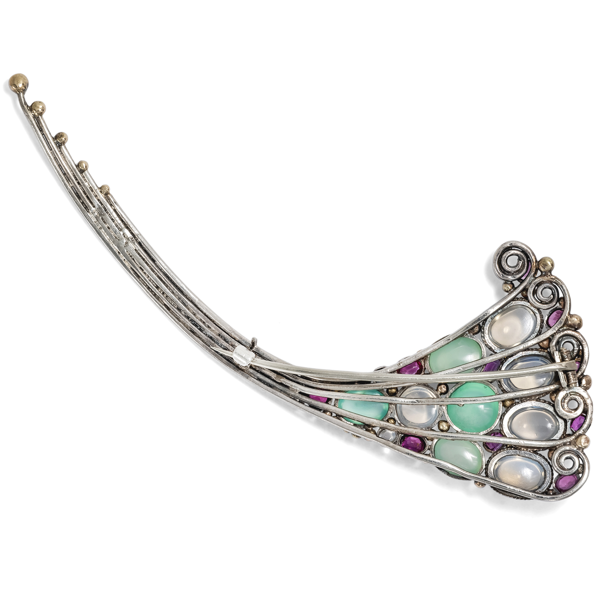 Zu einem Zeitpunkt, an dem die Europäische Schmuckwelt vom strengen Glanz des Art Déco geprägt war, schufen britische Goldschmiedinnen Werke von poetischer Sanftheit, die sich dem allgemeinen Modetrend des Kontinents verweigerten. Ihre Broschen und Ringe scheinen wie aus Licht, Farbe und Rhythmus komponiert, es sind kleine Universen aus Silber, Gold und leuchtenden Steinen. Die hier vorliegende Brosche zeigt exemplarisch jene harmonische Verbindung aus beherrschtem Zufall und gestalterischer Präzision, welche den Schmuck dieser sehr britischen Strömung des späten Arts and Crafts ausmacht. Auf geschwungenen, sich langsam auffächernden Silberdrähten entfaltet sich ein ornamentales Spiel aus bunten Edelsteinen, die das große Schmuckstück wie ein Füllhorn wirken lassen: Natürliche Mondsteine schimmern in weichem Blau, feine Chrysoprase leuchten in frischem Grün, und zwischen ihnen glühen Rubine in warmem Purpur. Interessanterweise finden sich hier Rubine aus verschiedenen Herkunftsorten, einige Steine stammen aus Burma, andere aus Thailand. Möglicherweise sind die Rubine hier bereits in Zweitverwendung eingesetzt. Winzige Goldkügelchen setzen leuchtende Akzente und betonen den Rhythmus der Anordnung. Alles an diesem Schmuckstück ist durchdacht und scheint zugleich natürlich gewachsen; die Asymmetrie der Grundform wird durch die strenge Symmetrie der Farbsteine wie konterkariert, doch ergänzen sich beide Gestaltungsideen. Typisch für die Zeit ist die Verwendung von Cabochons, deren glatte Oberflächen das Licht nicht brechen, sondern sammeln und zurückgeben. Als wir die Brosche in Großbritannien entdeckten, wurde sie als Werk der Londoner Goldschmiedin Sibyl Dunlop (1889–1968) angeboten. Dunlop, die ihre Werkstatt in der Kensington Church Street betrieb, ist berühmt für ihre farbenreichen Entwürfe mit zahlreichen dicht an dicht gesetzten Edelsteinen. Viele Merkmale des Entwurfes teilt die Brosche allerdings auch mit den Werken einer Kollegin von Dunlop, Dorrie Nossiter (1893–1977). Nossiter lebte wie Dunlop in London und beide arbeiteten etwa zur selben Zeit. Leider ist die Brosche nicht signiert, sodass eine eindeutige Zuschreibung nicht ganz einfach ist. Auf Grund der stilistischen Nähe zum Werk der beiden Frauen ist es auf jeden Fall aber sicher, dass auch diese Brosche in London und in den 1920er oder 1930er Jahren entstanden ist. Entdeckt haben wir das Schmuckstück in London.