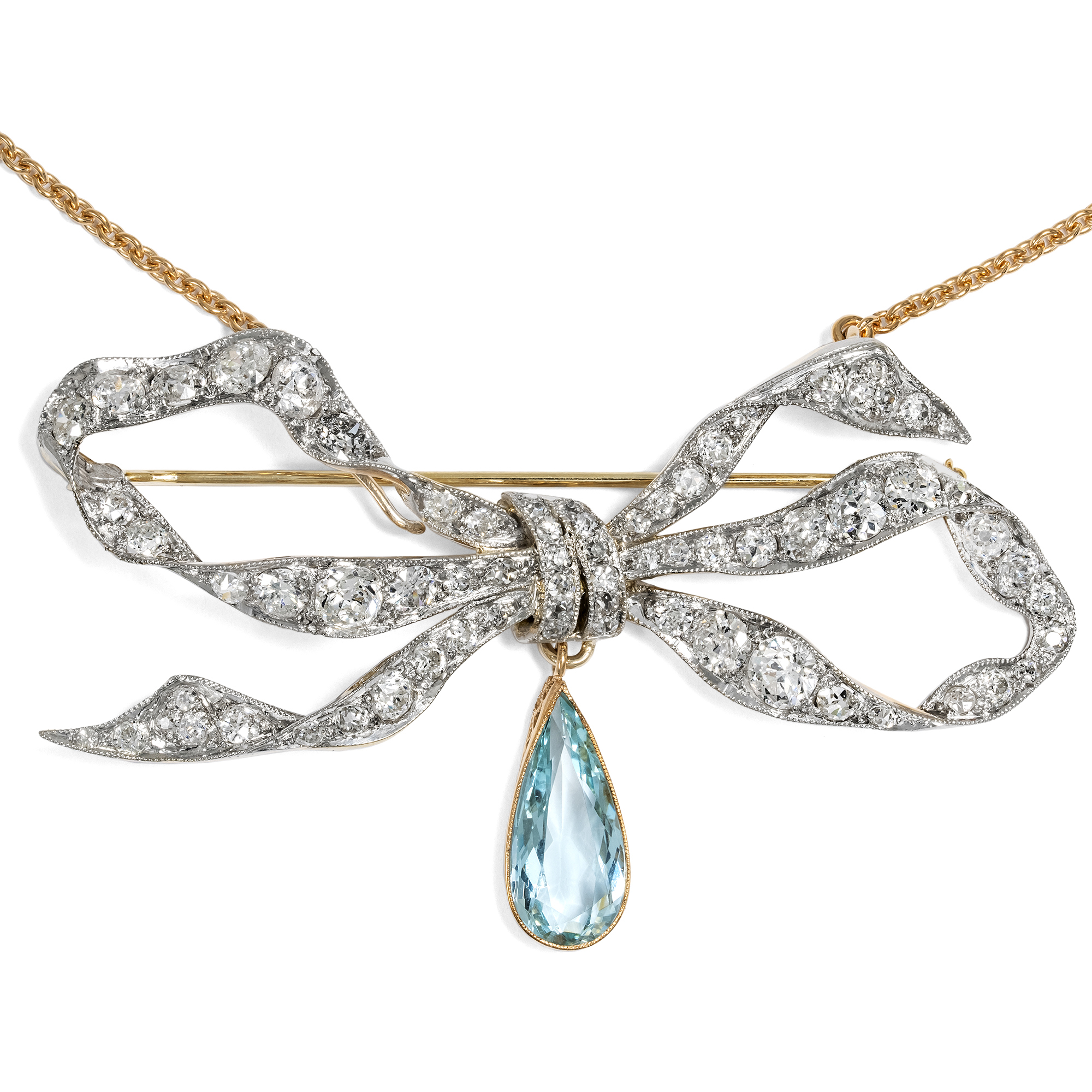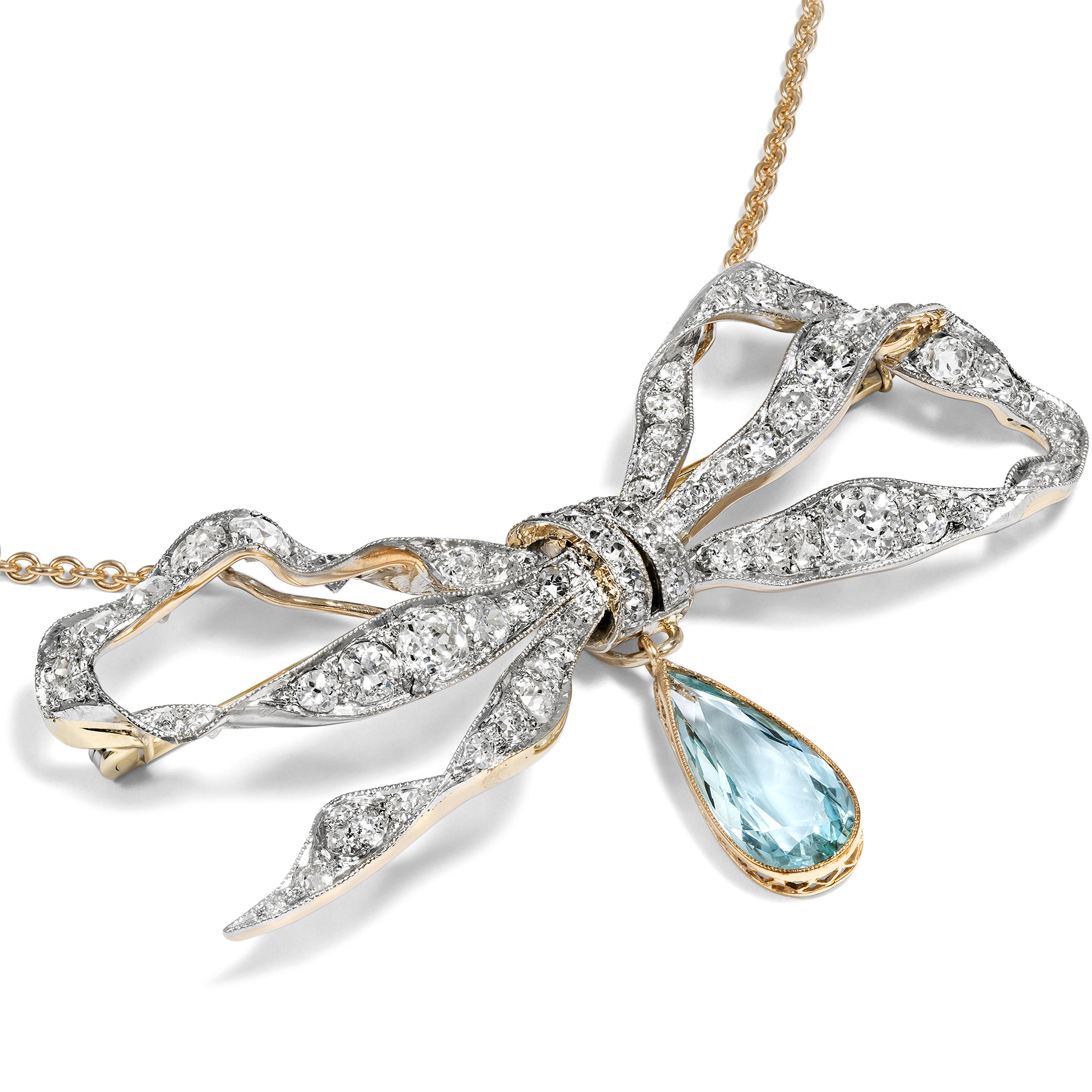 Kostbare Schleife aus Diamanten & Aquamarin als Brosche & Collier, um 1910