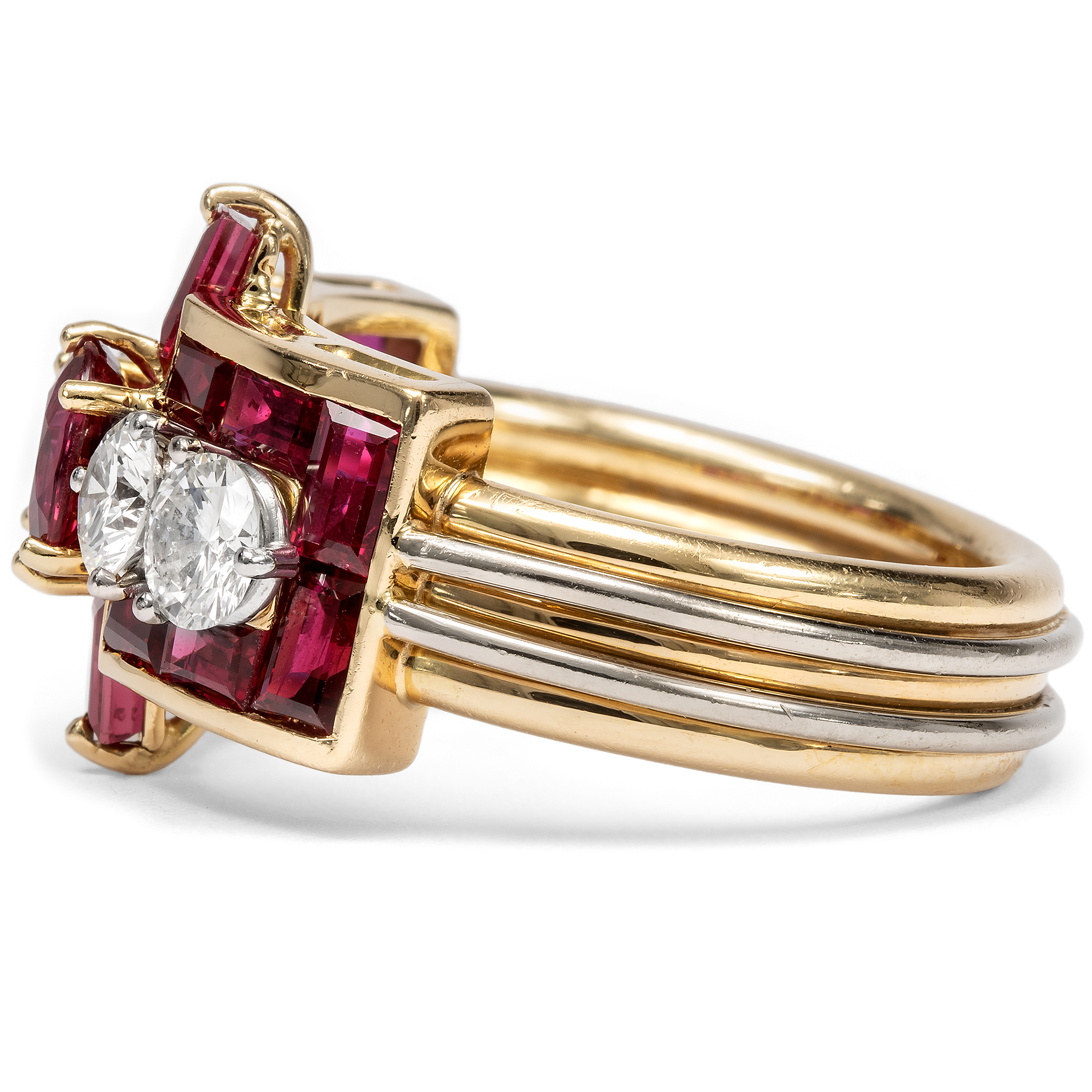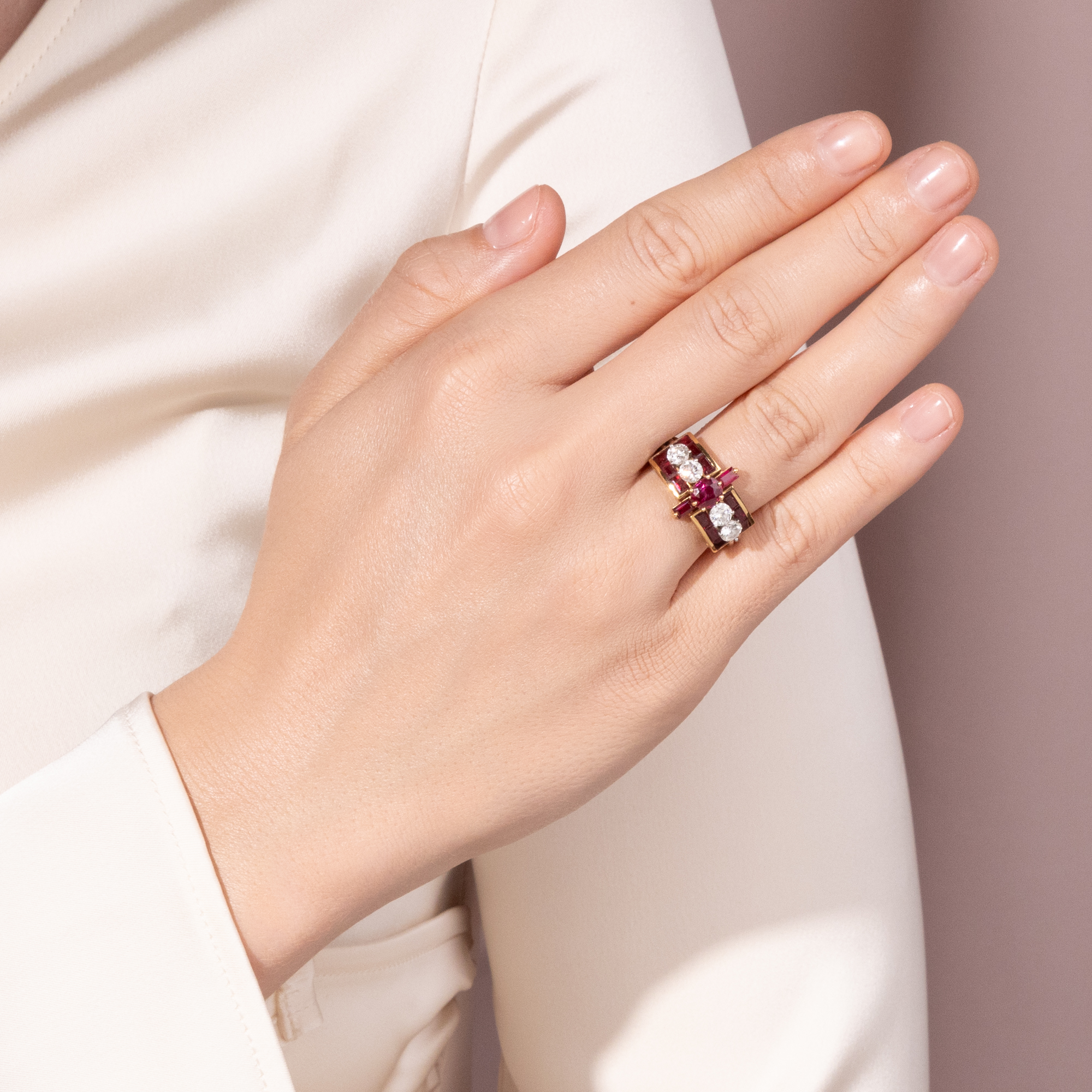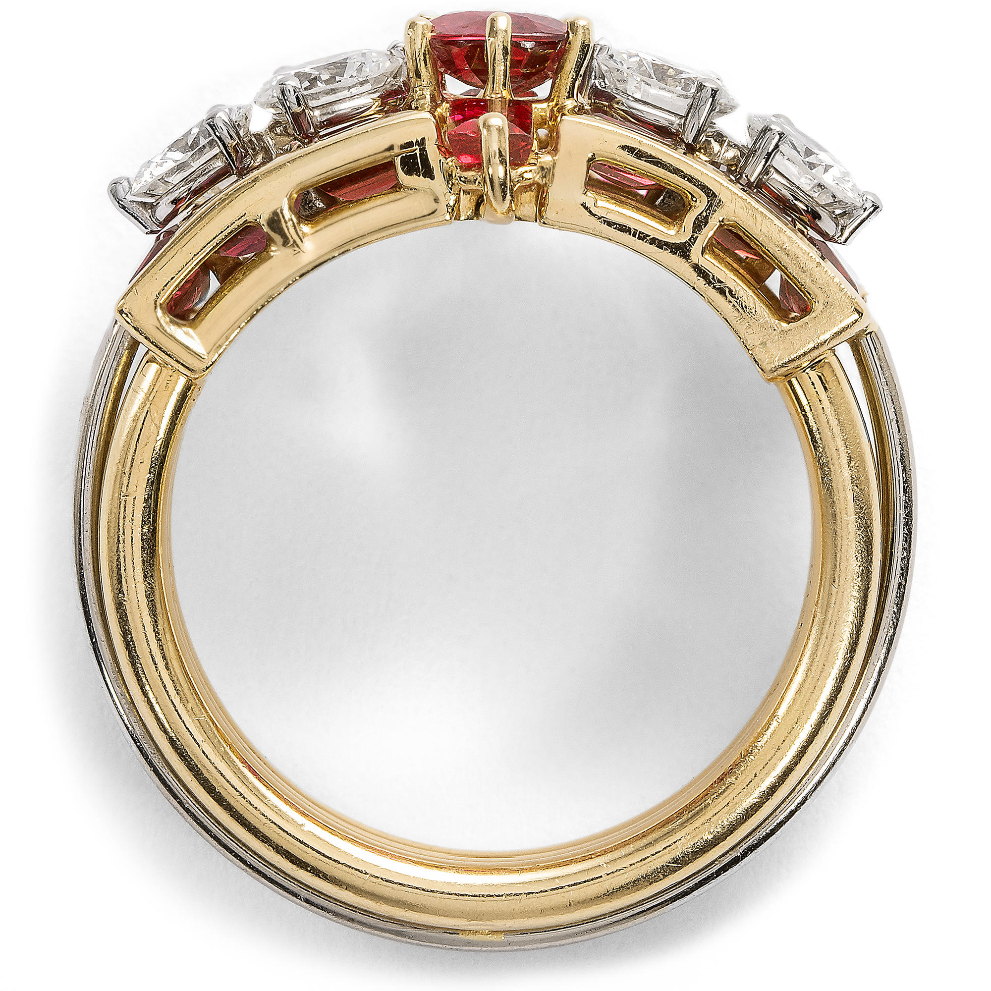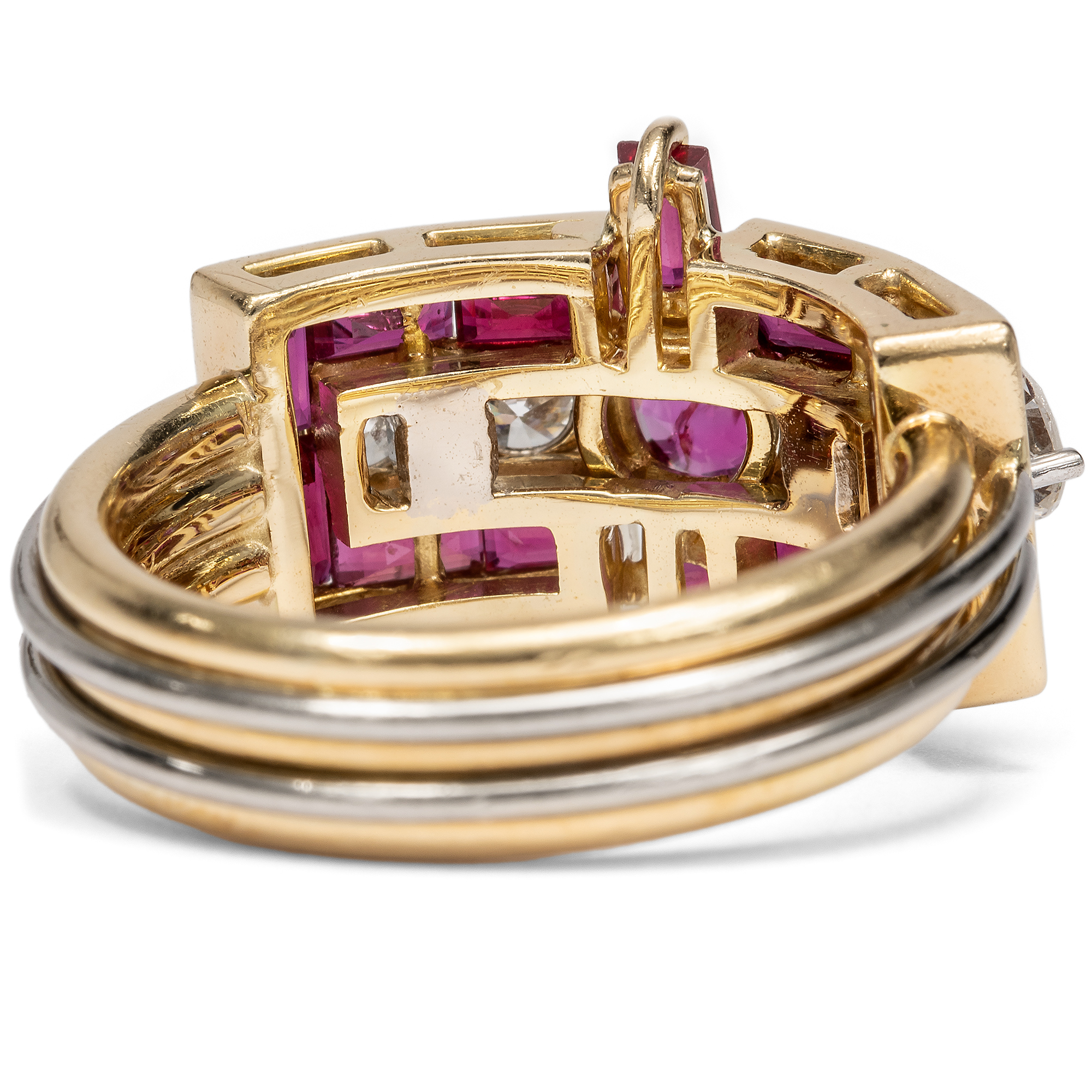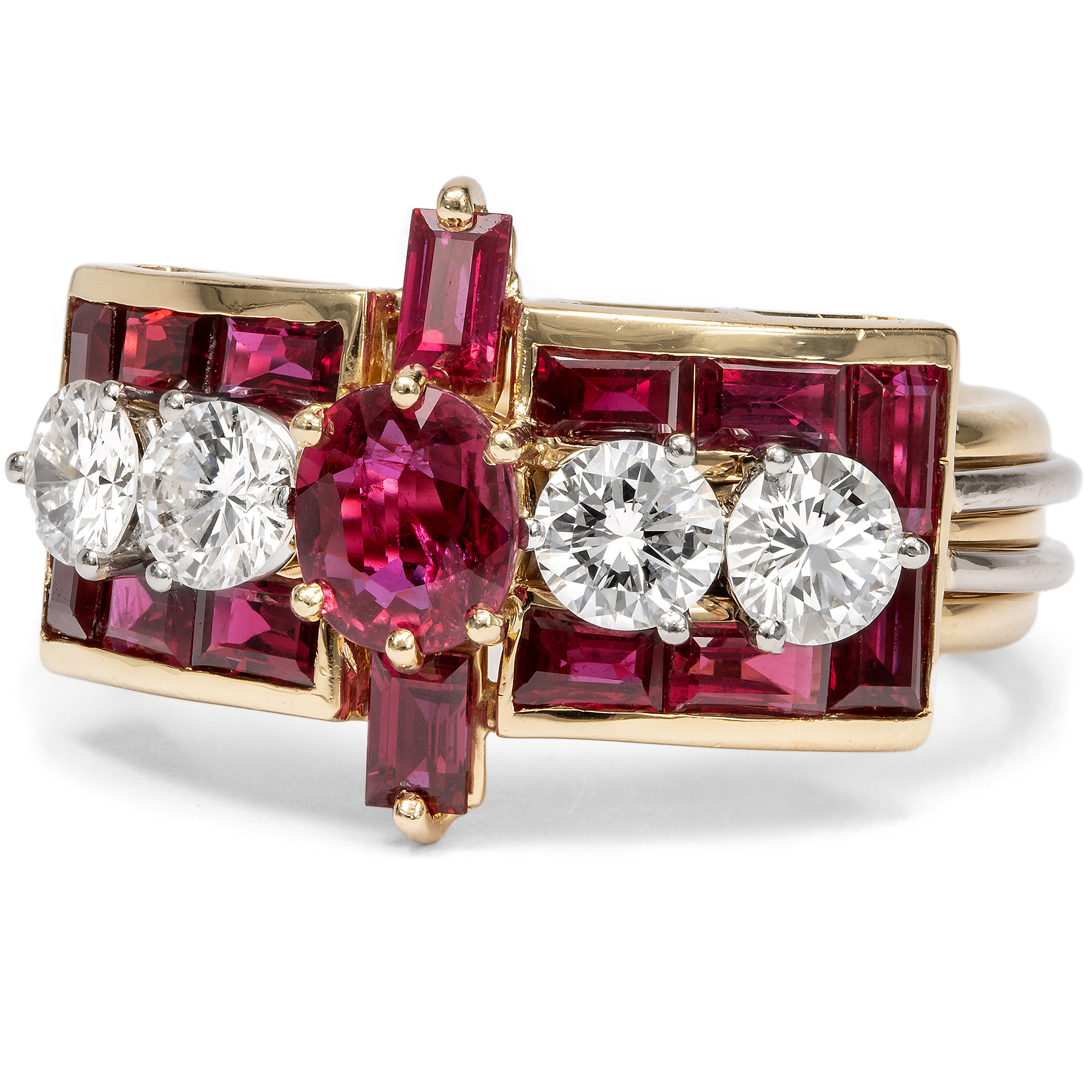 Vintage Schmuckstücke aus den 1980er Jahren erleben derzeit eine große Renaissance. Die 80er waren, was Mode betrifft, eine Epoche voller Ausdruckskraft und Eleganz. Man denkt an schwarz-weiße Blazer mit breiten Schulterpolstern, an aufwändige Dauerwellen, rote Lippen und auffälligen Schmuck, der Blicke auf sich zog. Doch diese spannende Zeit des Wohlstands brachte nicht nur Modeschmuck hervor, sondern auch Juwelenstücke, die das Lebensgefühl jener Jahre eingefangen und bewahrt haben. Dieser Ring ist ein solches Stück. Er hebt sich in der Qualität seiner Materialien wie auch in der handwerklichen Ausführung deutlich von vielen zeitgleichen Arbeiten ab. Sein Entwurf ist selbstbewusst und lebt von der Spannung der Edelsteine. Im Zentrum sitzt ein natürlicher Rubin, der von vier erstklassigen Brillanten flankiert wird. Das weiße Licht der Diamanten entfaltet dabei eine besondere Brillanz, da der Goldschmied einen kunstvollen Kniff angewandt hat: Ihre nahezu unsichtbaren Krappen aus Weißgold lassen die Steine scheinbar schwerelos schweben. Bänder aus exakt eingeschliffenen Rubinen sind in den Ringkopf eingelassen und bilden eine dunkelrote, funkelnde Fläche, die wie eine Bühne wirkt. In ihrer Mitte durchbrechen zwei leicht ausgestellt gefasste Rubine die strenge Geometrie und verleihen dem Ring eine lebendige Dynamik. So entsteht ein Schmuckstück voller Eleganz und Spannung, ein echtes Juwel der 1980er Jahre, das den Glamour dieser Zeit noch heute spürbar macht. Wir haben ein Gutachten zum Ring erstellen lassen, das die Qualität seiner Materialien bestätigt hat. Zu uns kam er hier in Berlin.