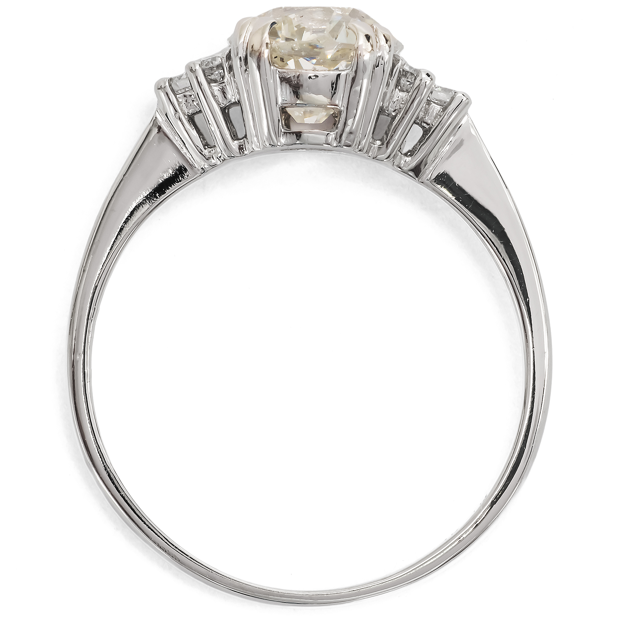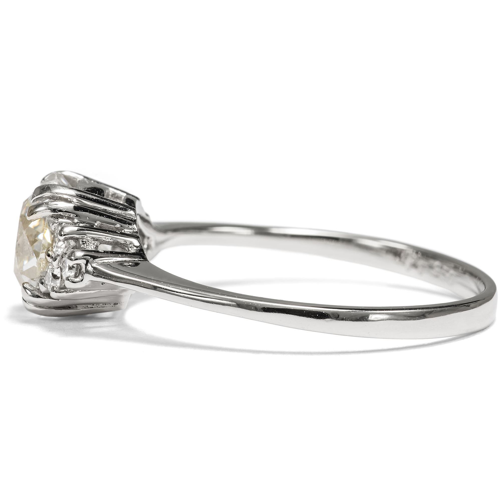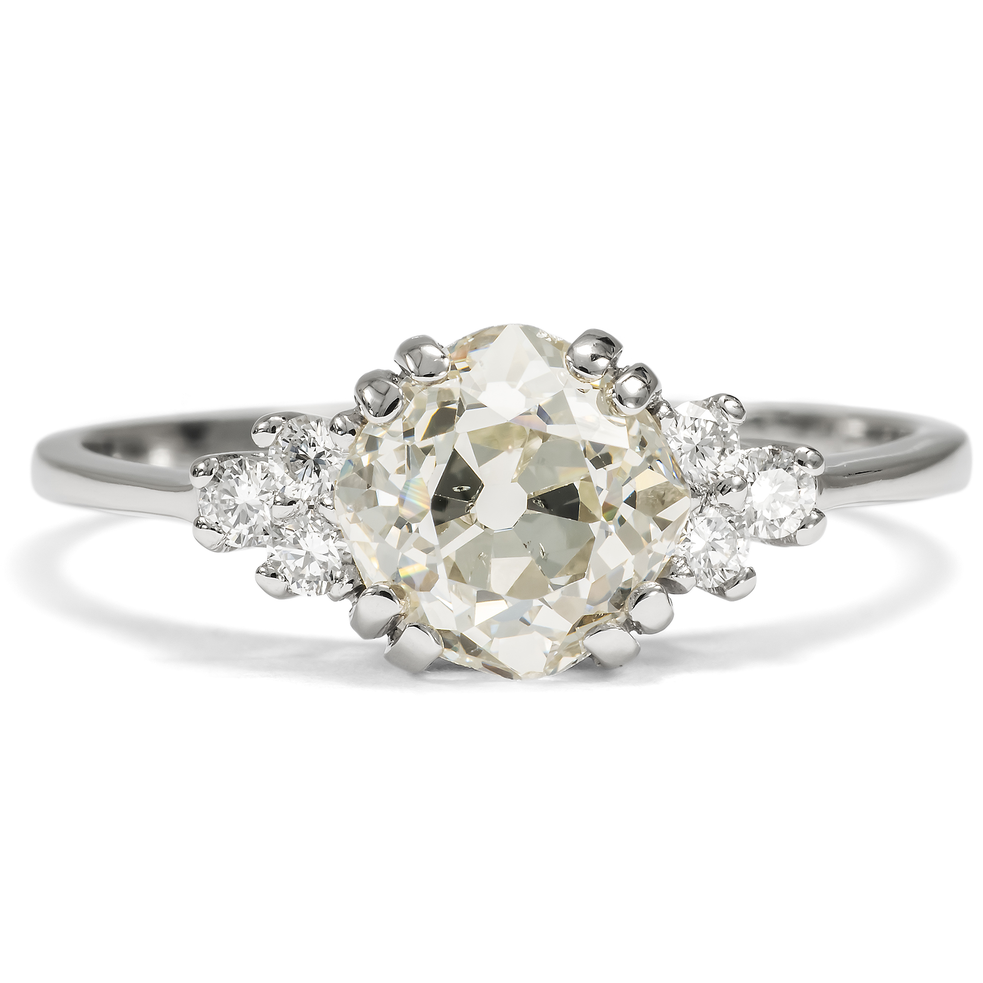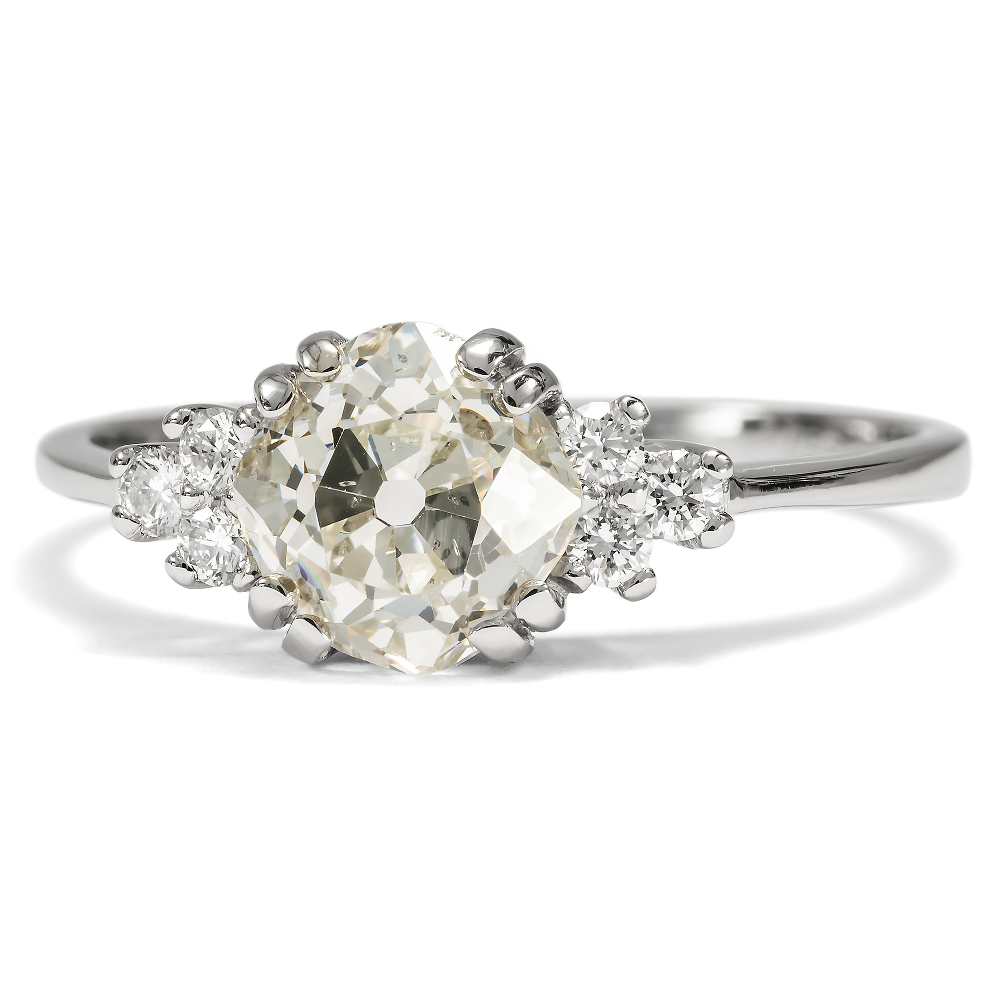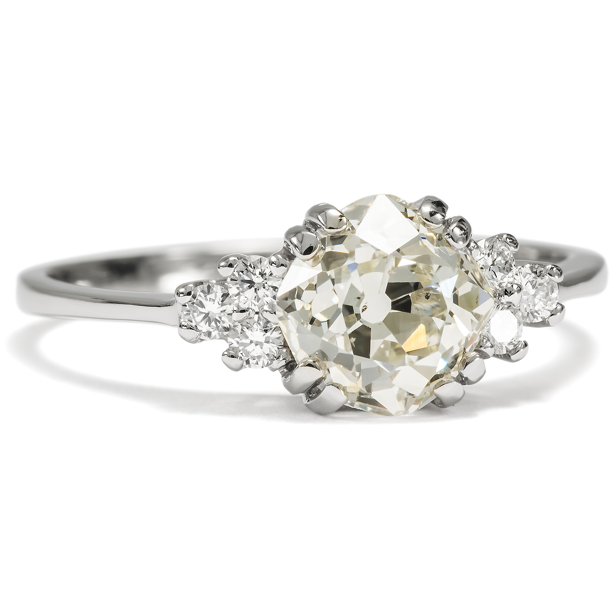 Diamanten werden heute beinahe nur im Brillantschliff geschliffen. Der Schliff ist standardisiert und – leider – mitunter ein wenig leblos. Wie viel interessanter ist da doch ein individueller Schliff, der den Stein zu etwas Einzigartigem macht? In dem vorliegenden Ring sehen wir einen Diamanten in einem besonderen Schliff. Der Stein ist kissenförmig facettiert, es handelt sich um einen sog. „Old Mine Cut“. Er ist leicht warm getönt (in der Farbstufe „J“) und wurde als SI2 graduiert. Er trägt also kleine Einschlüsse in sich; dabei handelt es sich um kleine Kohlenstoffeinschlüsse seitlich der Tafel. Diese sind jedoch sehr unauffällig und mindern die Brillanz des Steines kaum. Links und rechts begleiten den Mittelstein je drei kleinere Brillanten. Die Steine sind zu je einem Dreieck arrangiert und leiten zur zarten Ringschiene über. Alle Diamanten werden dabei von zarten Krappen aus Platin gehalten, die sich in ihrer weißen Farbigkeit ganz zurücknehmen und den brillierenden Steinen den Vortritt lassen. Wir haben den qualitätvollen Diamanten in Paris entdeckt und hier in Berlin neu fassen lassen. Dabei haben wir für die Fassung recyceltes Platin verwendet und für die kleineren Diamanten rechts und links Vintage-Brillanten aus anderen Schmuckstücken eingesetzt.