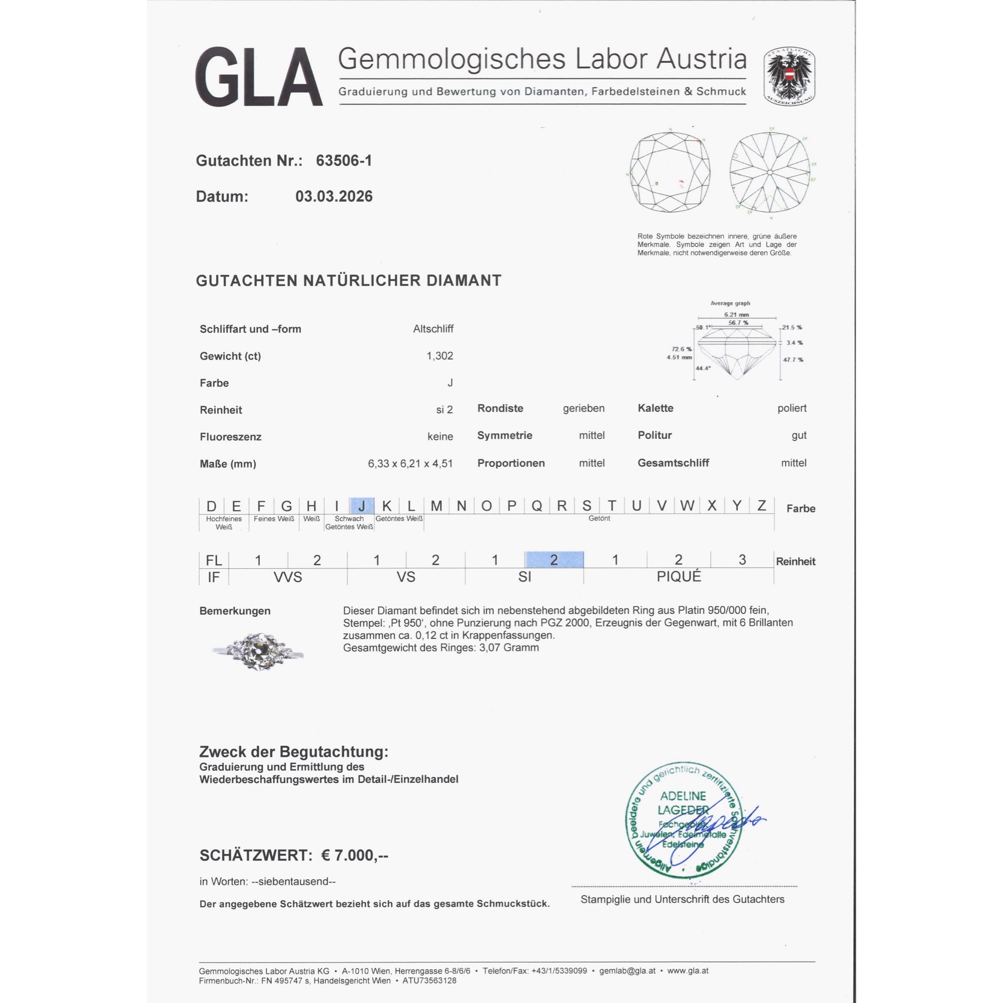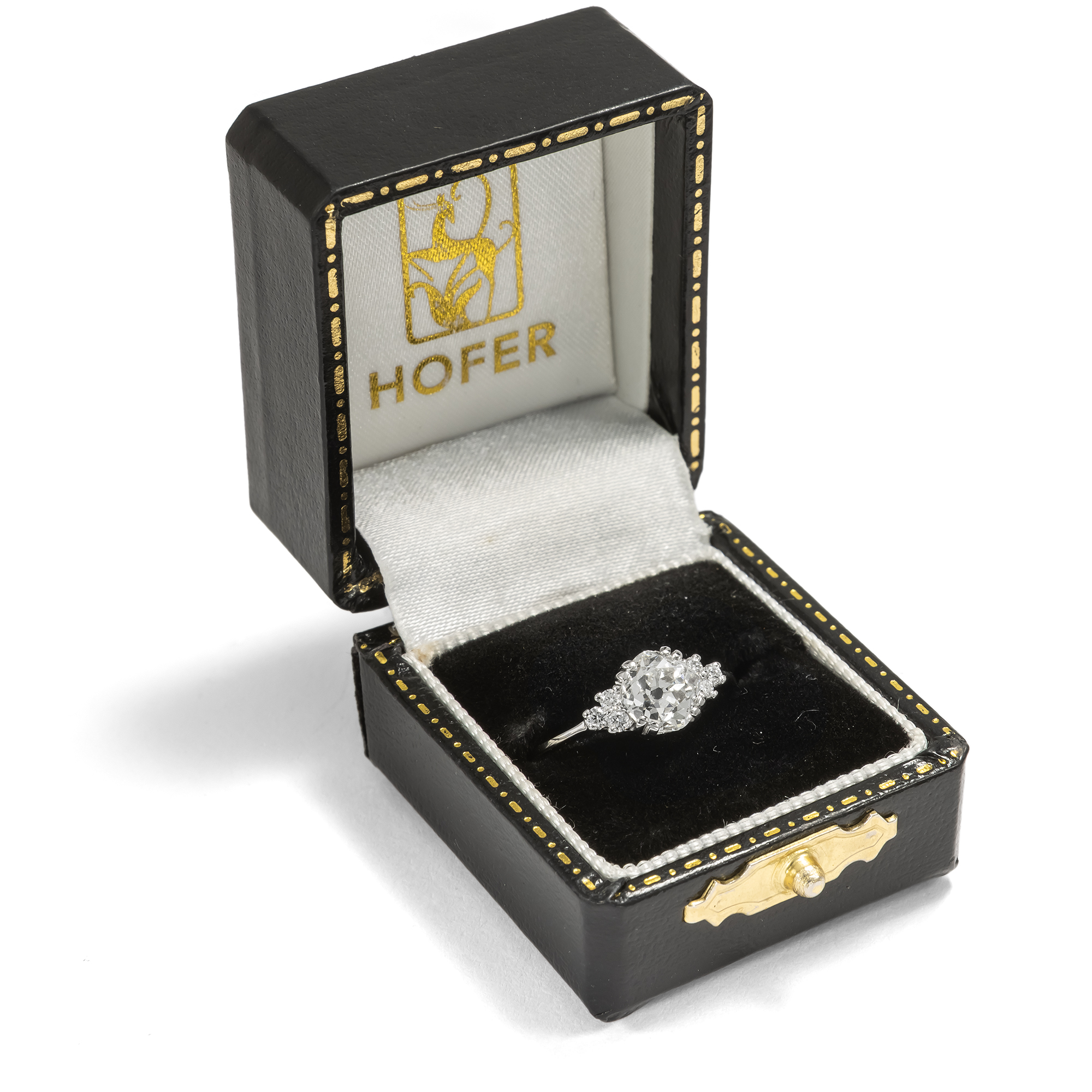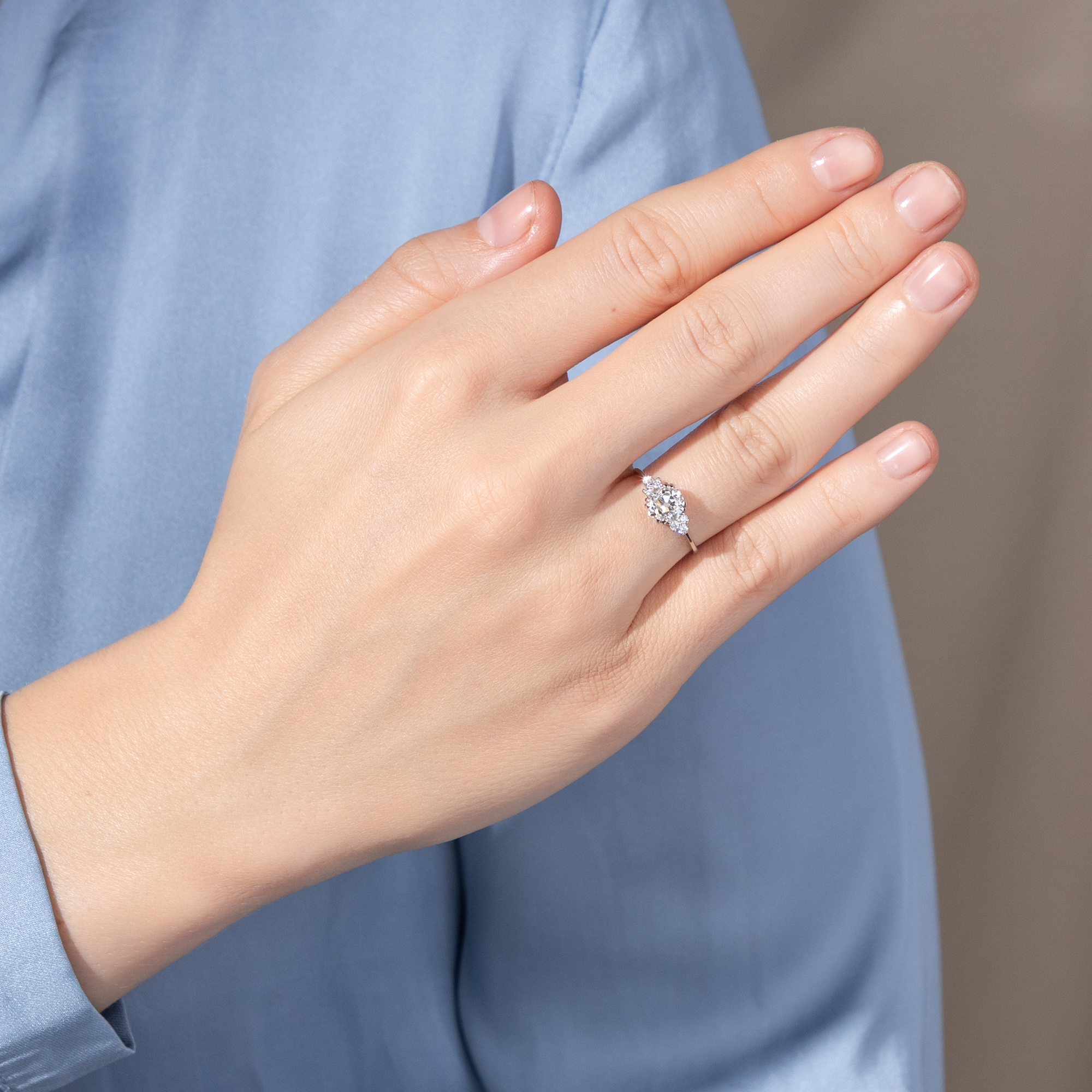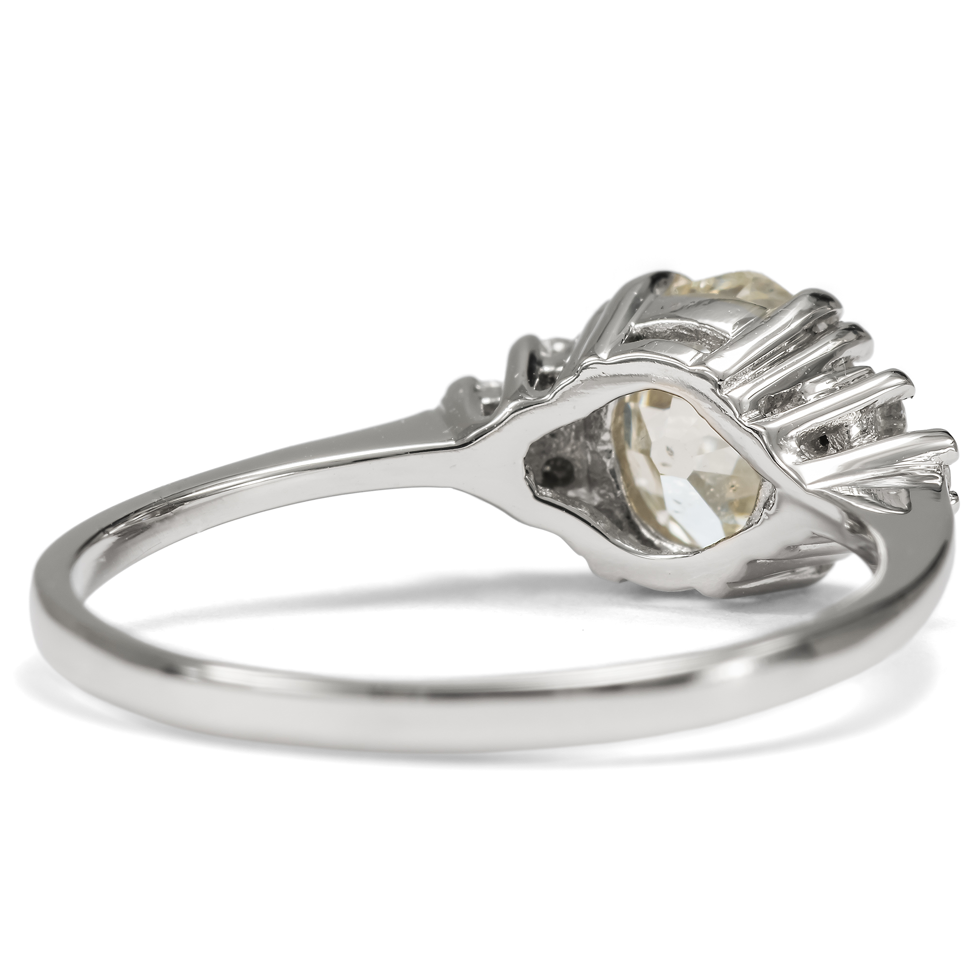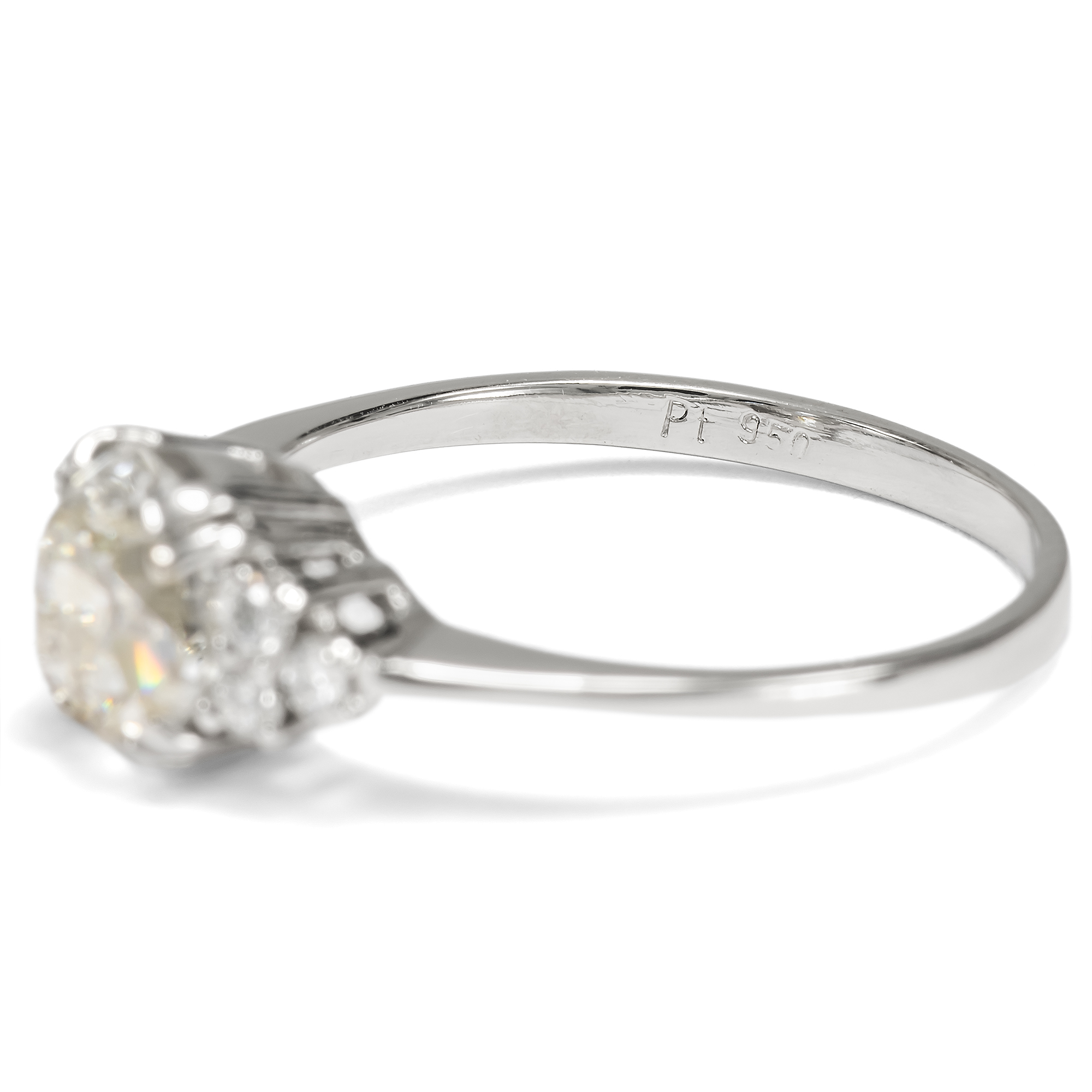 Diamanten werden heute beinahe nur im Brillantschliff geschliffen. Der Schliff ist standardisiert und – leider – mitunter ein wenig leblos. Wie viel interessanter ist da doch ein individueller Schliff, der den Stein zu etwas Einzigartigem macht? In dem vorliegenden Ring sehen wir einen Diamanten in einem besonderen Schliff. Der Stein ist kissenförmig facettiert, es handelt sich um einen sog. „Old Mine Cut“. Er ist leicht warm getönt (in der Farbstufe „J“) und wurde als SI2 graduiert. Er trägt also kleine Einschlüsse in sich; dabei handelt es sich um kleine Kohlenstoffeinschlüsse seitlich der Tafel. Diese sind jedoch sehr unauffällig und mindern die Brillanz des Steines kaum. Links und rechts begleiten den Mittelstein je drei kleinere Brillanten. Die Steine sind zu je einem Dreieck arrangiert und leiten zur zarten Ringschiene über. Alle Diamanten werden dabei von zarten Krappen aus Platin gehalten, die sich in ihrer weißen Farbigkeit ganz zurücknehmen und den brillierenden Steinen den Vortritt lassen. Wir haben den qualitätvollen Diamanten in Paris entdeckt und hier in Berlin neu fassen lassen. Dabei haben wir für die Fassung recyceltes Platin verwendet und für die kleineren Diamanten rechts und links Vintage-Brillanten aus anderen Schmuckstücken eingesetzt.