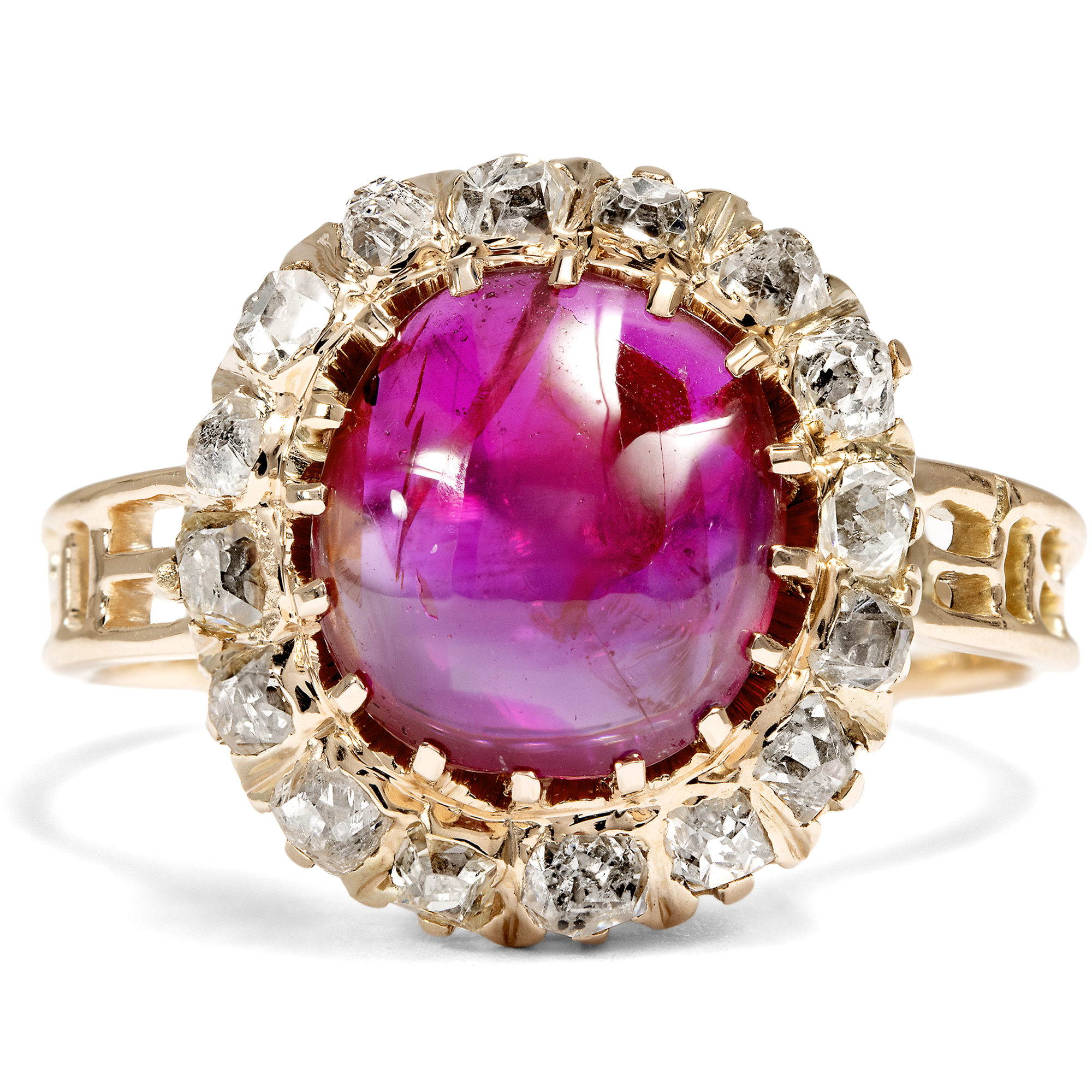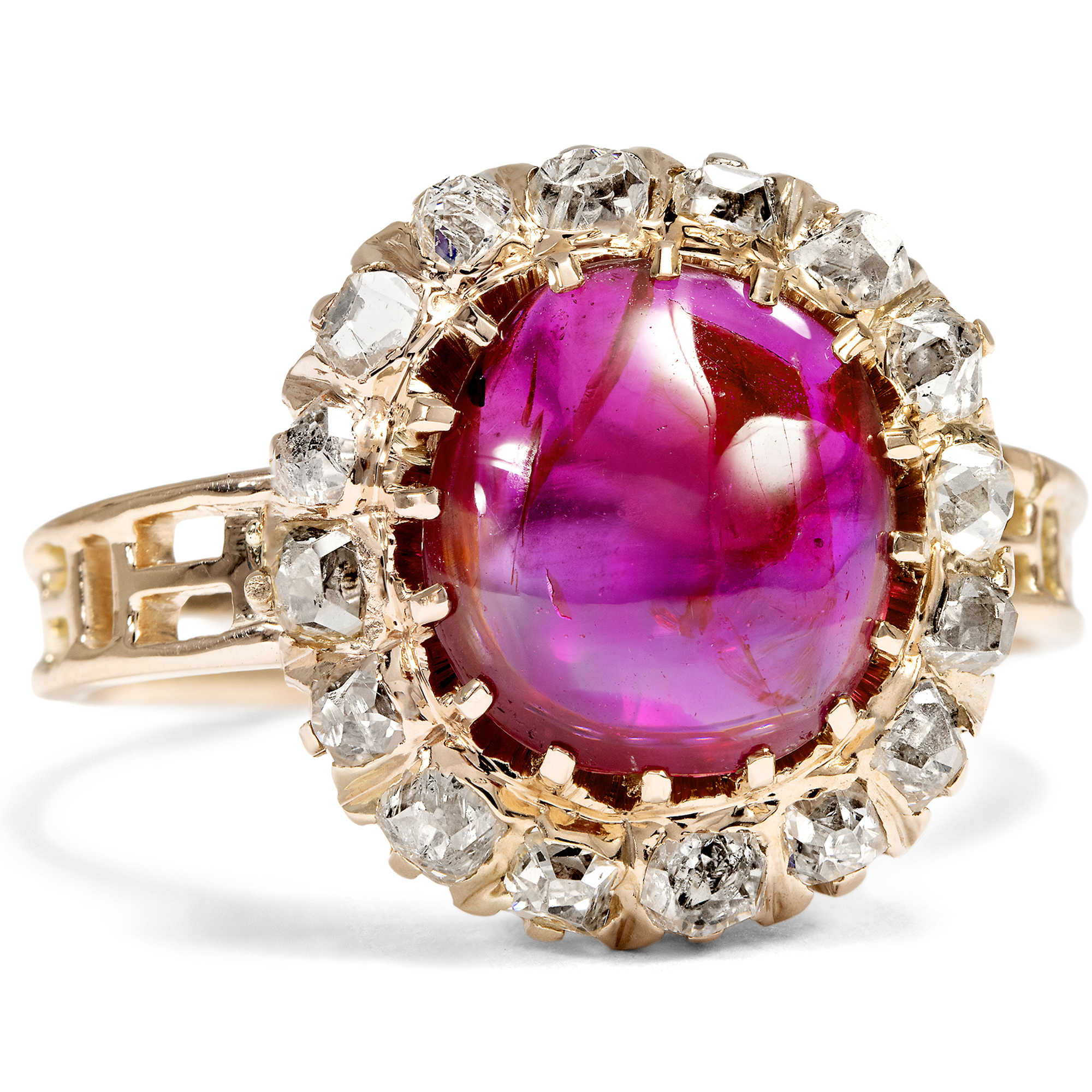 Hier leuchtet intensiv purpurrot ein feiner Rubin aus der legendärsten Fundstätte der Welt. Der 3,21 Karat schwere Stein stammt aus Burma, aus der Provinz Mogok, und verdankt seine intensive Farbe allein der Natur. Bei der gemmologischen Untersuchung konnte außer einer leichten Ölung keine Behandlung festgestellt werden, keine Erhitzung oder sonstige Veränderung durch den Menschen. Allein der kunstvolle Schliff des Edelsteins, ein Cabochonschliff, intensiviert seine Farbe durch gezielte Lichtkonzentration. Besonders hervorzuheben ist das spannende Einschlussbild des Steins, das die Lokalisierung nach Mogok möglich macht. Getragen am Finger sieht man sie kaum, in der Durchleuchtung werden kleine dunkle Felder sichtbar und seidige Partien. Diese feinen Einschlüsse entstehen durch das Mineral Rutil – eine typische Erscheinung bei hochwertigen Burmarubinen – und verleihen dem Rubin je nach Lichteinfall einen charakteristischen, seidigen Glanz. Zwei gemmologische Gutachten bestätigen die Herkunft und Qualität des Steins. Umgeben ist der Rubin von sechzehn Diamanten mit einem Gesamtgewicht von ca. 0,80 Karat, die in zarte, offene Fassungen gesetzt wurden. Es handelt sich um seltene, antike Diamantschliffe, die vermutlich einige Generationen älter sind als der Ring selbst. Die Ringschiene besteht aus rötlichem Gold und datiert auf die letzten Jahrzehnte des 19. Jahrhunderts. Der Ring ist ein echtes Juwel und ein zeitloses Liebesgeschenk mit einem wunderbaren Burma-Rubin. Er fand seinen Weg aus der Schweiz zu uns.