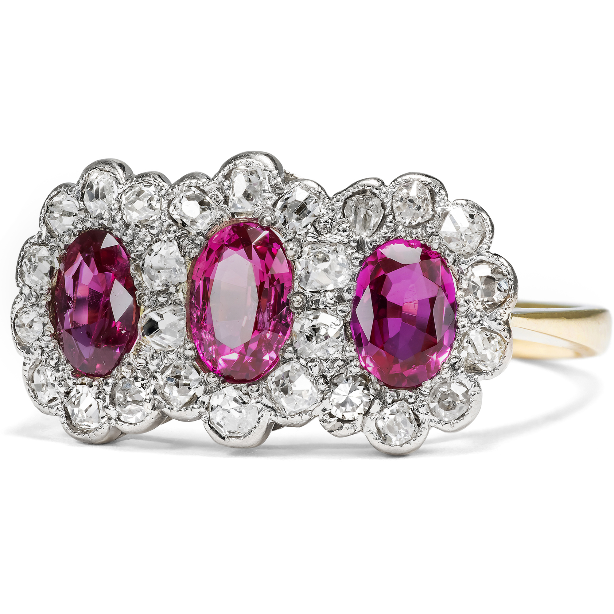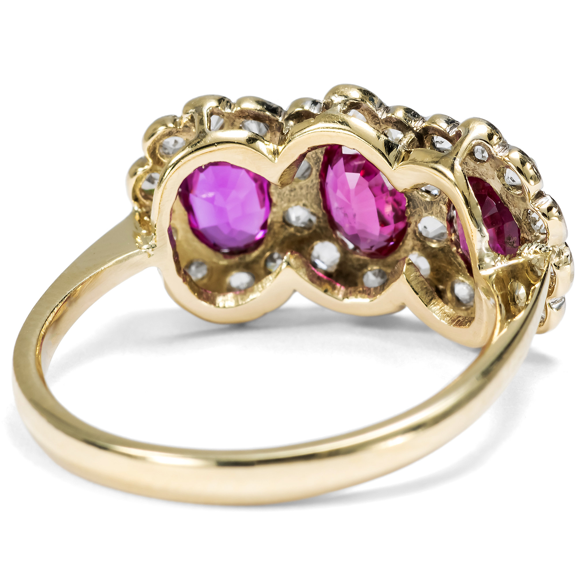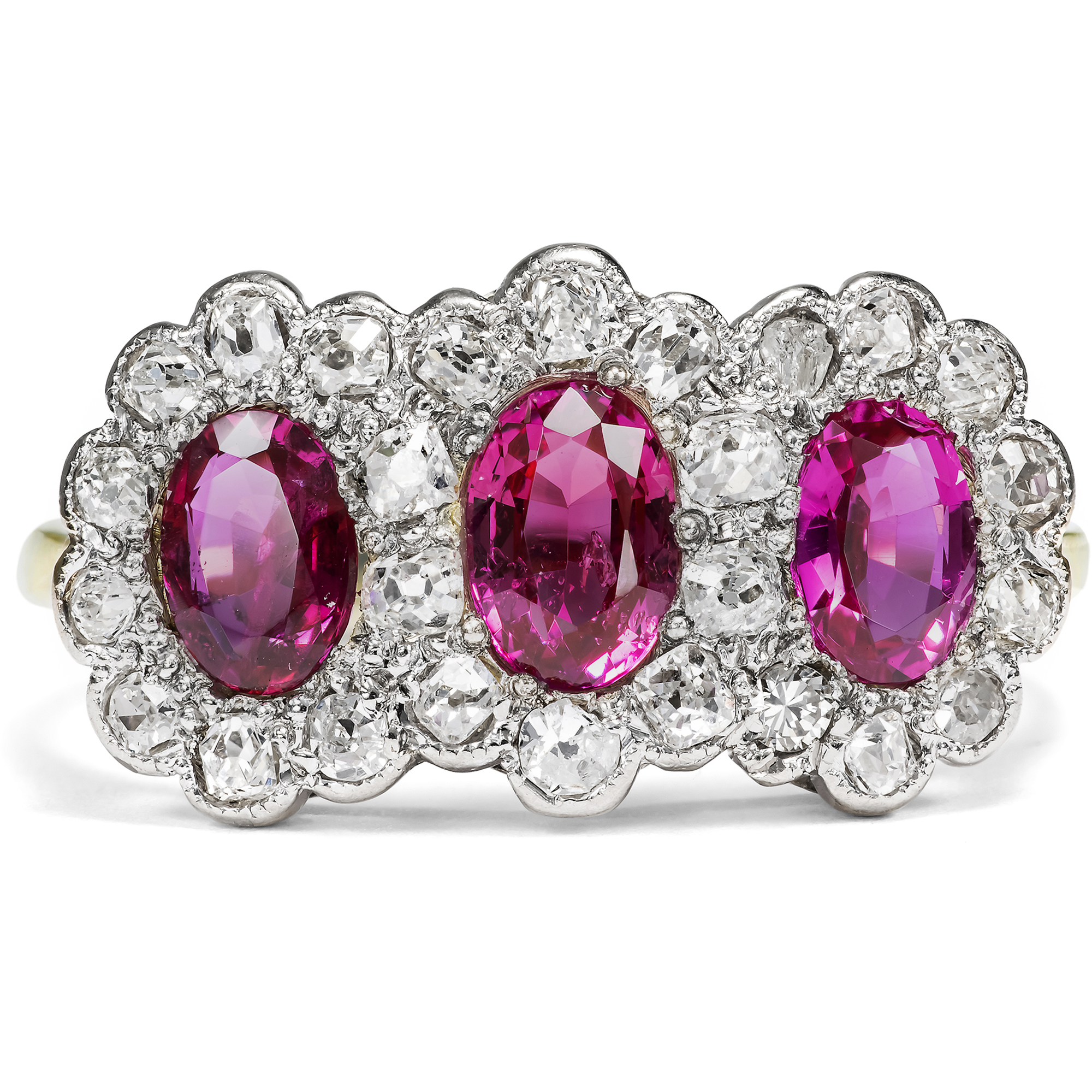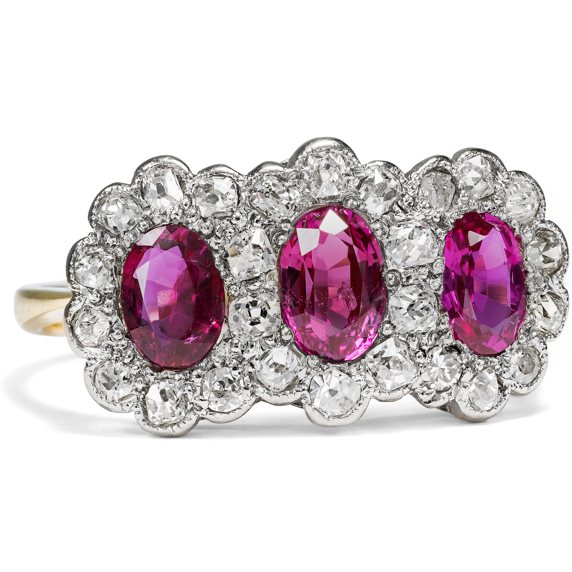 Hier leuchten intensiv purpurrot drei feine Rubine aus der legendärsten Fundstätte der Welt. Die zusammen 1,63 Karat schweren Steine stammen aus Burma, aus der Provinz Mogok, und verdanken ihre intensive Farbe allein der Natur. Bei der gemmologischen Untersuchung konnte keine Behandlung festgestellt werden, keine Erhitzung oder sonstige Veränderung durch den Menschen. Allein der kunstvolle Schliff der Edelsteine, ein ovaler Facettenschliff, intensiviert deren Farbe durch gezielte Lichtbrechungen. Die Rubine sind ausgesprochen klar und transparent. Die wenigen Einschlussbilder aber sind typisch für Rubine aus Burma. Sie bestehen aus zarten Nadeln aus dem Mineral Rutil und verleihen dem Rubin je nach Lichteinfall einen charakteristischen, seidigen Glanz. Ein gemmologisches Gutachten bestätigt die Herkunft und Qualität der Steine. Umgeben sind die drei nebeneinander angeordneten Rubine von 26 antiken Diamanten mit einem Gesamtgewicht von ca. 0,60 Karat, die in zarte, Weißgoldfassungen gesetzt wurden. Es handelt sich um verschiedene antike Diamanten, die vermutlich einige Generationen älter sind als der Ring selbst. Die Unterkaderung und die Ringschiene bestehen aus Gelbgold. Dass hier, neben den kostbaren Rubinen, antike Diamanten verwendet wurden, lässt uns den Ring in die Jahre um 1940 datieren. In jenen Jahren waren die Handelsrouten für Edelsteine unterbrochen, und wir finden oft antike Steine aus alten Schmuckstücken, die zu neuen Schmuckstücken herangezogen wurden. Auch die Verwendung von Weißgold passt hierzu, denn Platin war im Krieg rationiert bzw. für die Juweliere gar nicht mehr verfügbar. Der Ring fand seinen Weg aus dem Süden Englands zu uns.