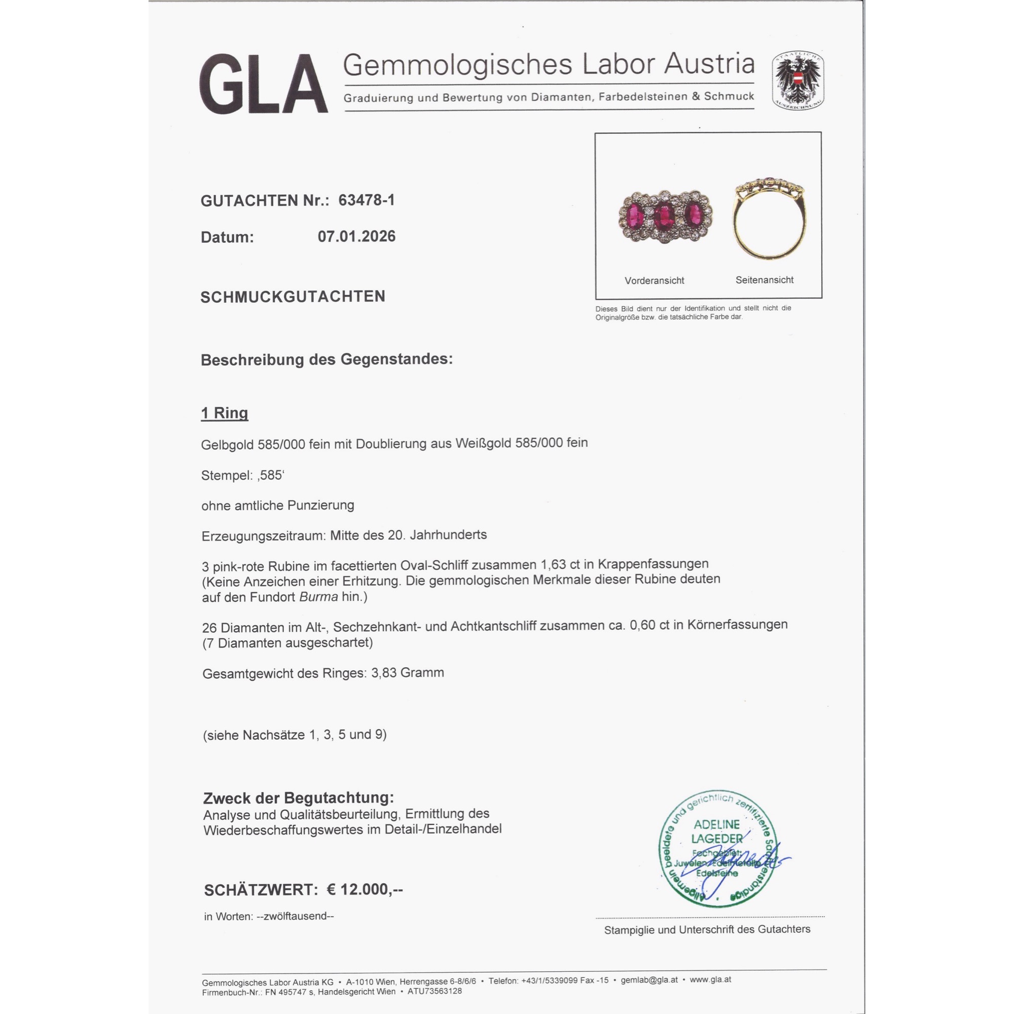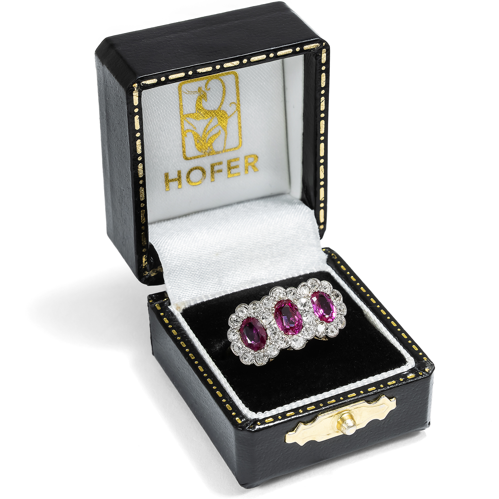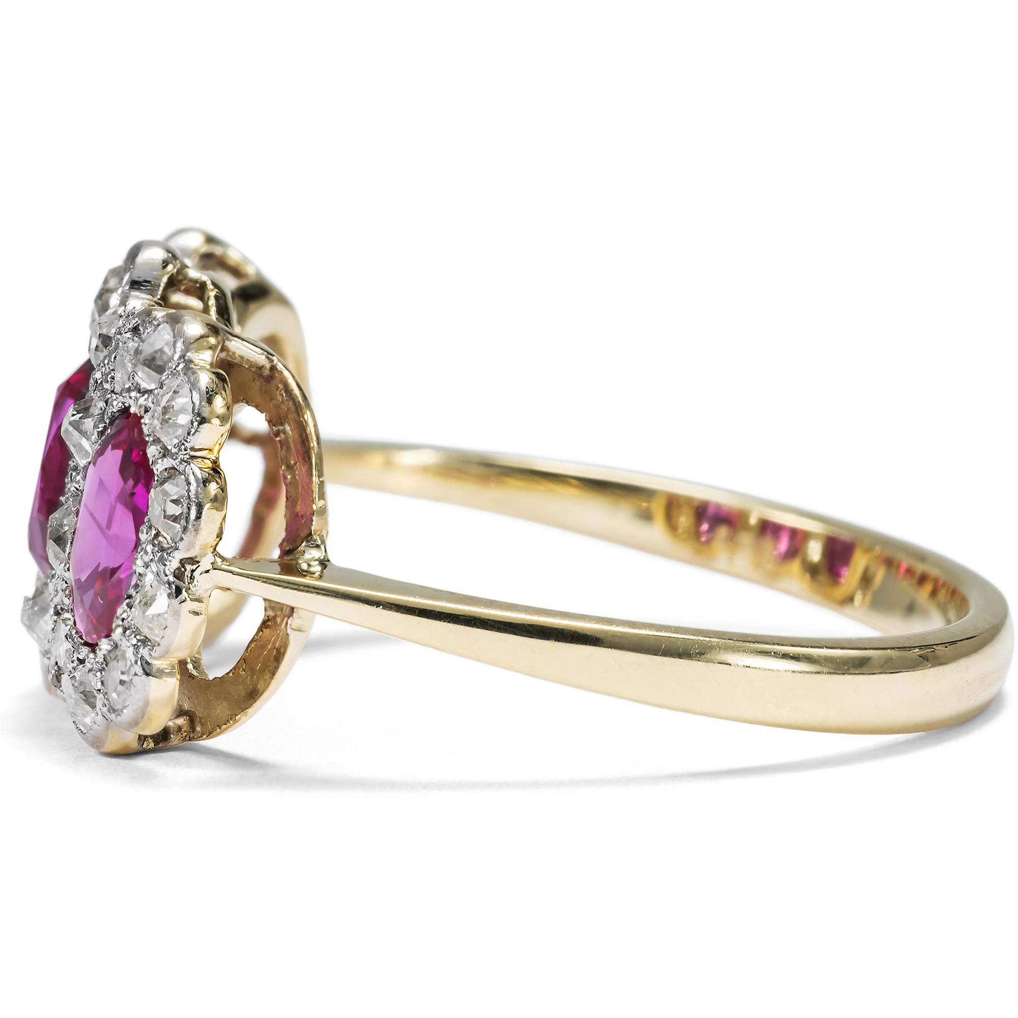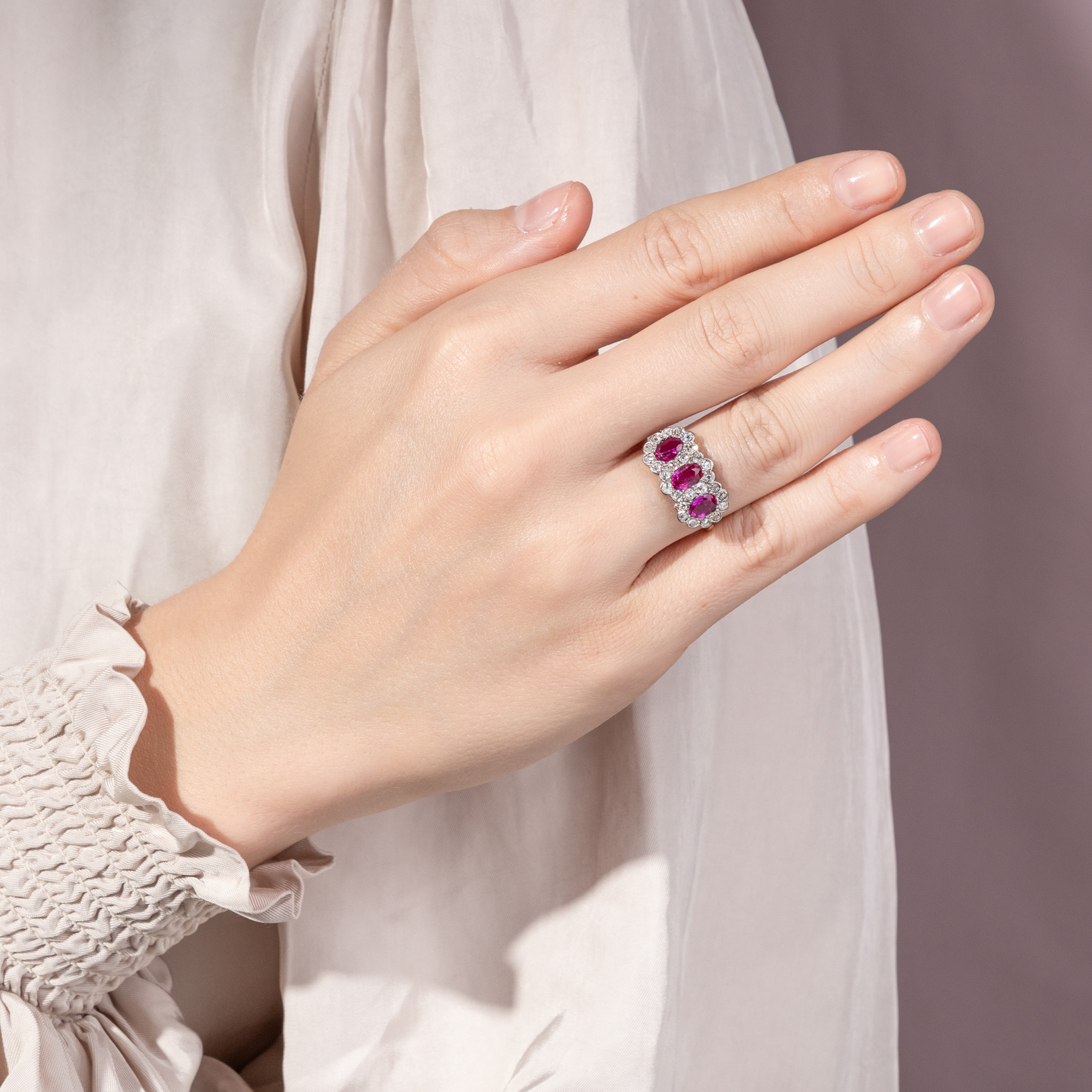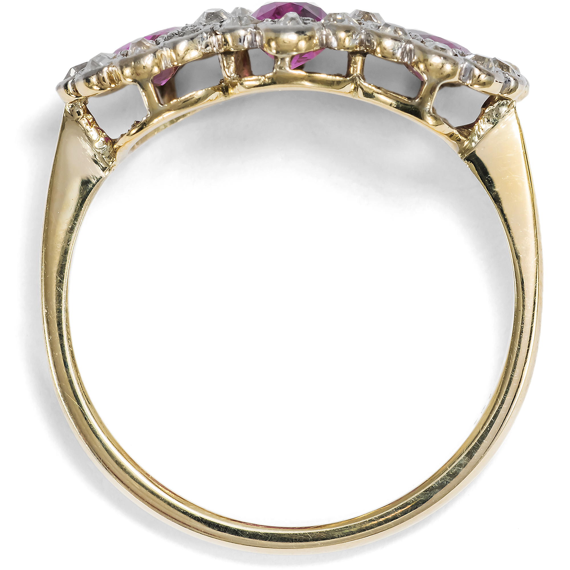 Hier leuchten intensiv purpurrot drei feine Rubine aus der legendärsten Fundstätte der Welt. Die zusammen 1,63 Karat schweren Steine stammen aus Burma, aus der Provinz Mogok, und verdanken ihre intensive Farbe allein der Natur. Bei der gemmologischen Untersuchung konnte keine Behandlung festgestellt werden, keine Erhitzung oder sonstige Veränderung durch den Menschen. Allein der kunstvolle Schliff der Edelsteine, ein ovaler Facettenschliff, intensiviert deren Farbe durch gezielte Lichtbrechungen. Die Rubine sind ausgesprochen klar und transparent. Die wenigen Einschlussbilder aber sind typisch für Rubine aus Burma. Sie bestehen aus zarten Nadeln aus dem Mineral Rutil und verleihen dem Rubin je nach Lichteinfall einen charakteristischen, seidigen Glanz. Ein gemmologisches Gutachten bestätigt die Herkunft und Qualität der Steine. Umgeben sind die drei nebeneinander angeordneten Rubine von 26 antiken Diamanten mit einem Gesamtgewicht von ca. 0,60 Karat, die in zarte, Weißgoldfassungen gesetzt wurden. Es handelt sich um verschiedene antike Diamanten, die vermutlich einige Generationen älter sind als der Ring selbst. Die Unterkaderung und die Ringschiene bestehen aus Gelbgold. Dass hier, neben den kostbaren Rubinen, antike Diamanten verwendet wurden, lässt uns den Ring in die Jahre um 1940 datieren. In jenen Jahren waren die Handelsrouten für Edelsteine unterbrochen, und wir finden oft antike Steine aus alten Schmuckstücken, die zu neuen Schmuckstücken herangezogen wurden. Auch die Verwendung von Weißgold passt hierzu, denn Platin war im Krieg rationiert bzw. für die Juweliere gar nicht mehr verfügbar. Der Ring fand seinen Weg aus dem Süden Englands zu uns.