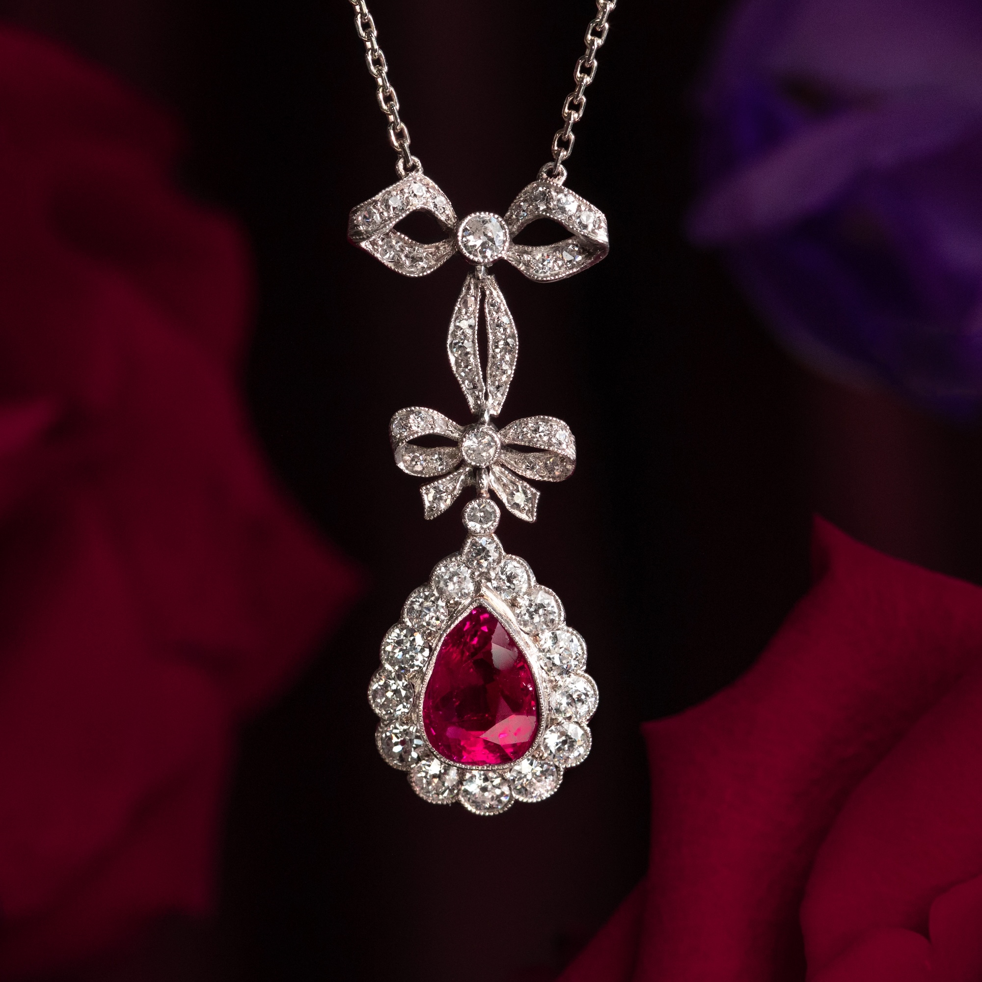 Rubine aus Burma zählen aufgrund ihrer herausragenden Qualität und ihrer hervorragenden Farbgebung zu den kostbarsten Edelsteinen überhaupt und sind oft wertvoller als gleich große Diamanten. Ihre klassische Fundstätte liegt in der Gegend um Mogok im heutigen Myanmar. Rubine aus anderen Fundstätten, etwa in Thailand oder Afrika, werden heutzutage nahezu immer erhitzt, um Farbe und Reinheit zu verbessern. Bei Rubinen aus Mogok ist dies oft nicht notwendig – ihre natürliche Farbe und Schönheit bedürfen keiner Verbesserung. Ein solcher unbehandelter, nicht erhitzter und intensiv leuchtender Rubin aus Burma ist das Herzstück des folgenden Colliers, das aus einer vornehmen Berliner Familie zu uns kam. Der Stein wurde zu einem facettierten Tropfen geschliffen und strahlt in einem wunderbaren Pink-Rot. Er bringt über 2,5 Karat auf die Waage. Zwei elegante, mit funkelnden Diamanten besetzte Schleifen – eine größere und eine etwas kleinere – leiten zu dem von Diamanten gerahmten Rubin über. Die zarte Kette aus Weißgold wurde einmal erneuert, sodass das Schmuckstück sorgenfrei getragen werden kann. Um sicherzustellen, dass unser Rubin tatsächlich ein unbehandelter Edelstein aus Burma ist, haben wir ein Gutachten in Auftrag gegeben, das sowohl die Qualität des Edelsteins als auch seine Herkunft bestätigt.