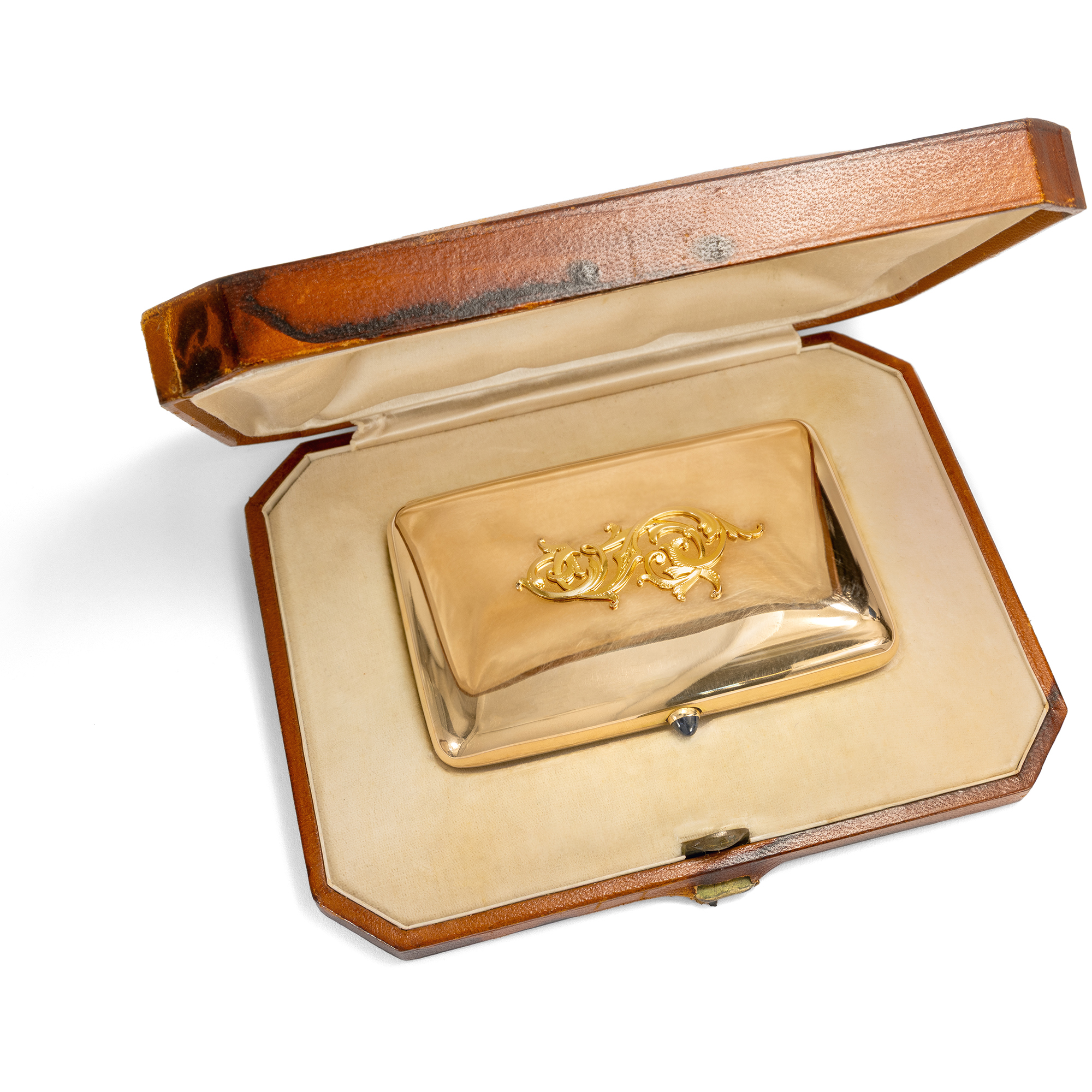 Ein neues Auto oder ein Smartphone sind heute Statussymbole und ein schönes Geschenk – in früheren Zeiten fiel die Wahl des Präsents oft auf ganz andere Dinge, die nicht weniger kostbar waren, doch zugleich kunstvoll und von hoher Meisterschaft. Dosen aus Silber und Gold, für Schnupftabak, später für Zigaretten oder Visitenkarten, waren dabei im 19. bis weit ins 20. Jahrhundert eines der beliebtesten Geschenke, Geschenke zur Hochzeit, zum Geburtstag in der Familie. Das vorliegende, ausgesprochen edle Etui für Zigaretten war sicher einmal ein solches Geschenk. Es ist aus leicht rötlichem Gold gefertigt und glänzend poliert. Der Drücker, mit dem das Etui geöffnet werden kann, ist als Farbtupfer mit einem blauen Saphircabochon besetzt. Auf dem Deckel lesen wir in Gelbgold zwei ineinander verschlungene Buchstaben „G S“, es sind die Initialen seines ersten Besitzers. Das Etui ist rechteckig und zu den Seiten leicht gewölbt. Durch die großzügigen Maße von 6,2 x 9,6 cm lassen sich auch moderne Zigaretten bequem in das Etui einlegen. Jeweils zwei Ösen an den Seiten dienen dazu, Gummizüge aufzunehmen, welche die Zigaretten am Platz halten. Mit stolzen 95,0 Gramm Gewicht liegt es schwer in der Hand. Die Punzierungen des Etuis verraten, dass das Etui in St. Petersburg entstanden ist, vor dem Jahr 1899. Wir denken, dass es um 1890 herum gefertigt wurde. Es hat sich in seinem originalen Etui aus Samt, Seide und Leder sehr gut erhalten.