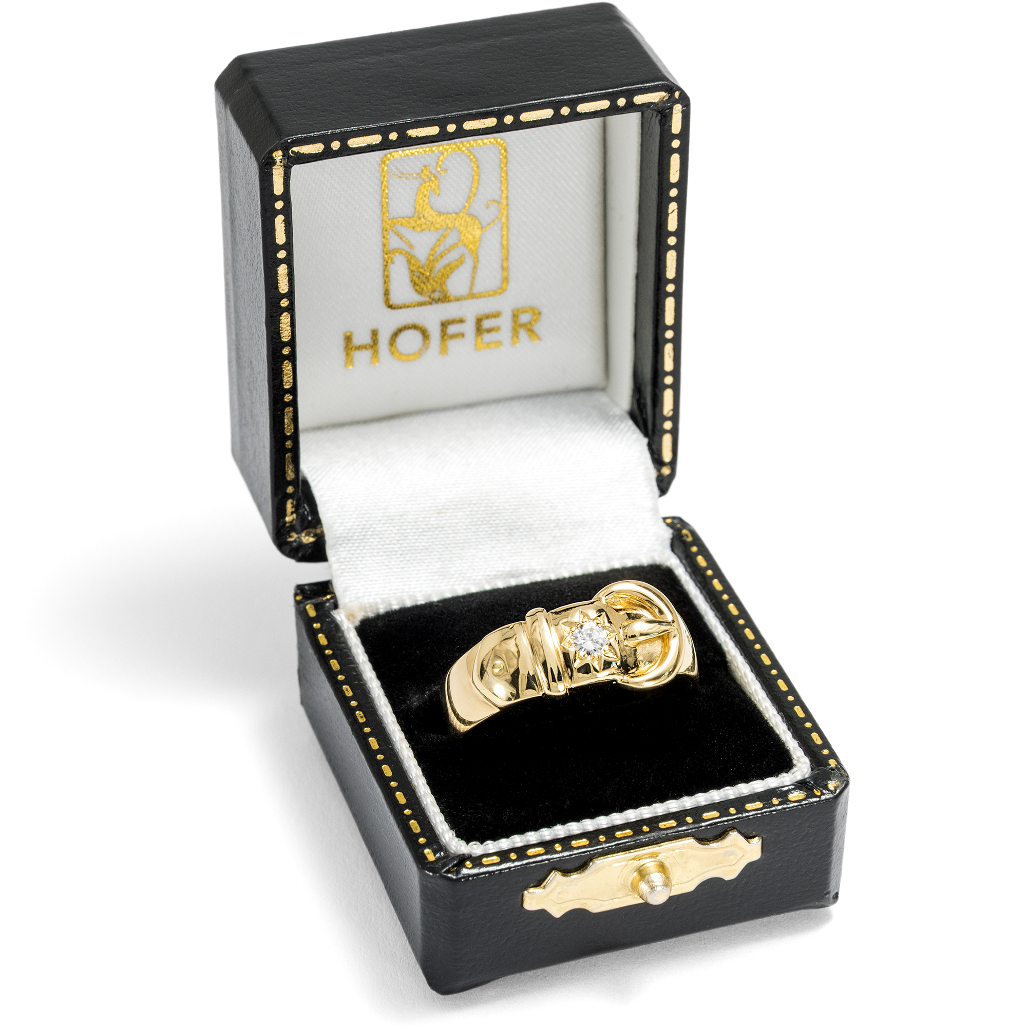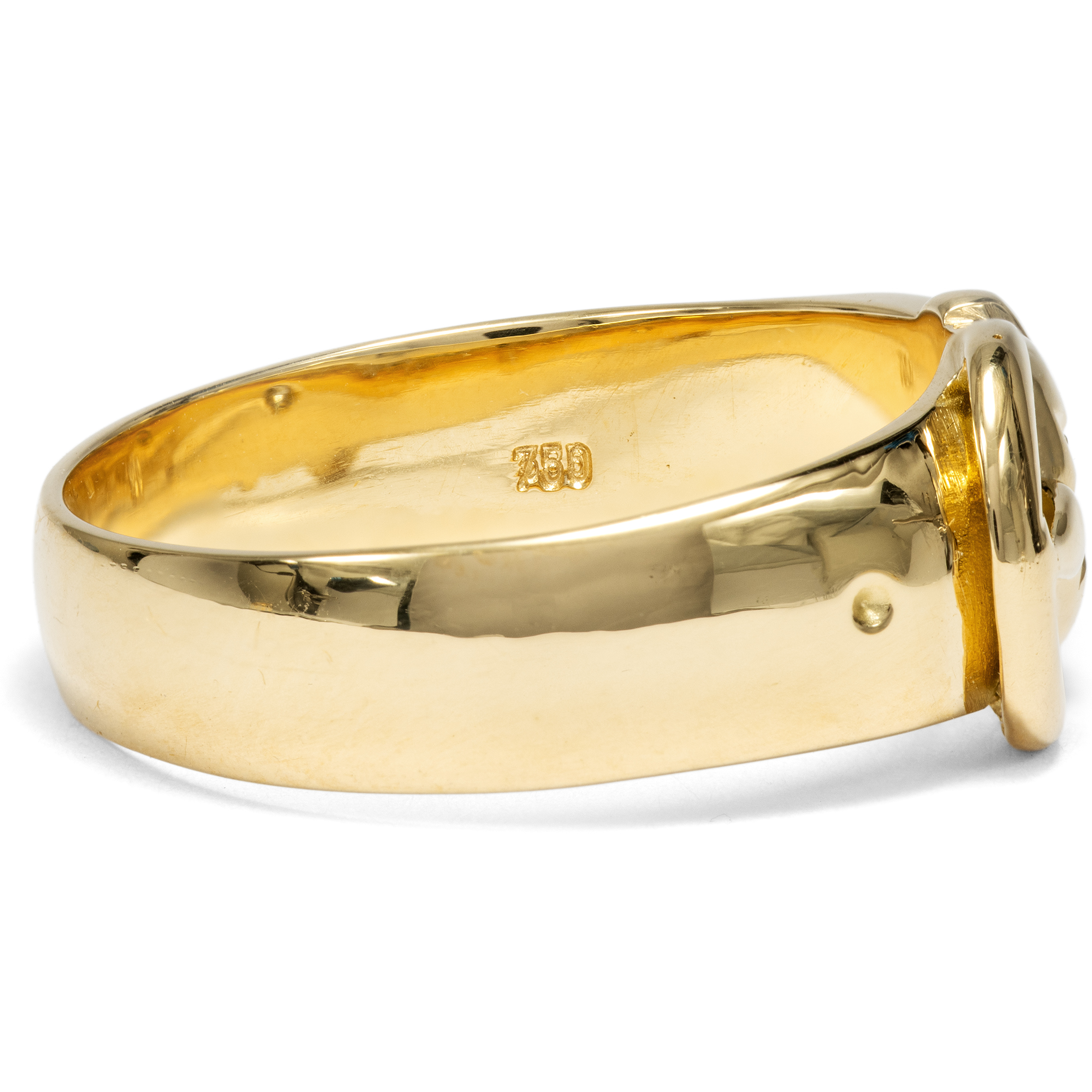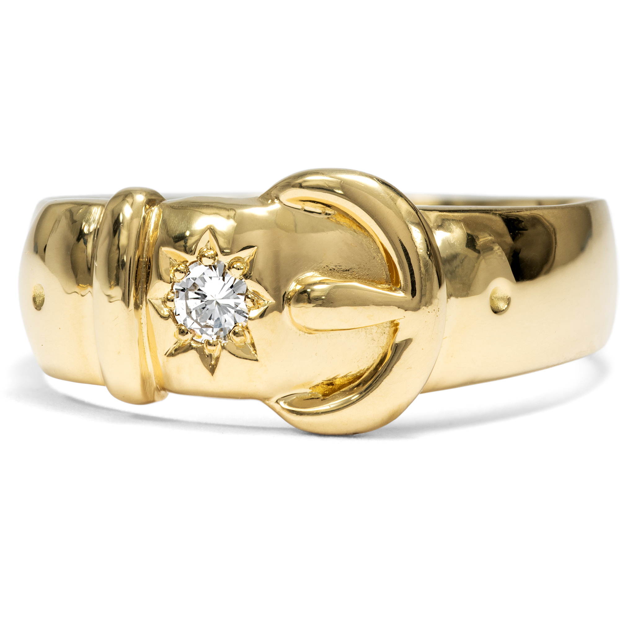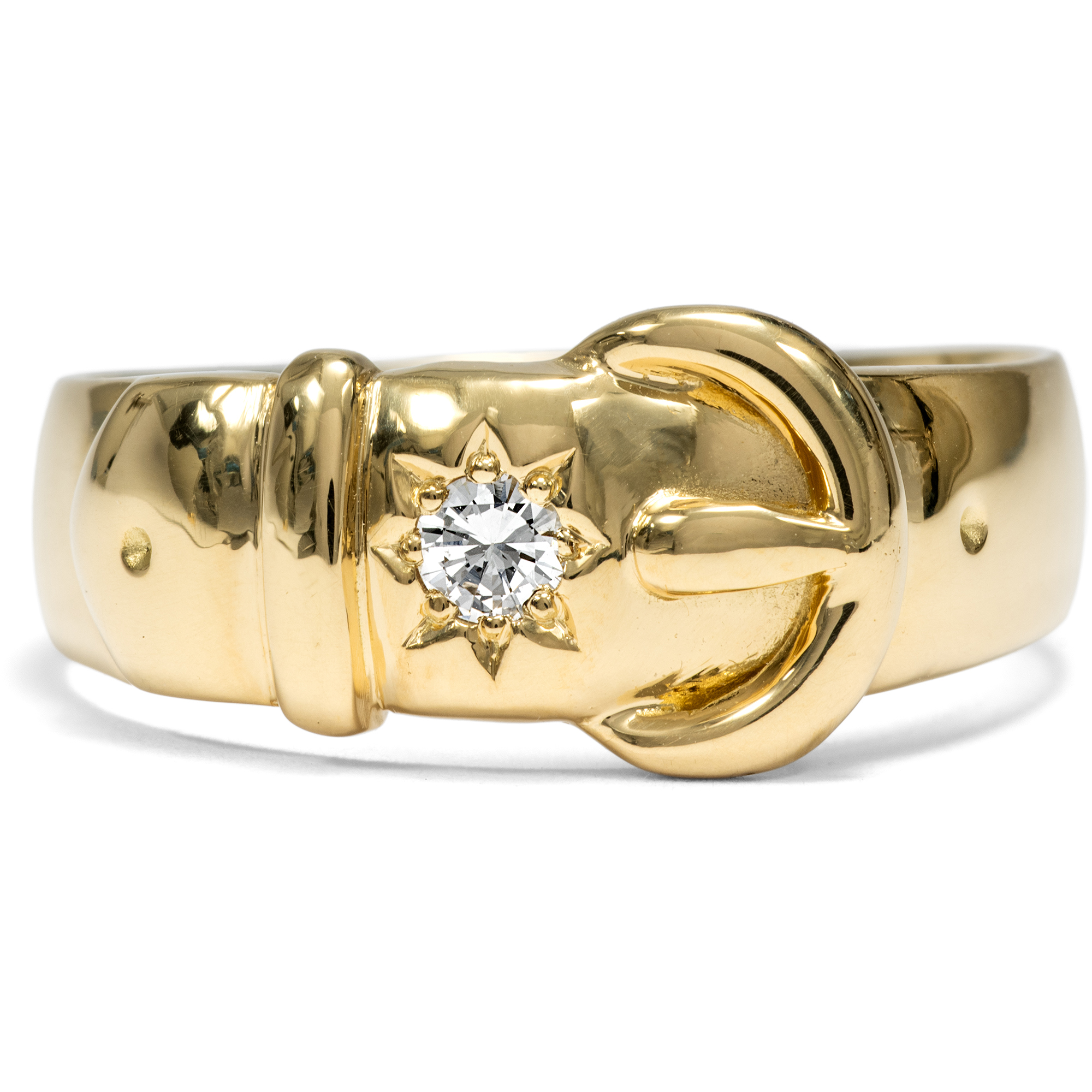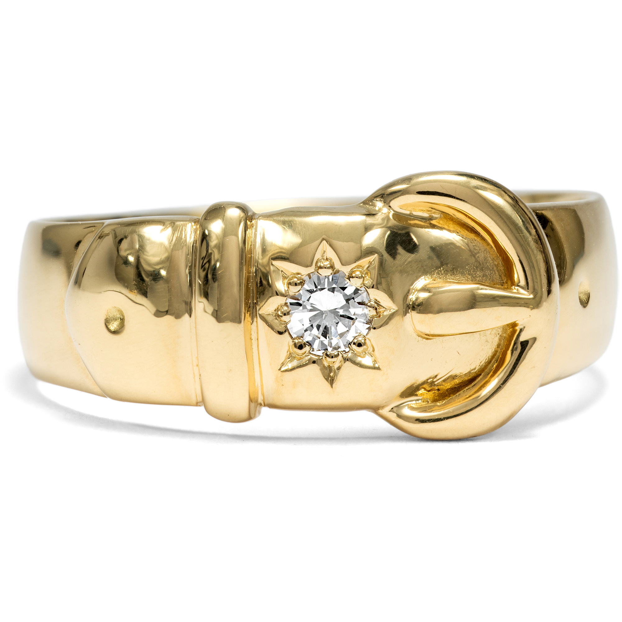 In vielen alten Mythen schützt ein Gürtel seinen Träger und stattet ihn mit magischen Fähigkeiten aus. So besaß der germanische Donnergott Thor einen Kraftgürtel, der seine Macht verdoppelte, und auch der Zwergenkönig Laurin gewann durch einen Gürtel die Stärke von zwölf Männern. In den magischen Gürtel der Aphrodite waren alle Wonnen und Lockungen der Liebe eingewoben und die Königin der Amazonen schließlich trug einen ihr vom Kriegsgott Mars geschenkten Gürtel als Ausweis ihres Status als Kriegerin. Offenbar wurde diesem besonderen Kleidungsstück, das zugleich verbinden kann und schützen, das Stärke verleiht und selbst stark ist, stets mehr Bedeutung zugemessen als anderen Kleidungsstücken. Doch ein Gürtel aus massivem Gold? Der wäre vermutlich viel zu schwer. Aber ein kleiner Gürtel aus Gold für den Ringfinger? Das geht! So dachten bereits die Goldschmiede des Viktorianischen Zeitalters, und tatsächlich waren Ringe in Form goldener Gürtel im späten 19. Jahrhundert in Großbritannien eine große Mode. Uns haben Ringe dieser Art immer sehr gut gefallen und unser Goldschmied hat daher einen Ring nach historischem Vorbild neu entworfen. Mit aufmerksamem Blick für die Details legt er sich als ein breites Band um den Finger, mit einer plastisch gebildeten Schnalle. In seiner Mitte fasst er zudem einen Diamanten im Brillantschliff von 0,11 ct – ein funkelnder Verweis auf die Ewigkeit des Schutzes und der Liebe. Wir haben diesen Ring in einer kleinen Auflage angefertigt. Es gibt ihn in verschiedenen Farben: Hier bieten wir den Ring in Gelbgold an, die Roségold in Gelbgold und in Platin finden Sie an dieser Stelle. Alle Ringe tragen einen Vintage-Diamanten, der hier in Zweitverwendung eingesetzt ist. Auch das Gold und das Platin sind recycelt, um den Ring so nachhaltig wie möglich herzustellen. Angefertigt wurde der Ring vollständig in Deutschland, hier in Berlin und in Rheinland-Pfalz. Die Diamanten können sich minimal voneinander unterscheiden. Einen harmonischen Gesamteindruck geben sie aber immer.