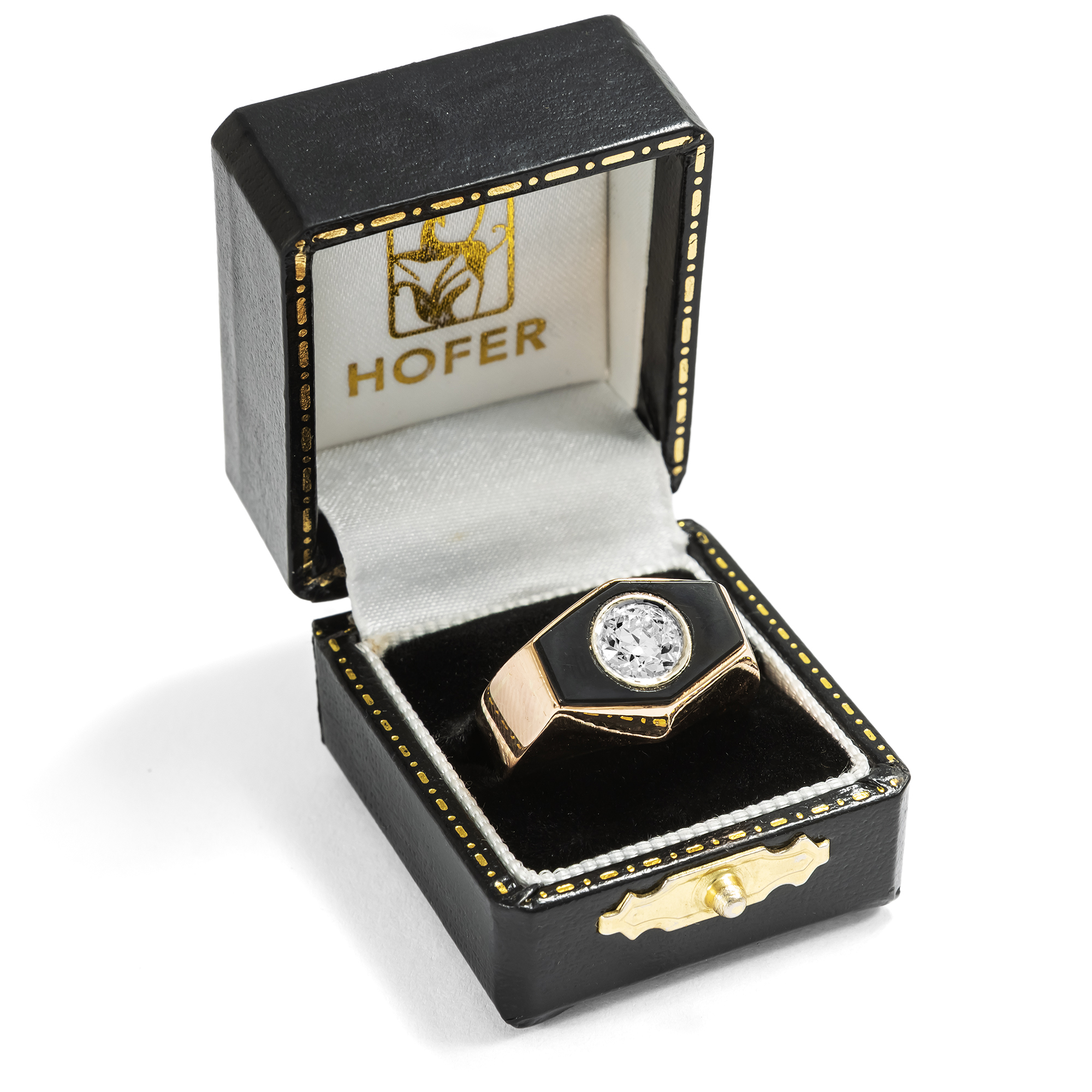 In den späten 1930er Jahren entwickelten vor allem die Pariser Juweliershäuser eine Spielart des Art Déco, die heute als „Retro Style“ bekannt ist. Diese neue Mode unterschied sich durch warme Goldtöne und raumgreifende geometrische Formen von den kühlen Entwürfen aus Diamanten und Platin, welche das Jahrzehnt zuvor geprägt hatten. Schon bald verbreitete sich dieser neue Stil in der ganzen westlichen Welt Der hier vorliegende Ring ist ein wunderbarer Vertreter dieser Mode. Er ist in strenger Symmetrie entworfen und beinahe skulptural. Mittig trägt er einen Diamanten von mehr als einem Karat Gewicht in einer Fassung aus Gold. Ein Rahmen aus Onyx, von Hand aus einem Stein geschnitten, inszeniert den Diamanten auf dramatische Weise. Der Onyx ist direkt in den steil ansteigenden Ringkopf eingelassen. Der Entwurf ist abstrakt und aus der Freude an der Geometrie entwickelt. Der Ring ist sehr gut erhalten und ein wunderbares Beispiel für ein tragbares Juwel des Retro Style. Mehr zu Ringen der 1940er Jahren sowie weitere Abb. finden Sie in David Bennet und Daniela Mascetti: Understanding Jewellery, Woodbridge 2010, S. 400f.