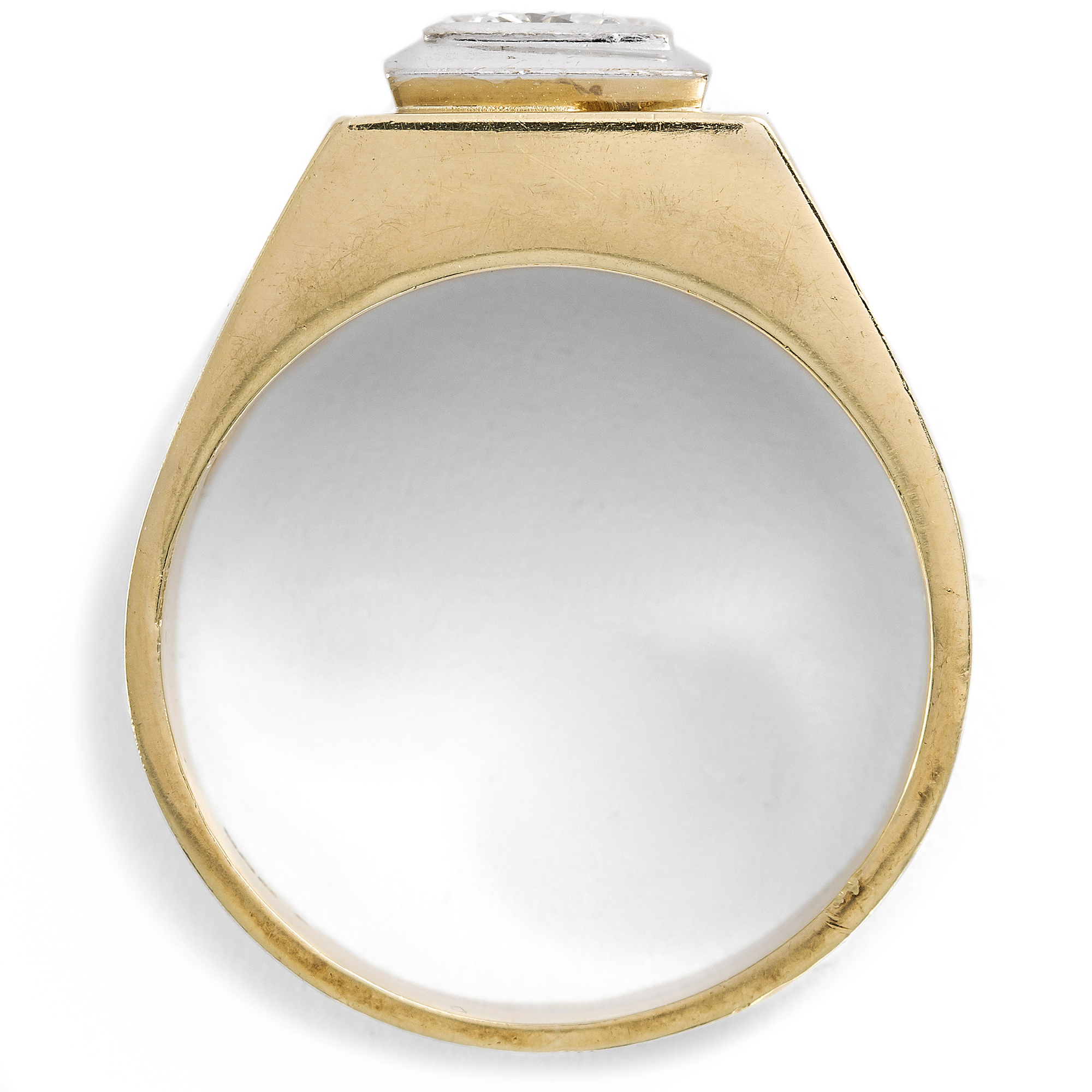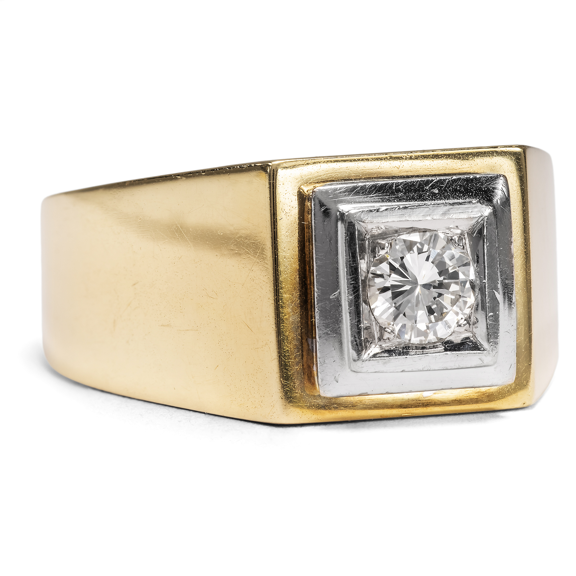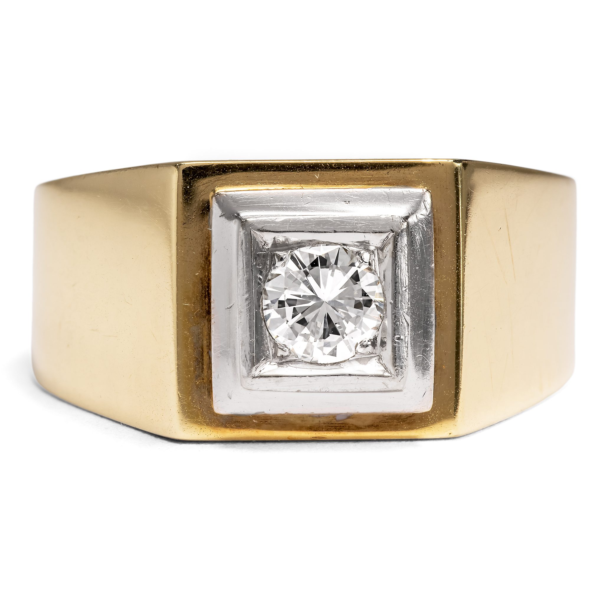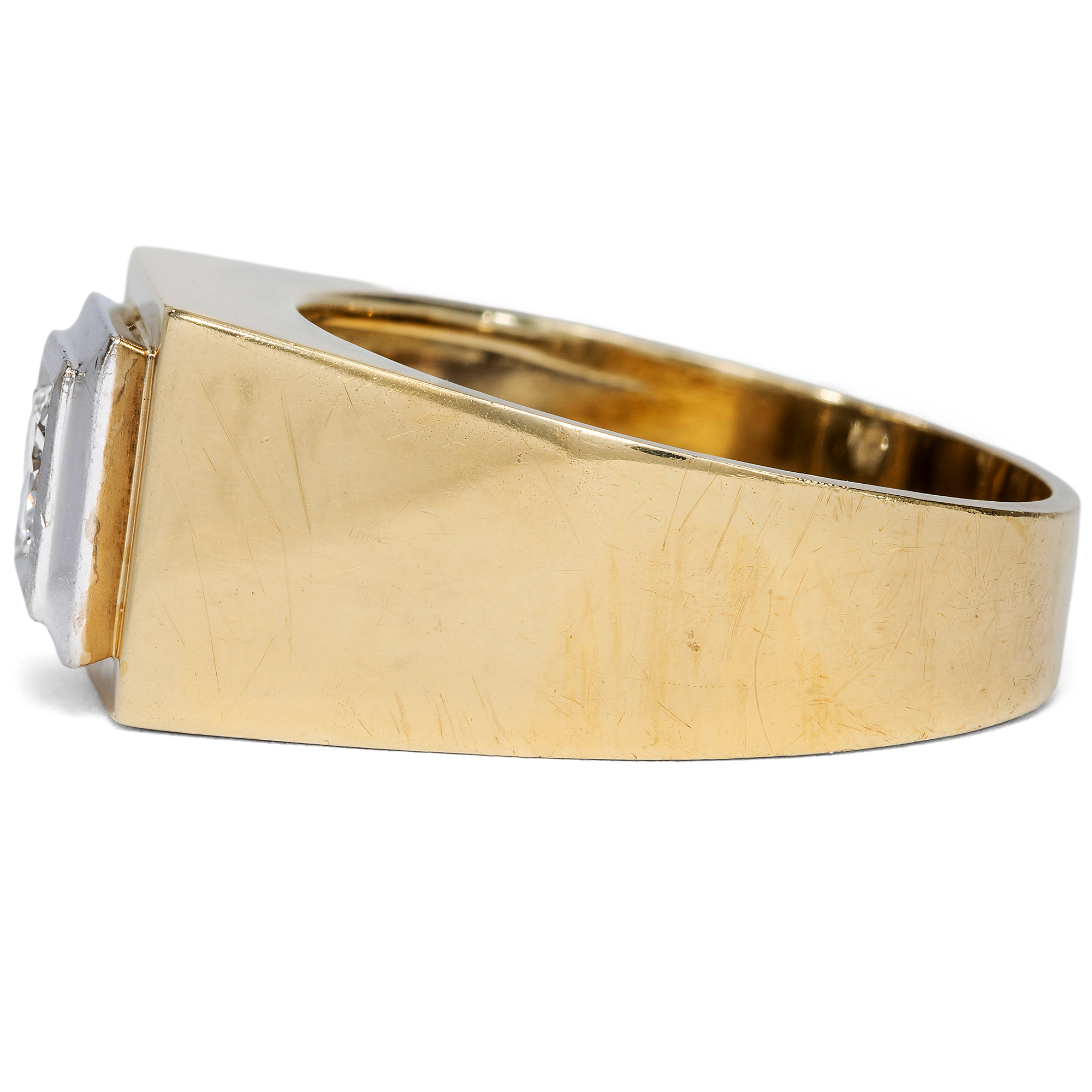 Eindrucksvoll, massiv und maskulin zeigt sich der vorliegende vintage Ring. Die Arbeit aus 14-karätigem Gelbgold präsentiert auf der breiten Schiene einen funkelnden Brillanten als Solitär. Der Diamant (Top Wesselton, G / vsi) hat ein Gewicht von 0,27 Karat und wird von einer quadratischen Carréfassung sicher gehalten. Sie ist aus Platin gefertigt und unterstützt sein Feuer sehr gut. Die glänzend polierte Ringschiene zeigt eine klare, graphischen Gestaltung, ganz typisch für die Mode der Jahre um 1975. Der qualitätvolle Diamant, die ebenso qualitätvolle Verarbeitung und die kraftvolle Formensprache kreieren ein stilvolles Schmuckstück. Der ursprünglich für Herren entstandene Ring ist sehr gut erhalten und fand hier in Berlin zu uns.