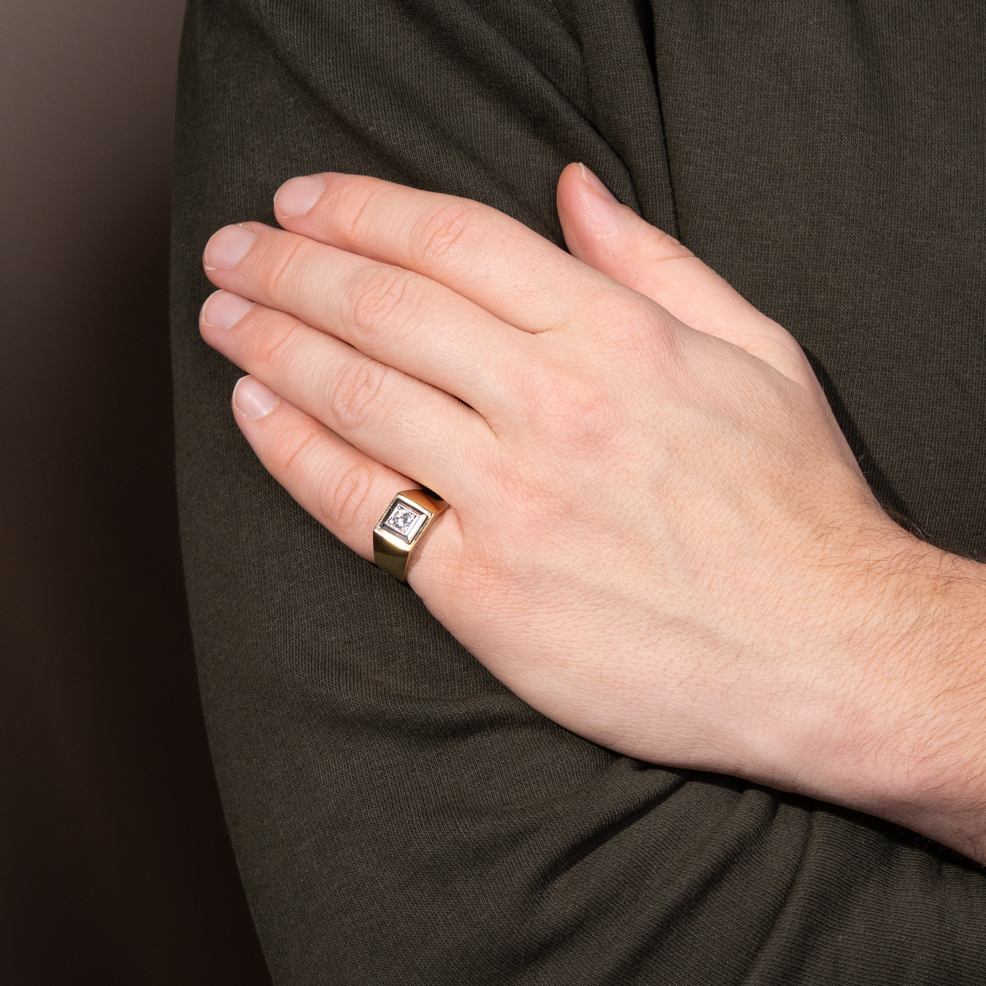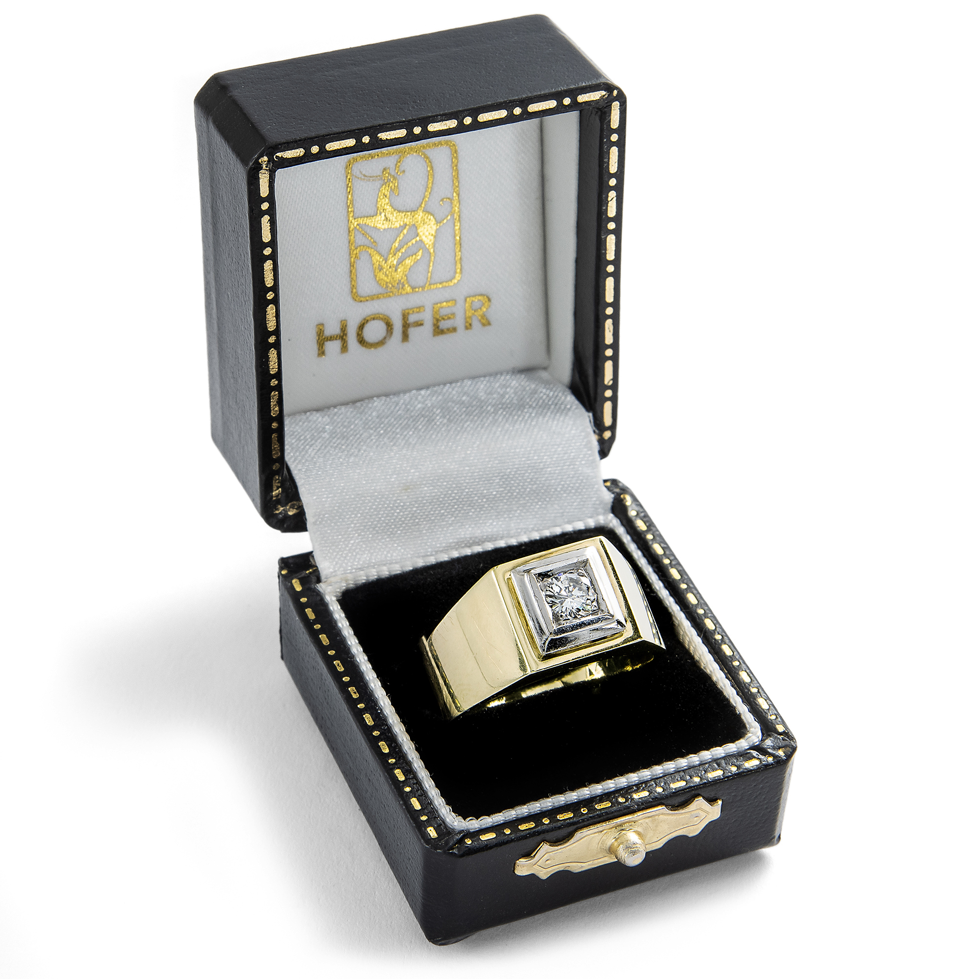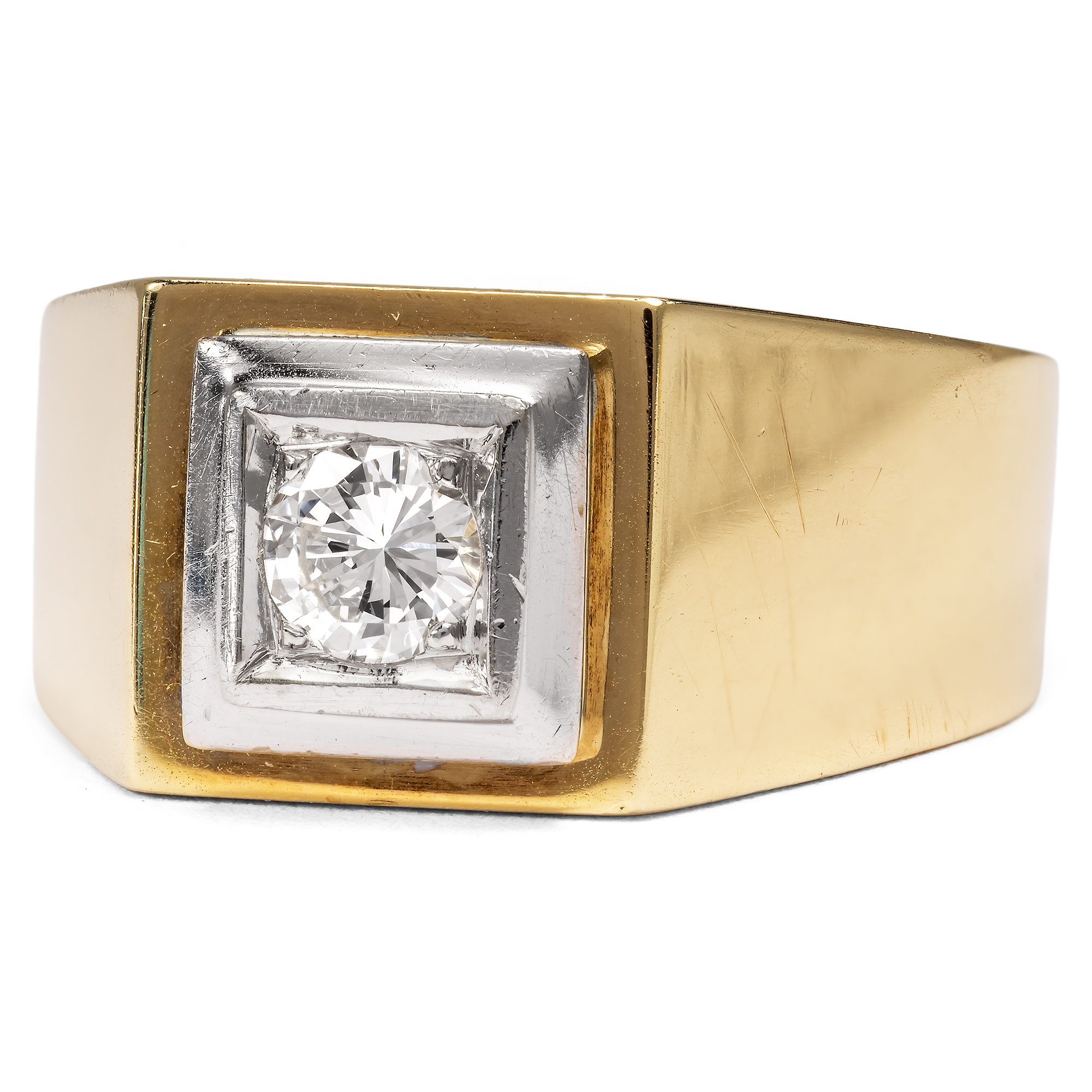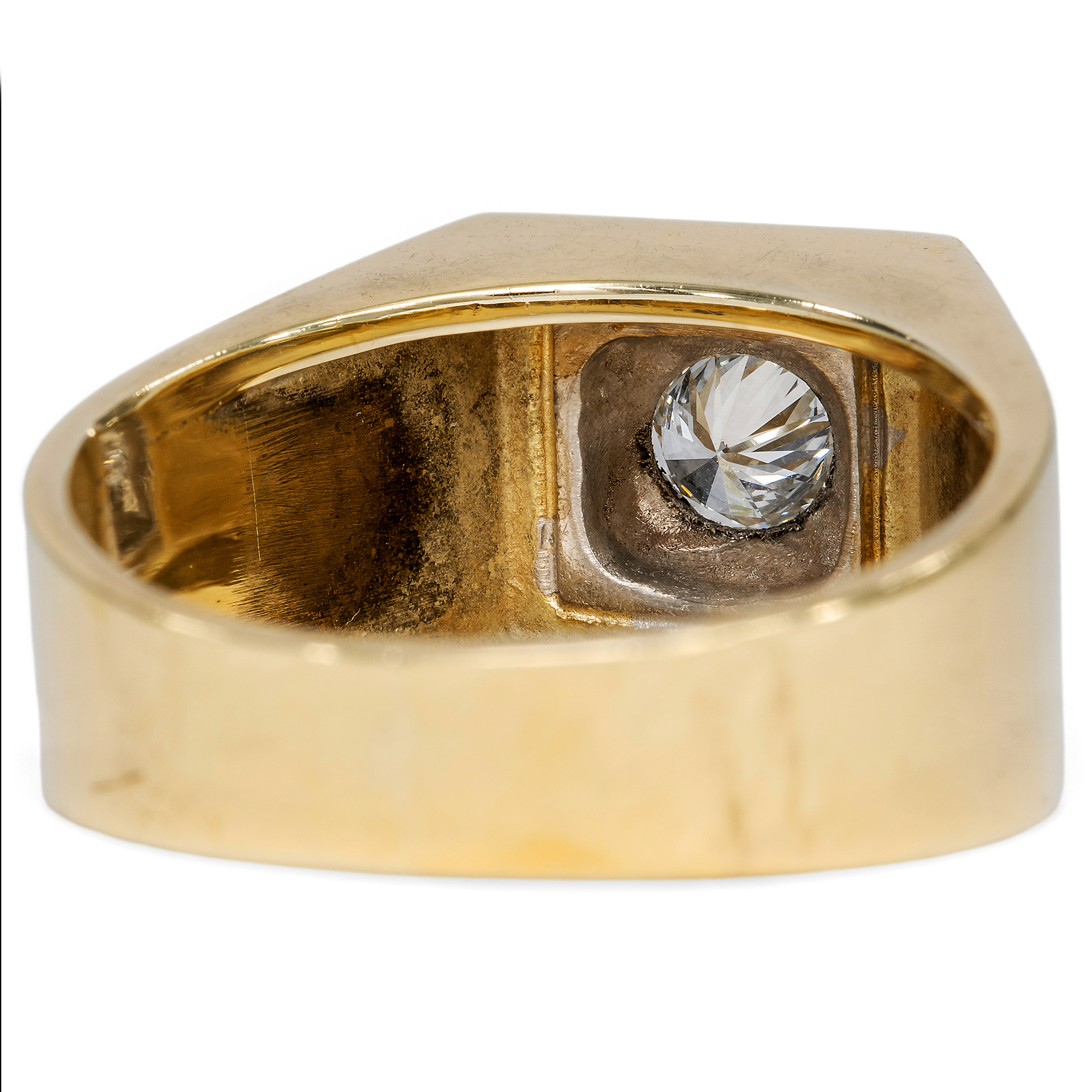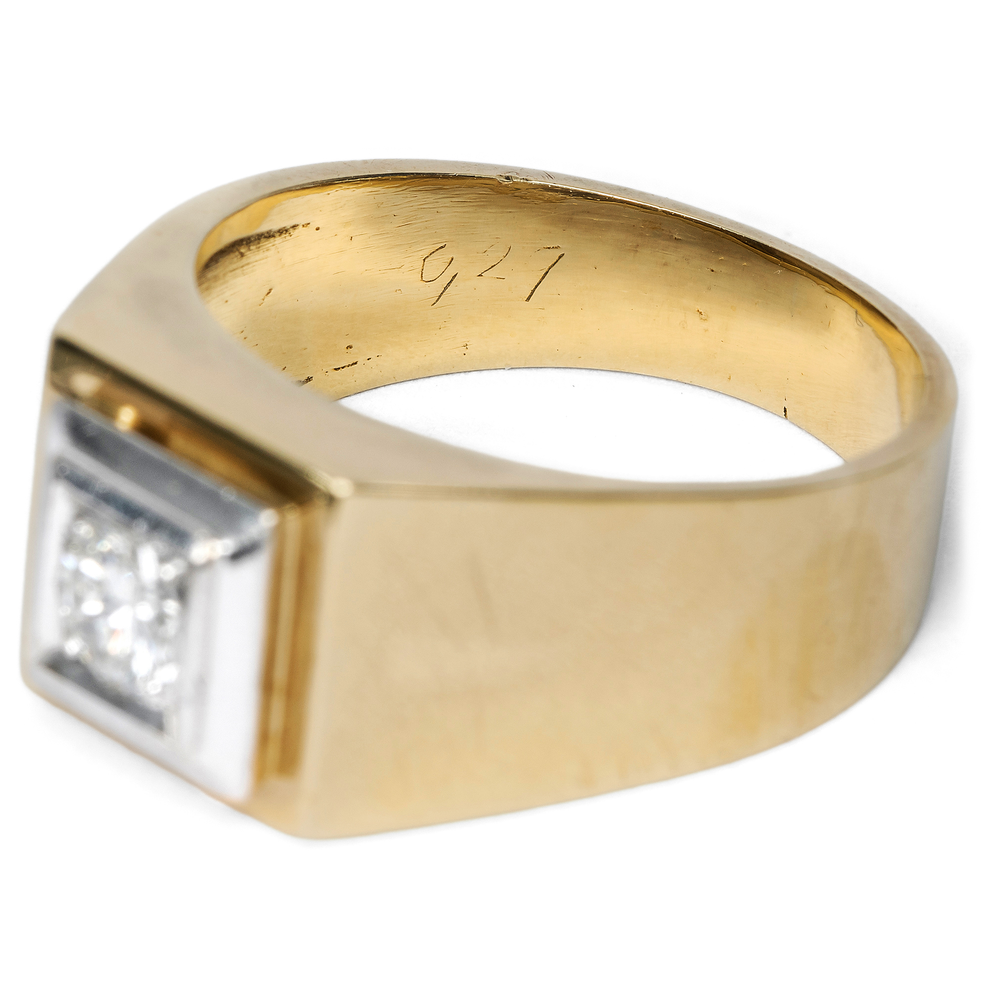 Eindrucksvoll, massiv und maskulin zeigt sich der vorliegende vintage Ring. Die Arbeit aus 14-karätigem Gelbgold präsentiert auf der breiten Schiene einen funkelnden Brillanten als Solitär. Der Diamant (Top Wesselton, G / vsi) hat ein Gewicht von 0,27 Karat und wird von einer quadratischen Carréfassung sicher gehalten. Sie ist aus Platin gefertigt und unterstützt sein Feuer sehr gut. Die glänzend polierte Ringschiene zeigt eine klare, graphischen Gestaltung, ganz typisch für die Mode der Jahre um 1975. Der qualitätvolle Diamant, die ebenso qualitätvolle Verarbeitung und die kraftvolle Formensprache kreieren ein stilvolles Schmuckstück. Der ursprünglich für Herren entstandene Ring ist sehr gut erhalten und fand hier in Berlin zu uns.